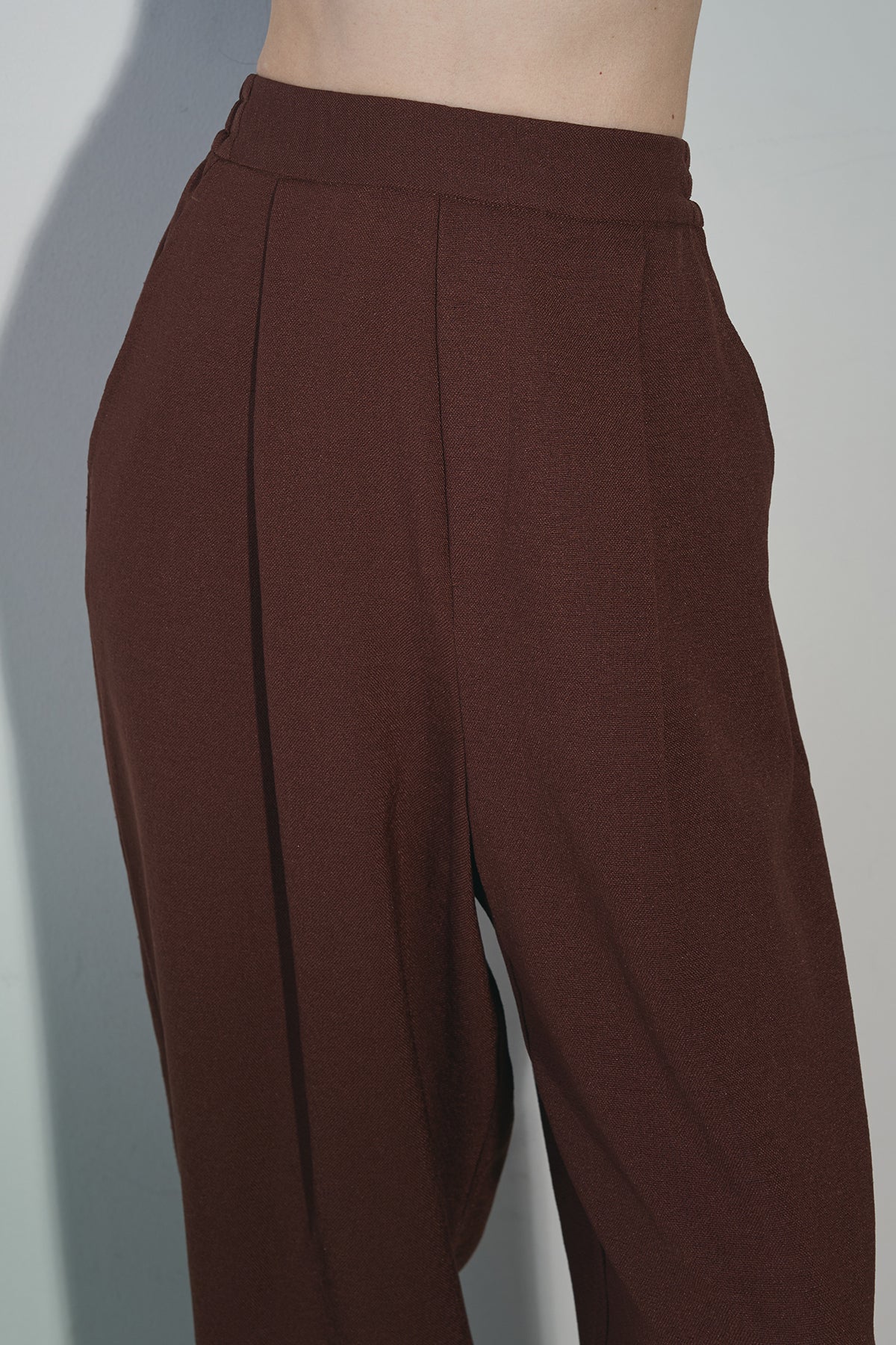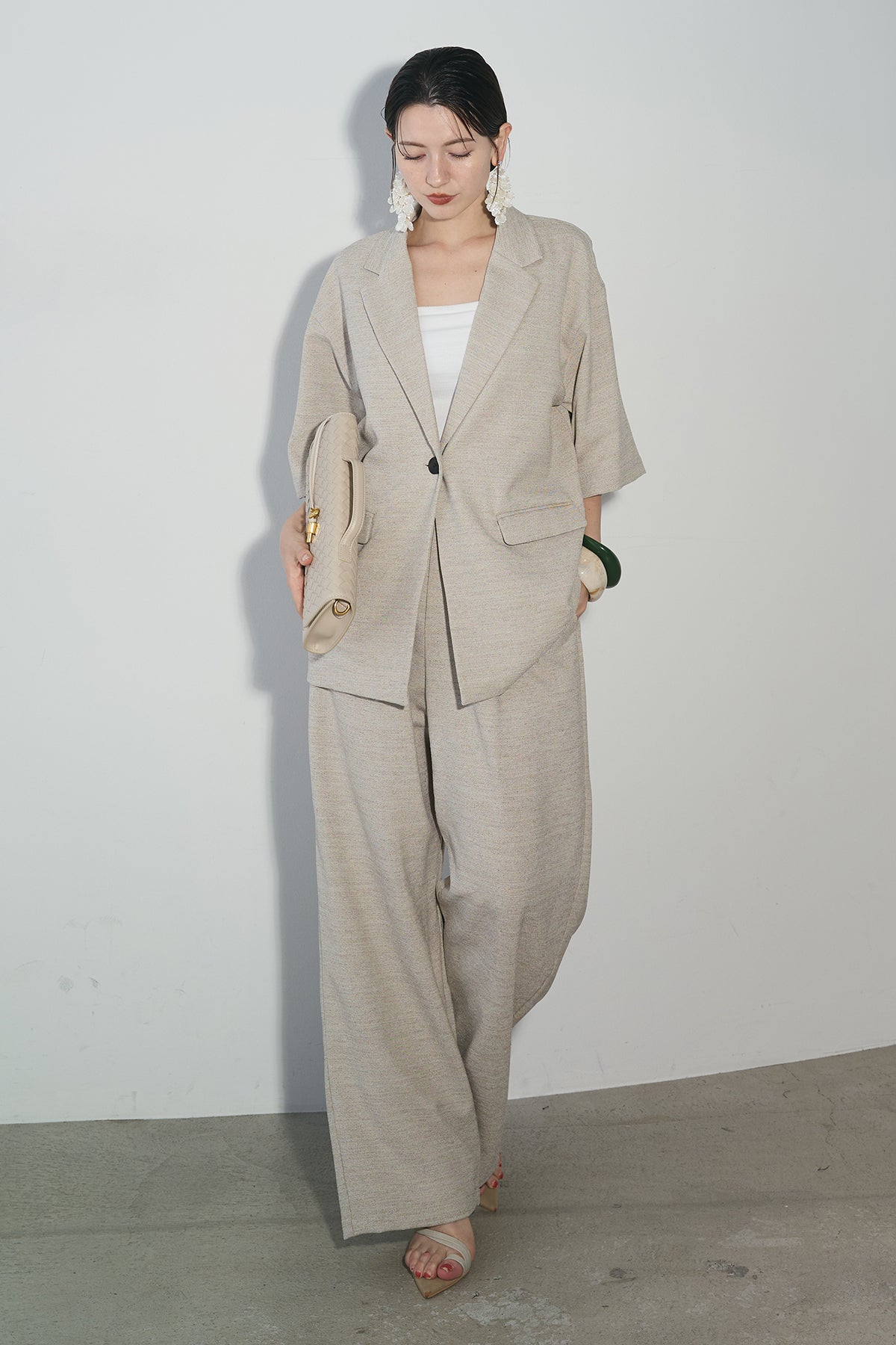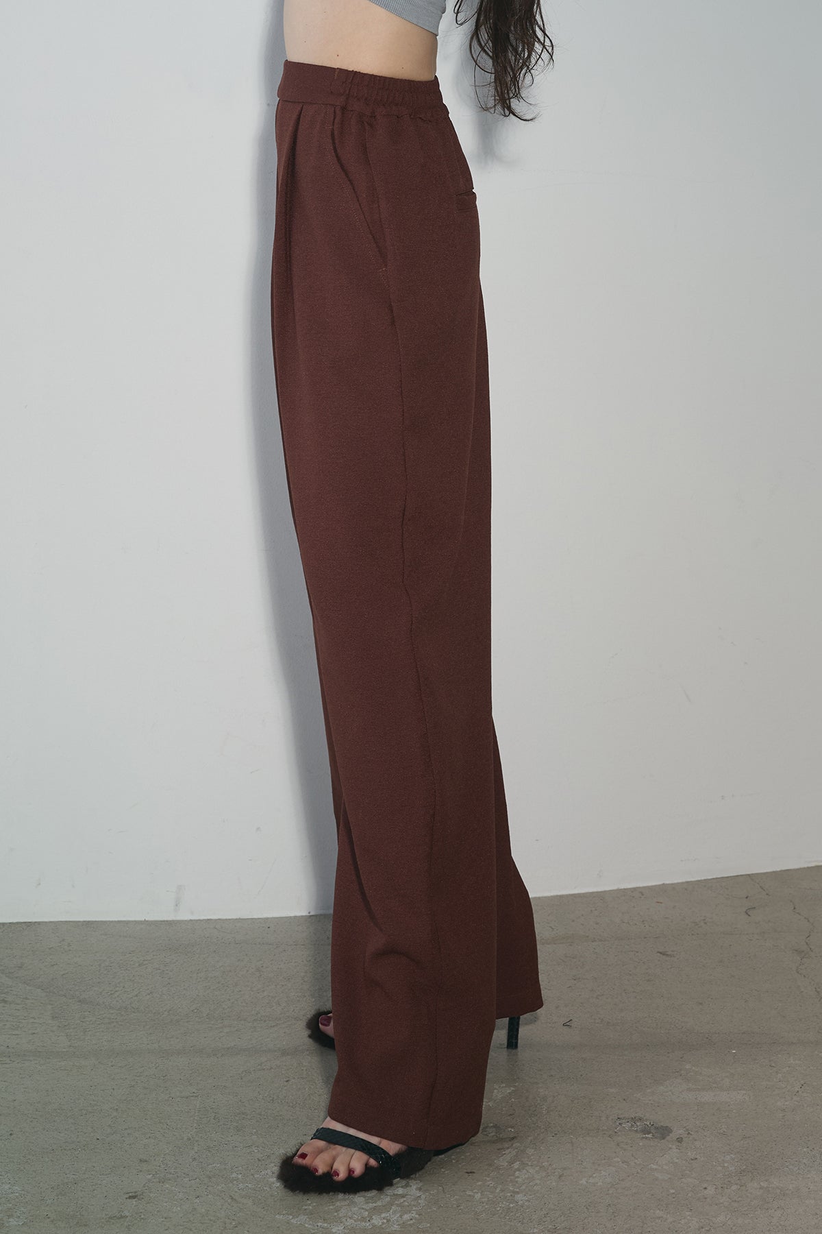 シルエット美を引き立てる、端正な印象のハイウエストワイドパンツ。センタープレスとタックディテールが縦のラインを強調し、脚長効果を演出。程よい落ち感のある素材で、動くたびに揺れる上品なドレープが魅力です。ウエストまわりはすっきりとした設計で、トップスインも美しく決まります。同素材のジャケットとのセットアップもおすすめです。