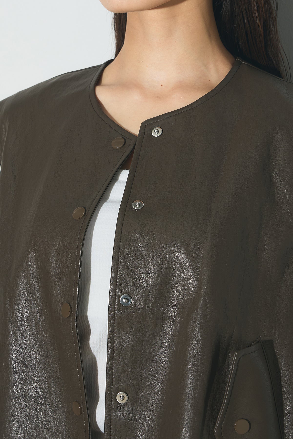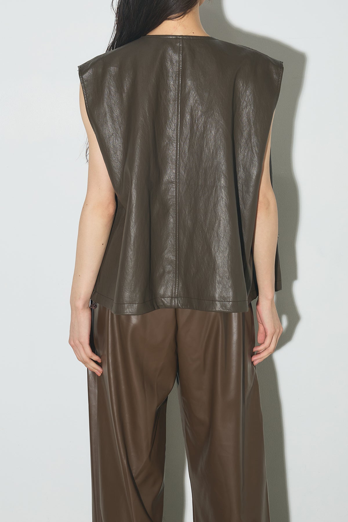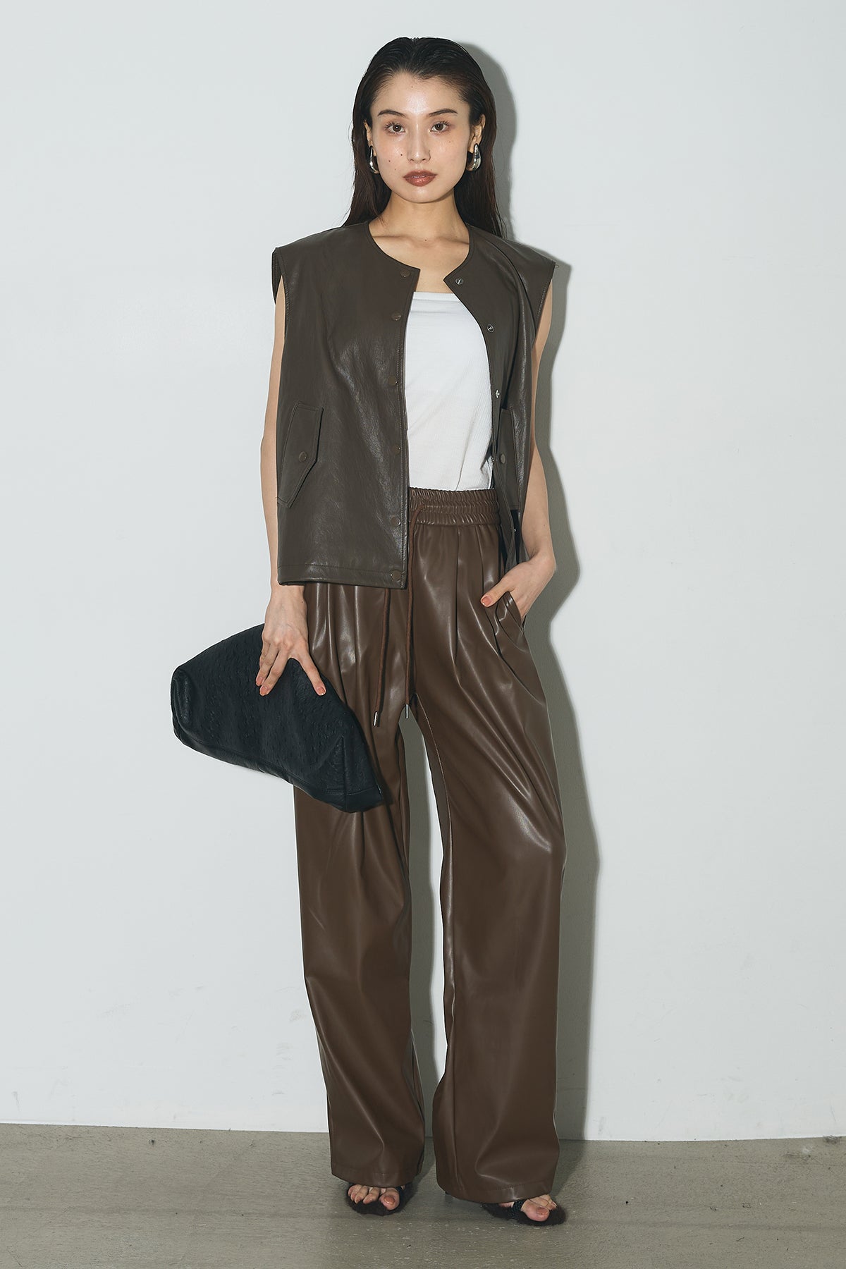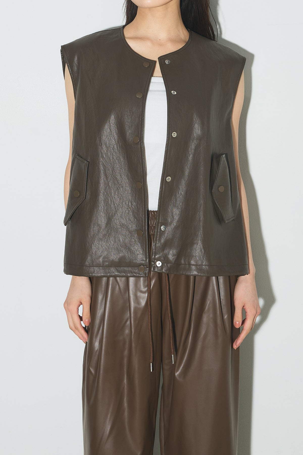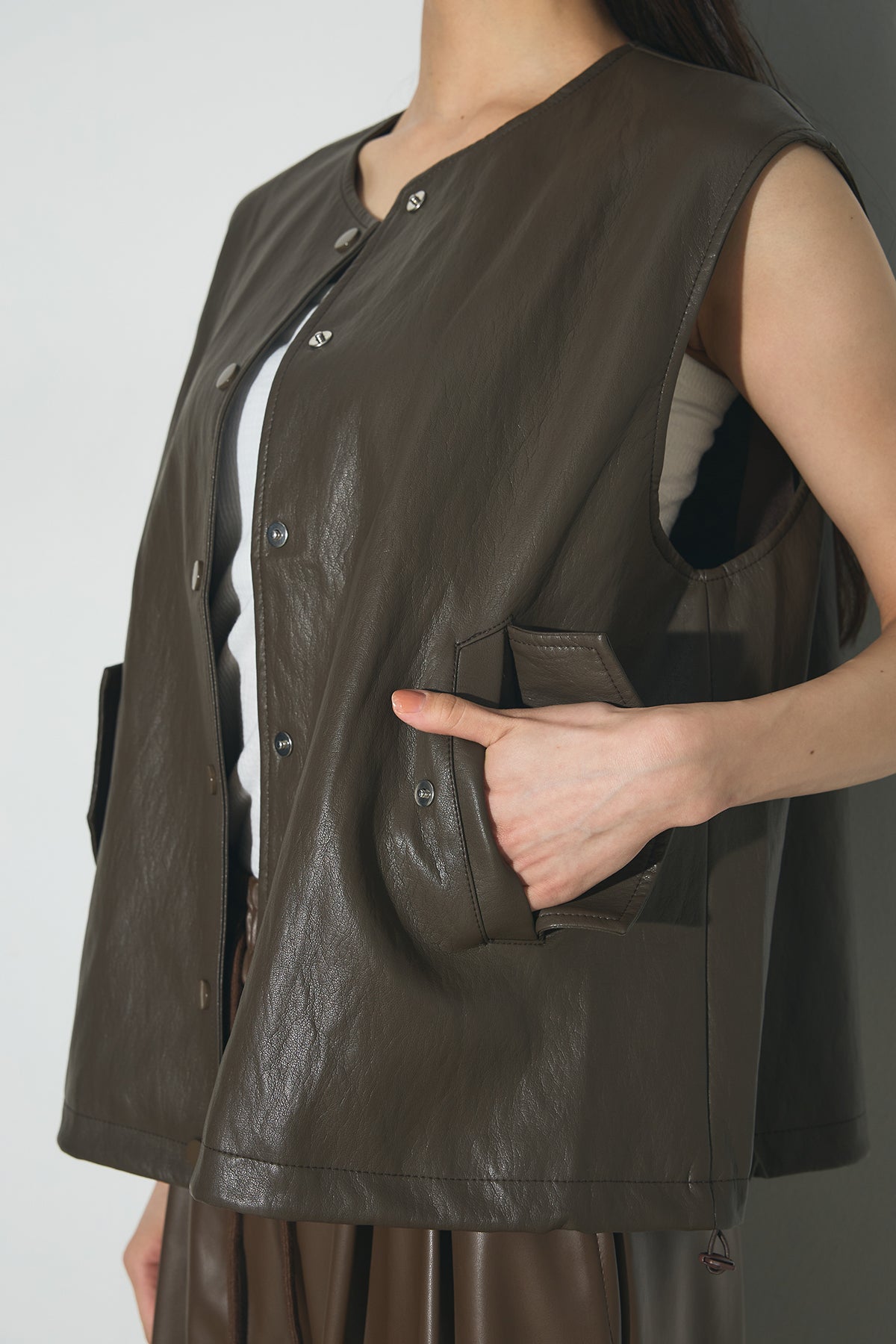 マットな光沢感が上品なフェイクレザーのベスト。ノーカラーでシンプルながら、立体感のあるフラップポケットがアクセントに。前開きはスナップボタン仕様で、軽く羽織るだけでモードな雰囲気を演出します。ヒップにかかる丈感と程よいゆとりで、インナーを選ばず着回しやすい一枚です。