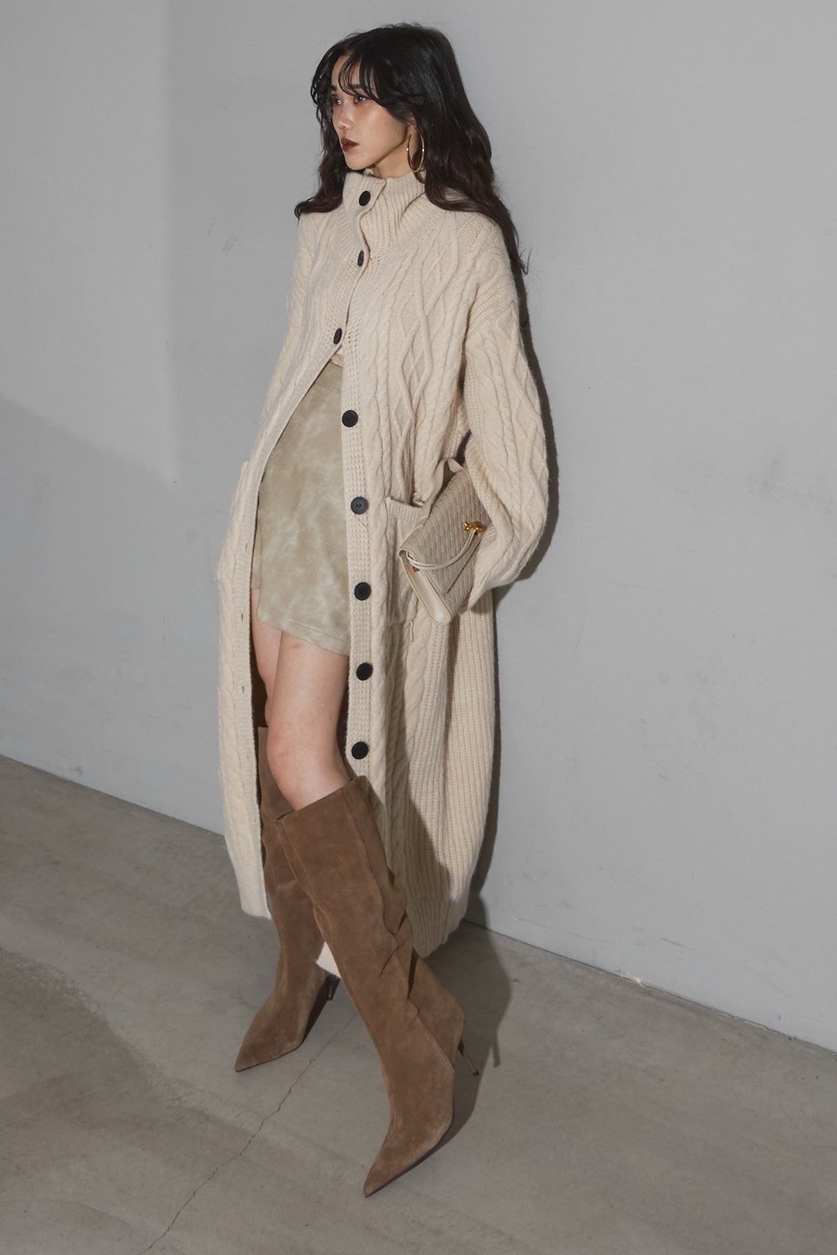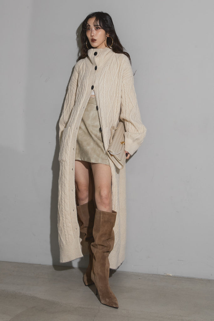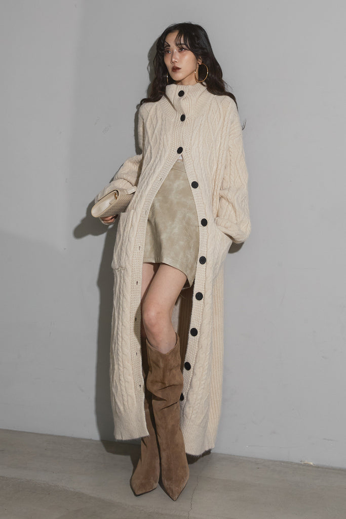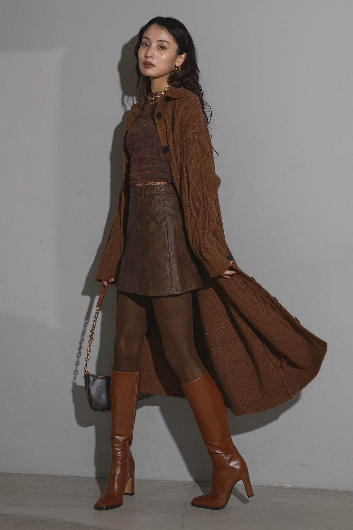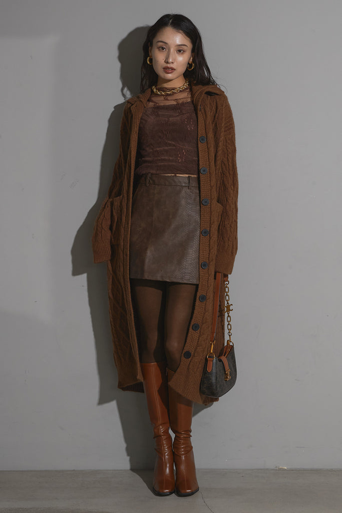 【SET】ニットロングカーディガン+クロコレザーミニスカート
