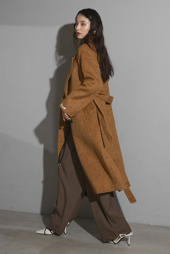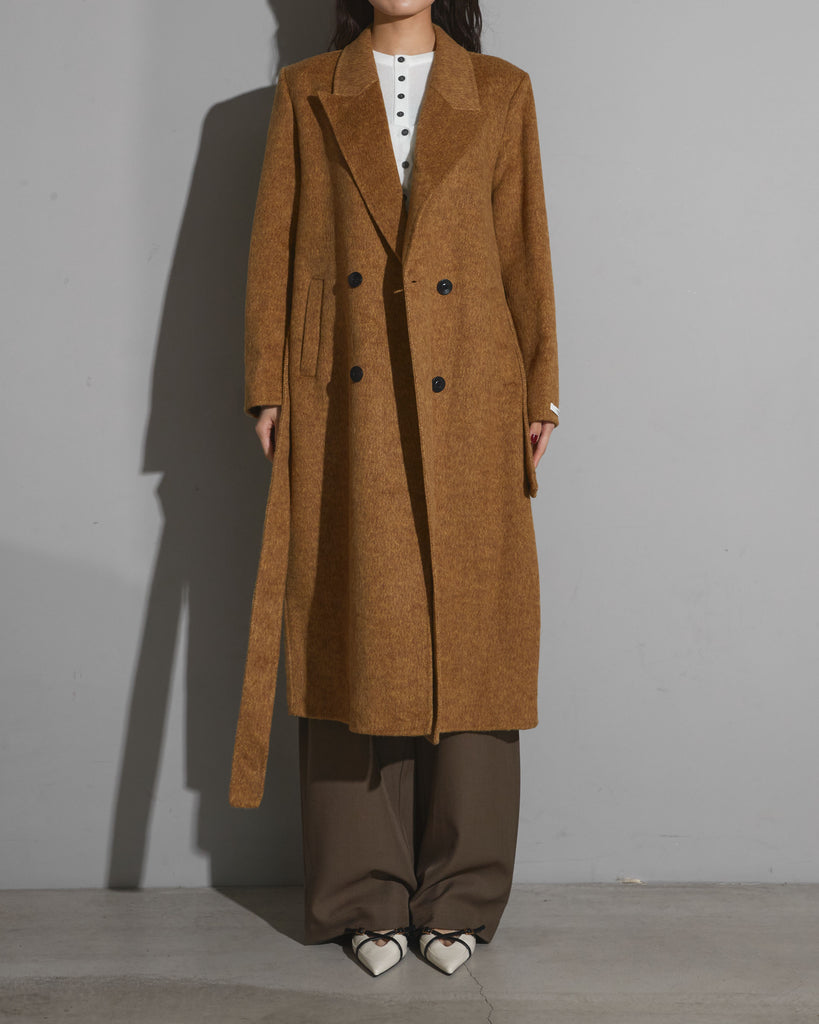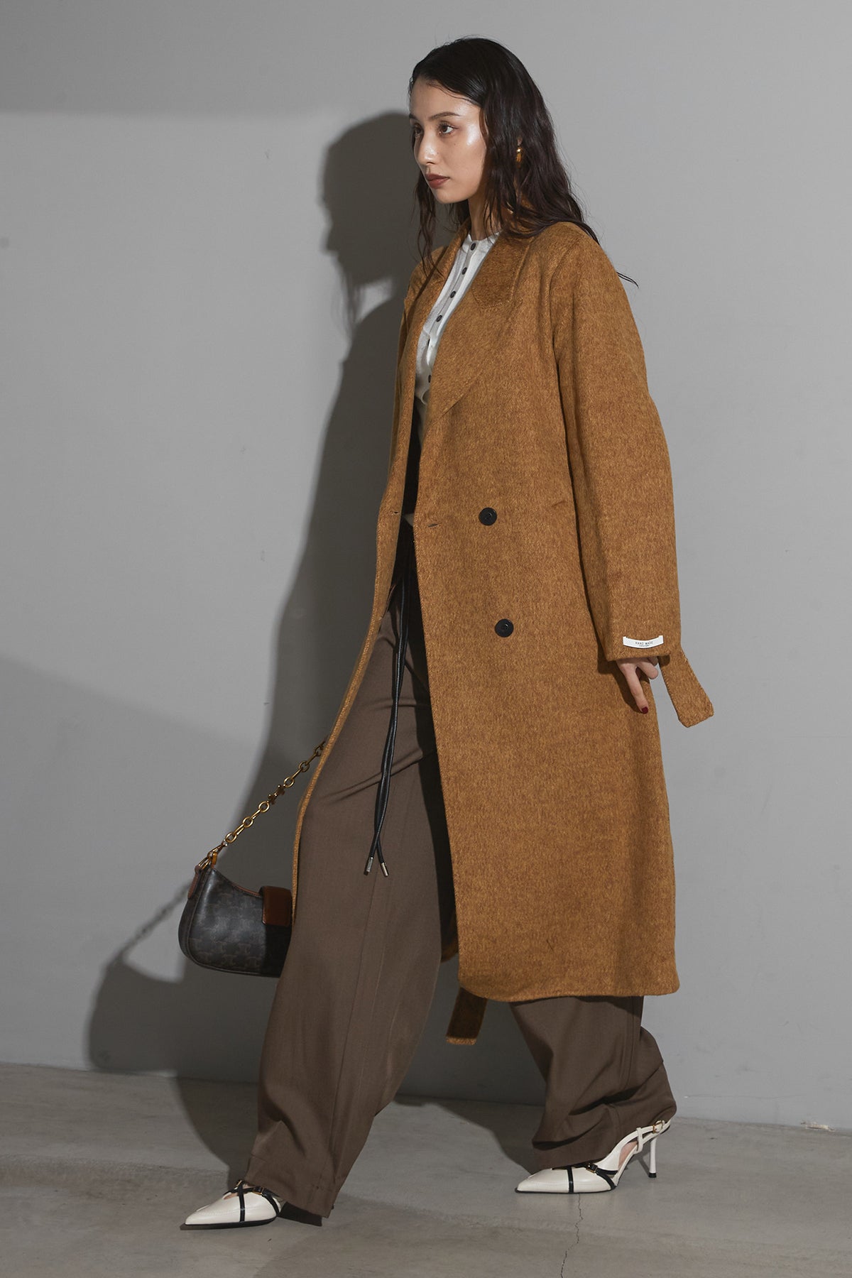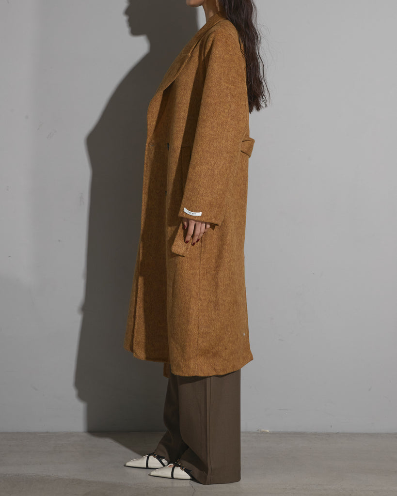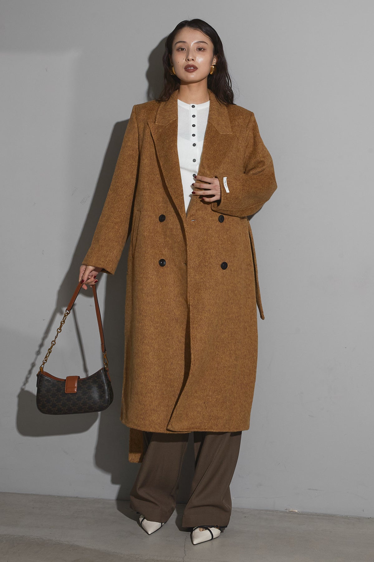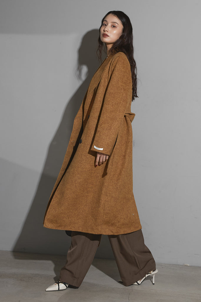 ふんわりとした起毛感が魅力のロングコート。 柔らかな風合いで身体を包み込み、シンプルながらも存在感のあるシルエットに仕上げています。 ヒップまですっぽりと覆う丈感で、スタイリングを選ばず着回しやすい一枚。 カジュアルにもきれいめにも合わせやすく、デイリーに活躍してくれます。