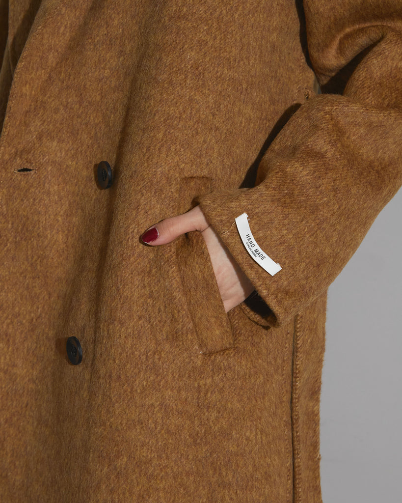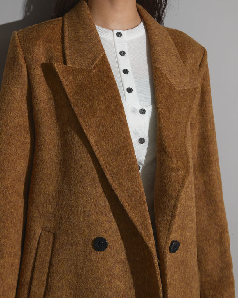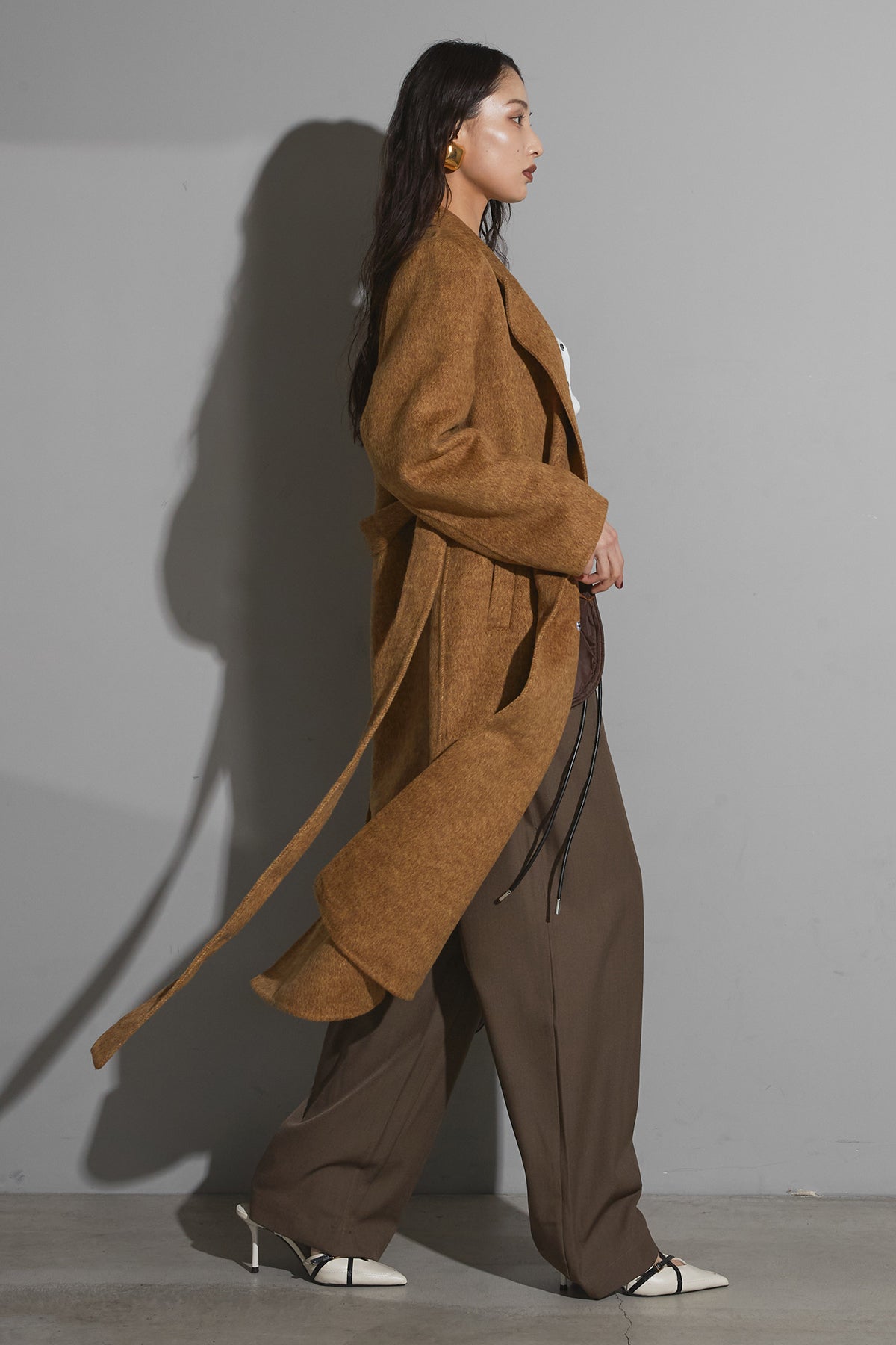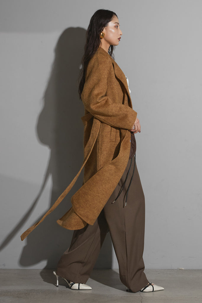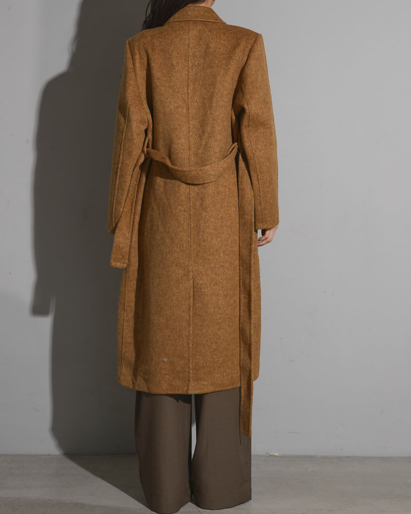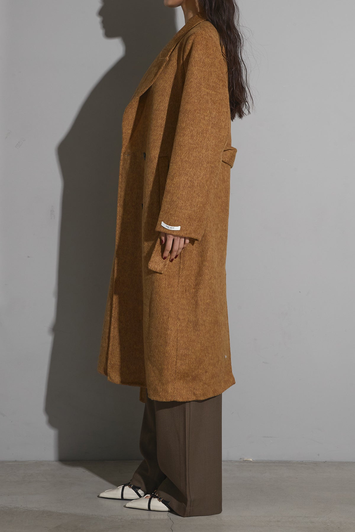 ふんわりとした起毛感が魅力のロングコート。 柔らかな風合いで身体を包み込み、シンプルながらも存在感のあるシルエットに仕上げています。 ヒップまですっぽりと覆う丈感で、スタイリングを選ばず着回しやすい一枚。 カジュアルにもきれいめにも合わせやすく、デイリーに活躍してくれます。