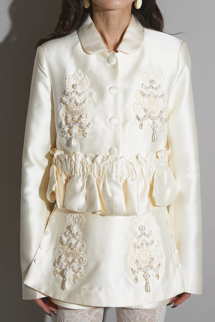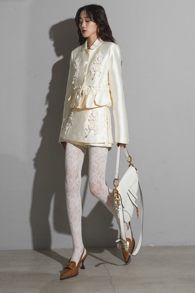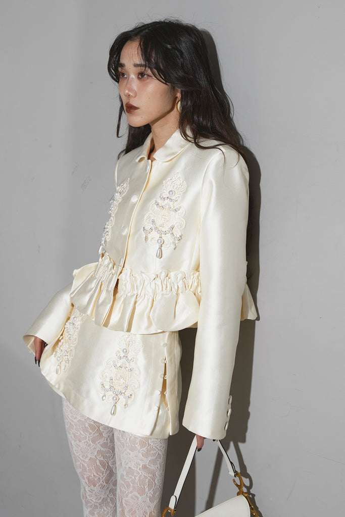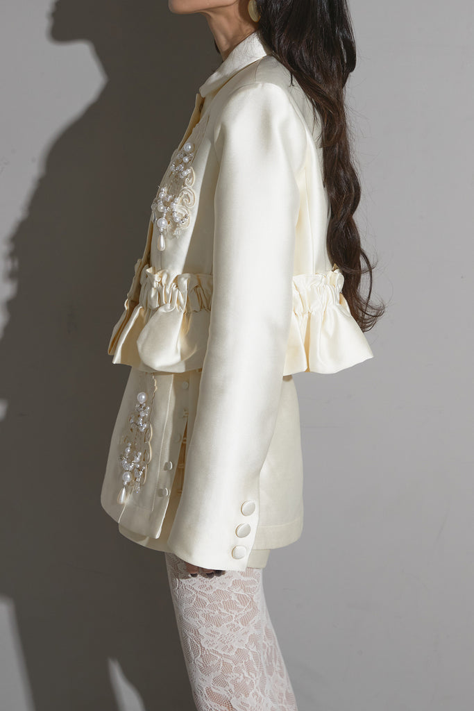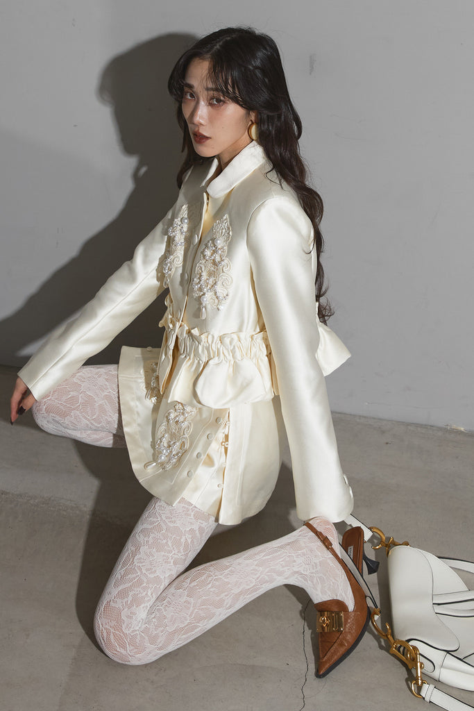 光沢感のある素材に立体的な刺繍を施したエレガントなセットアップ。 ウエストにギャザーを寄せたペプラムデザインが女性らしいシルエットを際立たせます。 ジャケットとしてもワンピース風にも着用でき、スタイリングの幅が広いアイテム。 ショートパンツとのセットで、フォーマルにも特別なシーンにも映える一着です。
