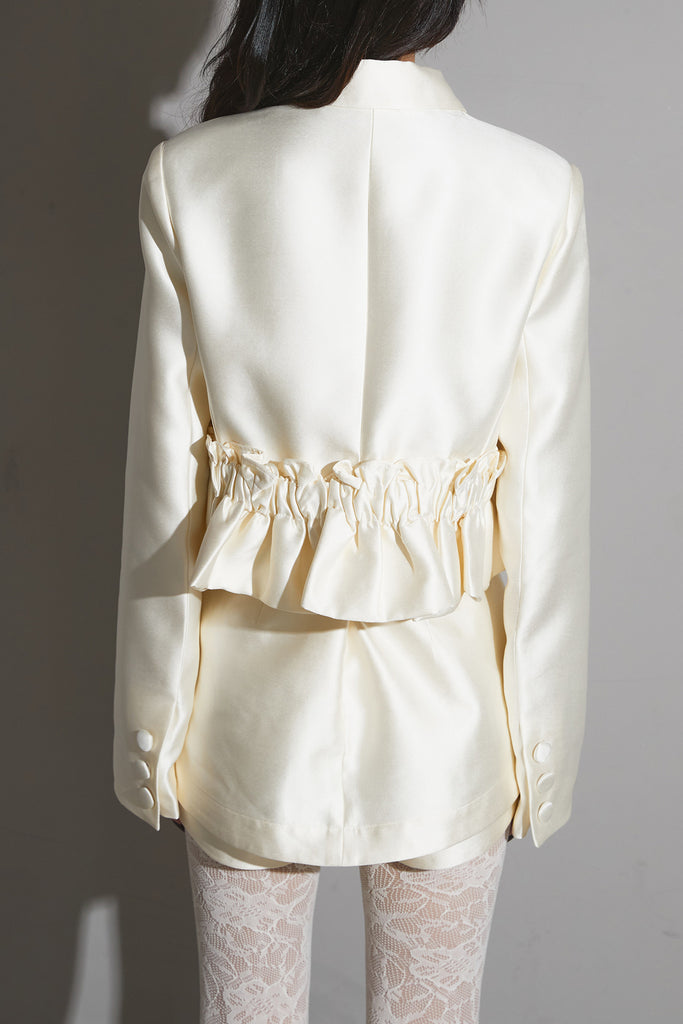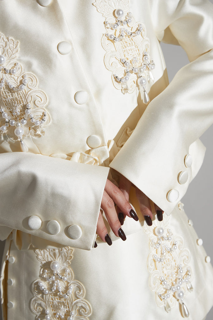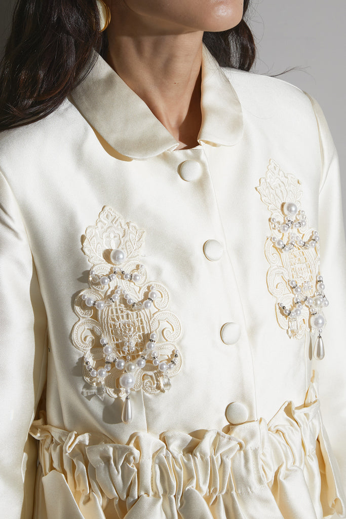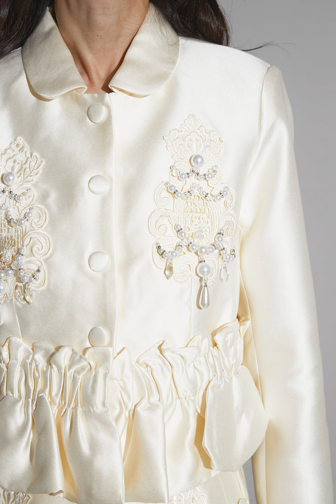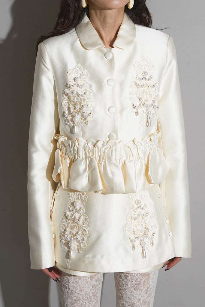 光沢感のある素材に立体的な刺繍を施したエレガントなセットアップ。 ウエストにギャザーを寄せたペプラムデザインが女性らしいシルエットを際立たせます。 ジャケットとしてもワンピース風にも着用でき、スタイリングの幅が広いアイテム。 ショートパンツとのセットで、フォーマルにも特別なシーンにも映える一着です。
