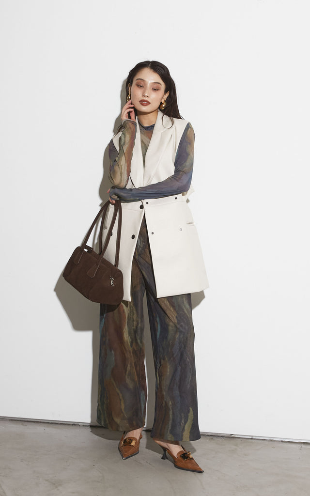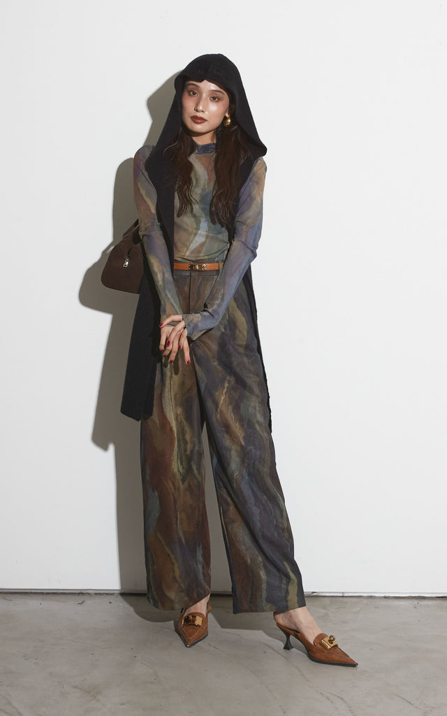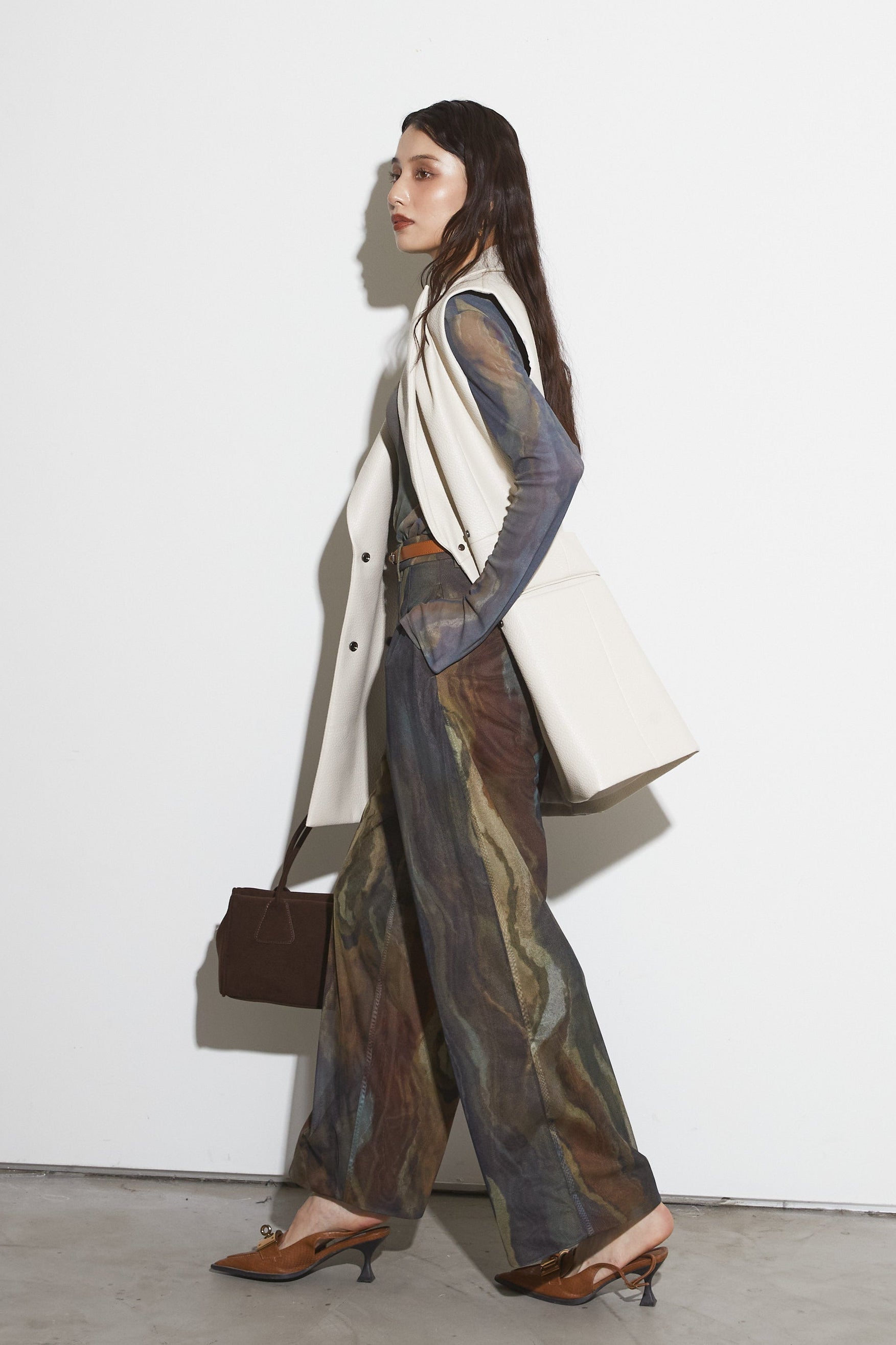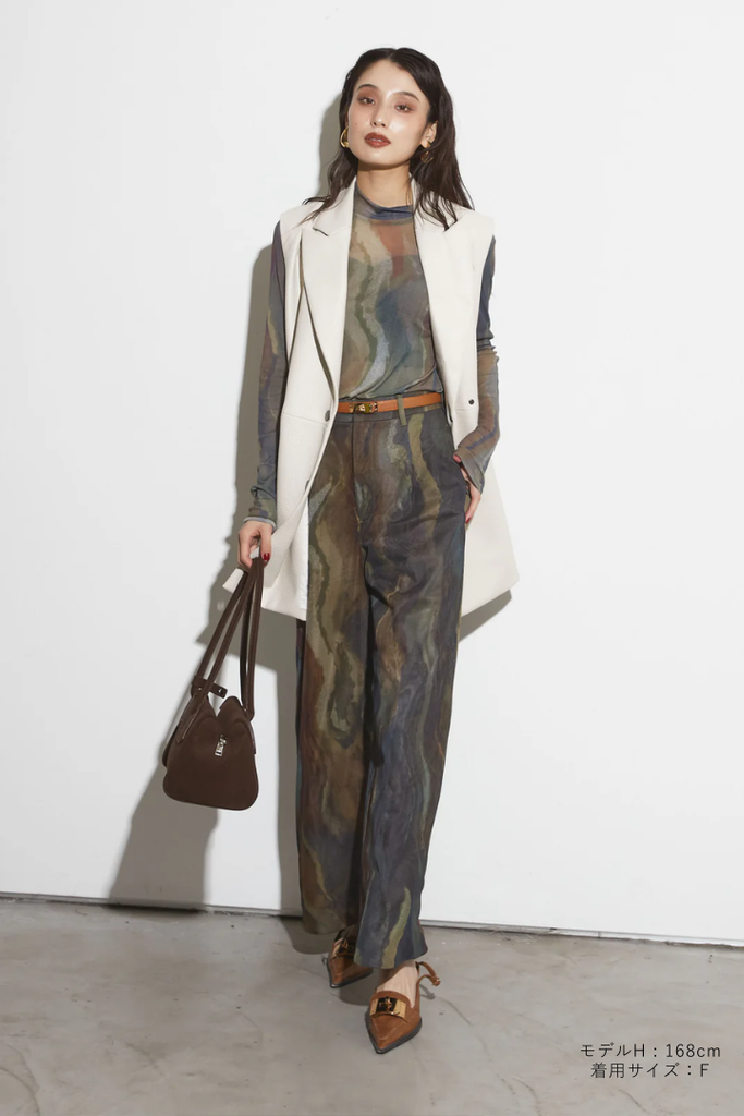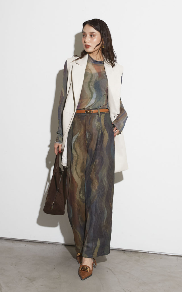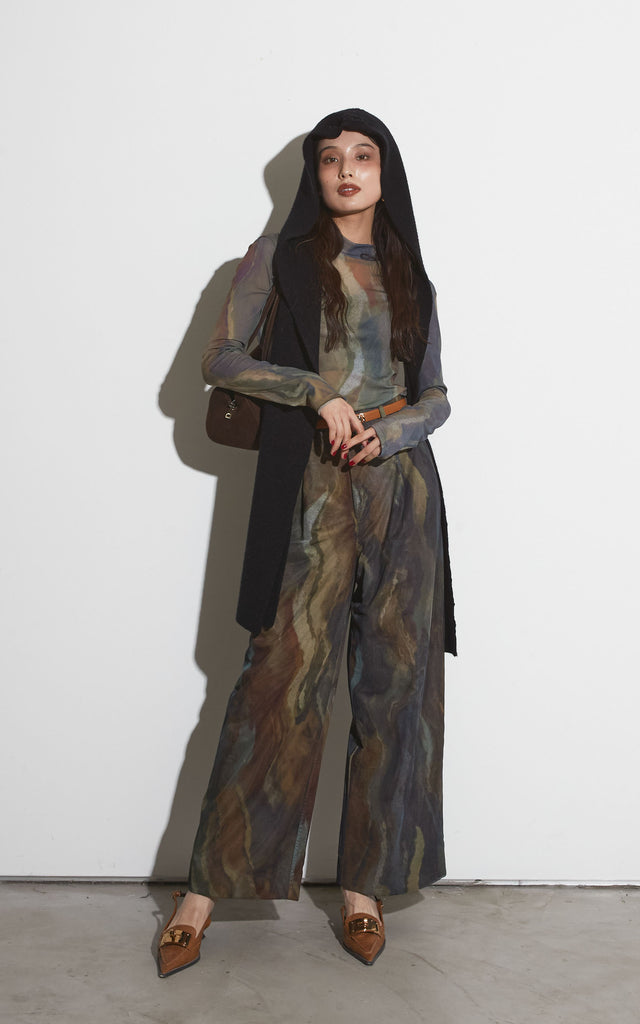 繊細なチュール素材にアーティスティックなプリントを施したインナー。軽やかな透け感と深みのある色調が重なり合い、レイヤードスタイルに奥行きを与えます。身体に程よくフィットするシルエットで、単品ではもちろん、ジャケットやニットのインナーとしても活躍。同素材のジャケットやパンツと合わせれば、統一感のあるモードなスタイルが完成します。コーディネート次第で印象を自在に変えられる万能な一着です。