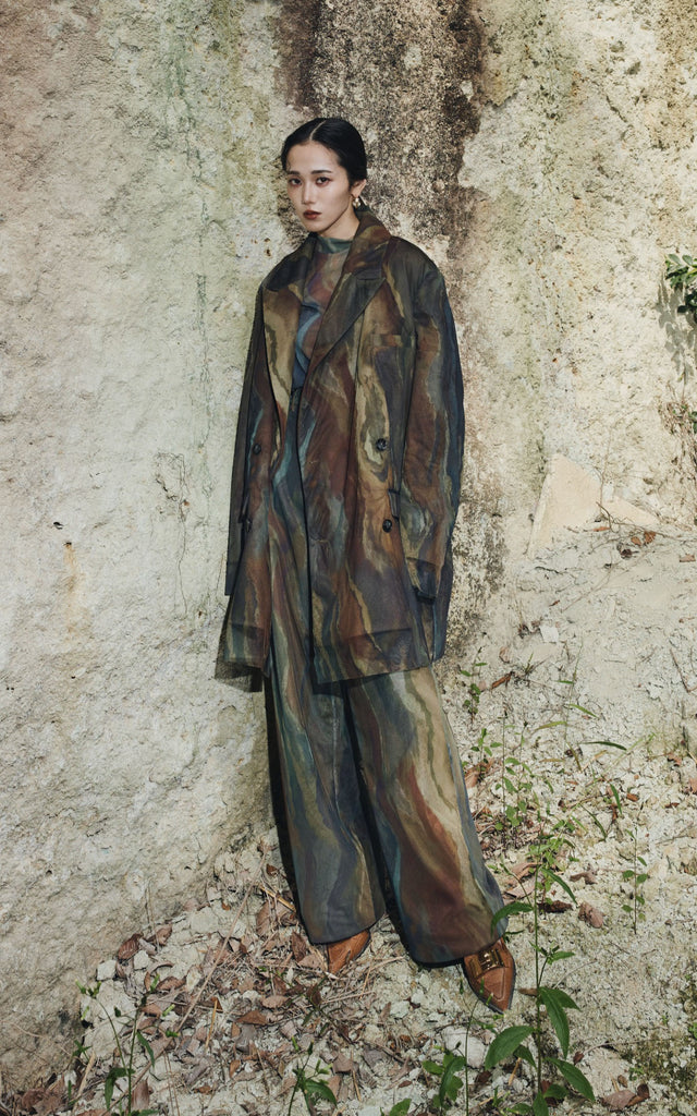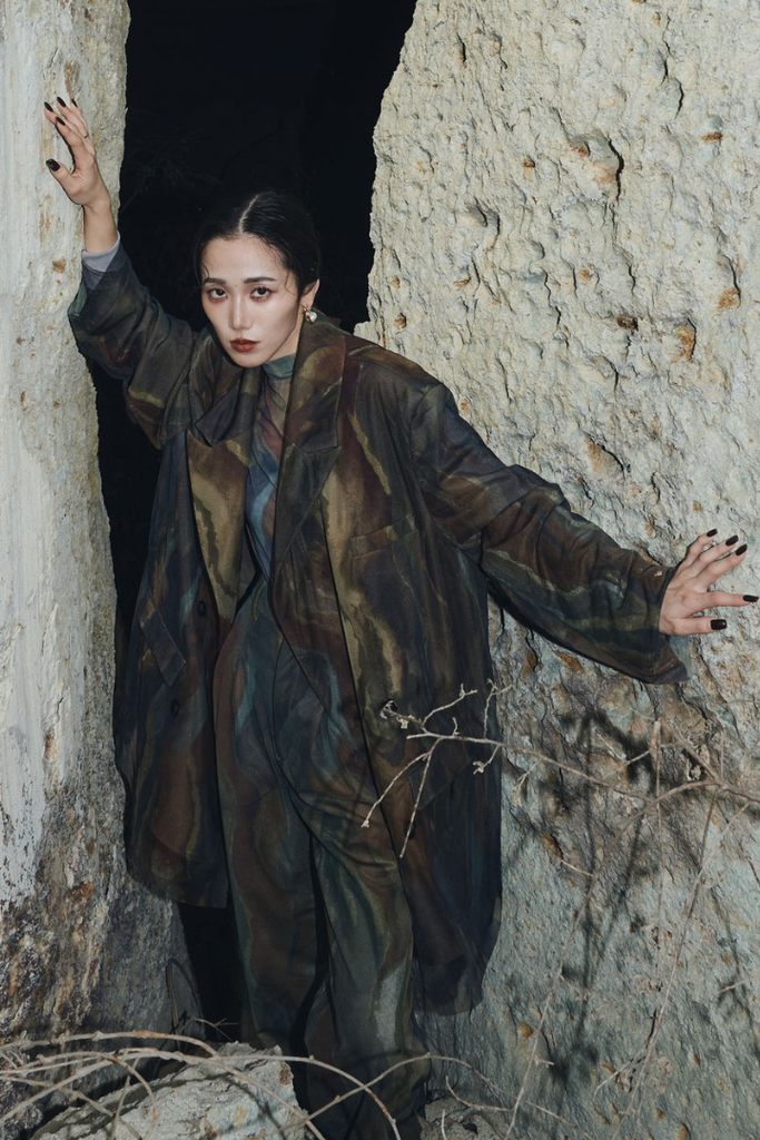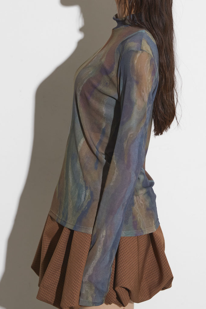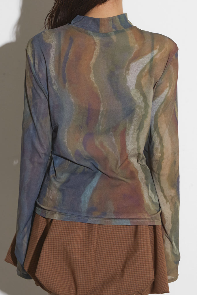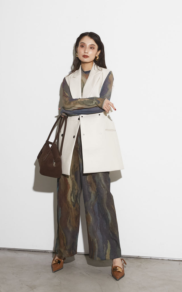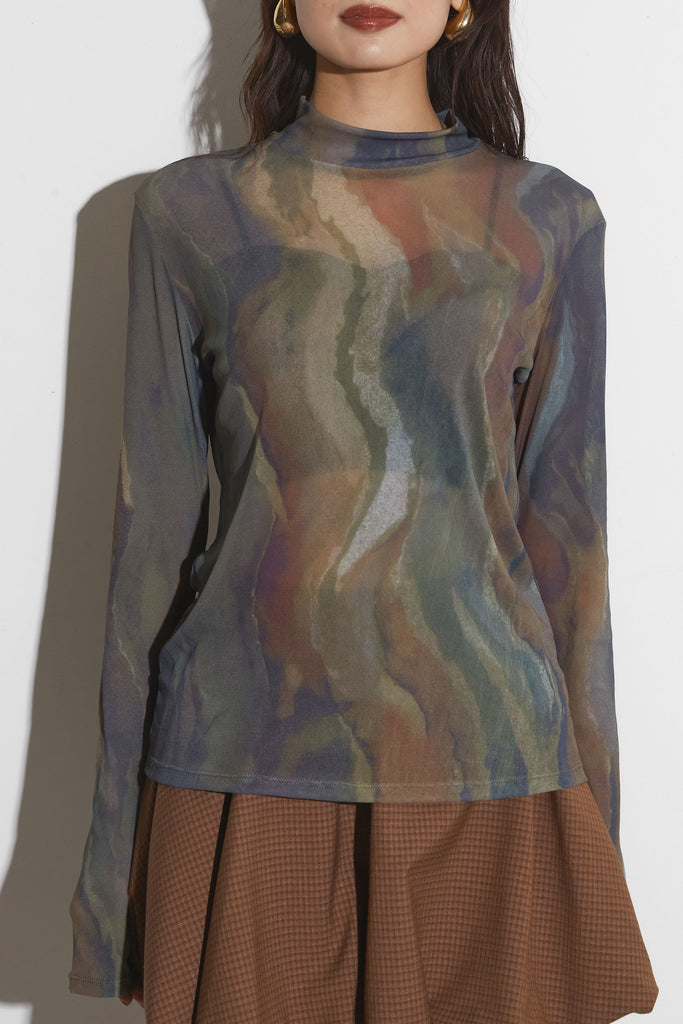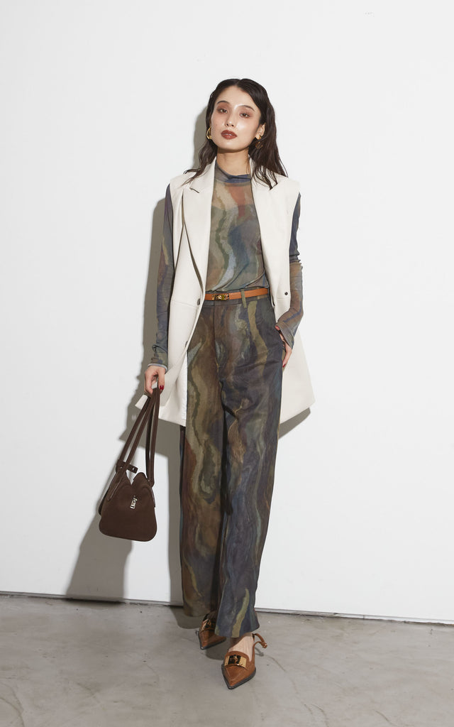 繊細なチュール素材にアーティスティックなプリントを施したインナー。軽やかな透け感と深みのある色調が重なり合い、レイヤードスタイルに奥行きを与えます。身体に程よくフィットするシルエットで、単品ではもちろん、ジャケットやニットのインナーとしても活躍。同素材のジャケットやパンツと合わせれば、統一感のあるモードなスタイルが完成します。コーディネート次第で印象を自在に変えられる万能な一着です。