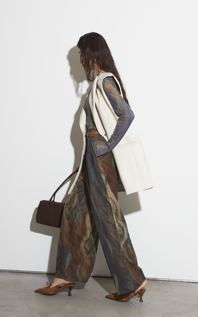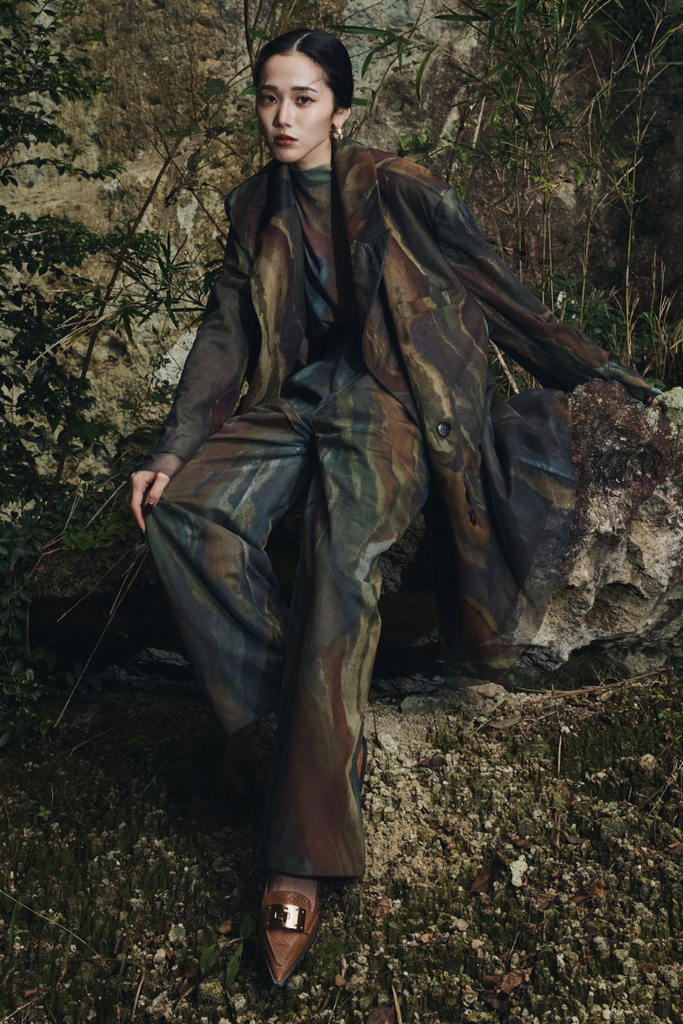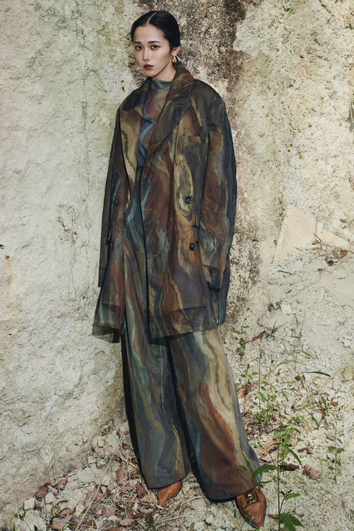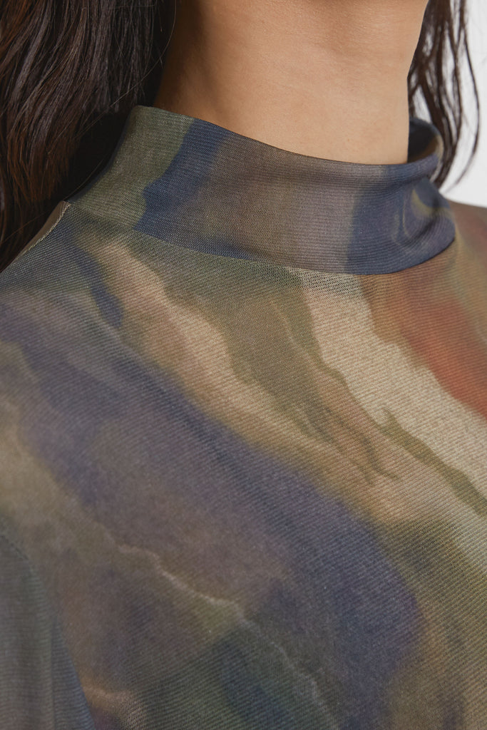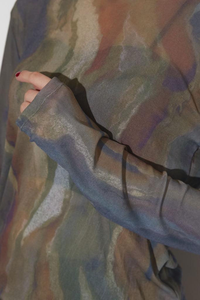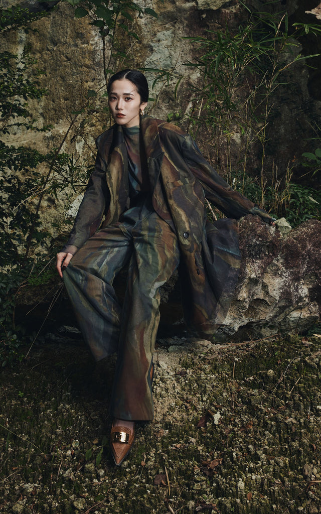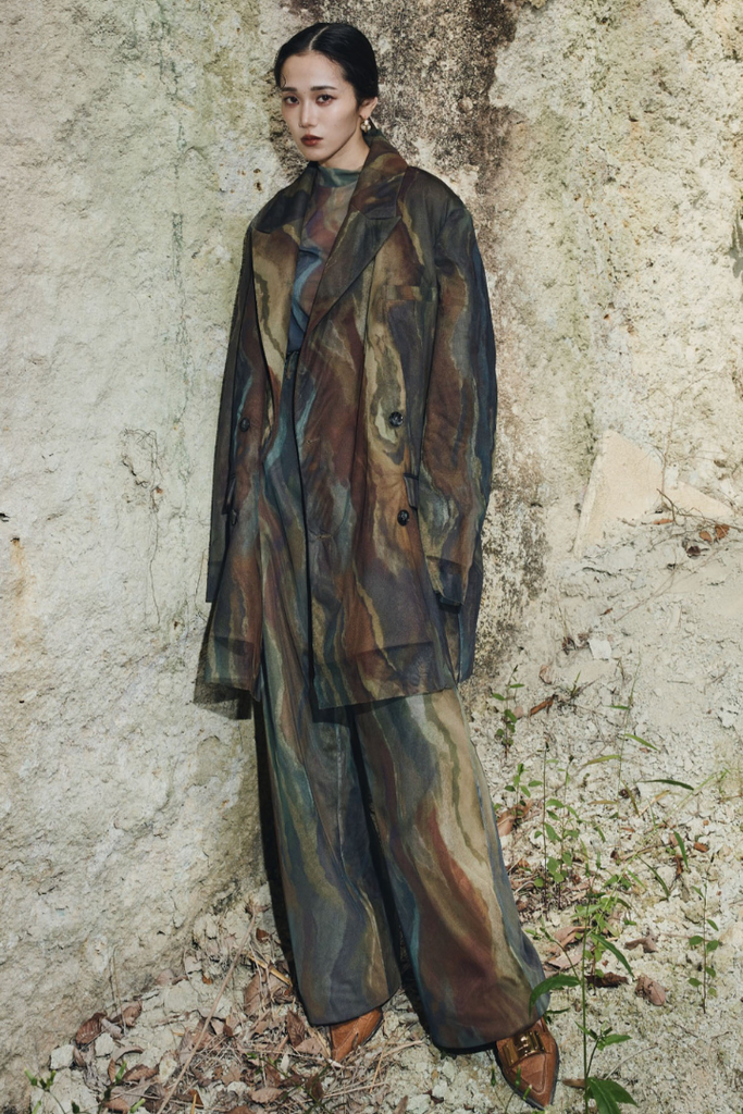 繊細なチュール素材にアーティスティックなプリントを施したインナー。軽やかな透け感と深みのある色調が重なり合い、レイヤードスタイルに奥行きを与えます。身体に程よくフィットするシルエットで、単品ではもちろん、ジャケットやニットのインナーとしても活躍。同素材のジャケットやパンツと合わせれば、統一感のあるモードなスタイルが完成します。コーディネート次第で印象を自在に変えられる万能な一着です。