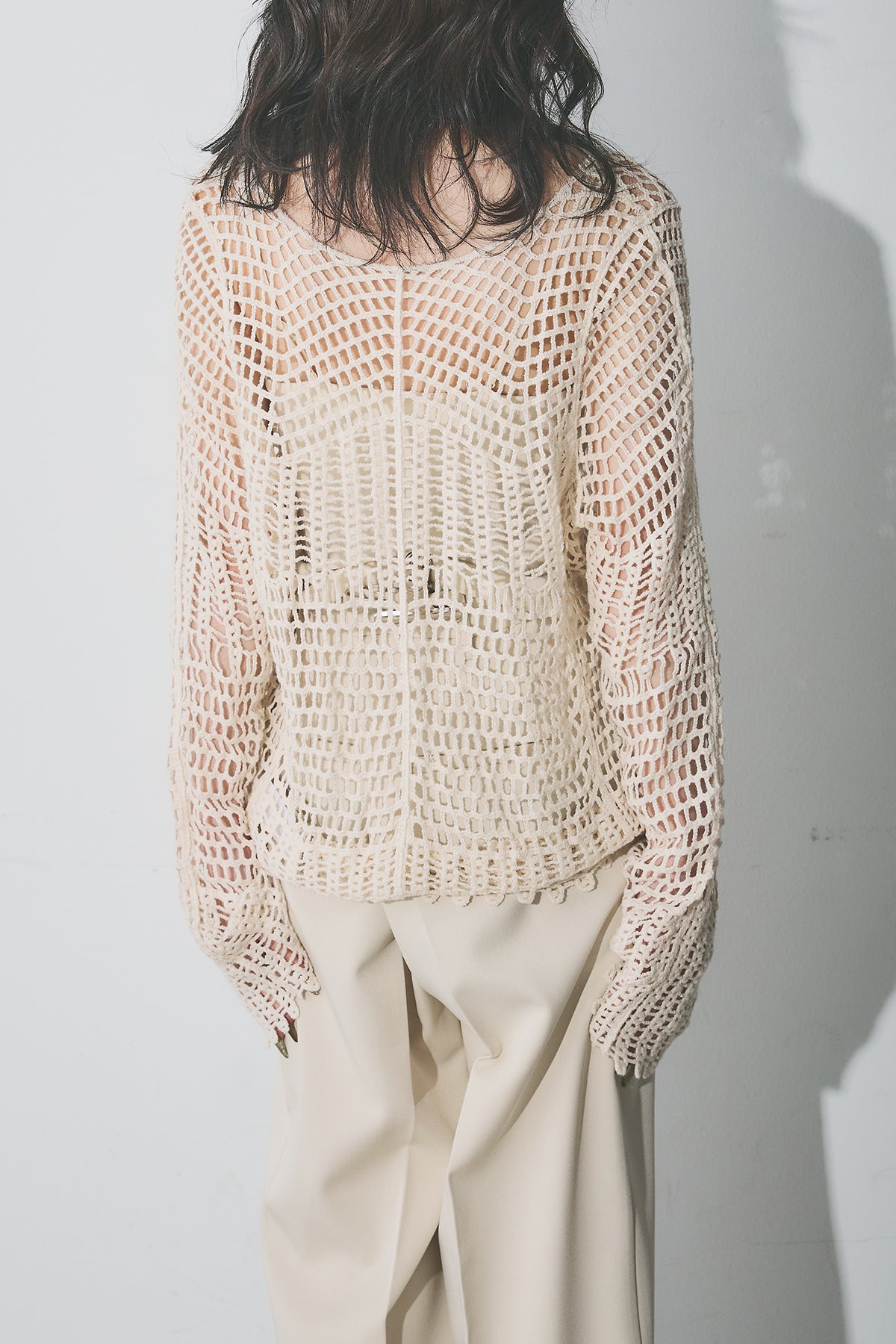 ナチュラルな抜け感が魅力のメッシュ編みプルオーバー。 ゆるやかなシルエットと、袖口や裾にあしらわれたさりげないフリンジが動きのある表情をプラス。 インナーとのレイヤードが楽しめる、シーズンライクな一枚です。