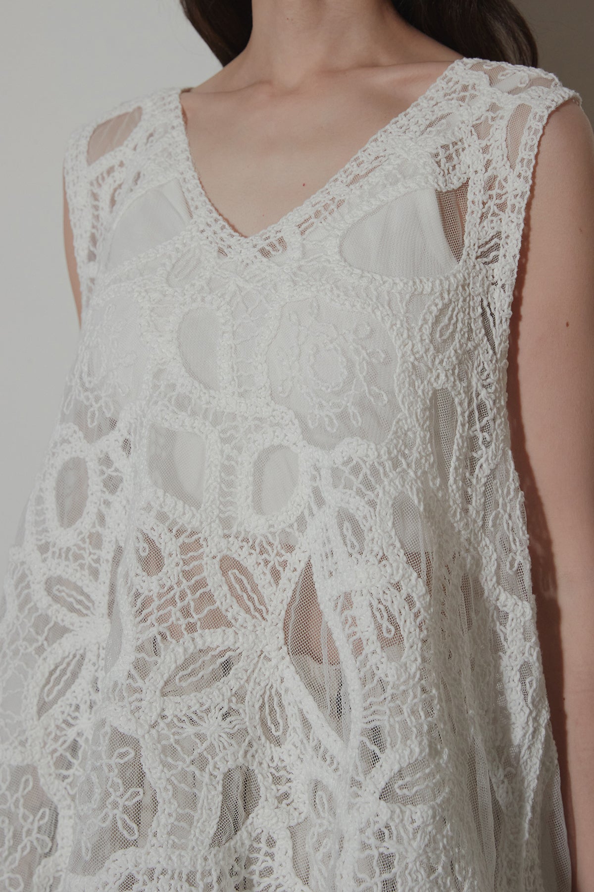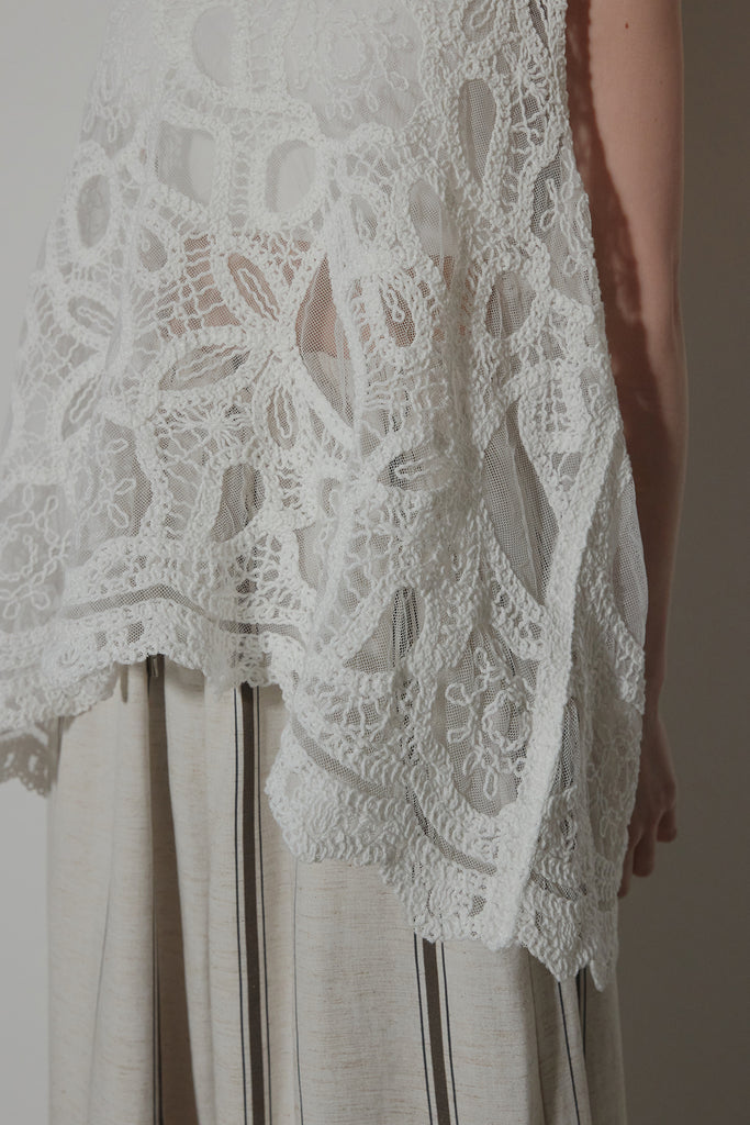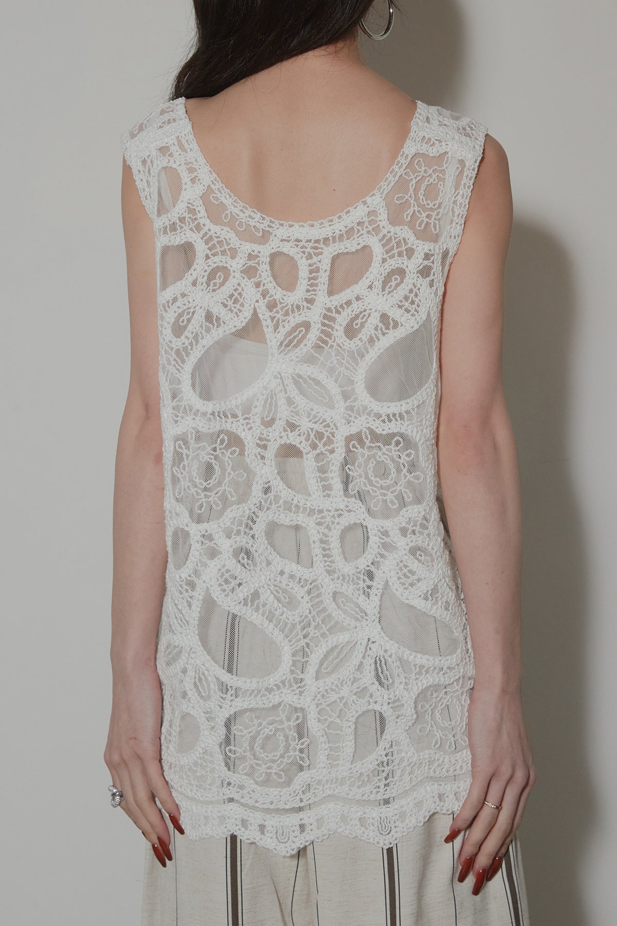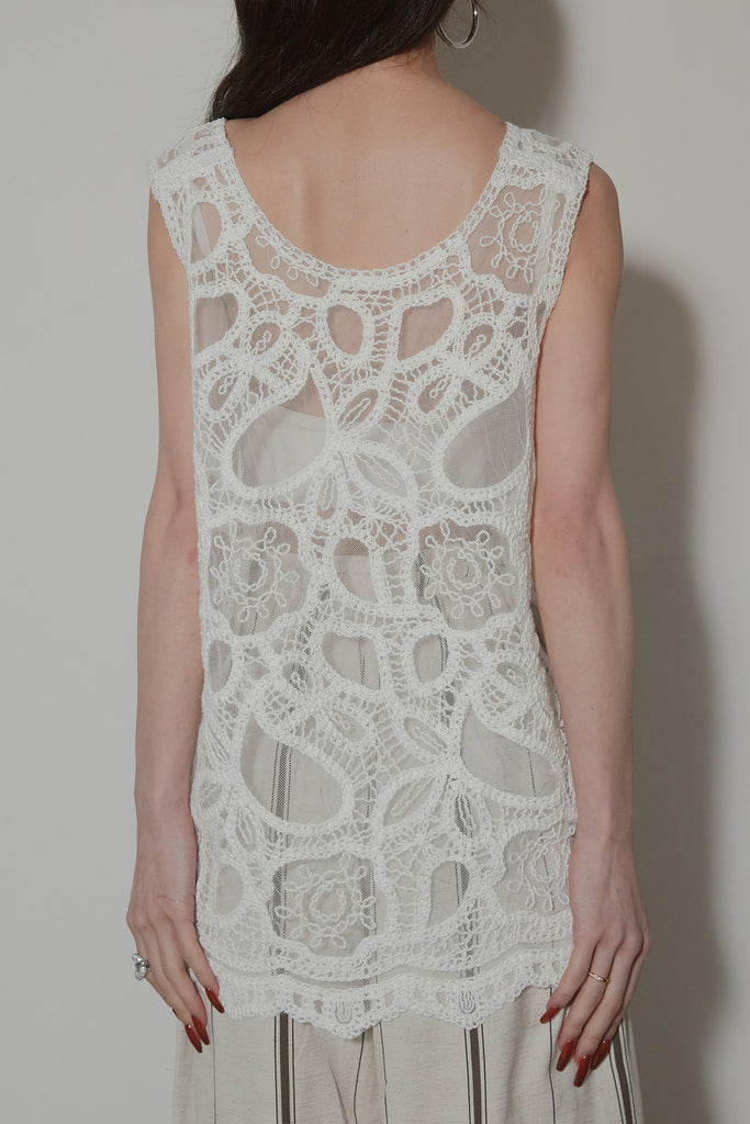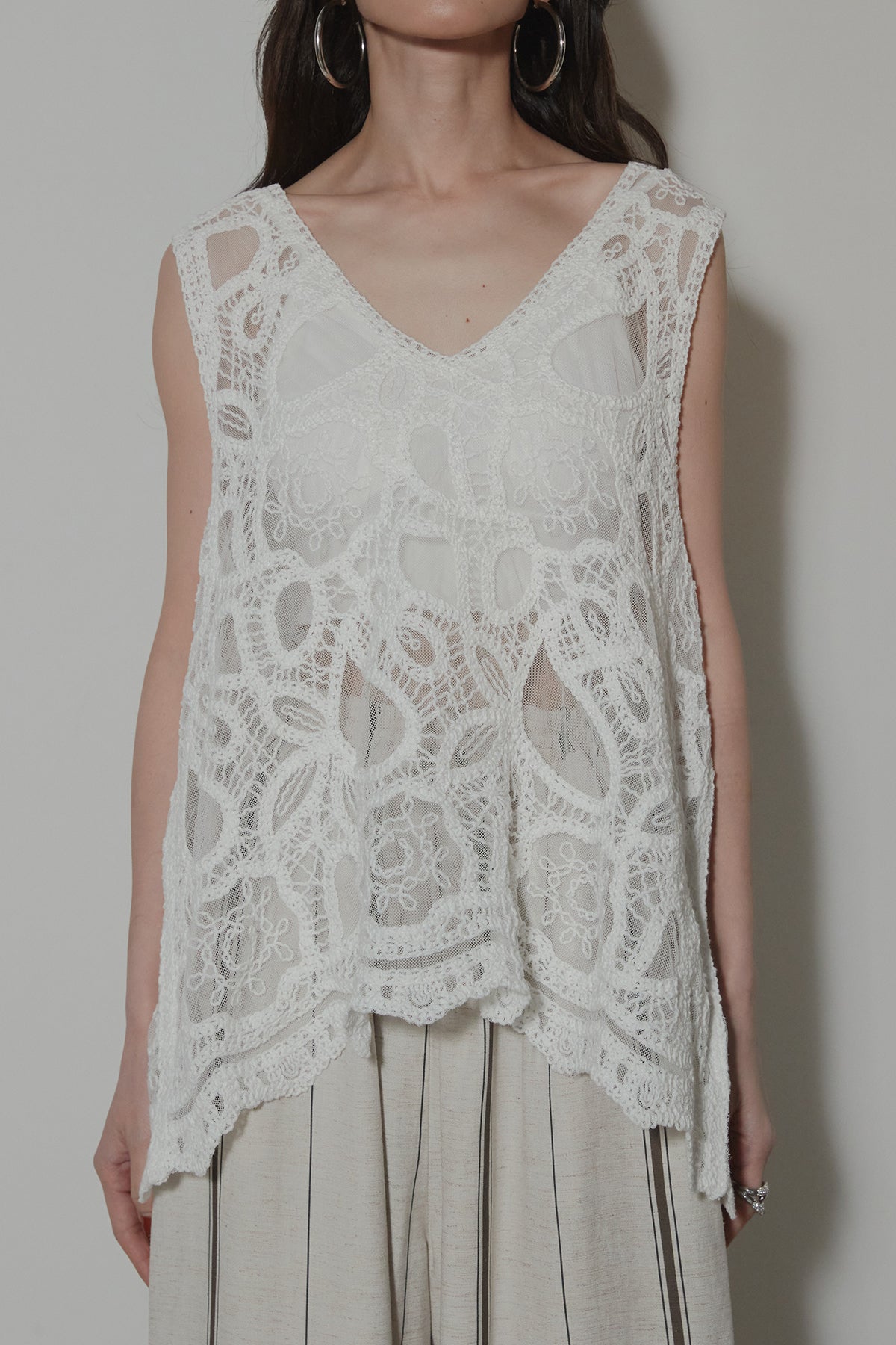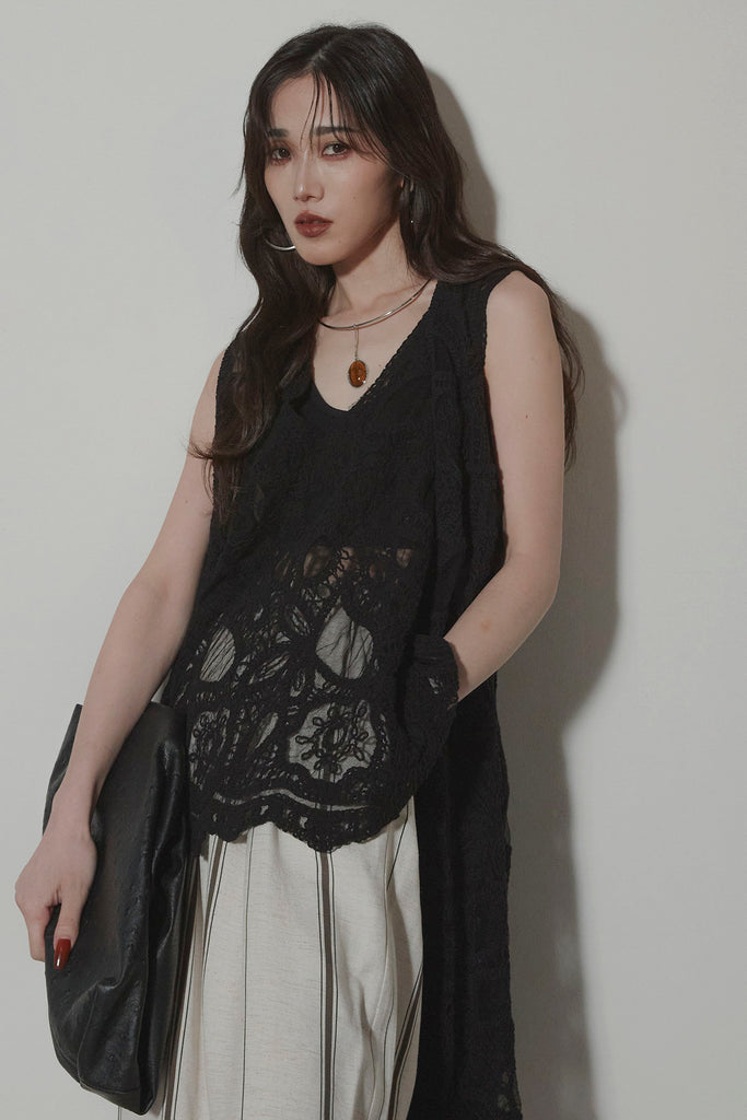 繊細な柄が際立つ、総レースのノースリーブトップス。 透け感を活かしたデザインで、インナーとのレイヤードが楽しめます。 やわらかく優雅な印象を演出するエレガントな1枚です。