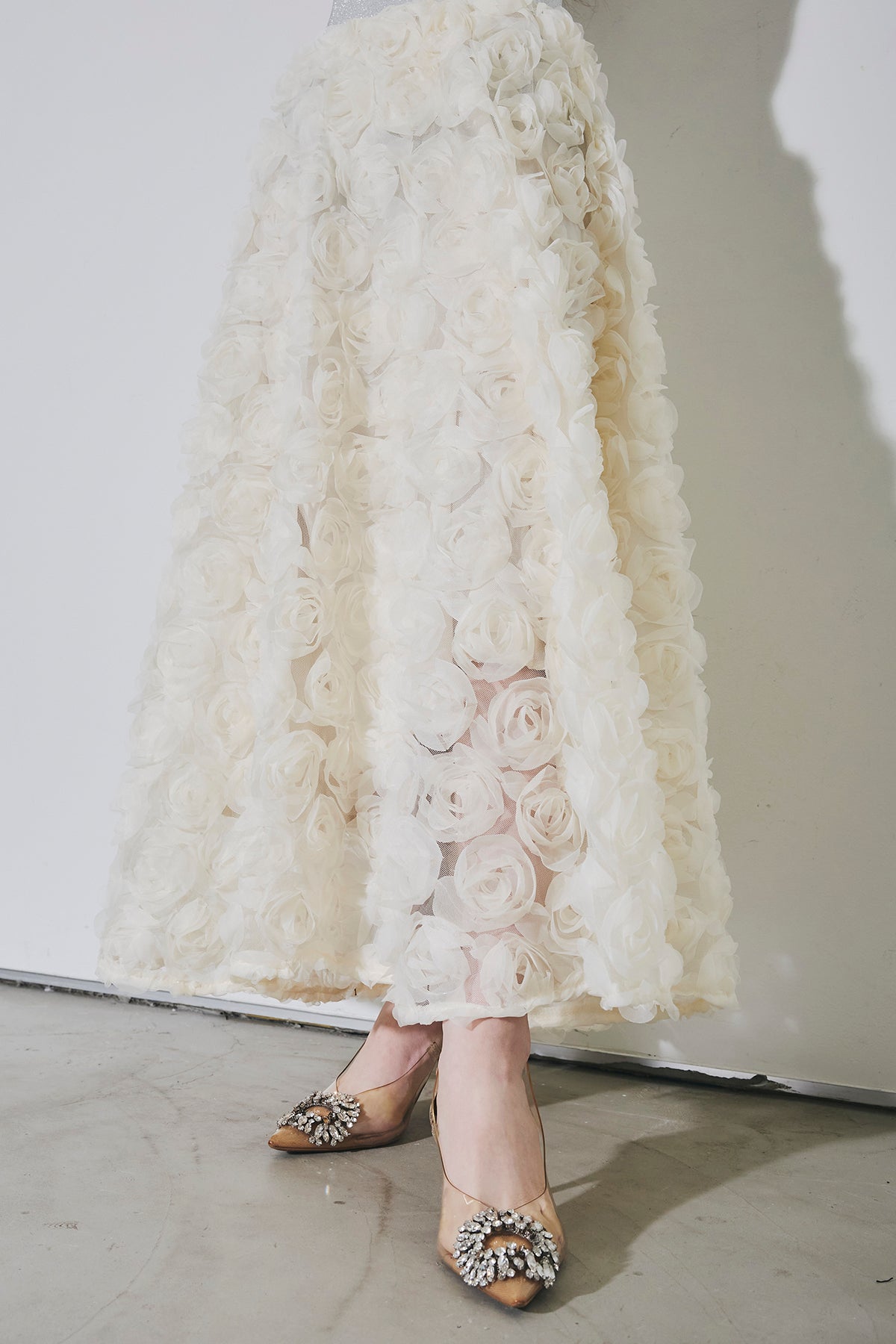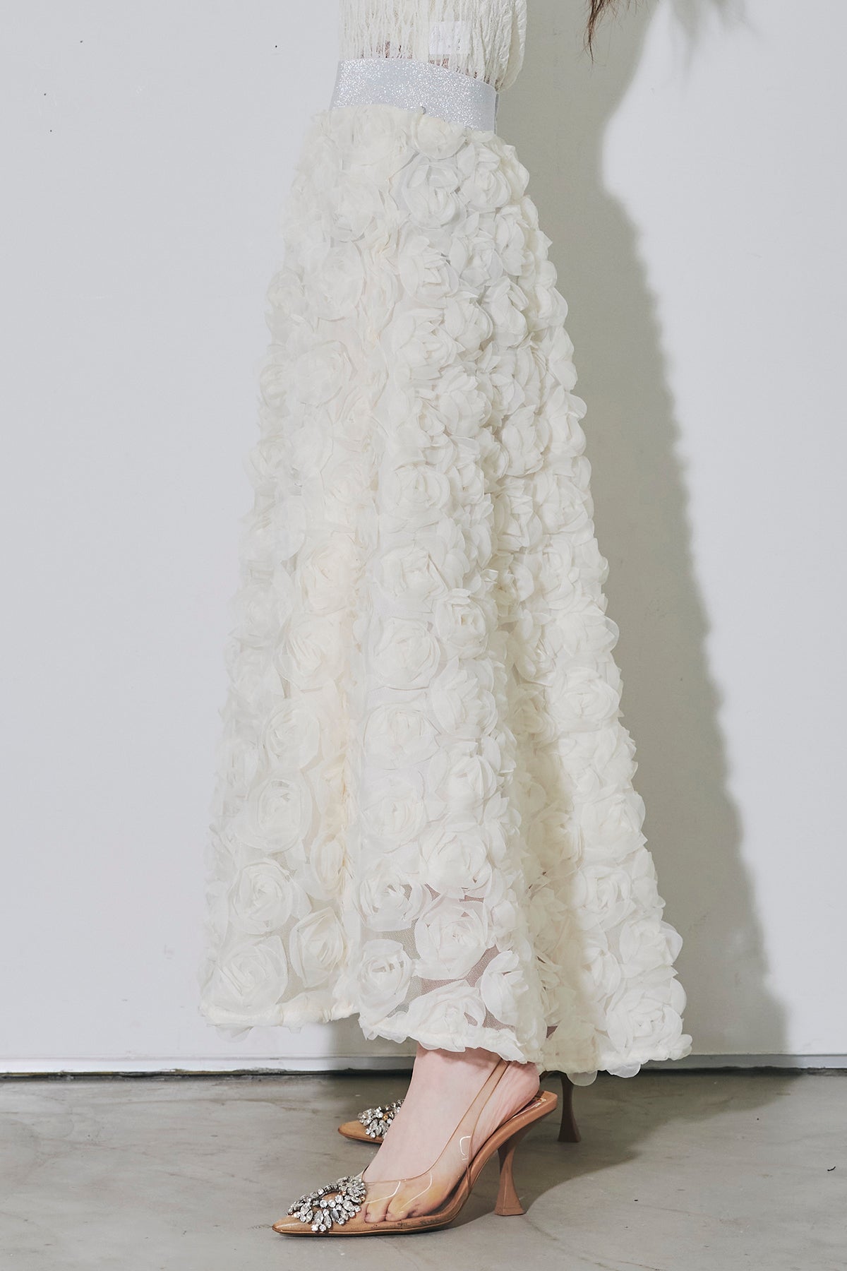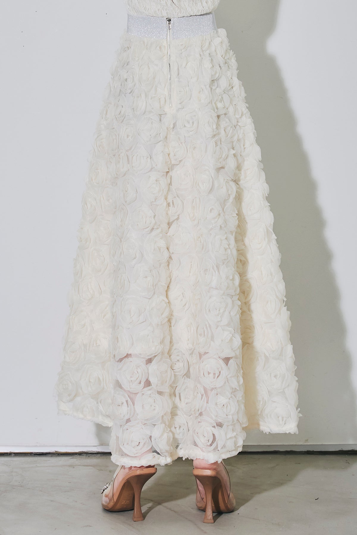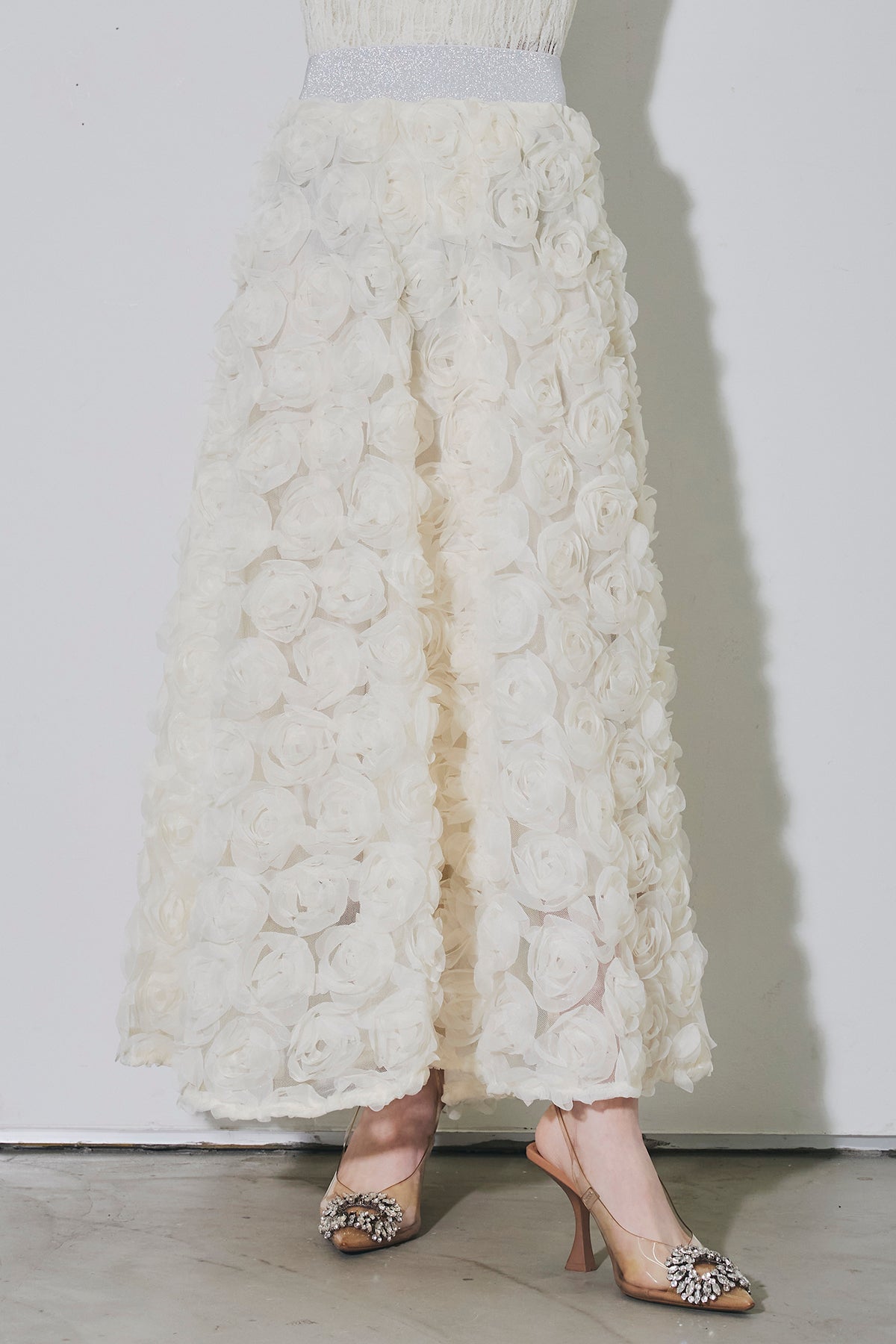 立体的なフラワーモチーフが目を惹くロングスカート。ふんわりと広がるフレアシルエットが動くたびに優雅に揺れ、存在感のある一枚に仕上がっています。ボリュームがありながらも軽やかな素材感で、重たく見えないのもポイント。シンプルなトップスと合わせるだけで華やかなスタイリングが完成し、オケージョンから特別なお出かけまで幅広く活躍します。