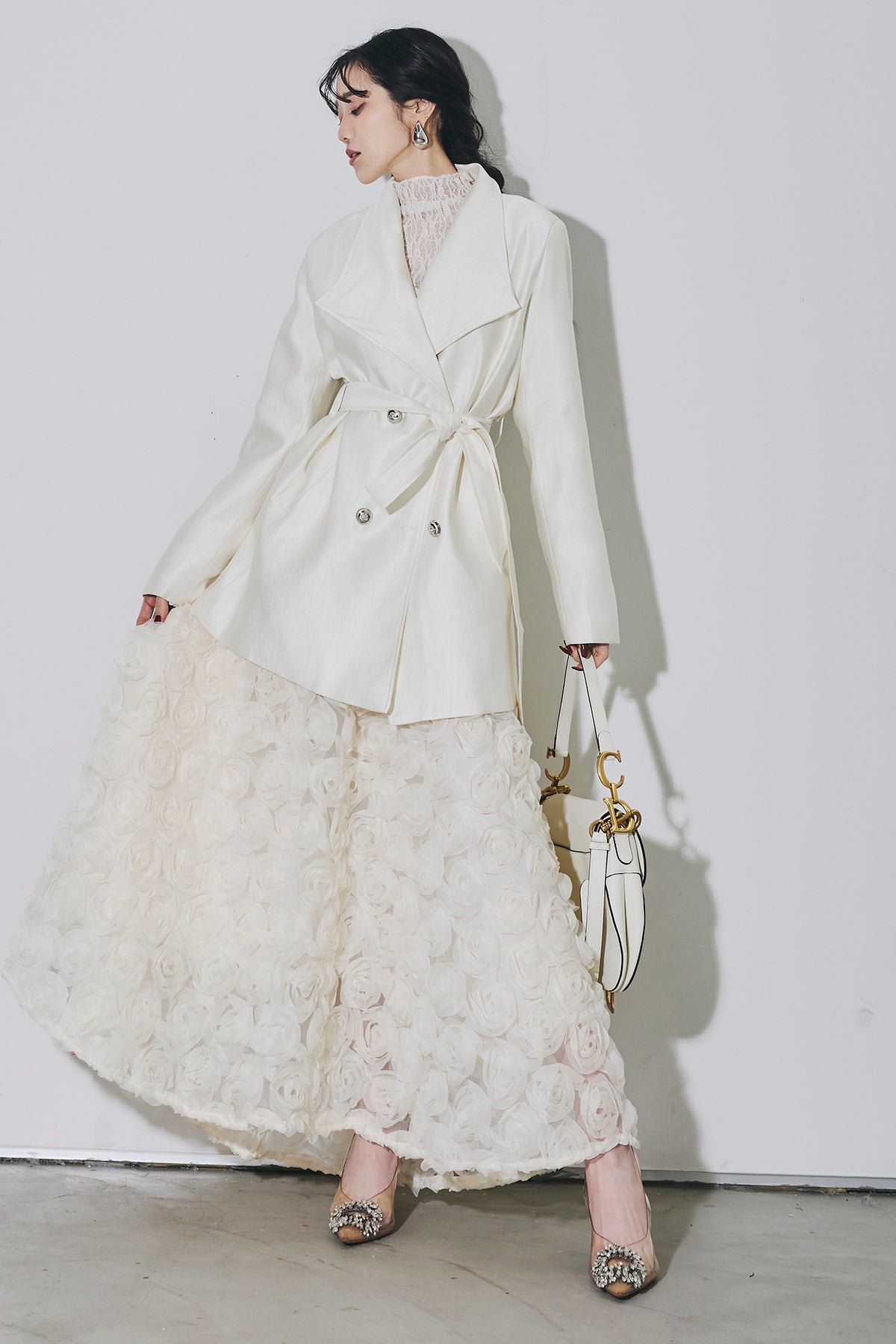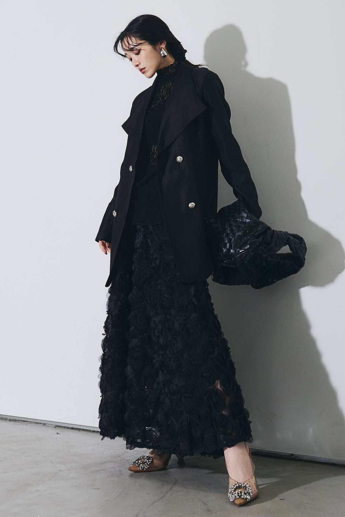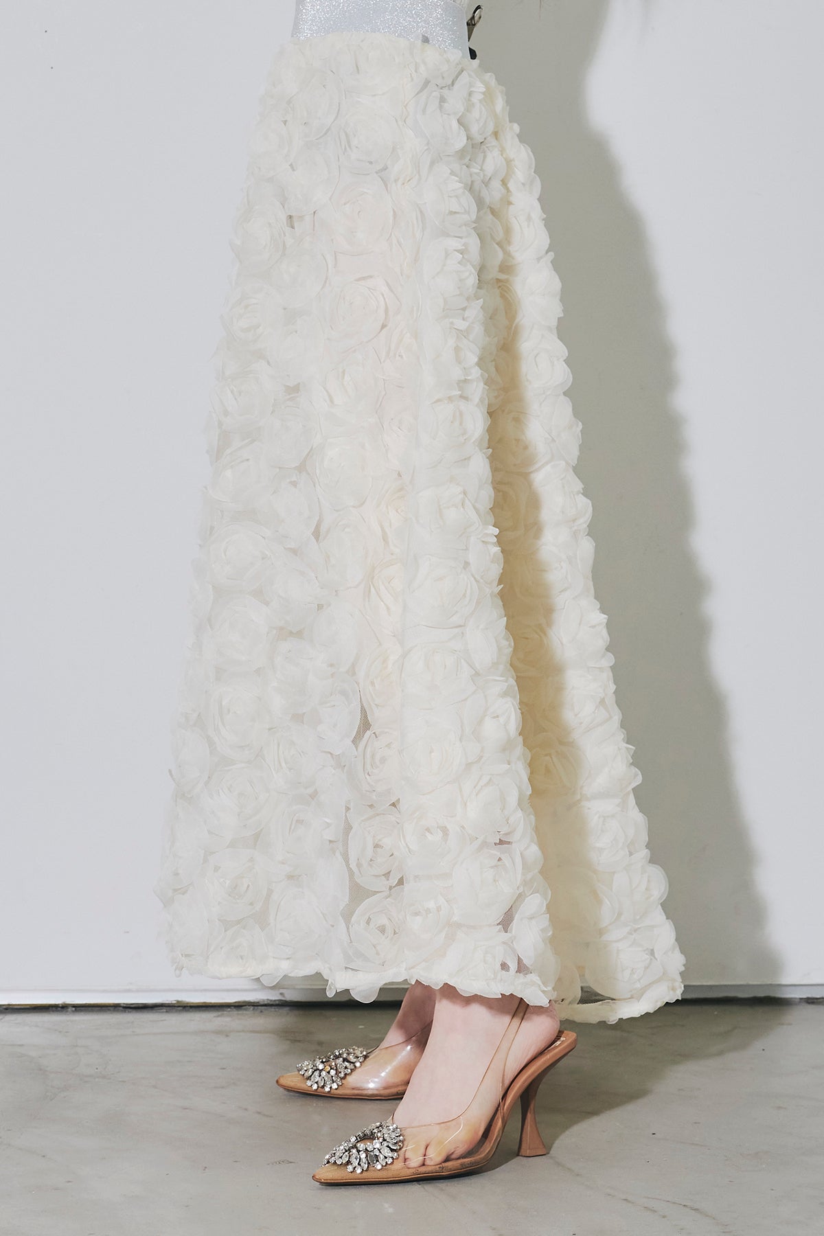立体的なフラワーモチーフが目を惹くロングスカート。ふんわりと広がるフレアシルエットが動くたびに優雅に揺れ、存在感のある一枚に仕上がっています。ボリュームがありながらも軽やかな素材感で、重たく見えないのもポイント。シンプルなトップスと合わせるだけで華やかなスタイリングが完成し、オケージョンから特別なお出かけまで幅広く活躍します。