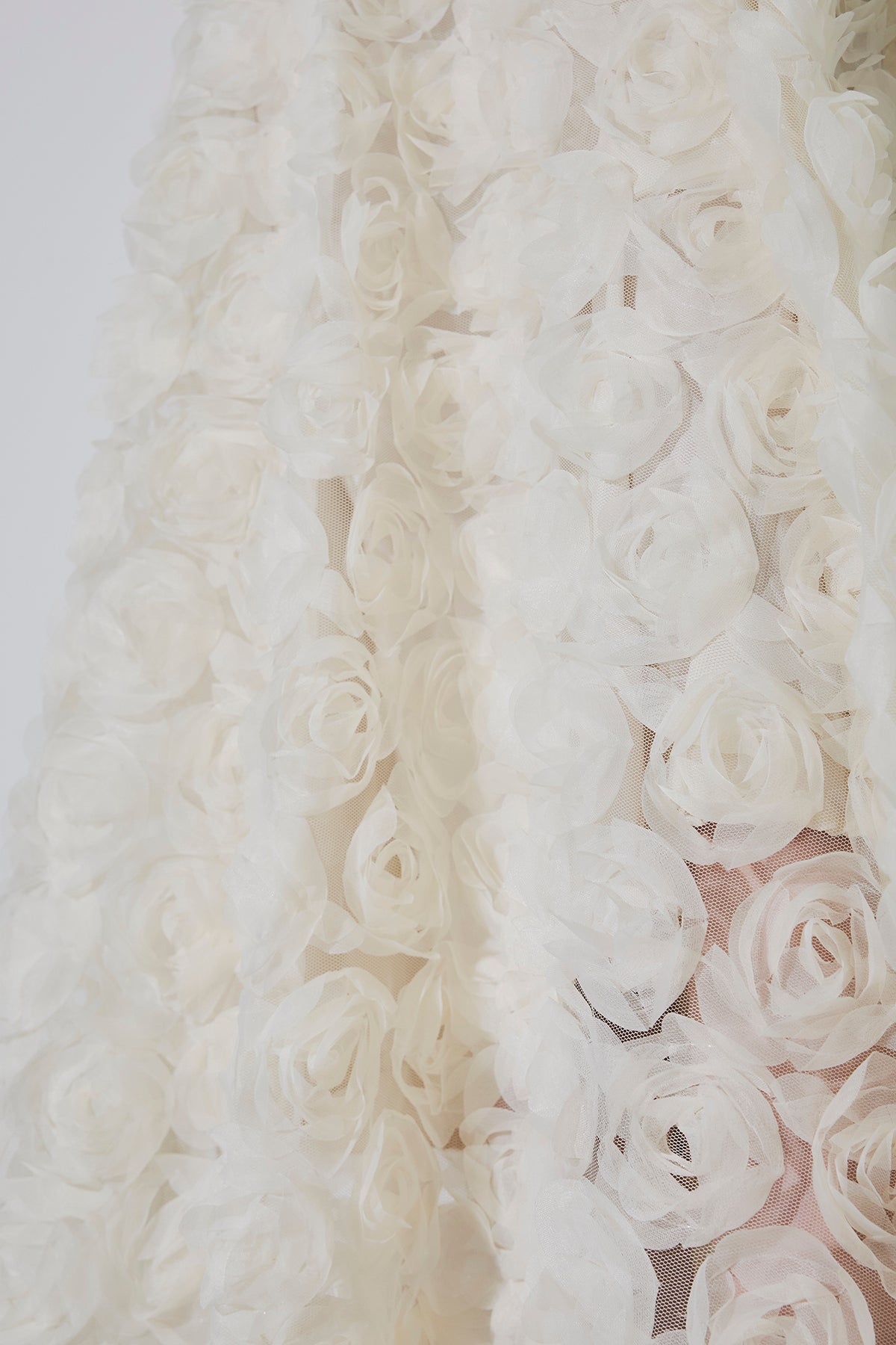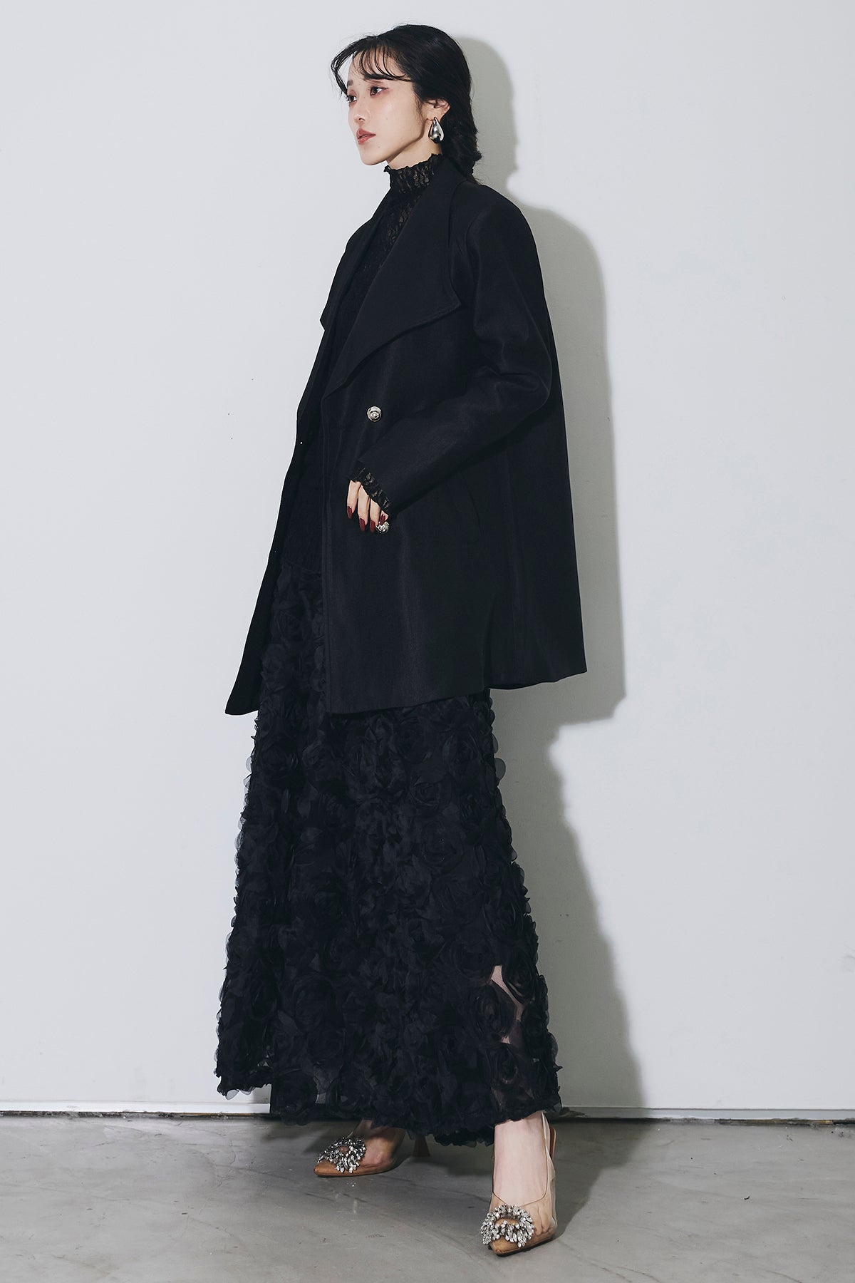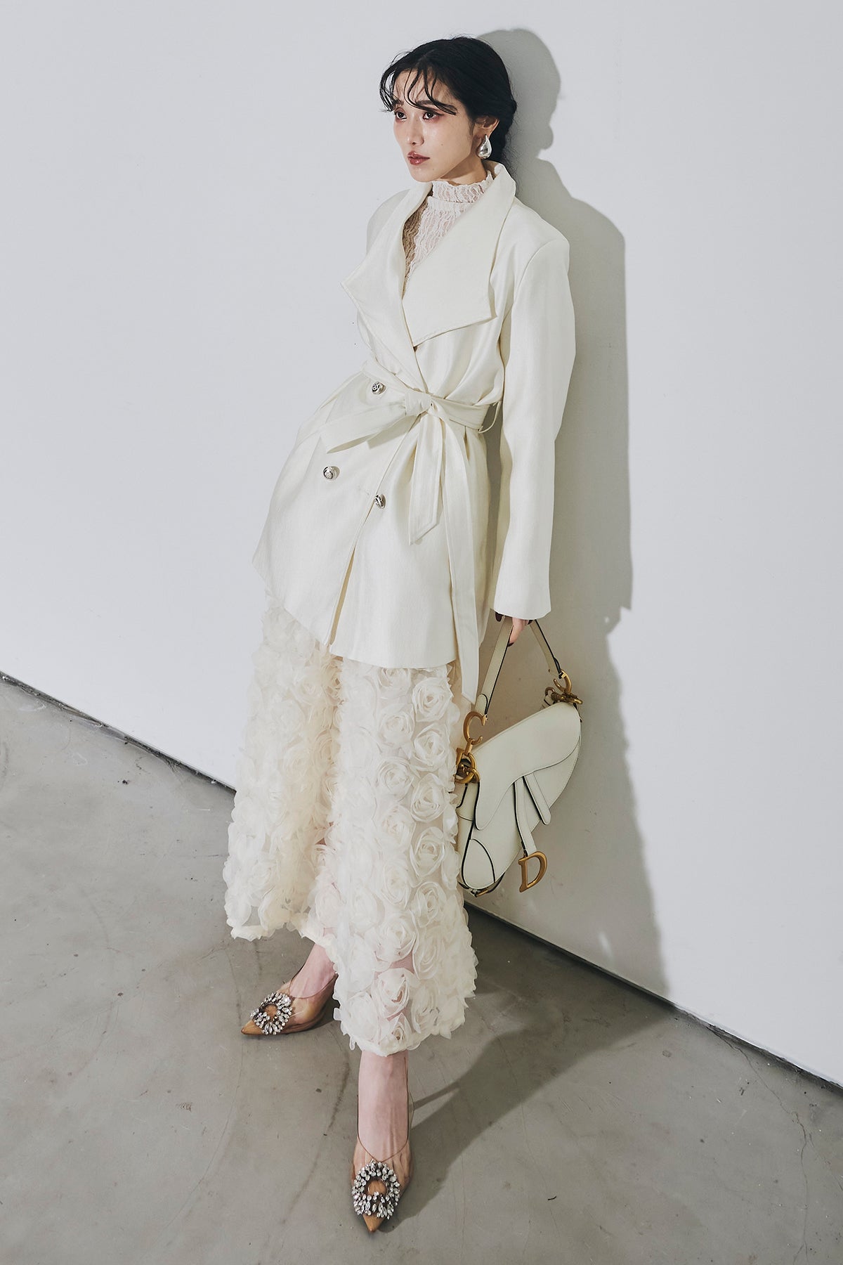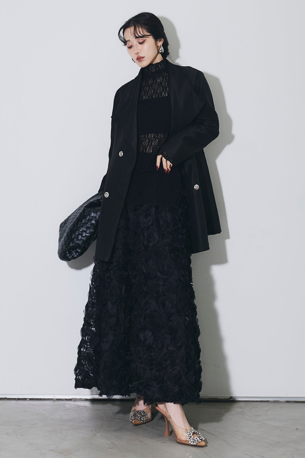 立体的なフラワーモチーフが目を惹くロングスカート。ふんわりと広がるフレアシルエットが動くたびに優雅に揺れ、存在感のある一枚に仕上がっています。ボリュームがありながらも軽やかな素材感で、重たく見えないのもポイント。シンプルなトップスと合わせるだけで華やかなスタイリングが完成し、オケージョンから特別なお出かけまで幅広く活躍します。