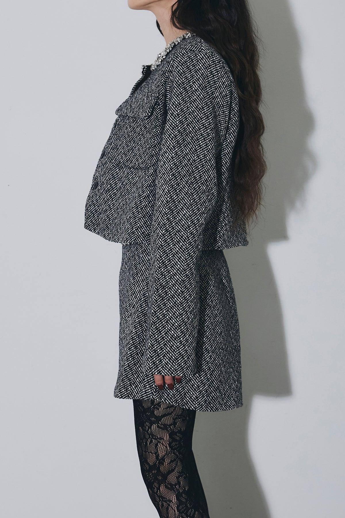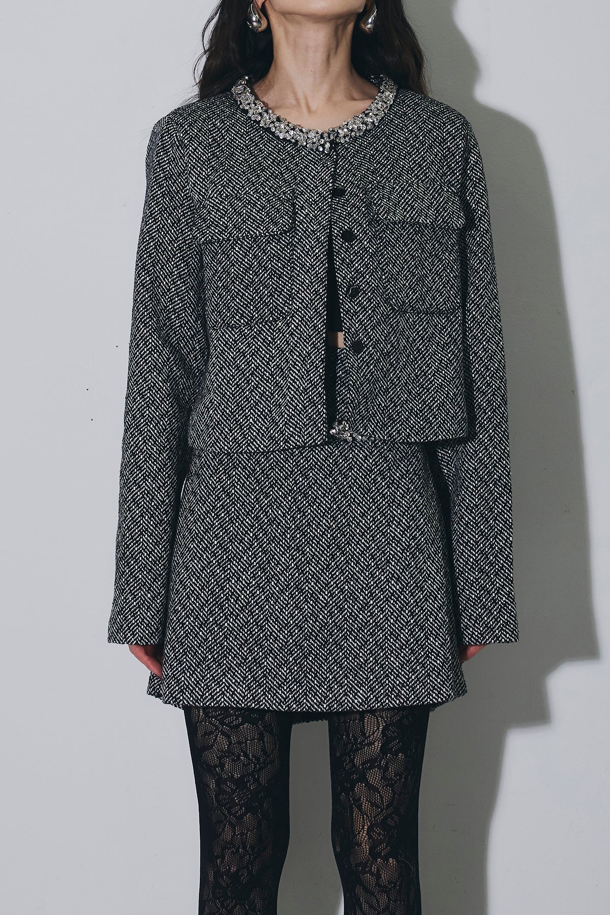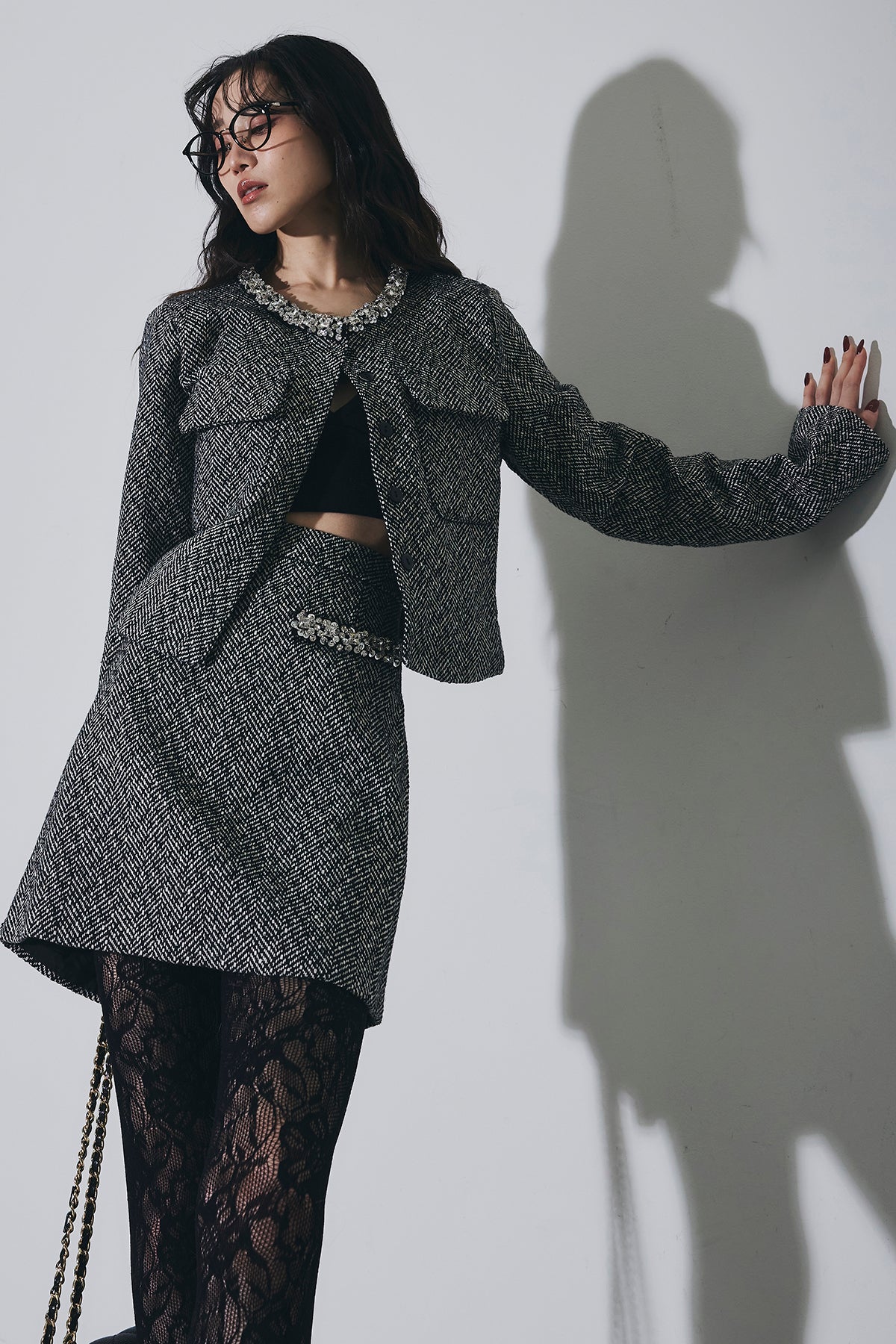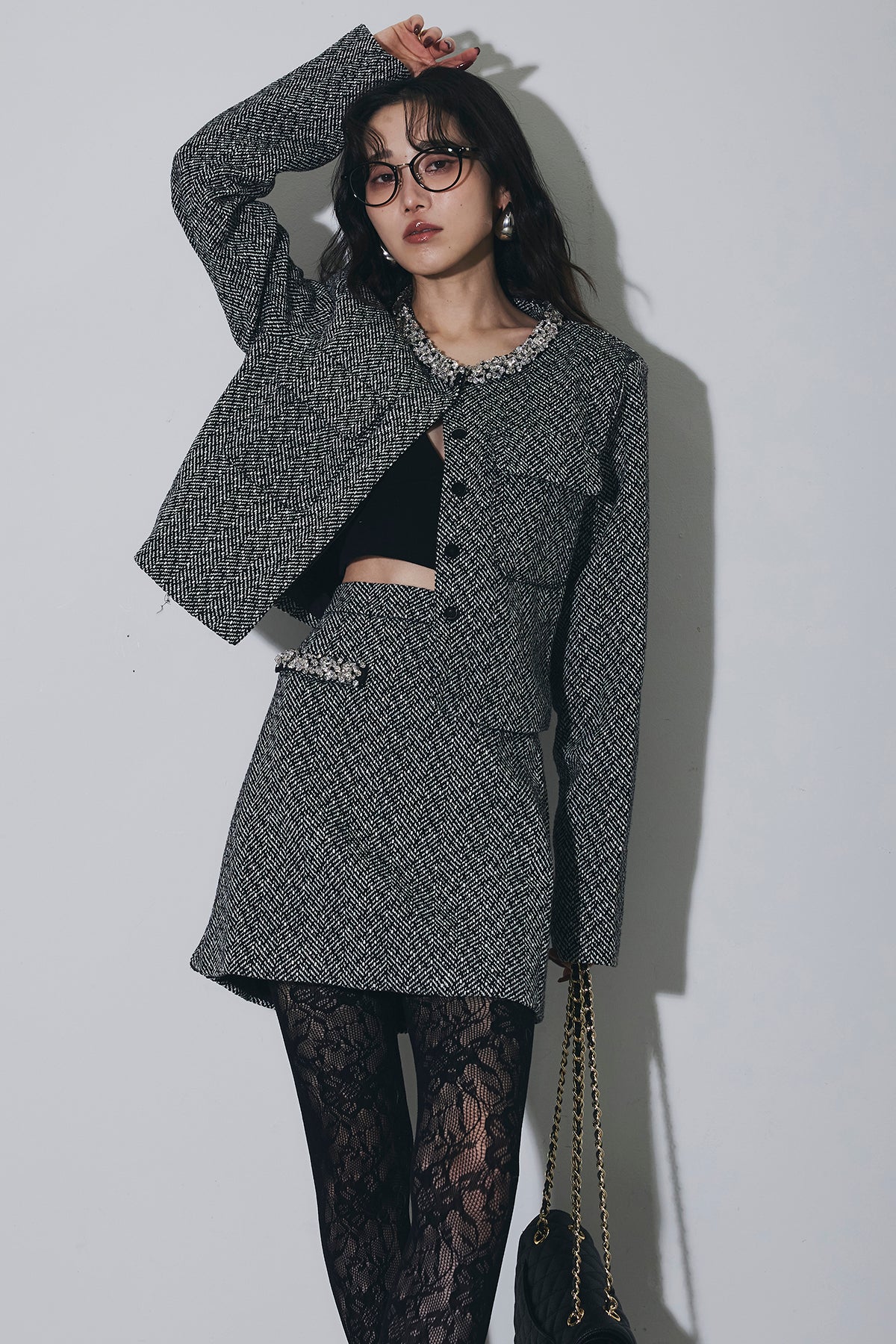ご注文前に必ずページ下部「お届け期間」をご確認くださいませ。クラシカルなツイード素材を使用したセットアップ。コンパクトなジャケットはフロントボタンとポケットデザインで程よいきちんと感を演出し、すっきりとしたミニ丈ボトムがバランスの取れたシルエットを叶えます。単品使いもしやすく、デイリーからお出かけまで幅広く活躍するアイテムです。