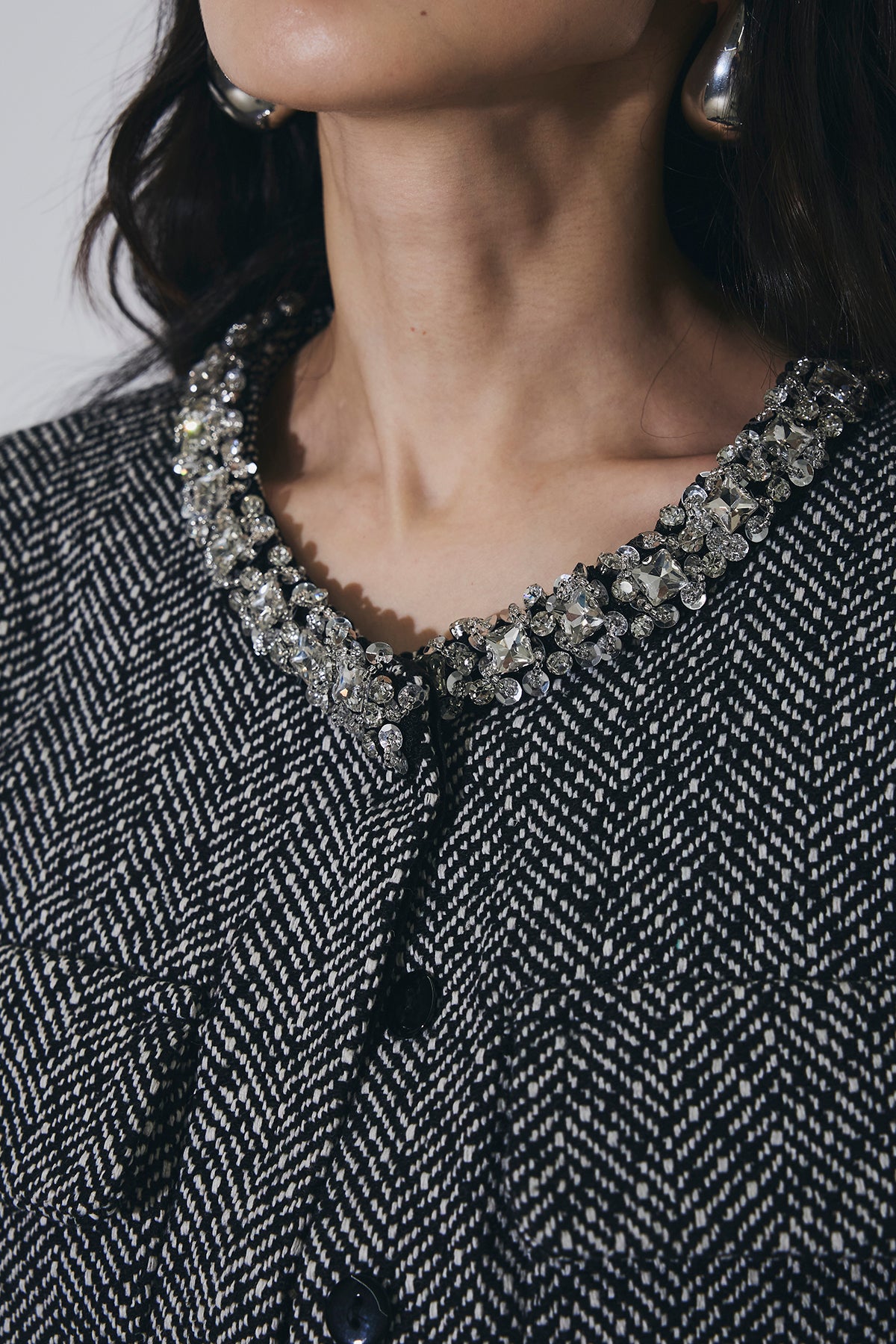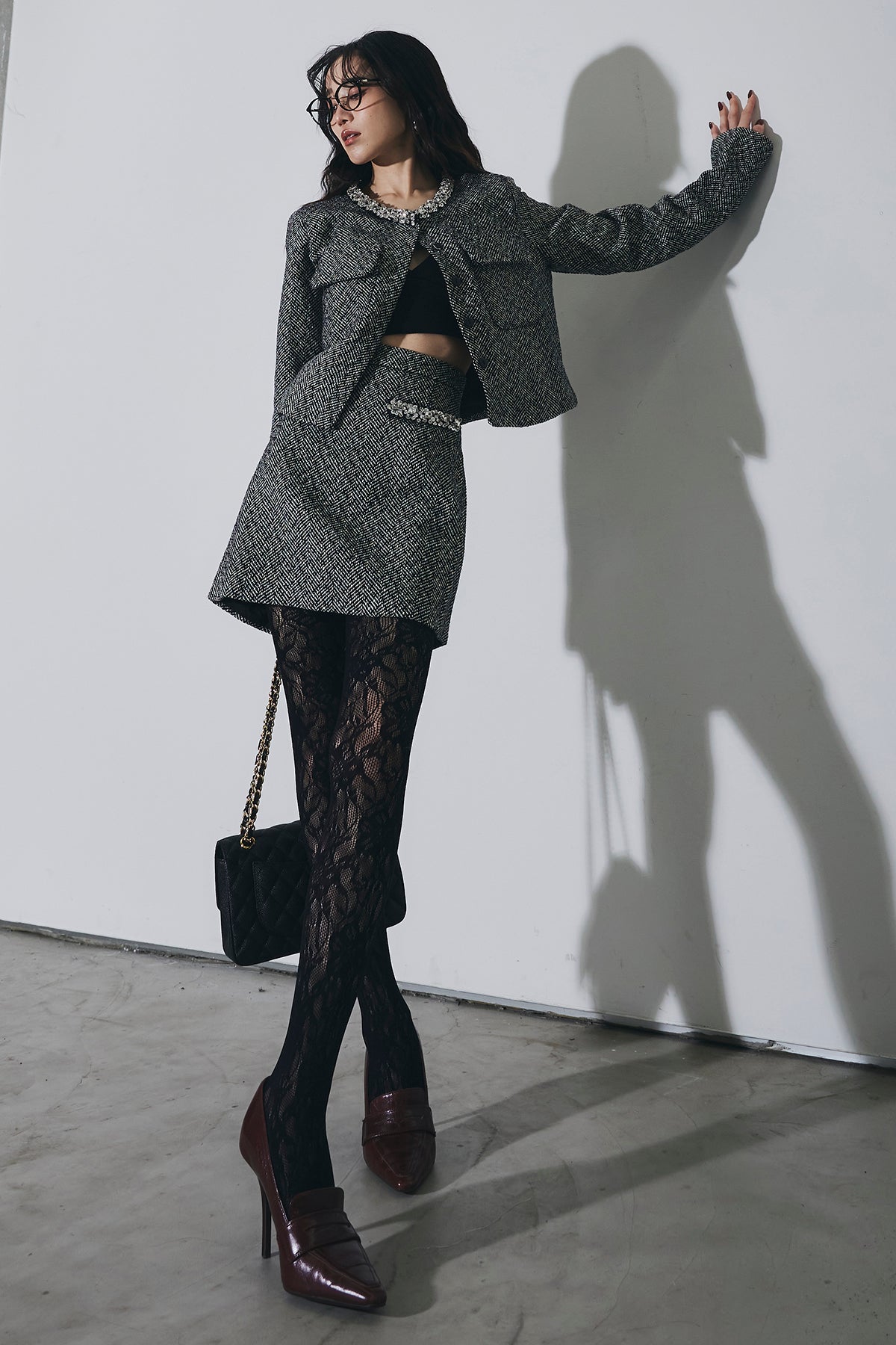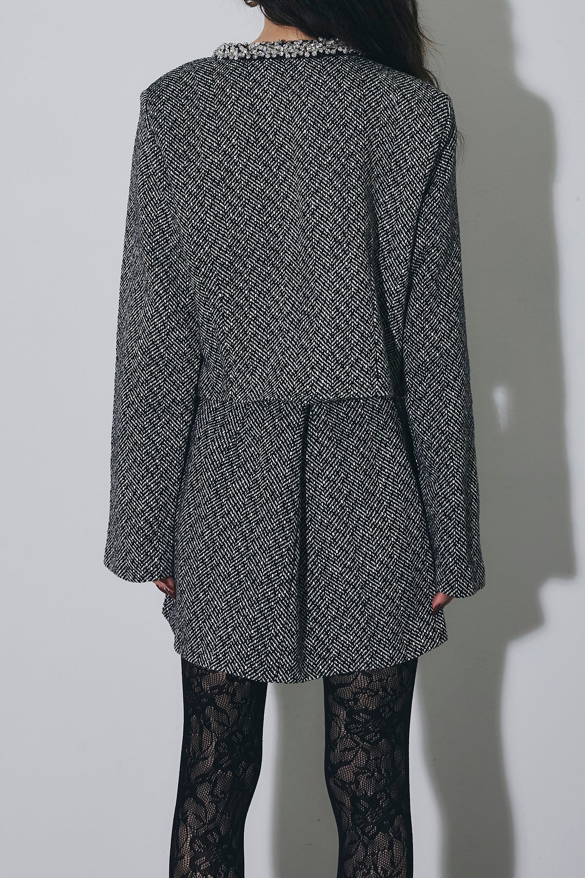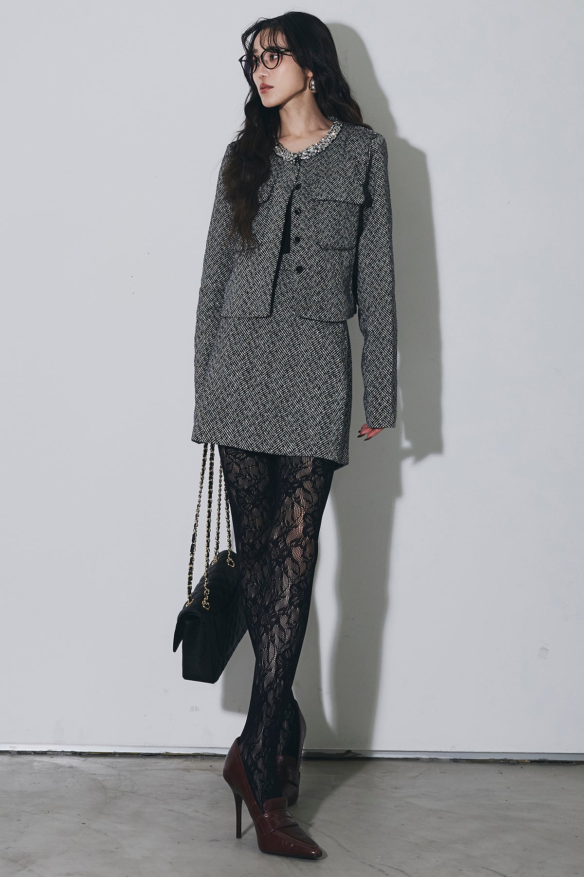 ご注文前に必ずページ下部「お届け期間」をご確認くださいませ。クラシカルなツイード素材を使用したセットアップ。コンパクトなジャケットはフロントボタンとポケットデザインで程よいきちんと感を演出し、すっきりとしたミニ丈ボトムがバランスの取れたシルエットを叶えます。単品使いもしやすく、デイリーからお出かけまで幅広く活躍するアイテムです。