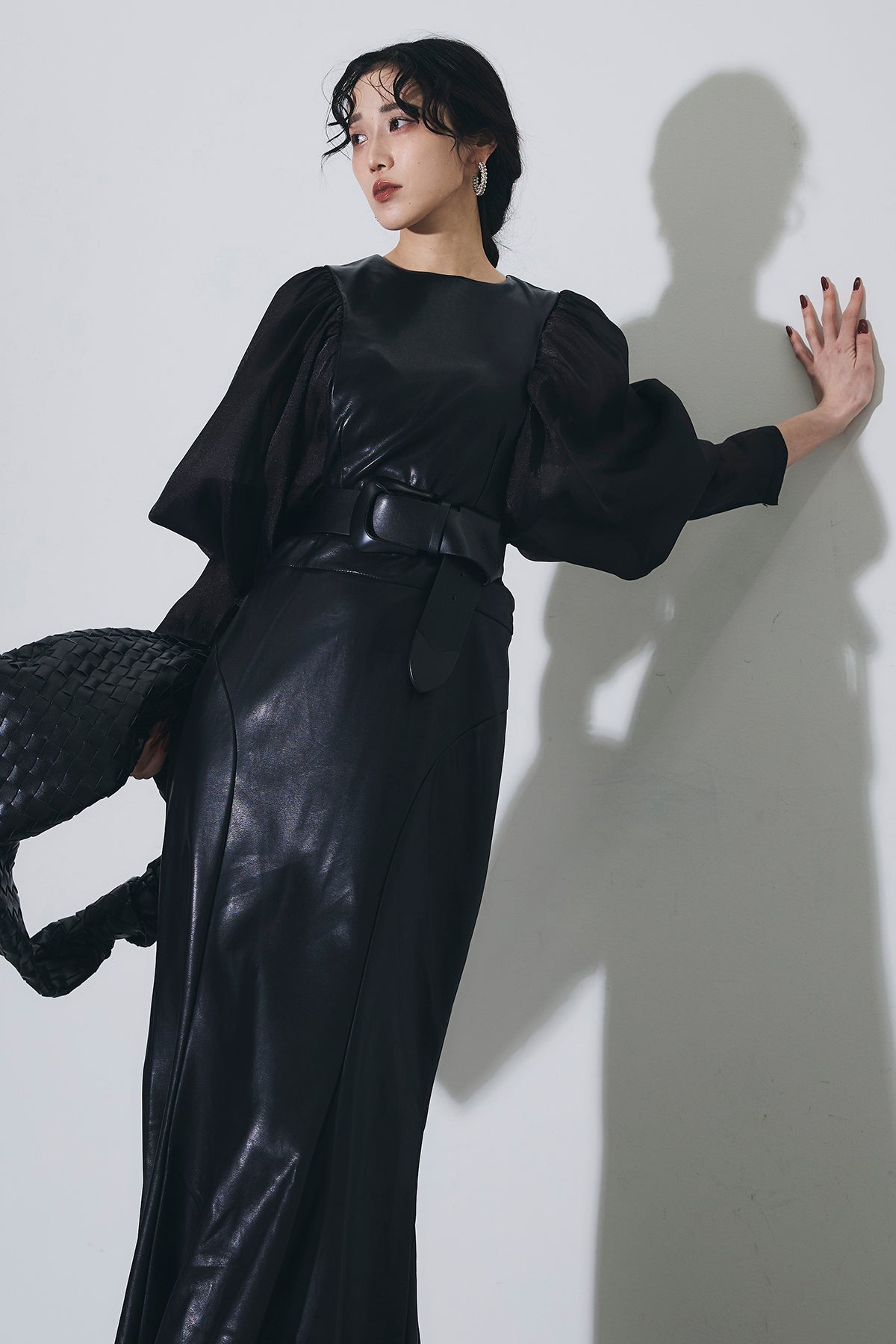 上品な艶感が印象的なロングワンピース。なめらかな素材が身体のラインに沿い、裾にかけて優雅に広がるマーメイドシルエットが女性らしさを引き立てます。程よくボリュームを持たせたスリーブとのコントラストで、メリハリのあるバランスに。共布ベルトでウエストマークすることでスタイルアップ効果も期待でき、1枚で存在感のある着こなしが完成するアイテムです。