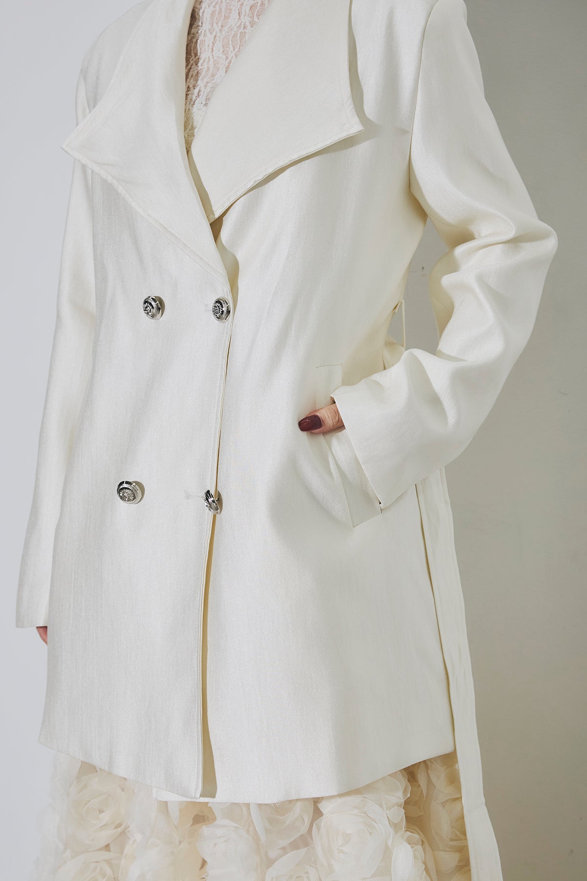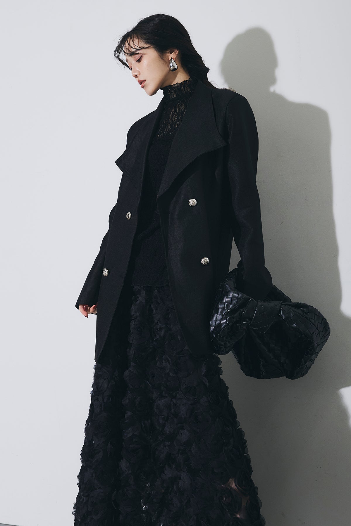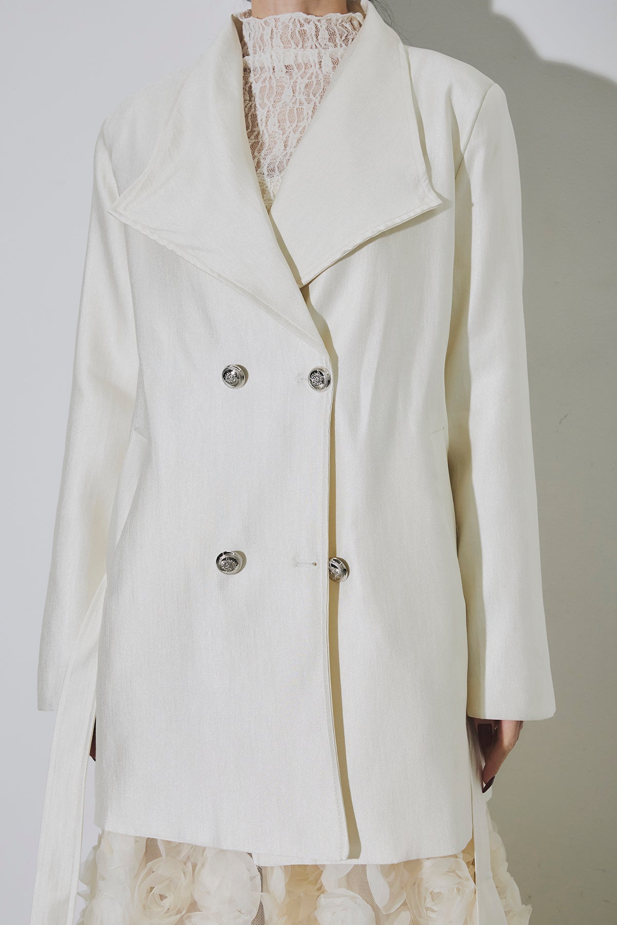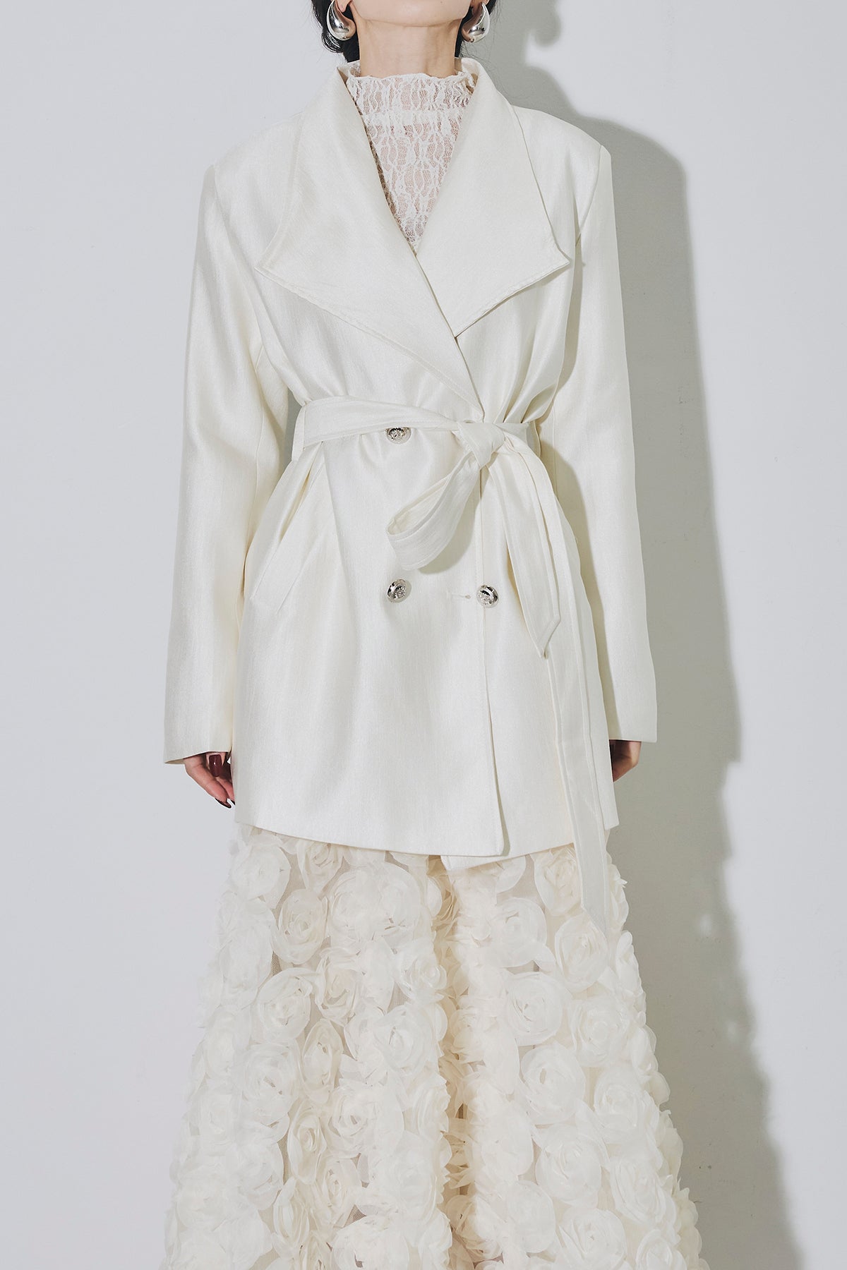 上品な印象を与えるダブルデザインのジャケット。大きめのラペルが顔まわりを華やかに見せ、ウエストリボンでシルエットの調整が可能です。程よくハリのある素材感がきちんと感を演出しつつ、女性らしいラインを引き立てます。ワンピースやスカートと合わせたエレガントなスタイルはもちろん、パンツ合わせでマニッシュにも着こなせる一着です。