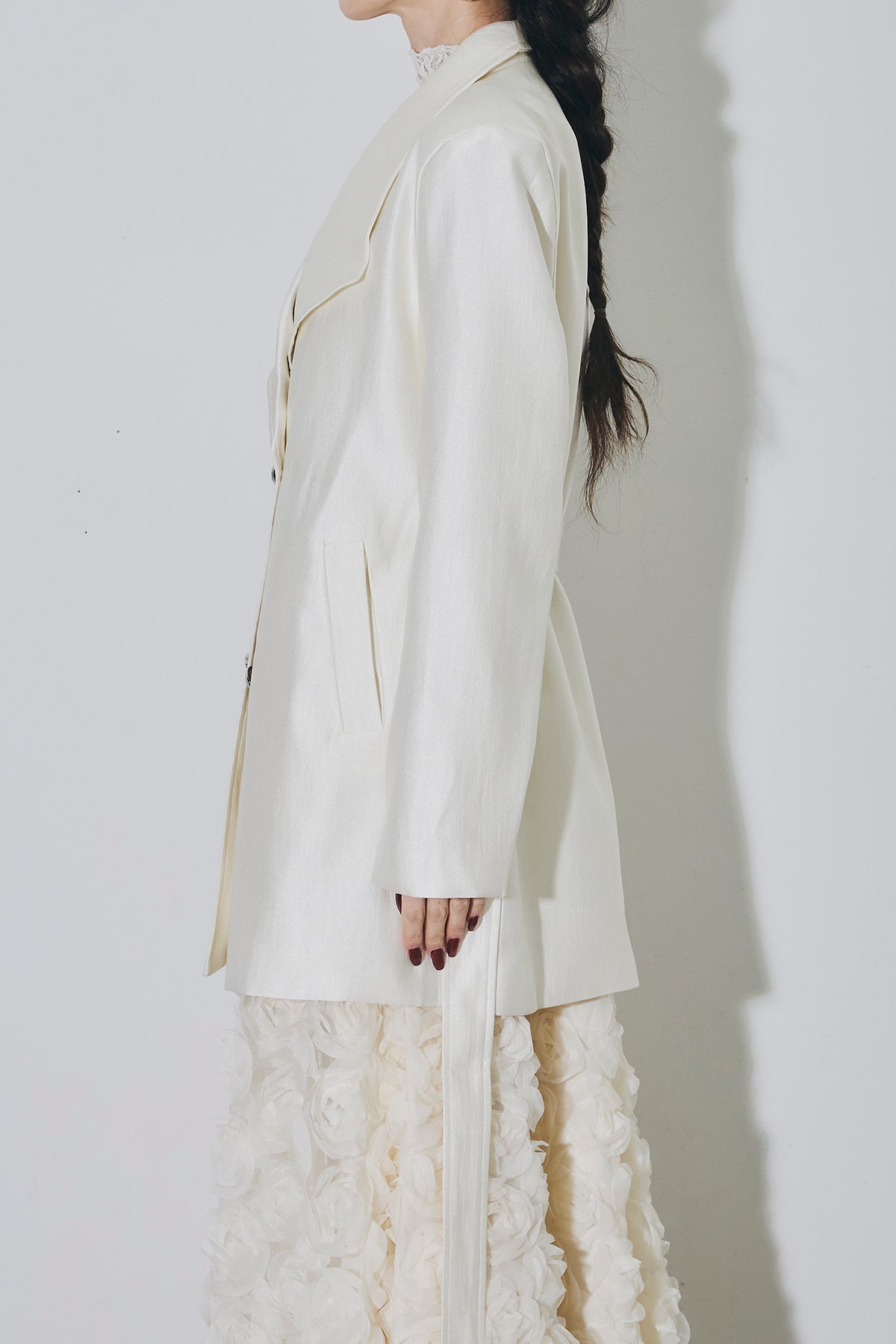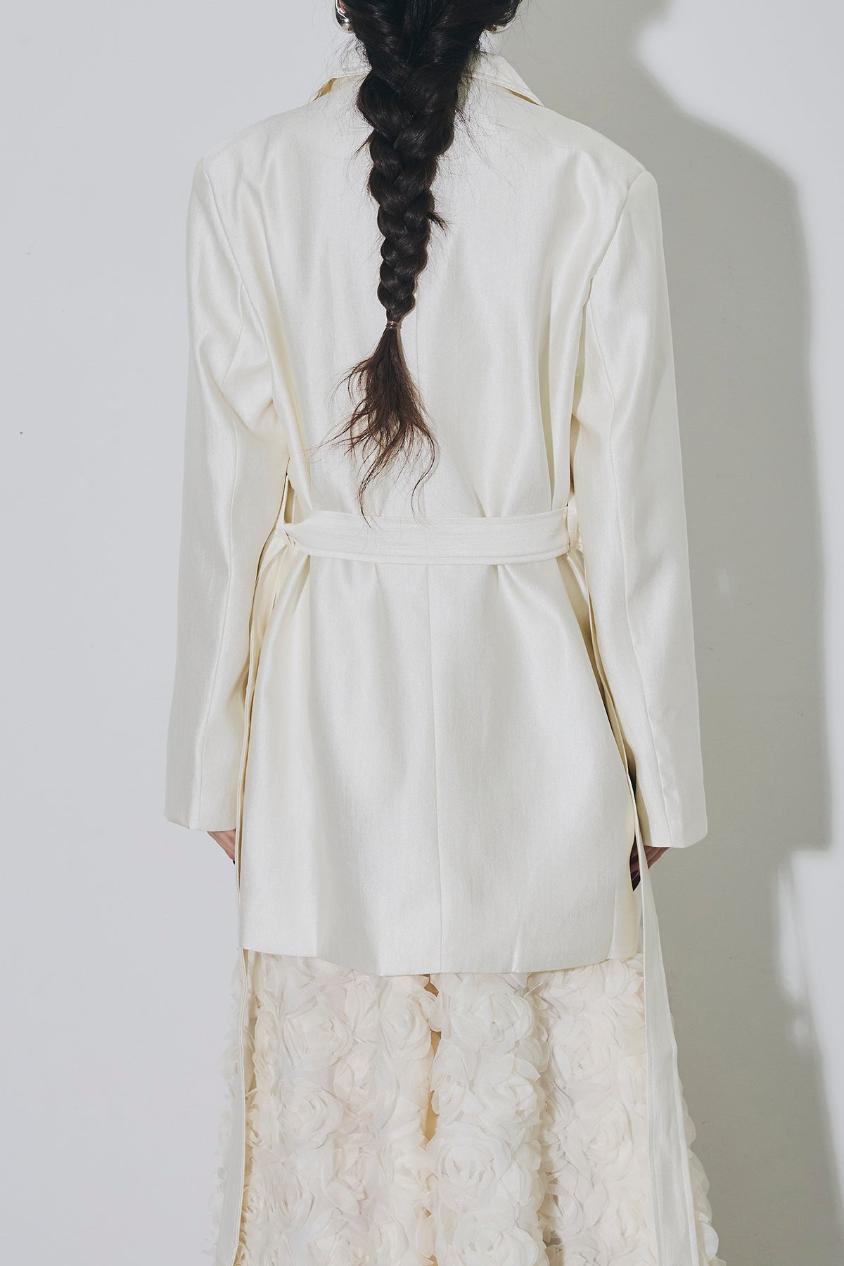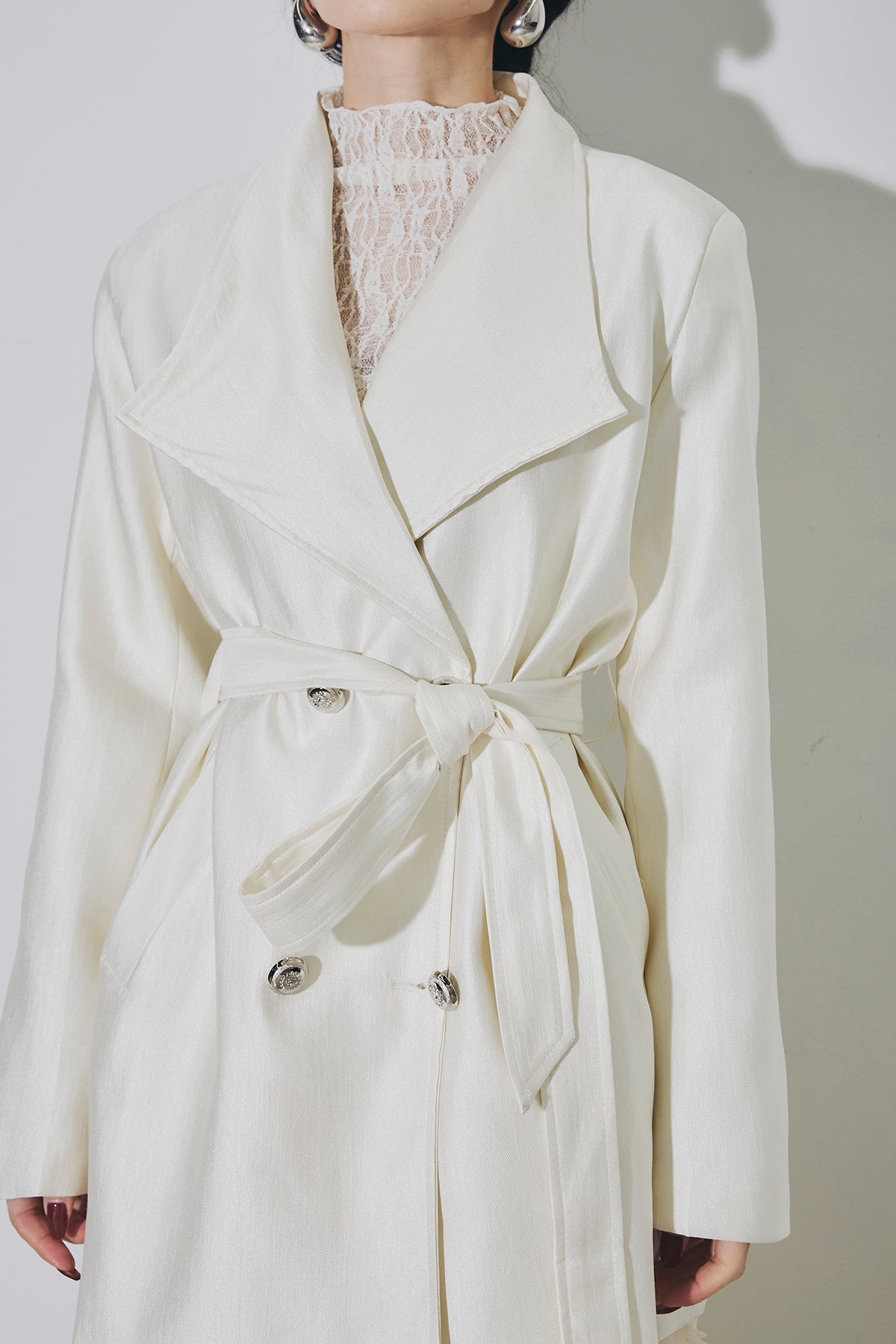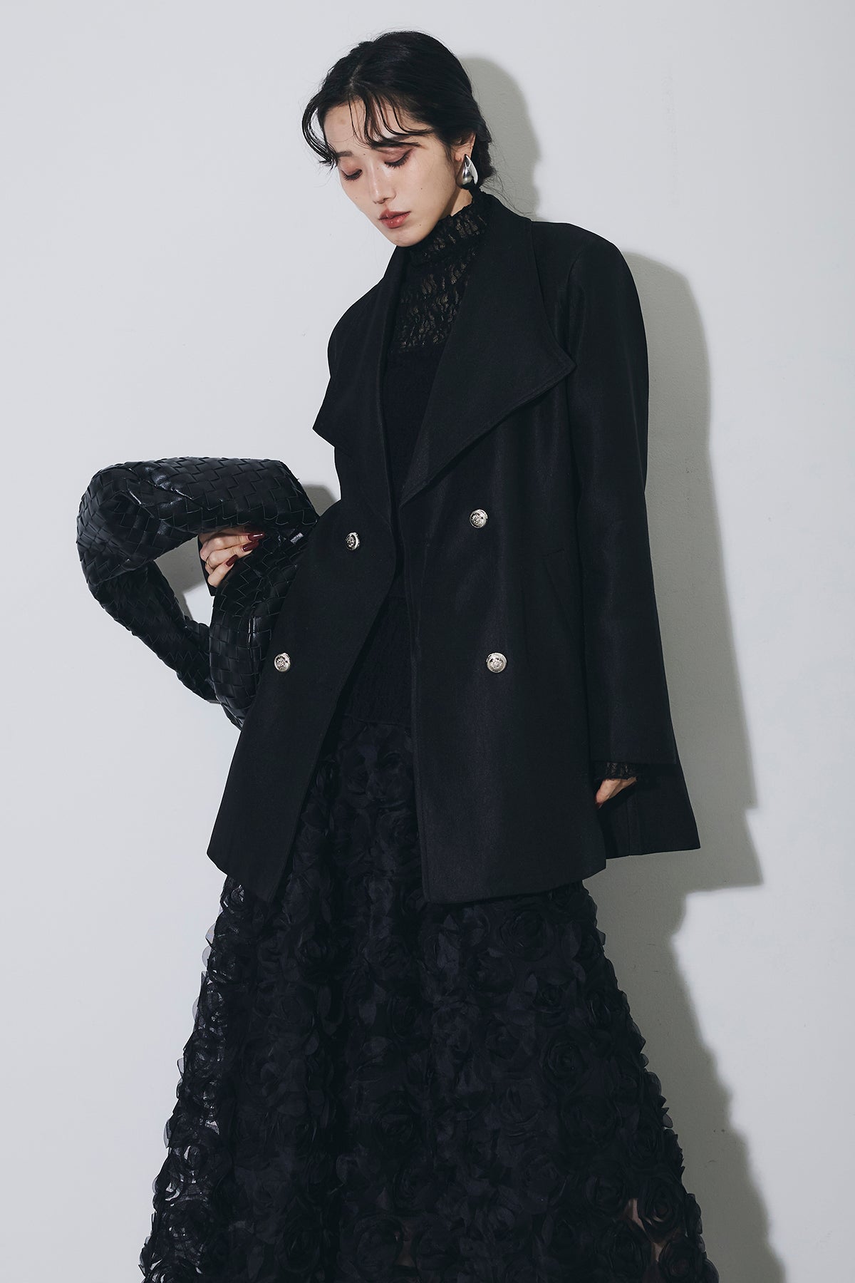 上品な印象を与えるダブルデザインのジャケット。大きめのラペルが顔まわりを華やかに見せ、ウエストリボンでシルエットの調整が可能です。程よくハリのある素材感がきちんと感を演出しつつ、女性らしいラインを引き立てます。ワンピースやスカートと合わせたエレガントなスタイルはもちろん、パンツ合わせでマニッシュにも着こなせる一着です。