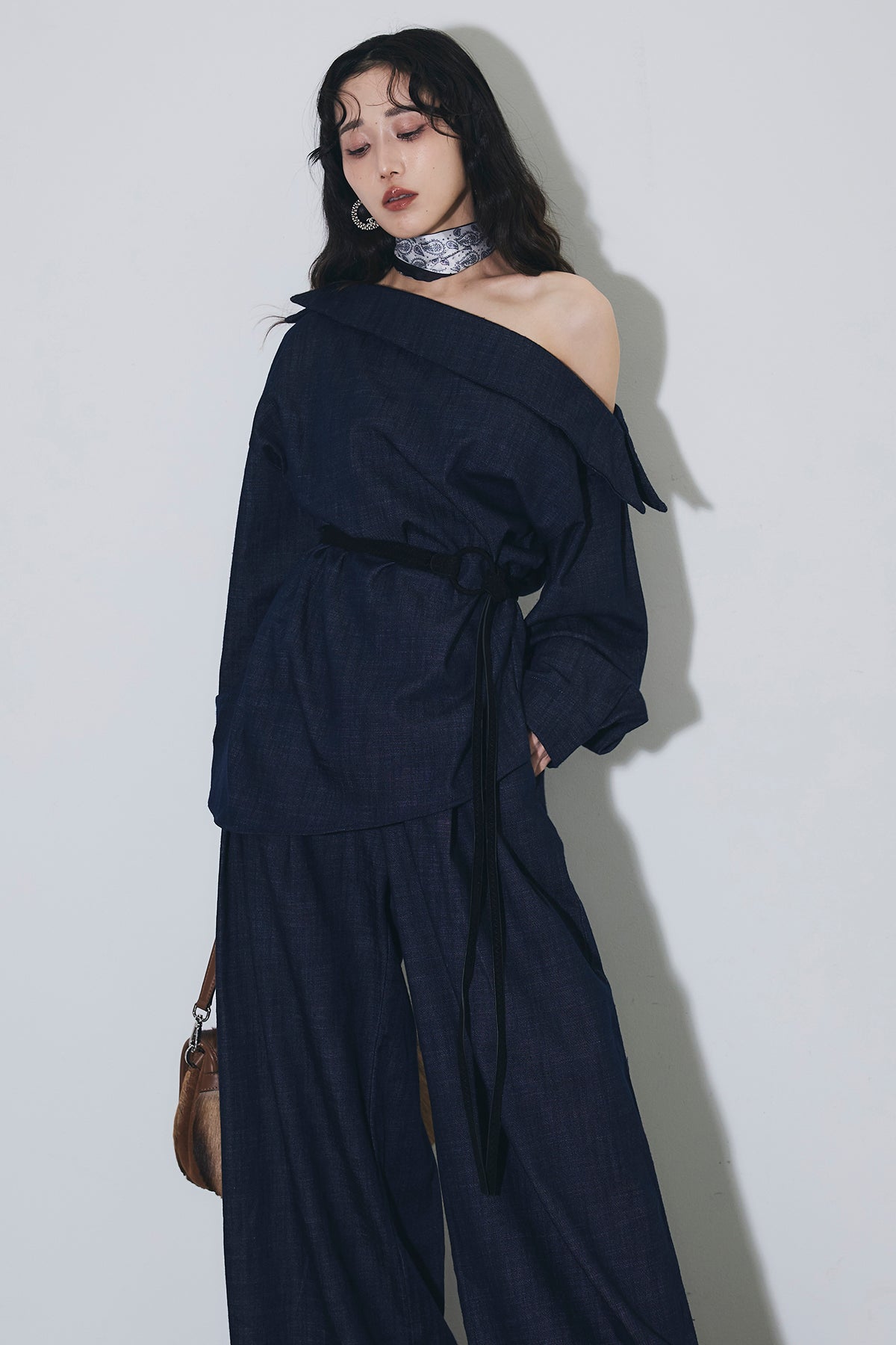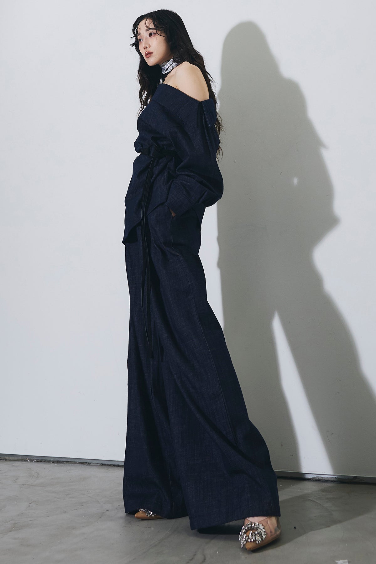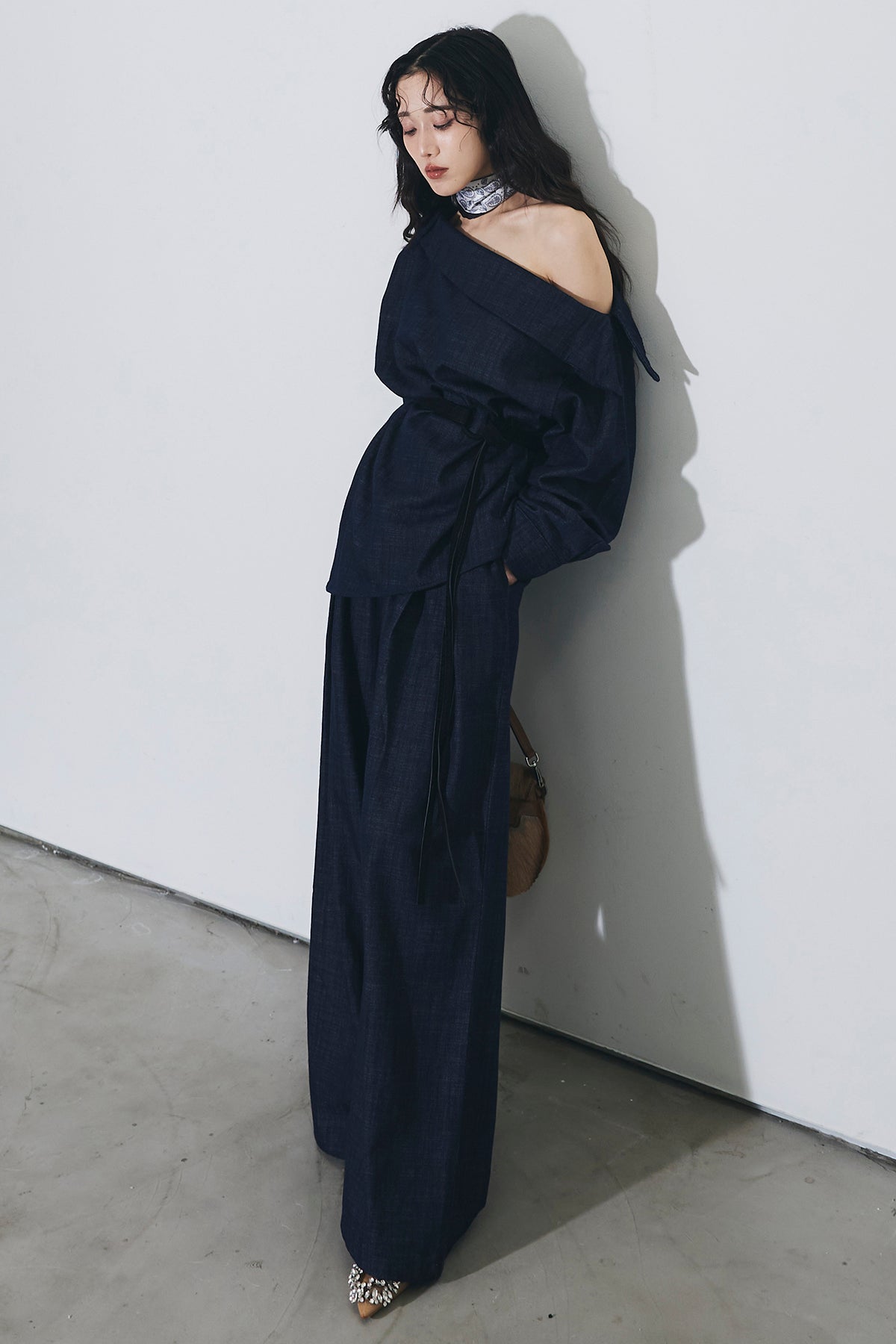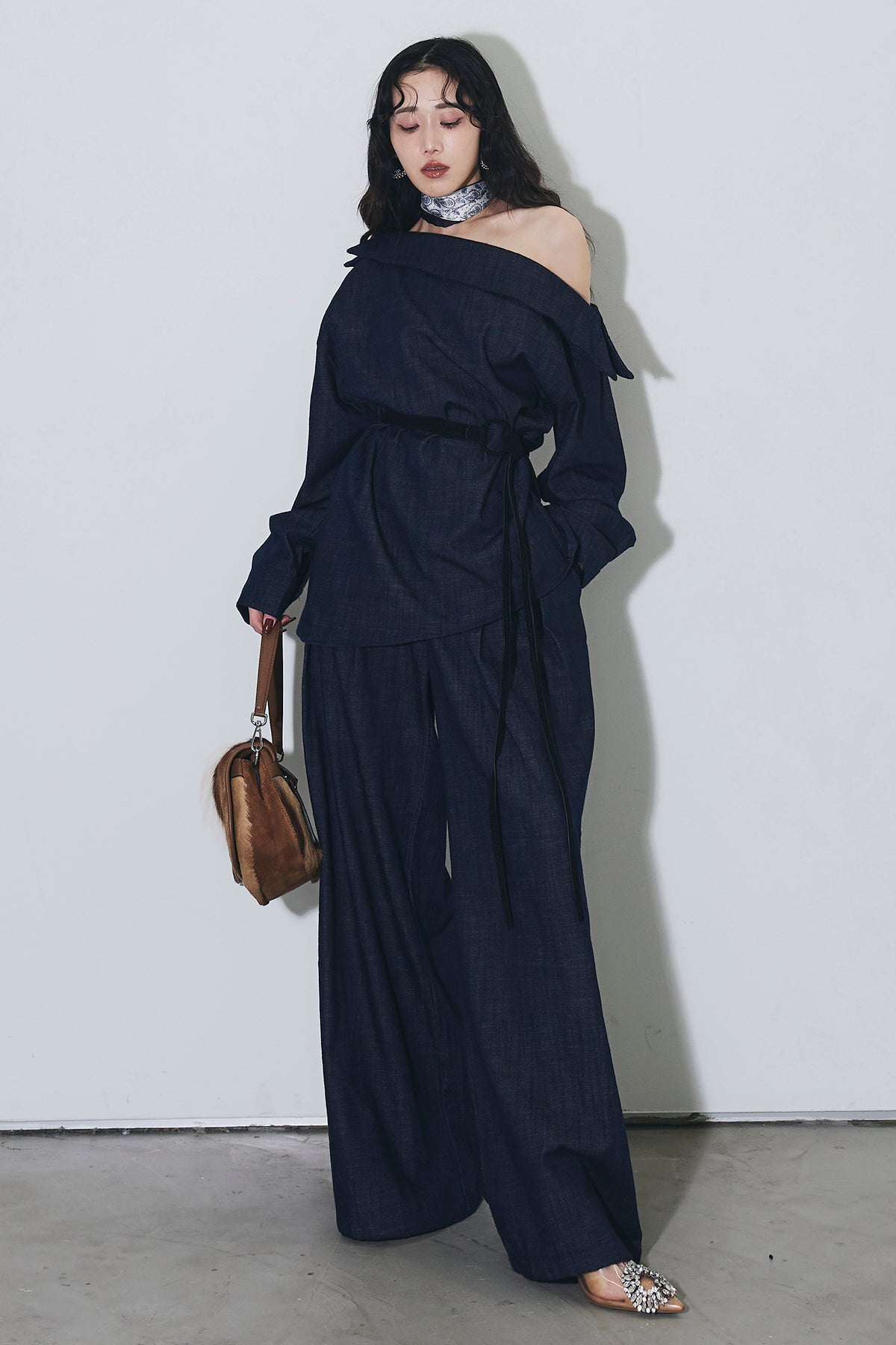 ご注文前に必ずページ下部「お届け期間」をご確認くださいませ。落ち感のあるデニム素材を使用したセットアップ。オフショルのデザインが程よい抜け感を演出し、さりげない肌見せで女性らしさをプラスします。ウエストベルト付きのトップスはシルエットにメリハリを与え、ワイドシルエットのパンツが縦のラインを強調。リラックス感がありながらも、洗練された大人のスタイルが完成する一着です。