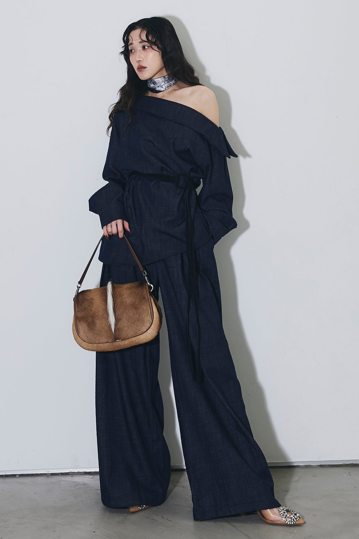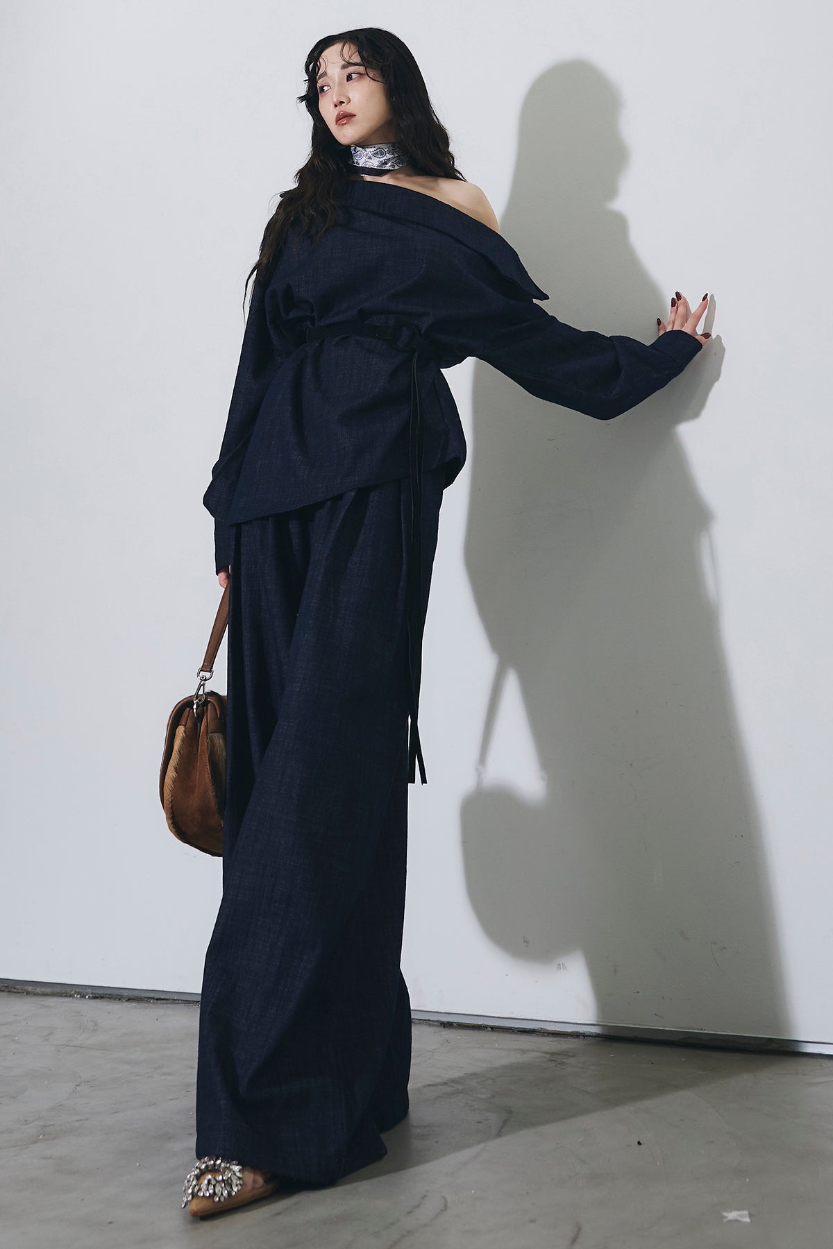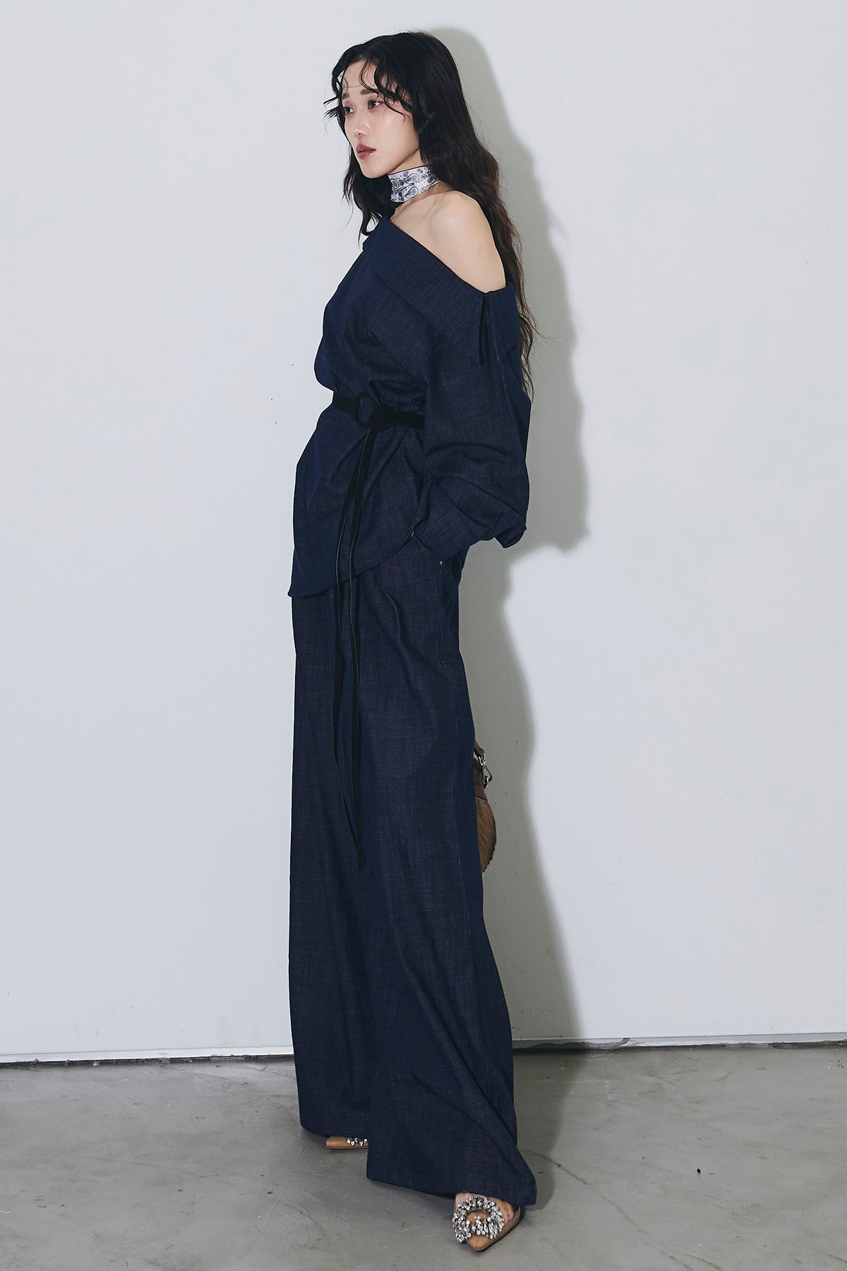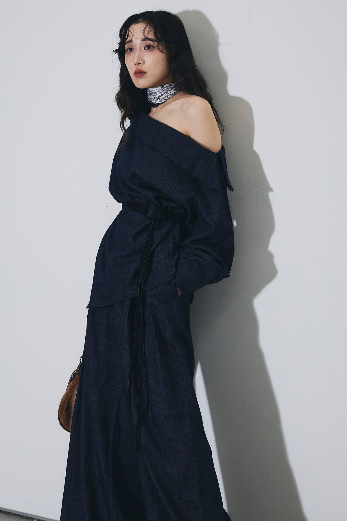 ご注文前に必ずページ下部「お届け期間」をご確認くださいませ。落ち感のあるデニム素材を使用したセットアップ。オフショルのデザインが程よい抜け感を演出し、さりげない肌見せで女性らしさをプラスします。ウエストベルト付きのトップスはシルエットにメリハリを与え、ワイドシルエットのパンツが縦のラインを強調。リラックス感がありながらも、洗練された大人のスタイルが完成する一着です。