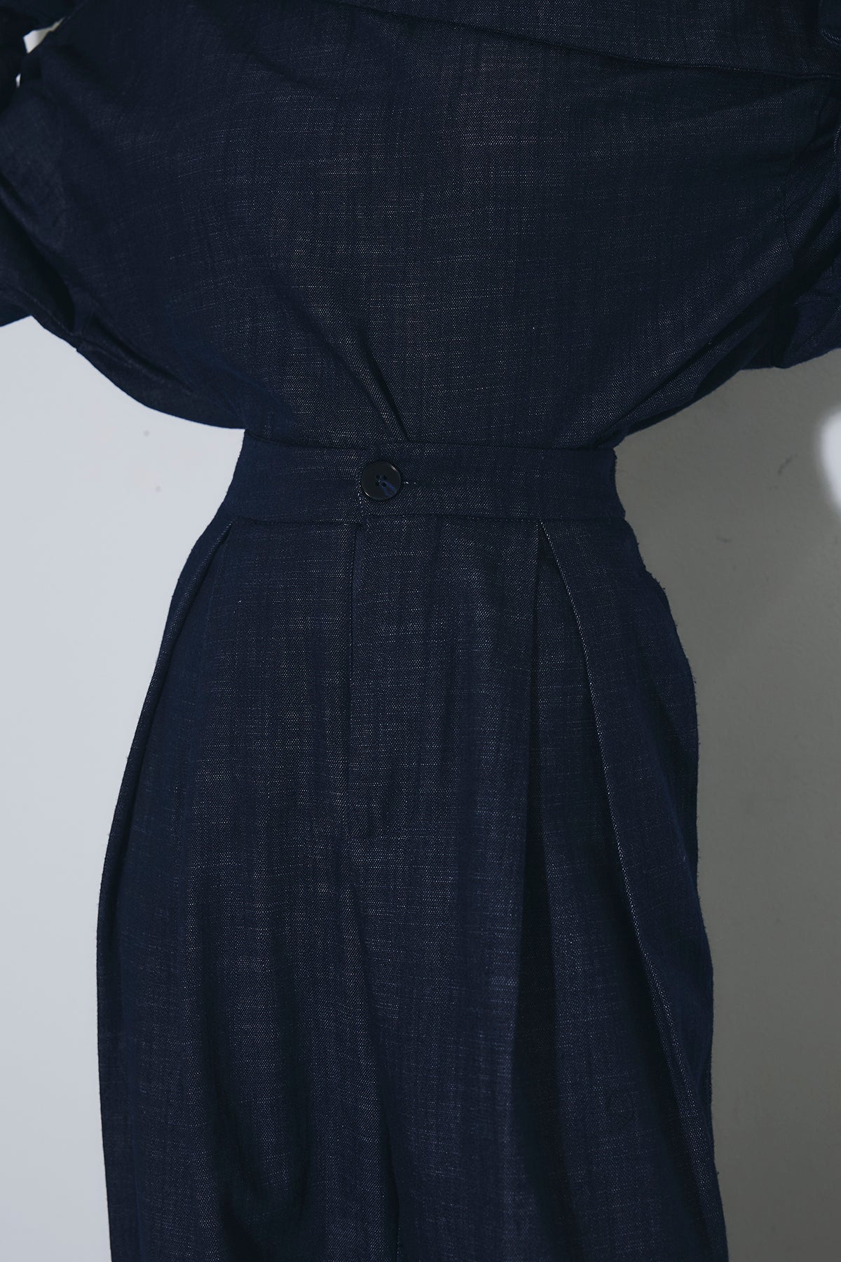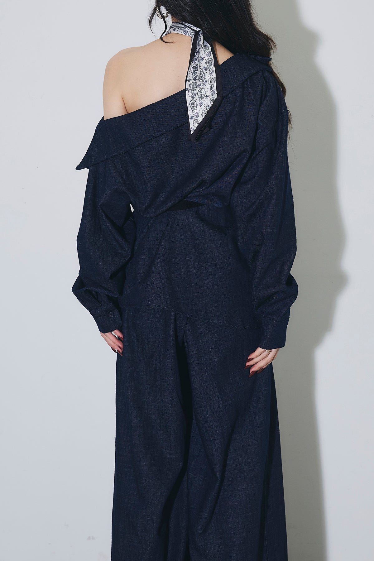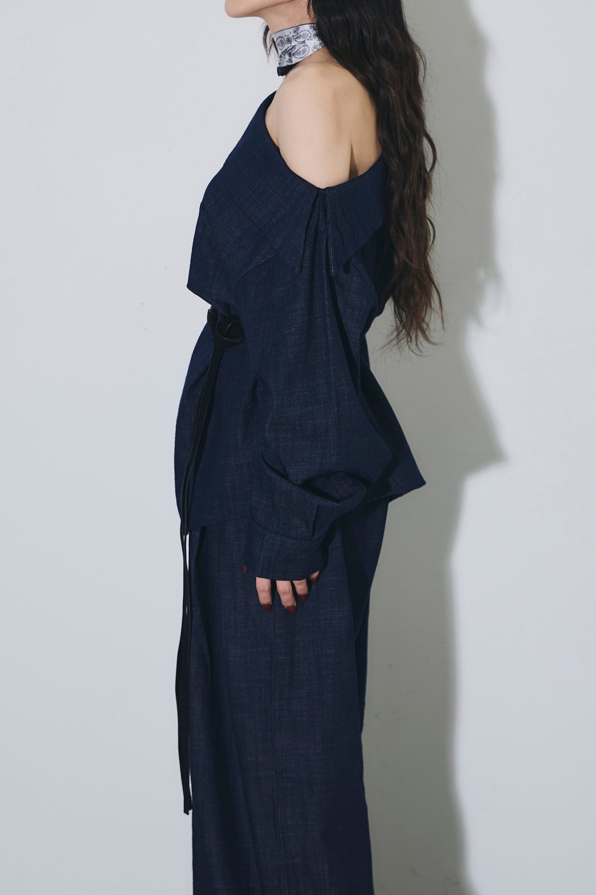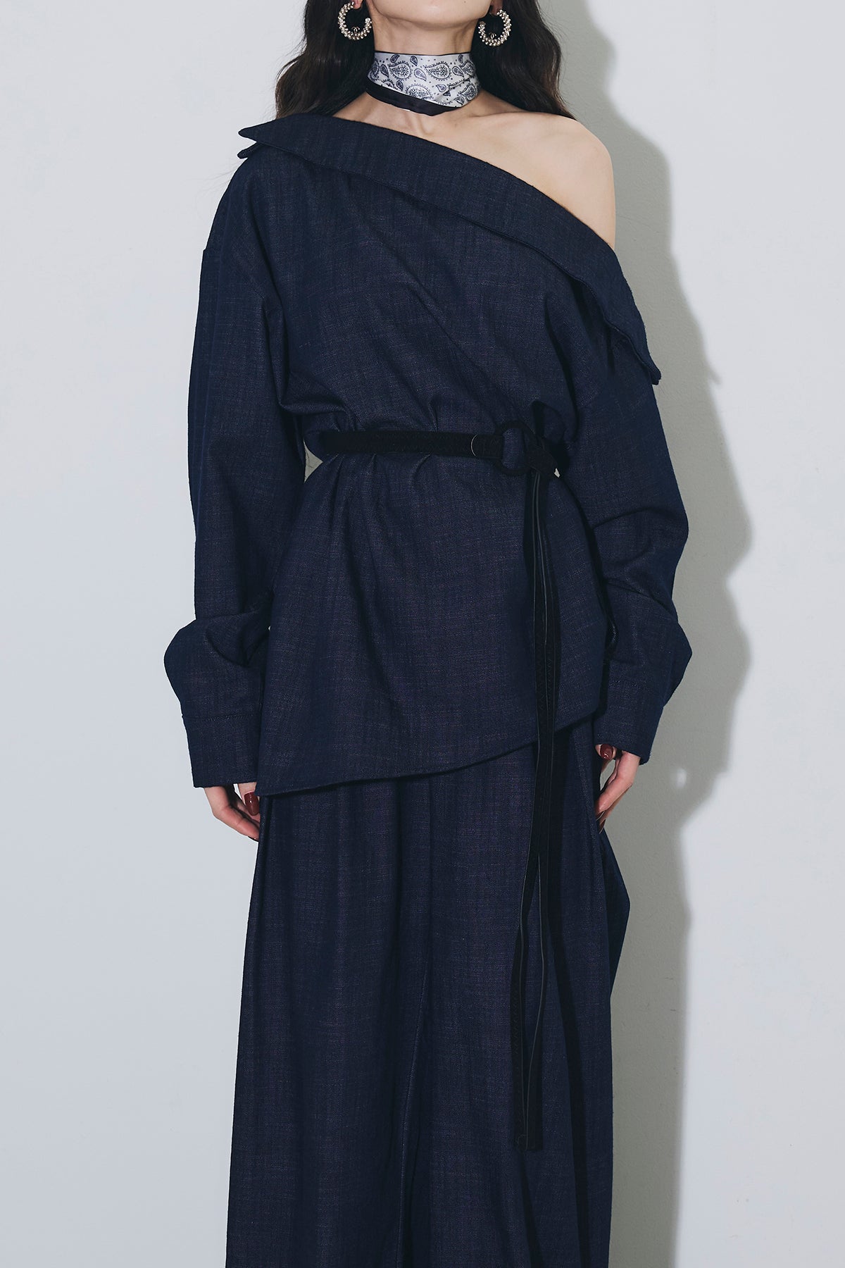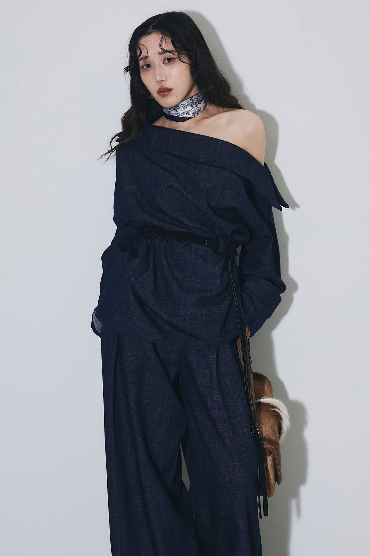 ご注文前に必ずページ下部「お届け期間」をご確認くださいませ。落ち感のあるデニム素材を使用したセットアップ。オフショルのデザインが程よい抜け感を演出し、さりげない肌見せで女性らしさをプラスします。ウエストベルト付きのトップスはシルエットにメリハリを与え、ワイドシルエットのパンツが縦のラインを強調。リラックス感がありながらも、洗練された大人のスタイルが完成する一着です。