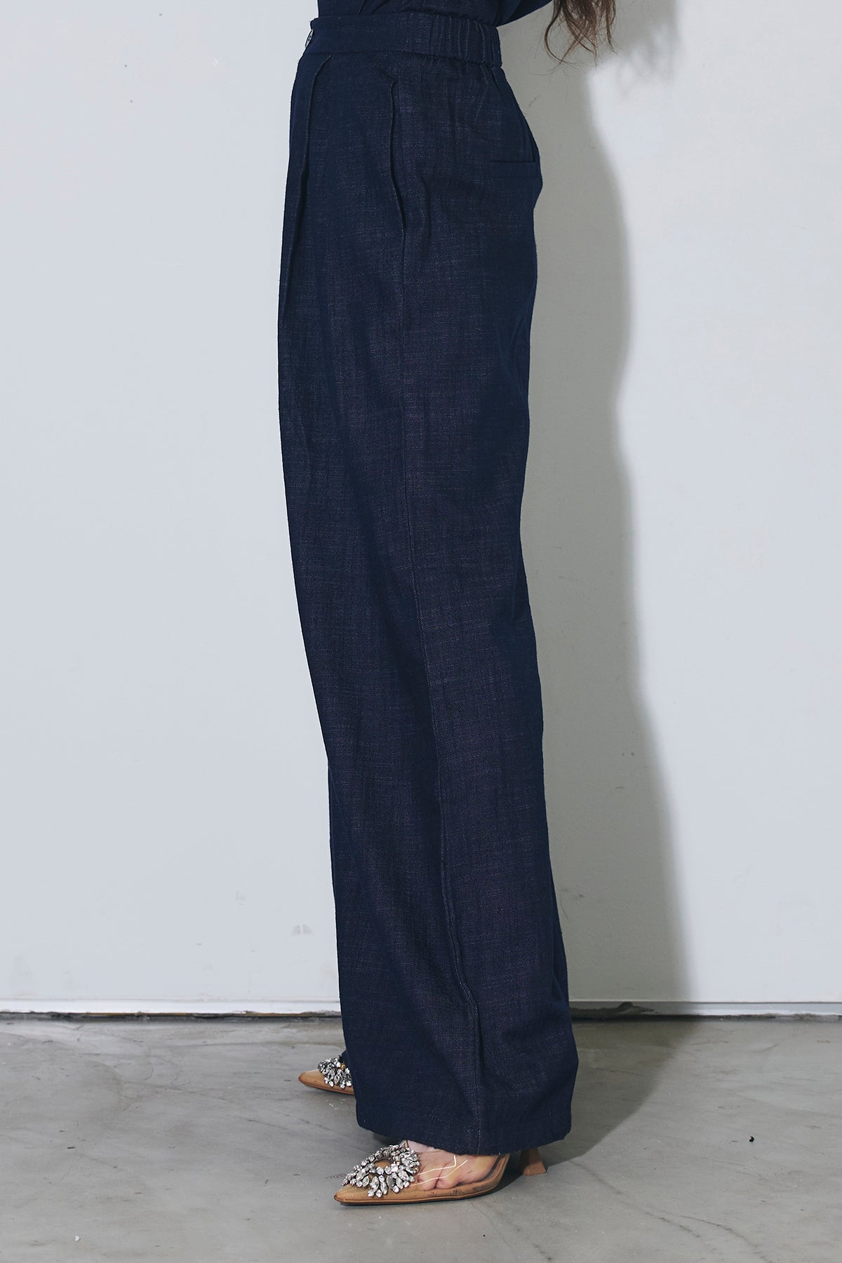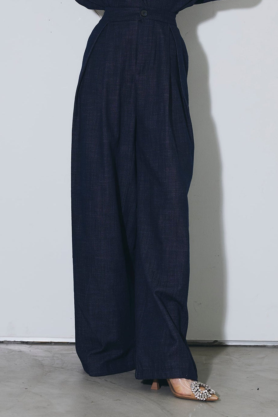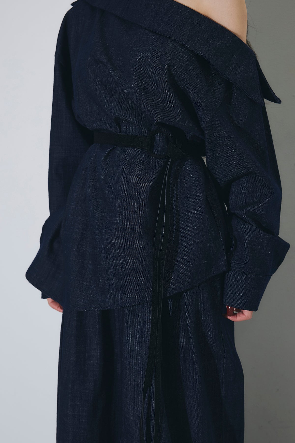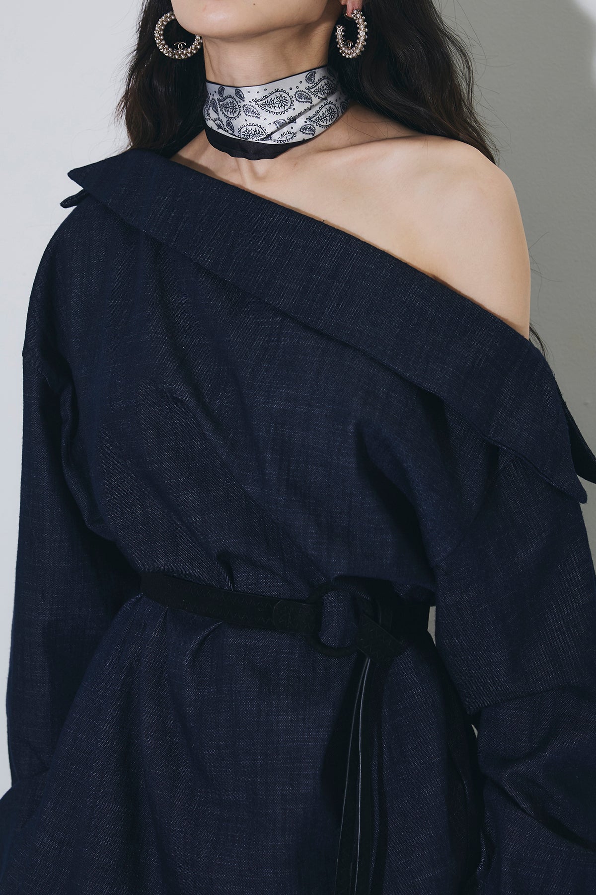 ご注文前に必ずページ下部「お届け期間」をご確認くださいませ。落ち感のあるデニム素材を使用したセットアップ。オフショルのデザインが程よい抜け感を演出し、さりげない肌見せで女性らしさをプラスします。ウエストベルト付きのトップスはシルエットにメリハリを与え、ワイドシルエットのパンツが縦のラインを強調。リラックス感がありながらも、洗練された大人のスタイルが完成する一着です。