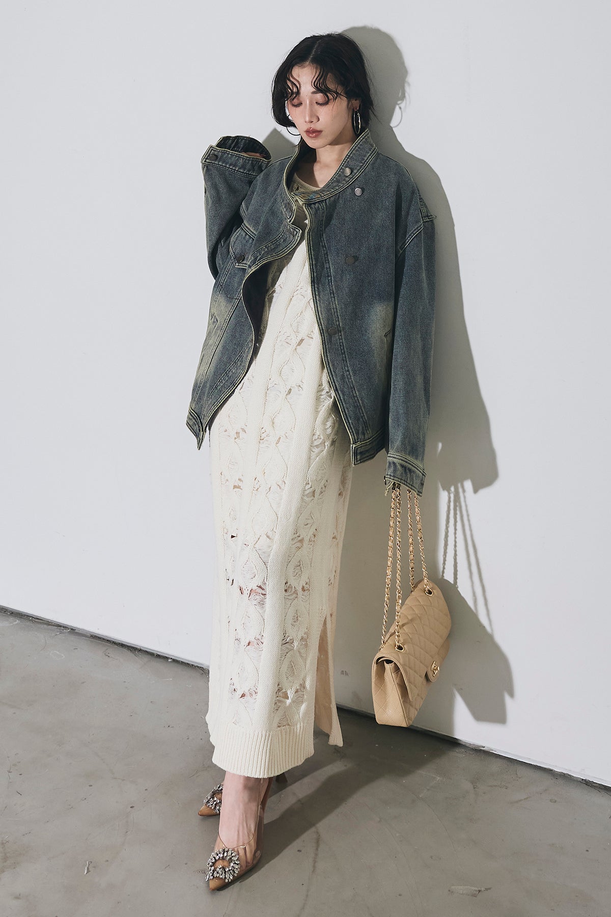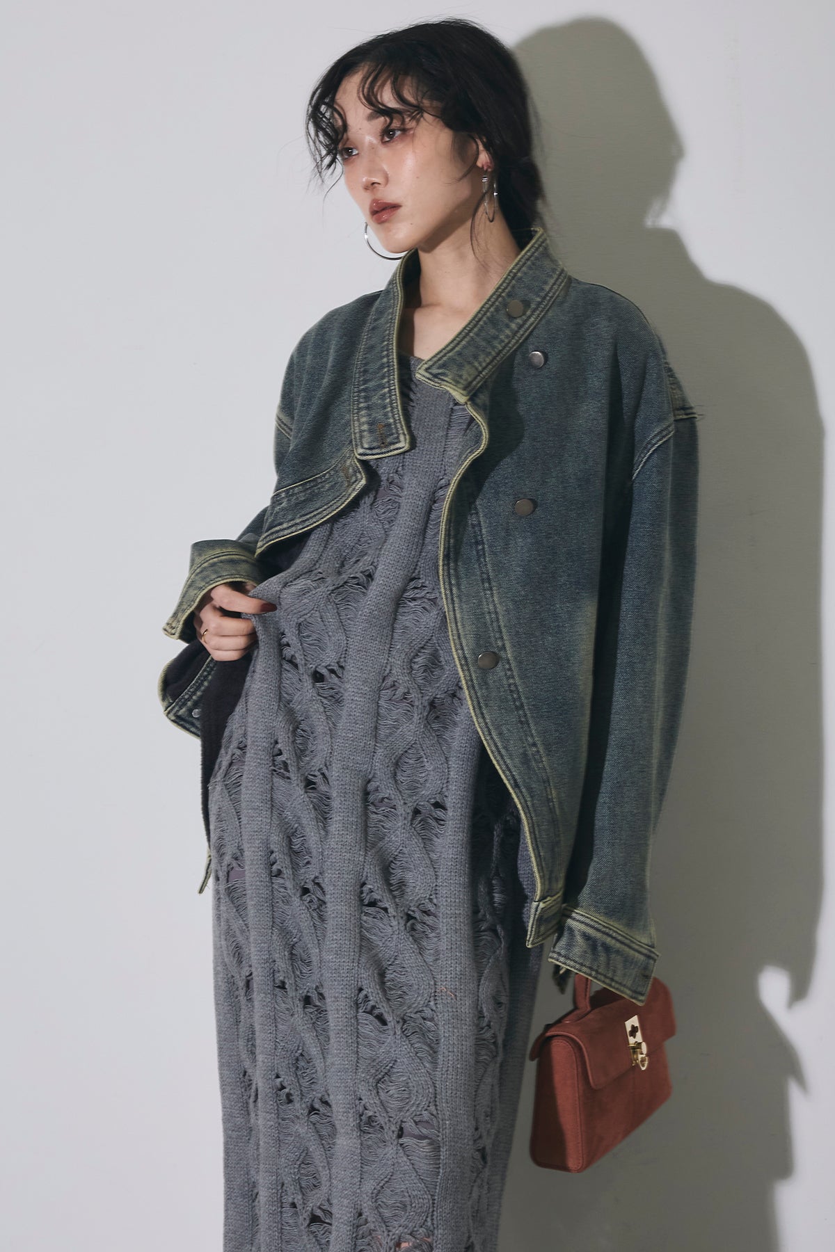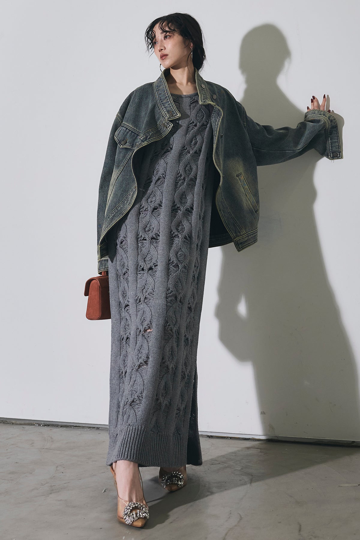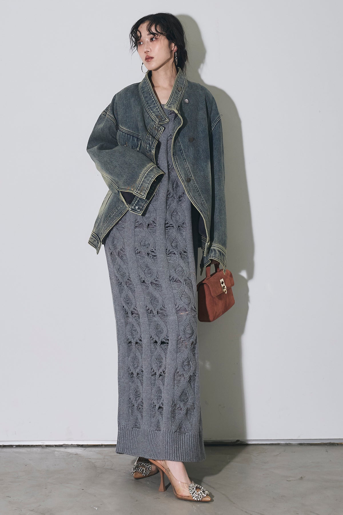 【SET】スタンドカラーデニムジャケット+ケーブルニットワンピース