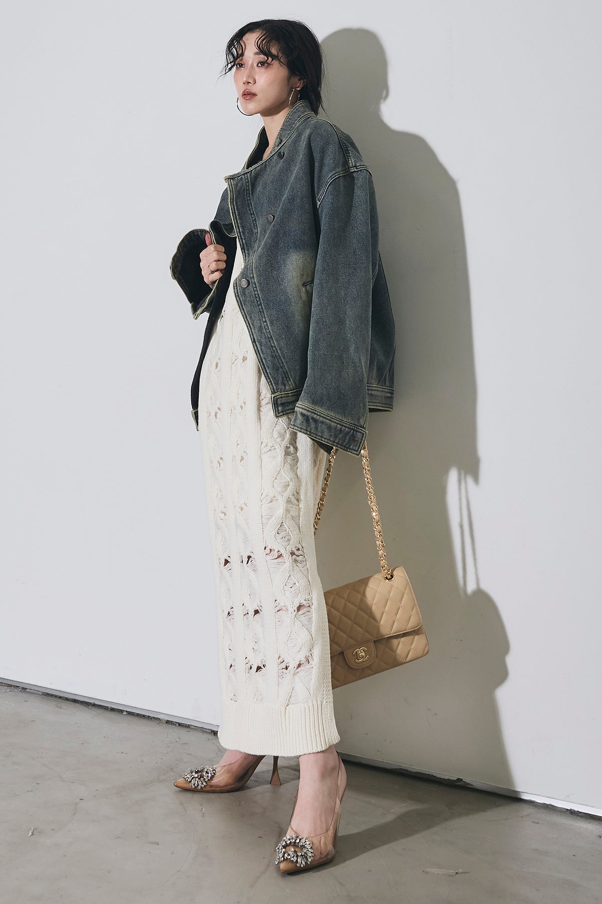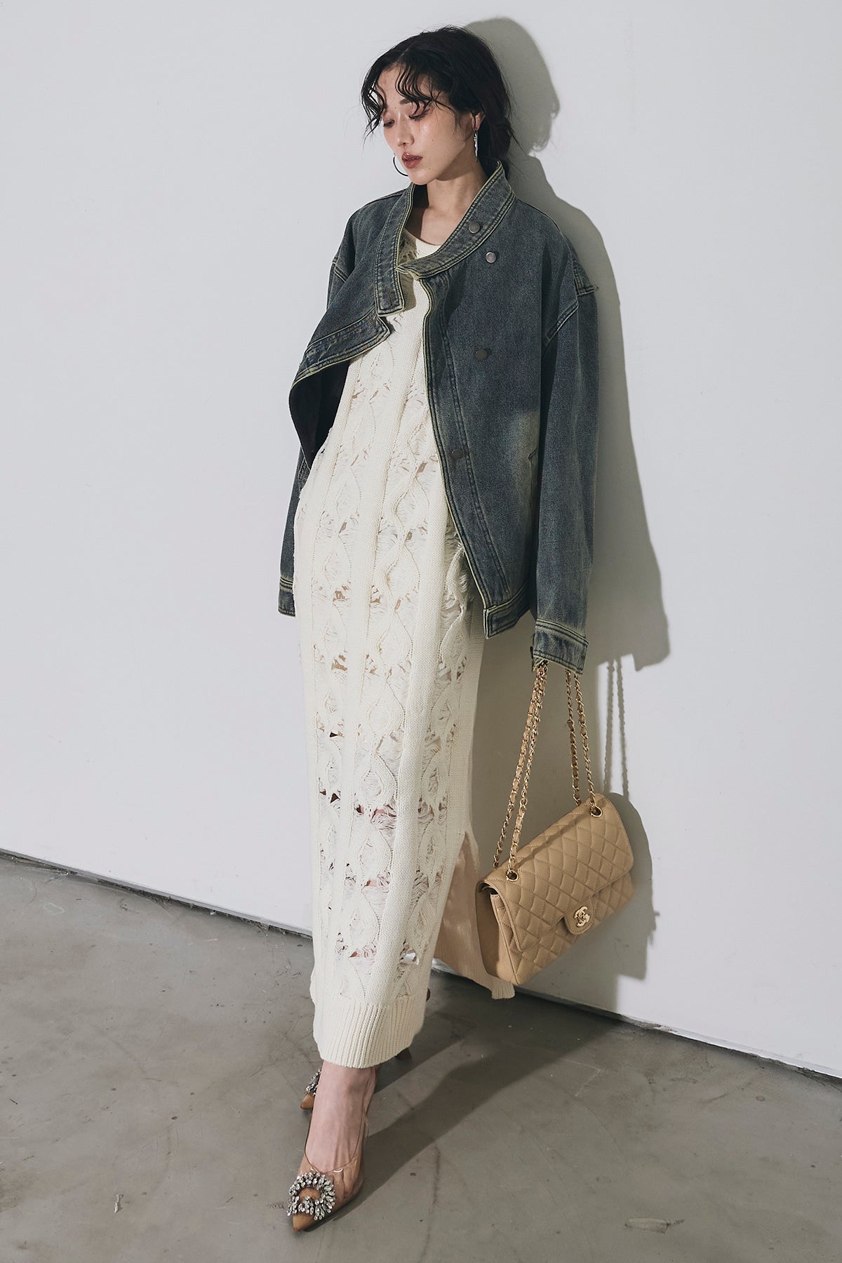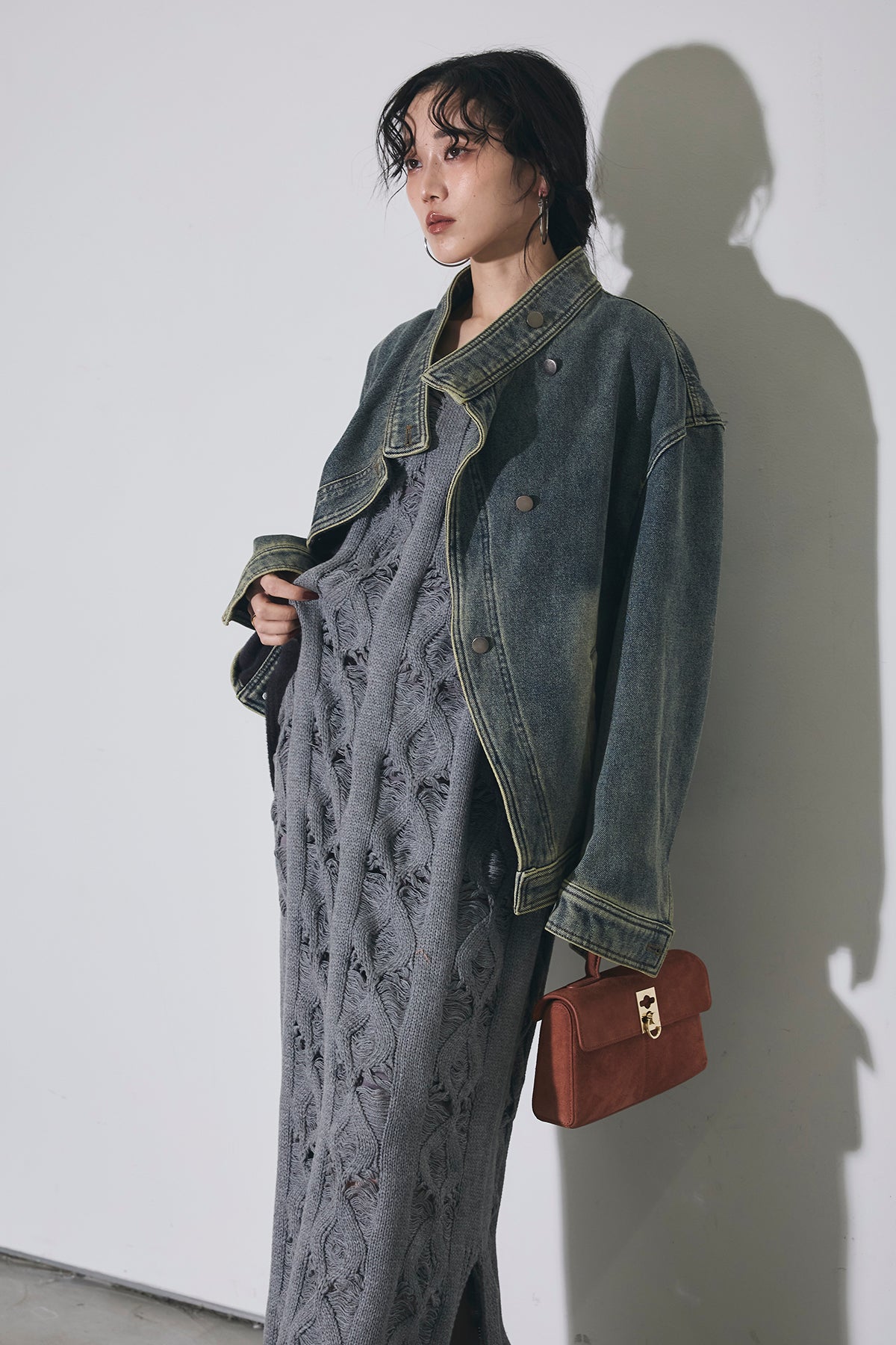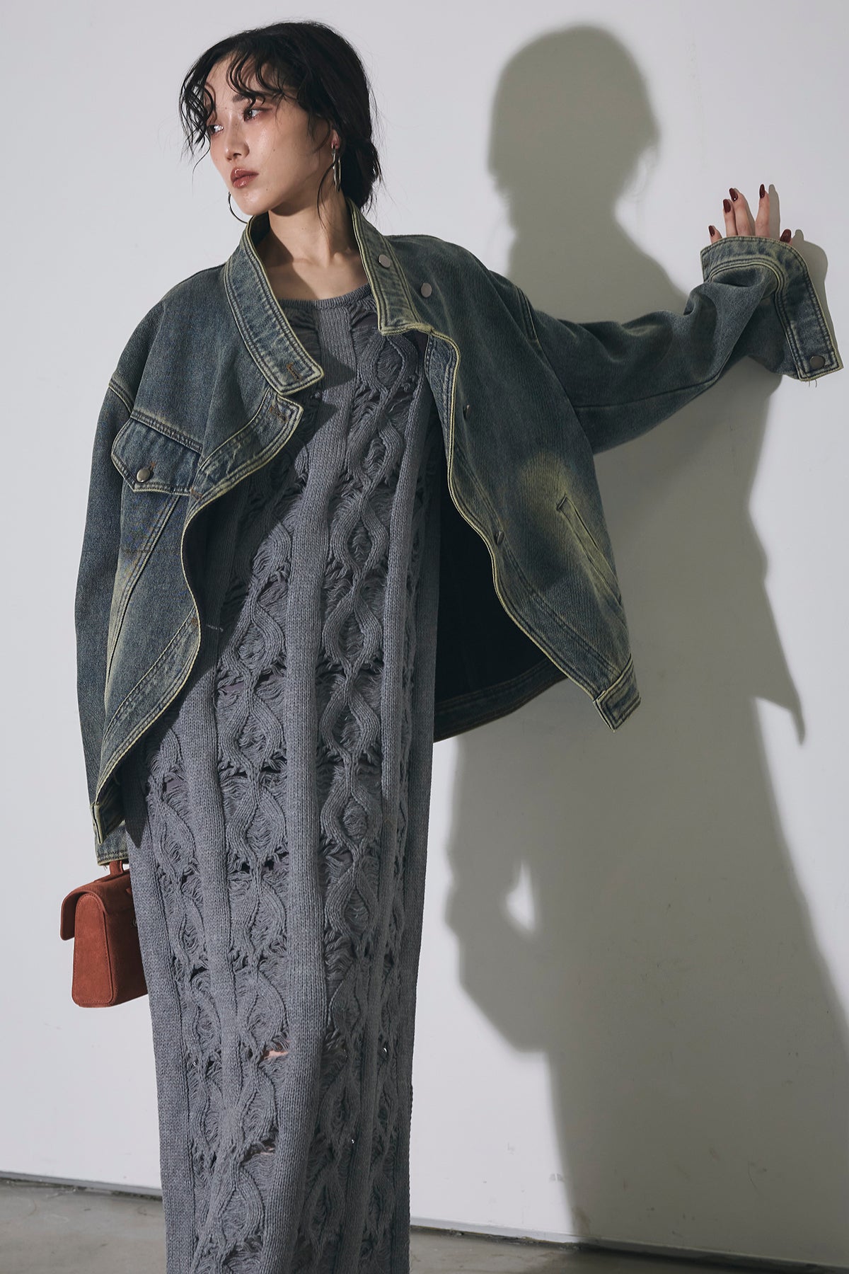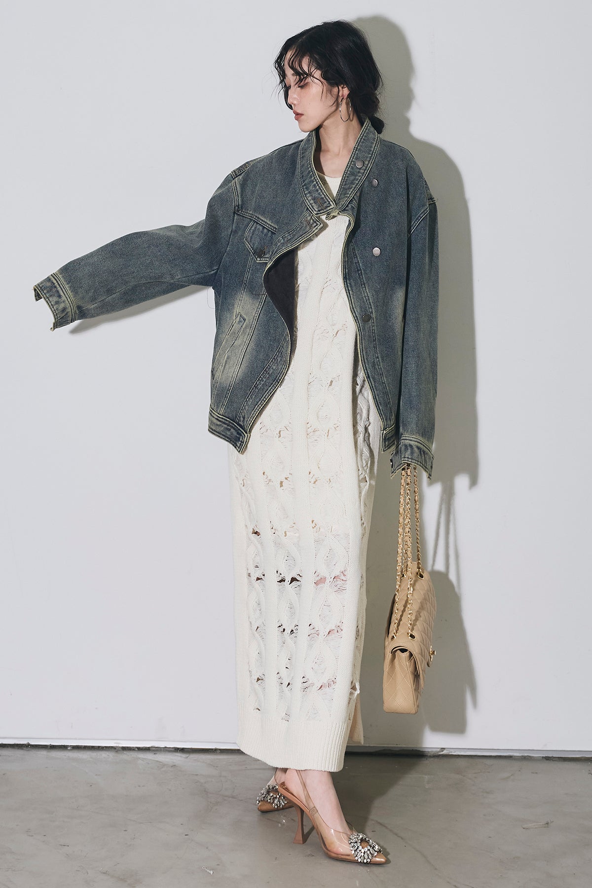 【SET】スタンドカラーデニムジャケット+ケーブルニットワンピース