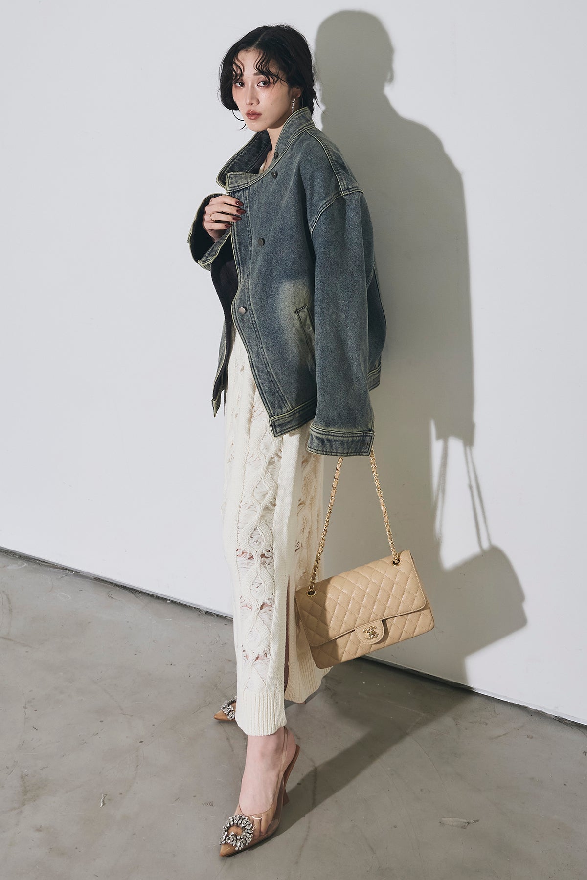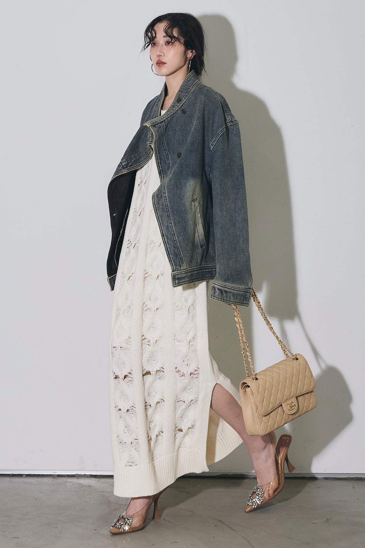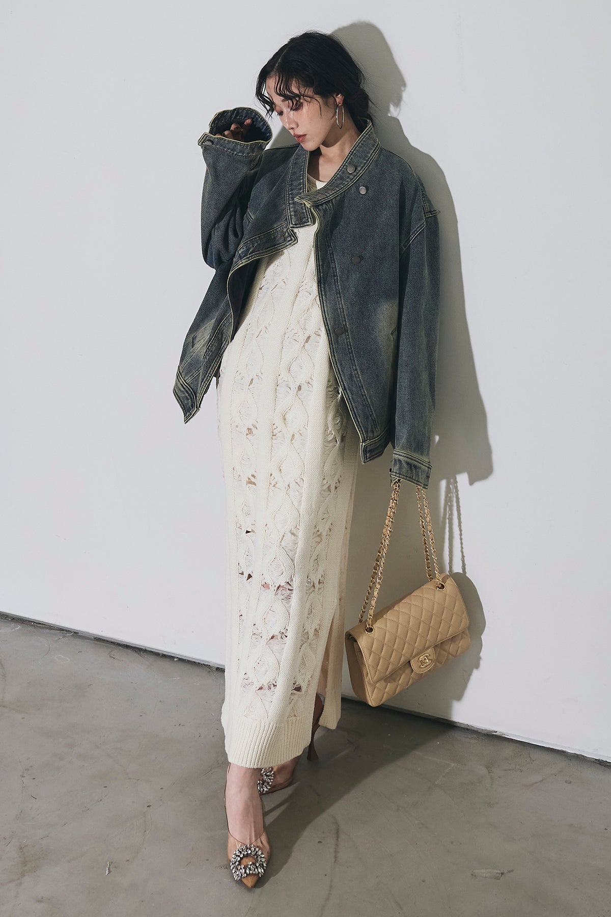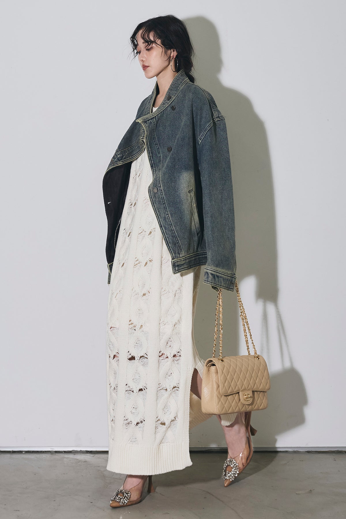【SET】スタンドカラーデニムジャケット+ケーブルニットワンピース