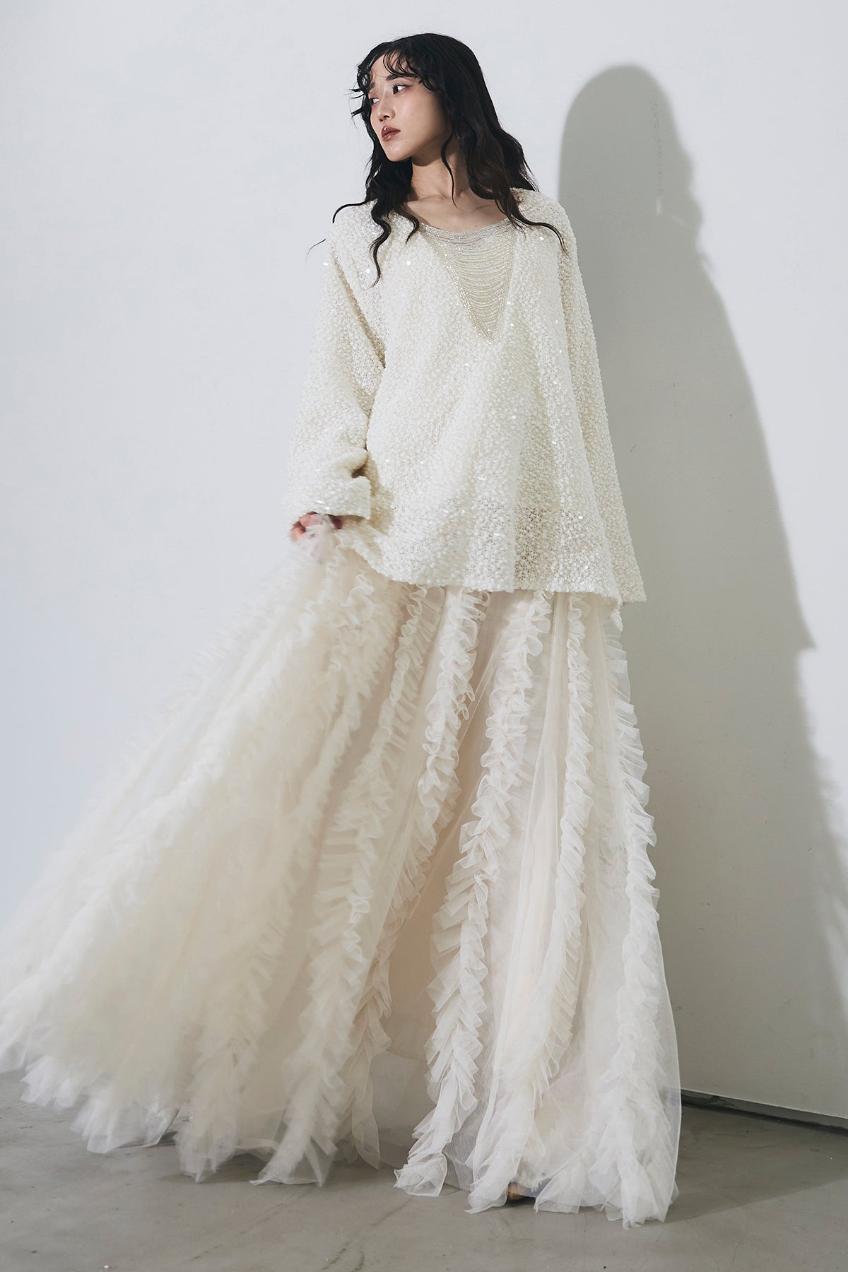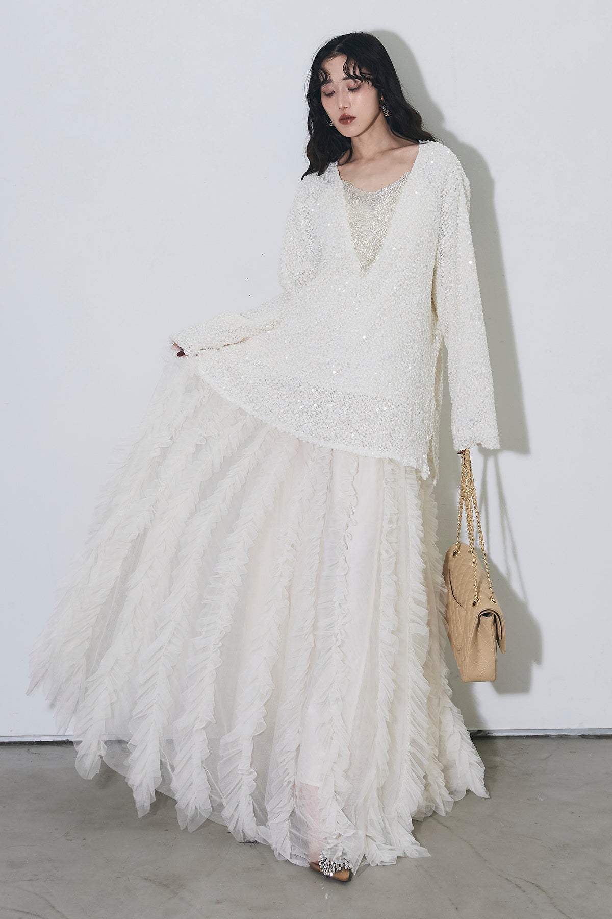 【SET】スパンコールVニット+ストライプフリルスカート