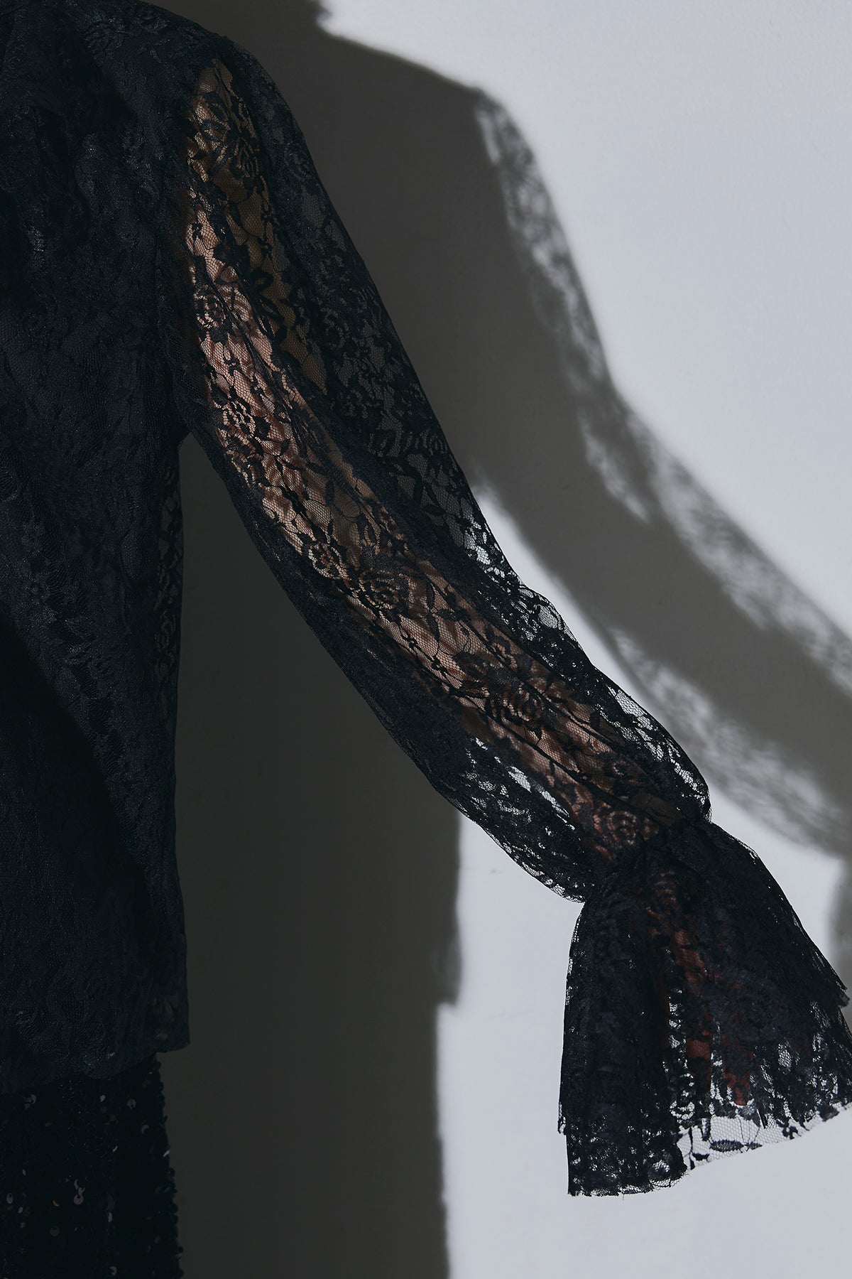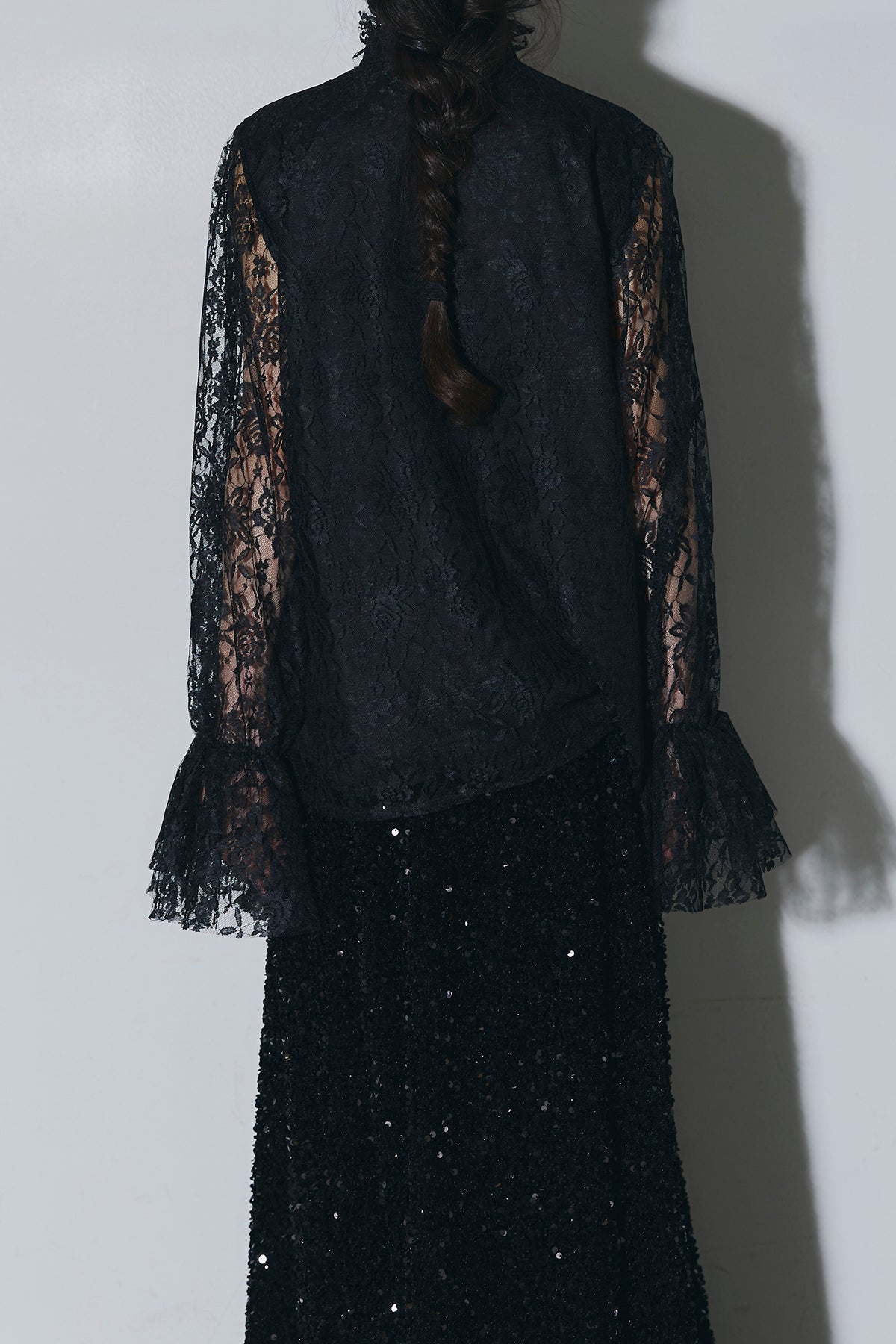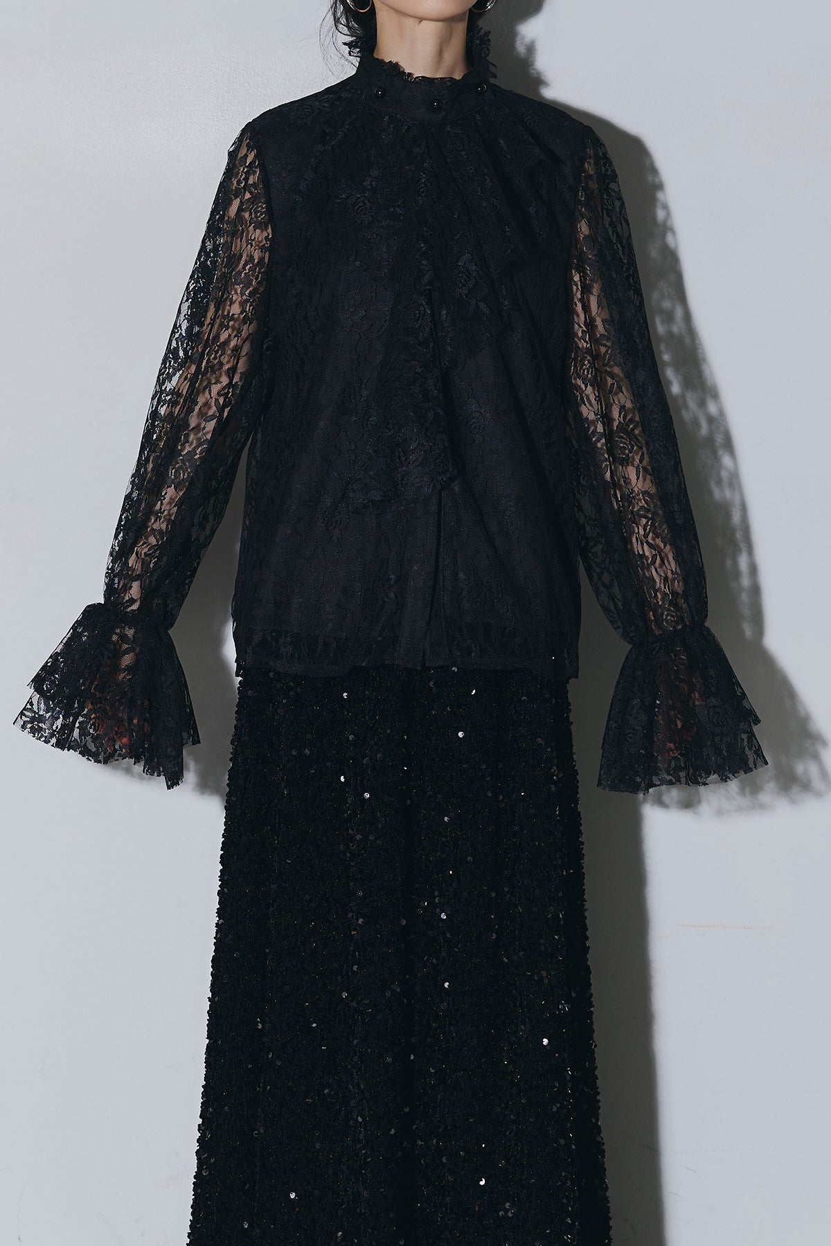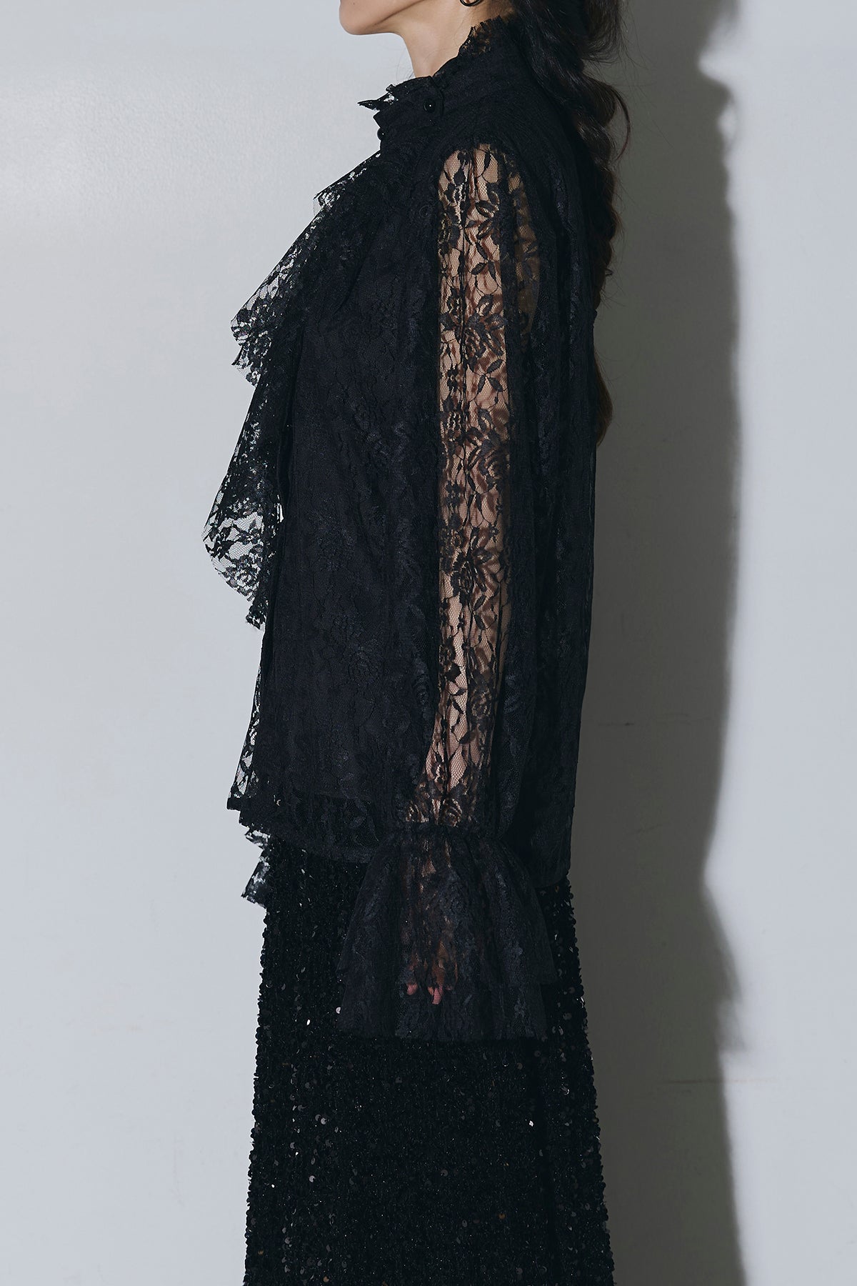 ご注文前に必ずページ下部「お届け期間」をご確認くださいませ。繊細なレースが印象的なブラウス。透け感のあるスリーブと立体感のあるフリルデザインが、上品で女性らしい雰囲気を演出します。程よい存在感があり、シンプルなボトムスと合わせるだけで洗練されたスタイリングに。きれいめからモードまで幅広く活躍する一着です。)