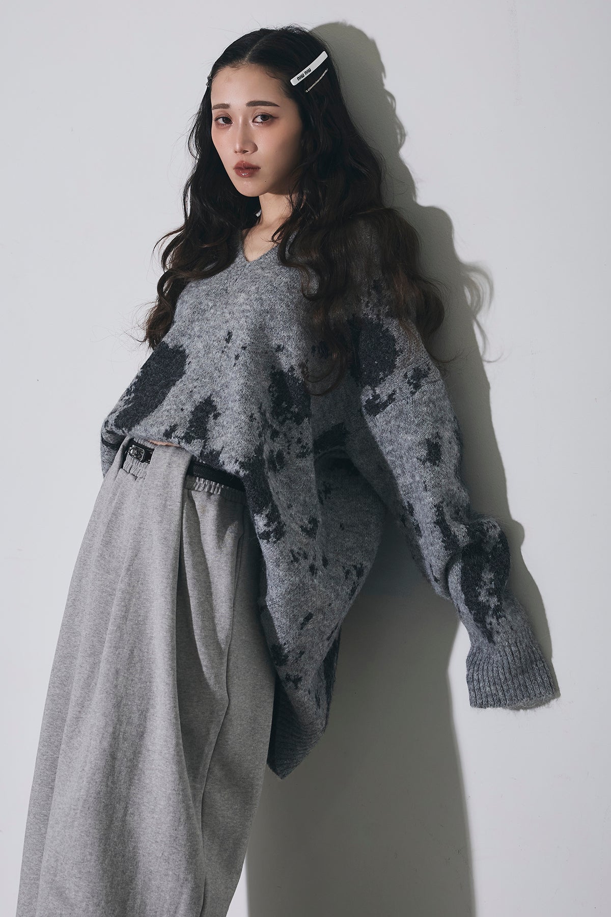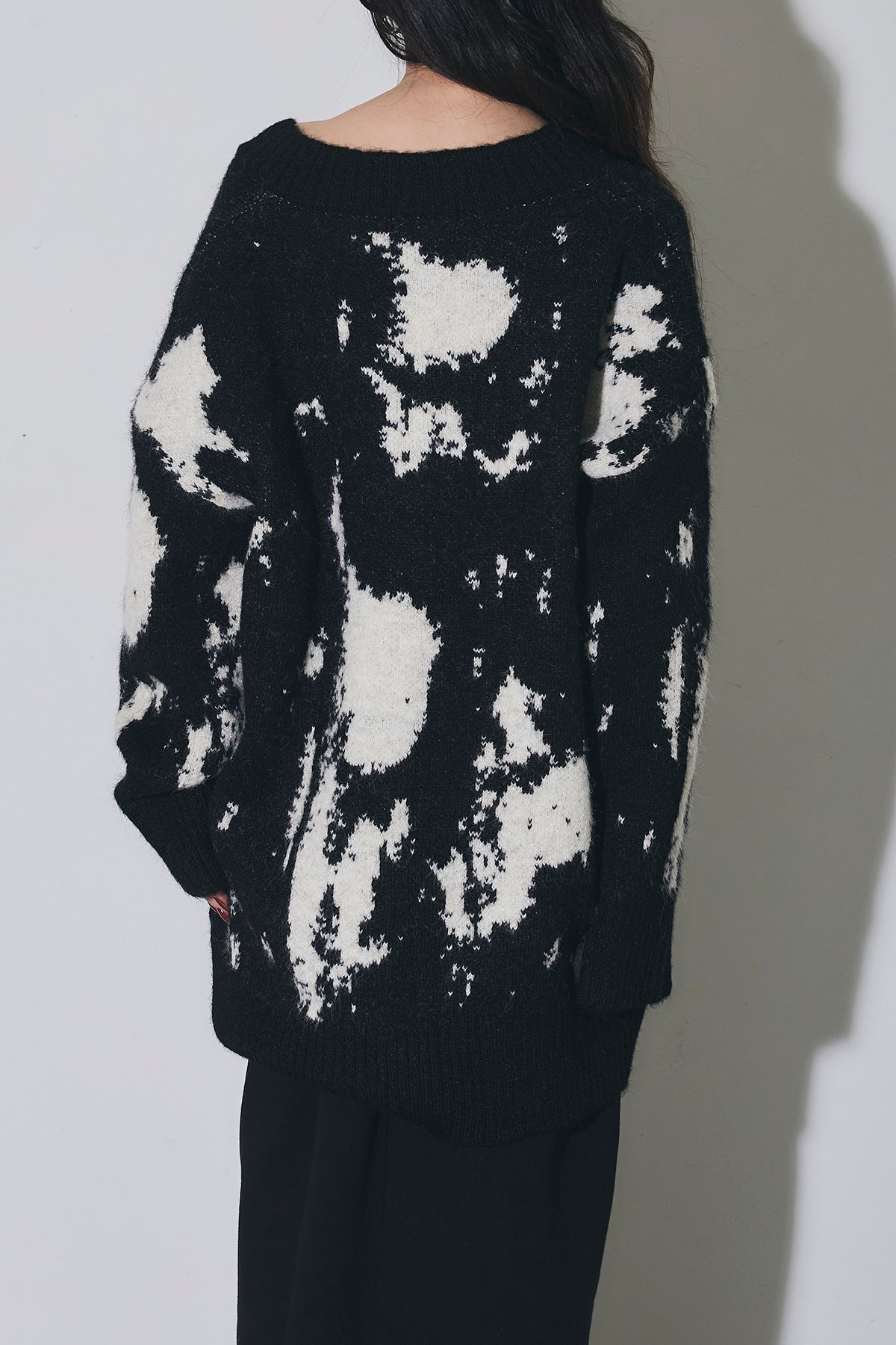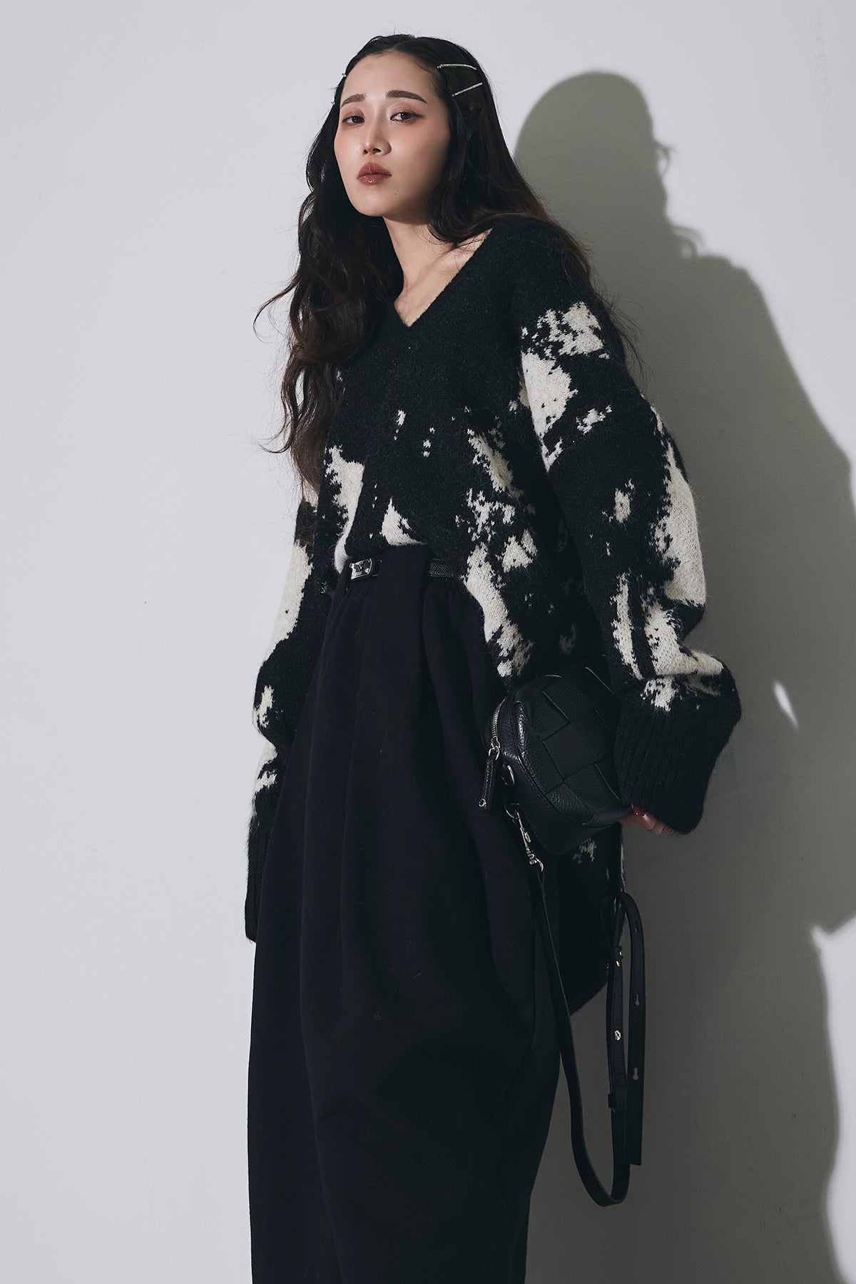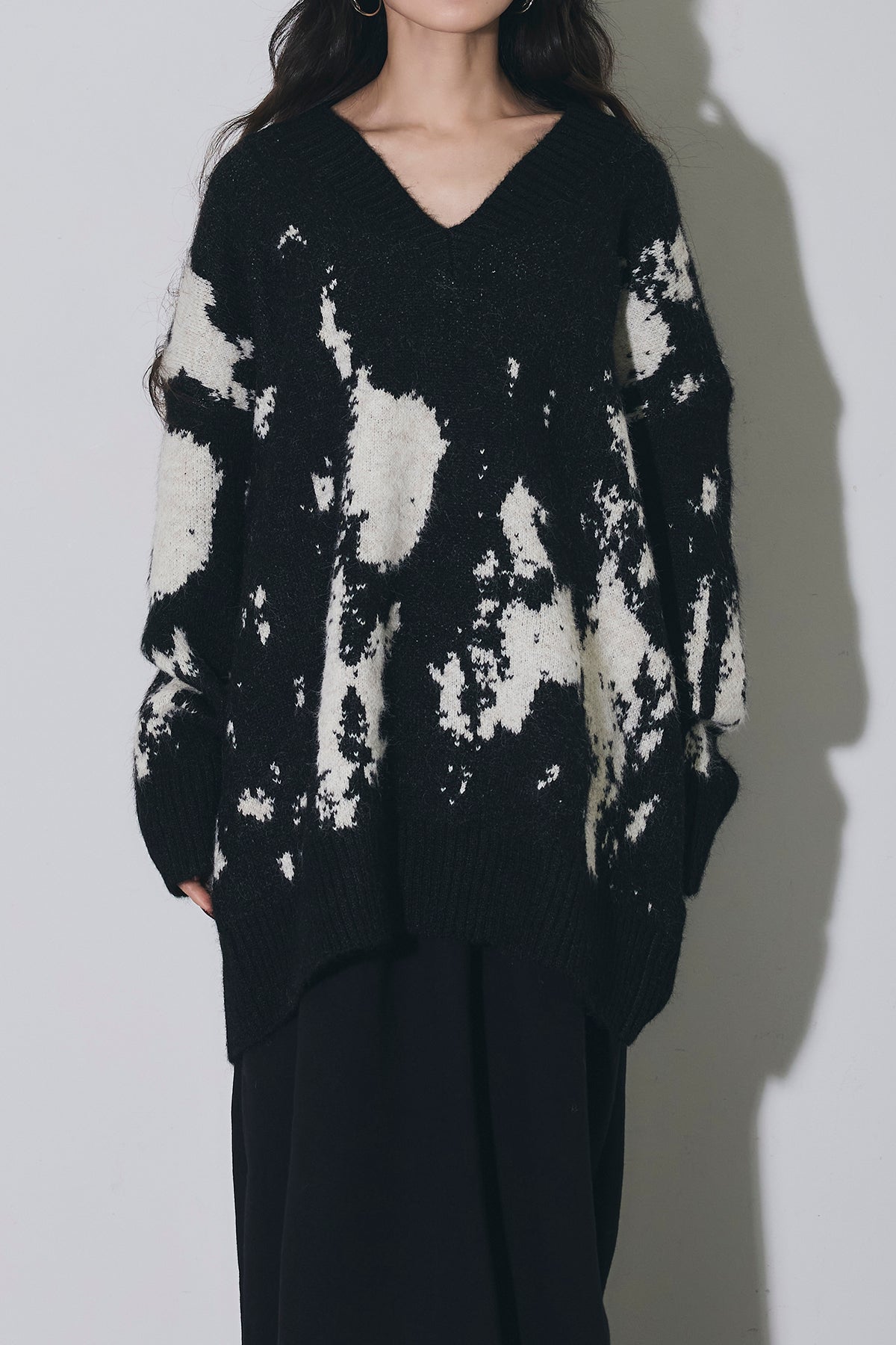 アートのような配色が目を惹くVネックニットは、ゆったりとしたシルエットで抜け感を作りつつ、着るだけでコーデの主役になる一枚。