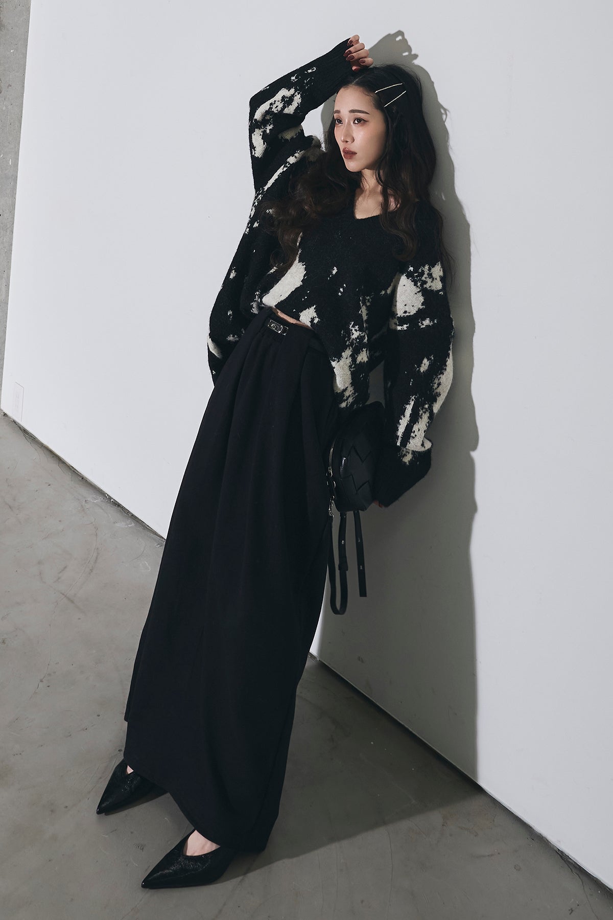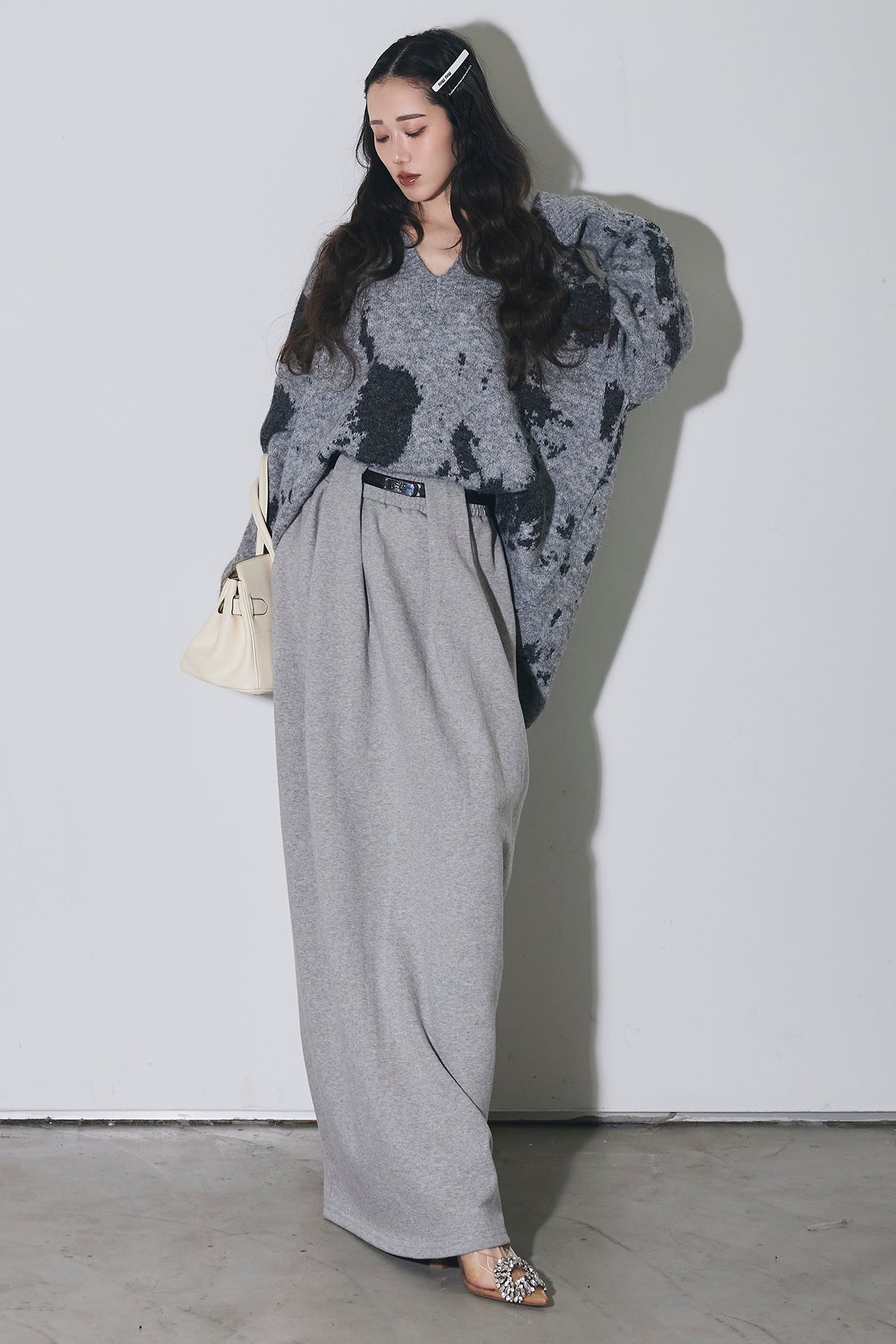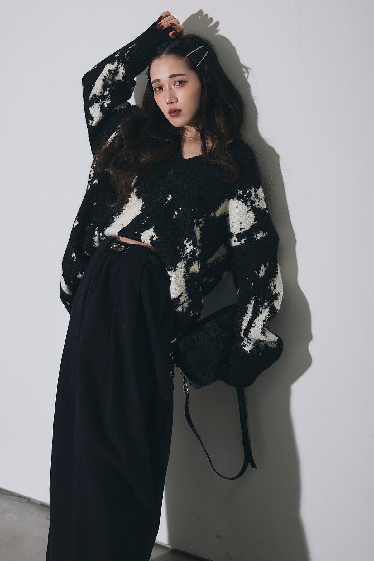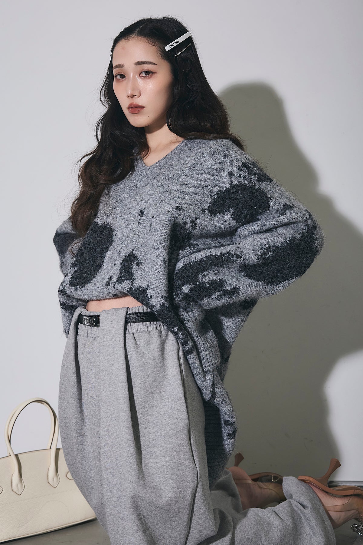 アートのような配色が目を惹くVネックニットは、ゆったりとしたシルエットで抜け感を作りつつ、着るだけでコーデの主役になる一枚。