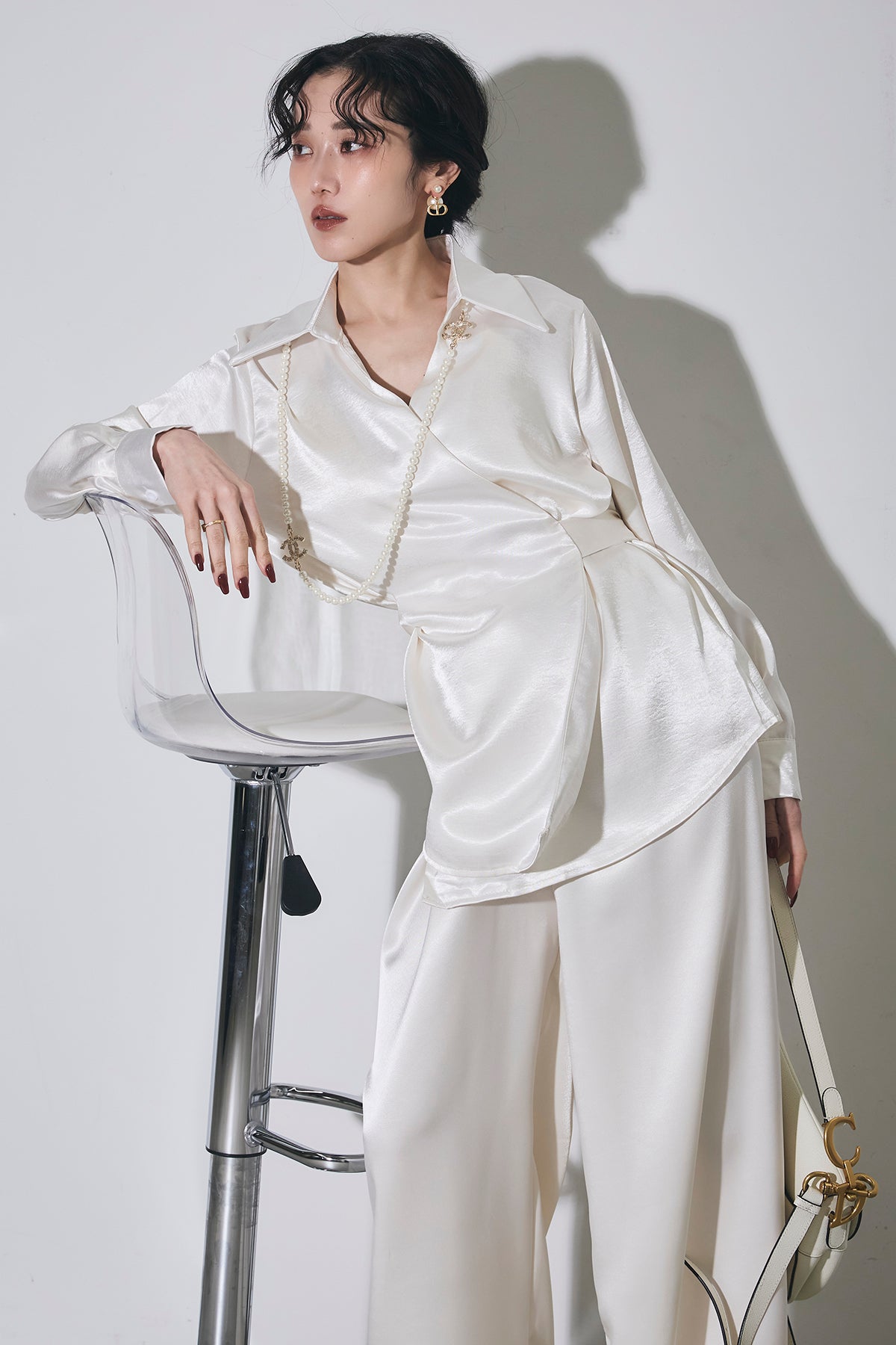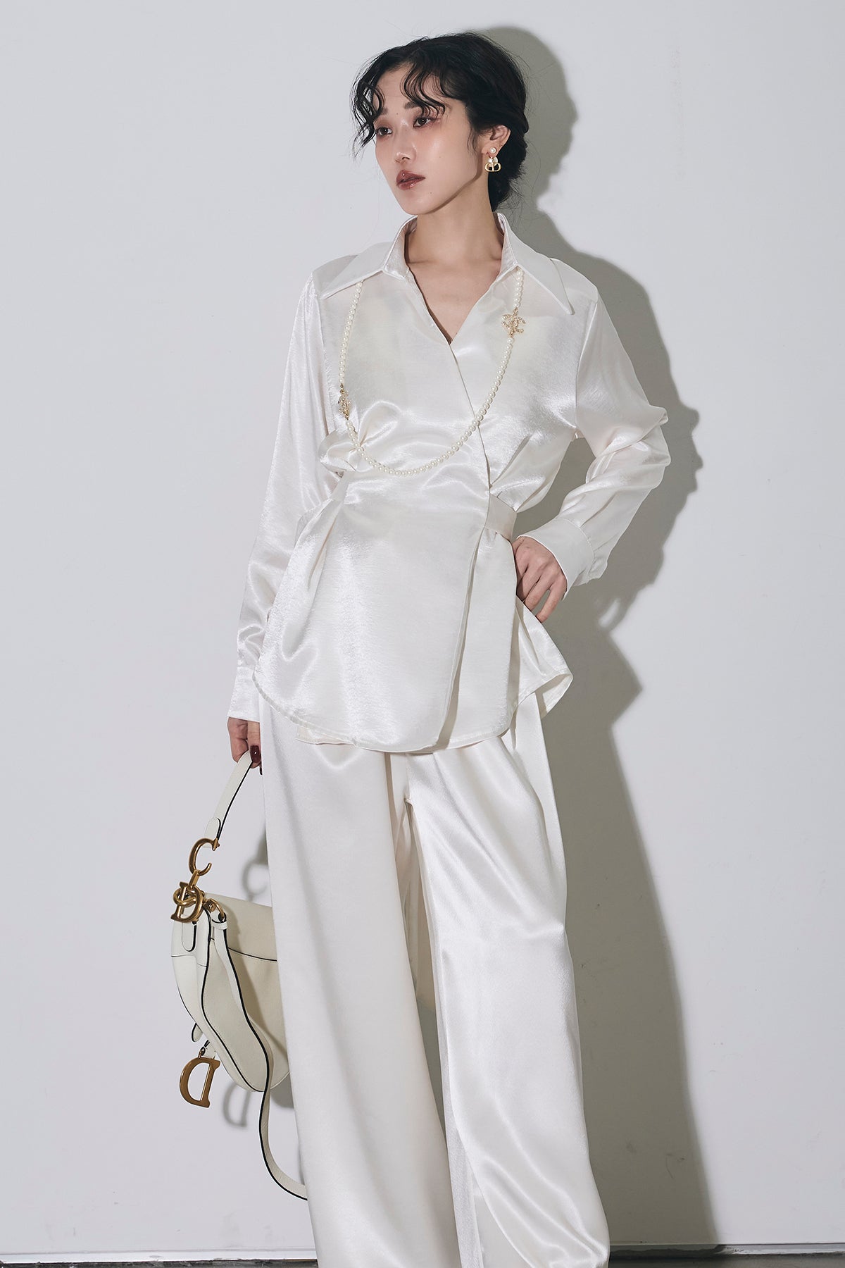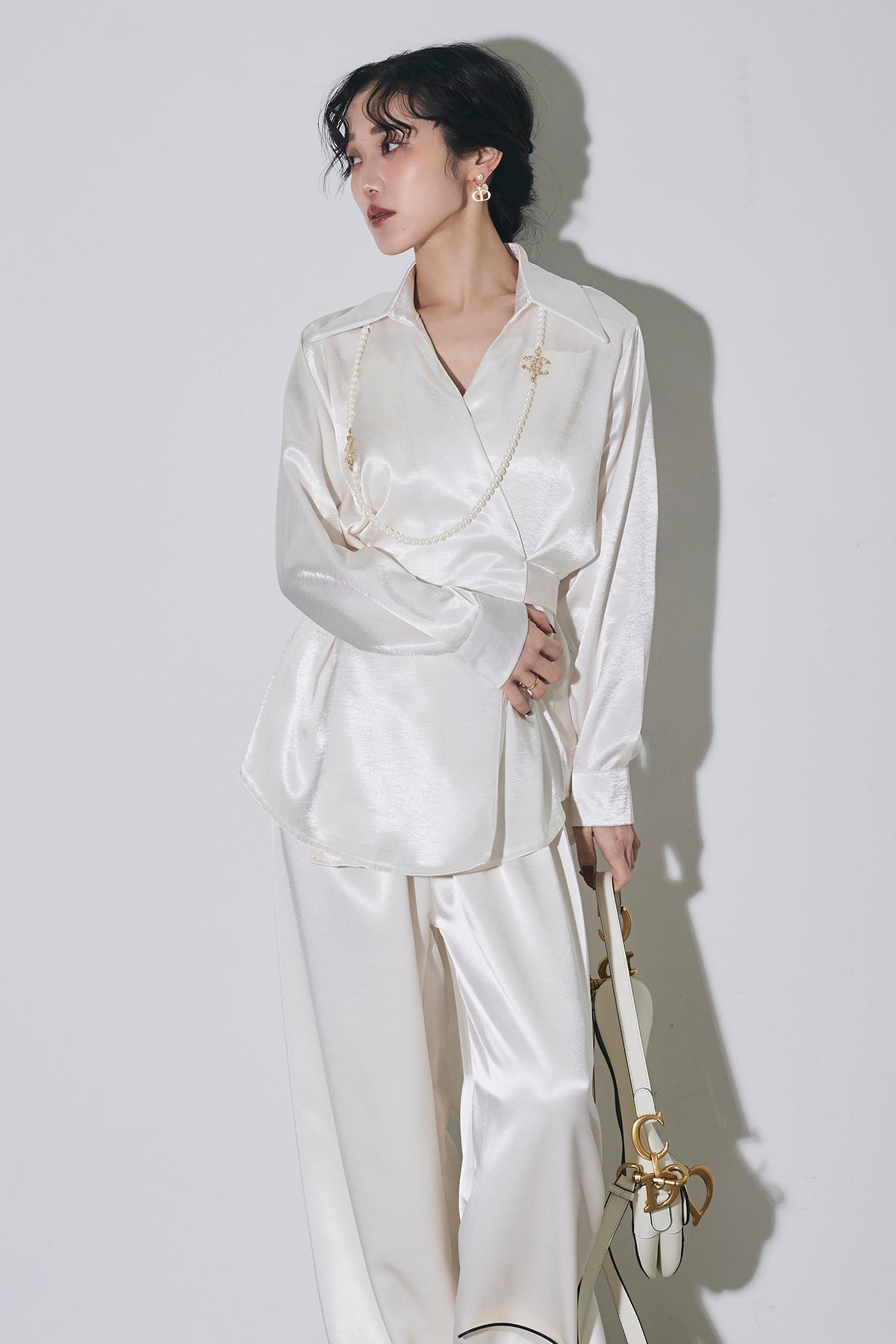 上品な光沢のサテン素材にカシュクールデザインとウエストリボンを効かせたシャツで、1枚で華やかに着映える主役トップス。