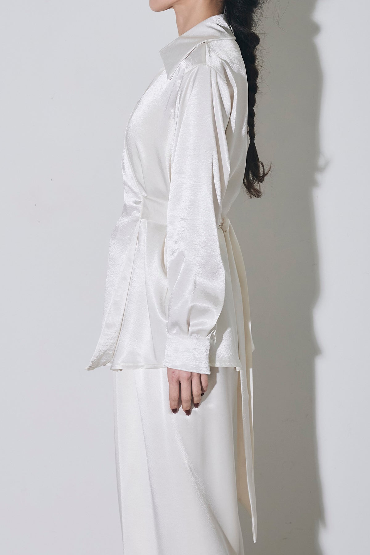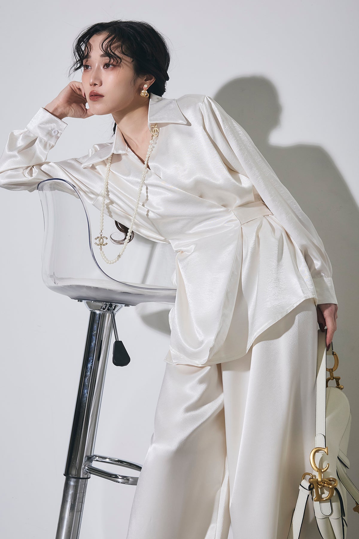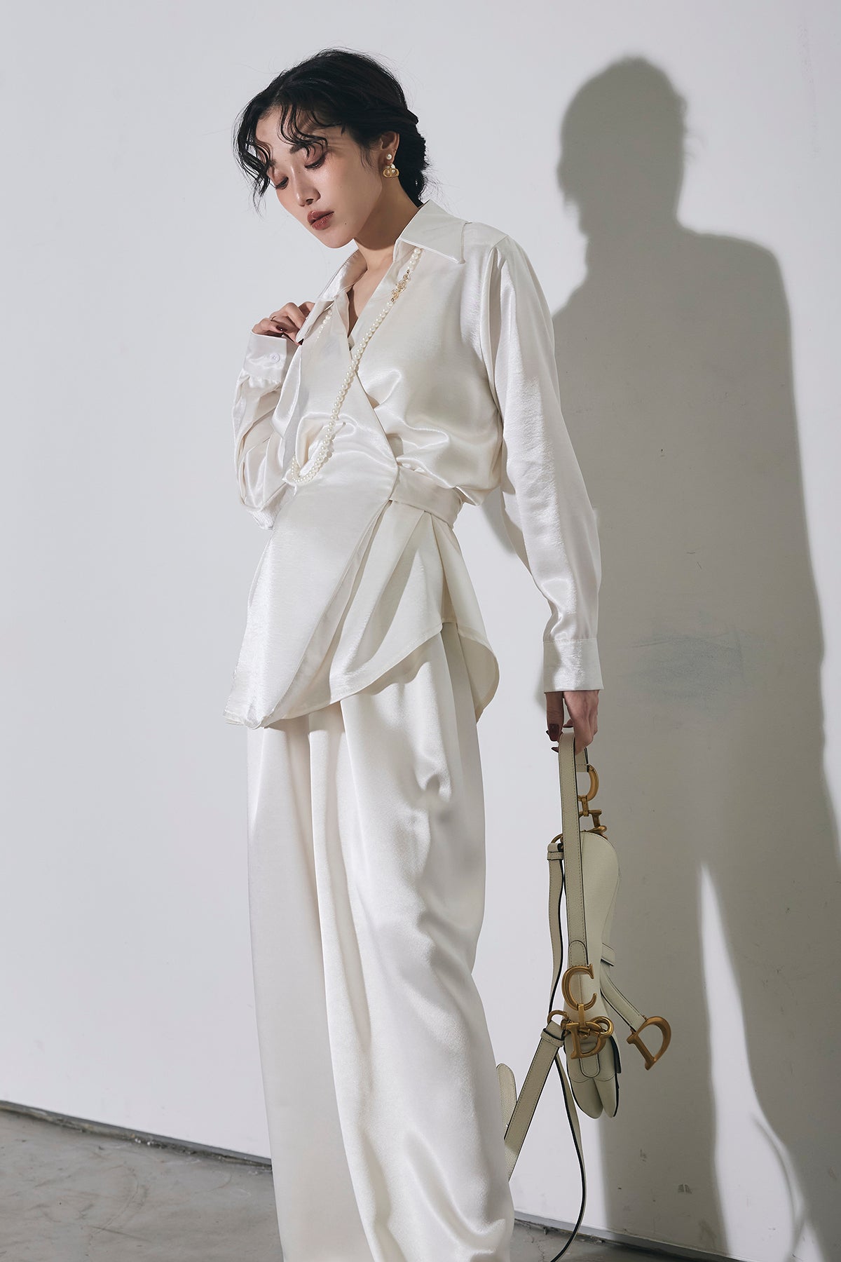 上品な光沢のサテン素材にカシュクールデザインとウエストリボンを効かせたシャツで、1枚で華やかに着映える主役トップス。