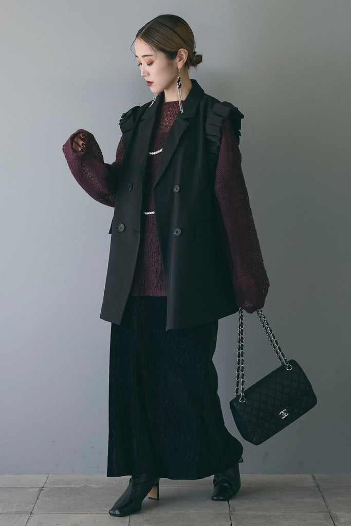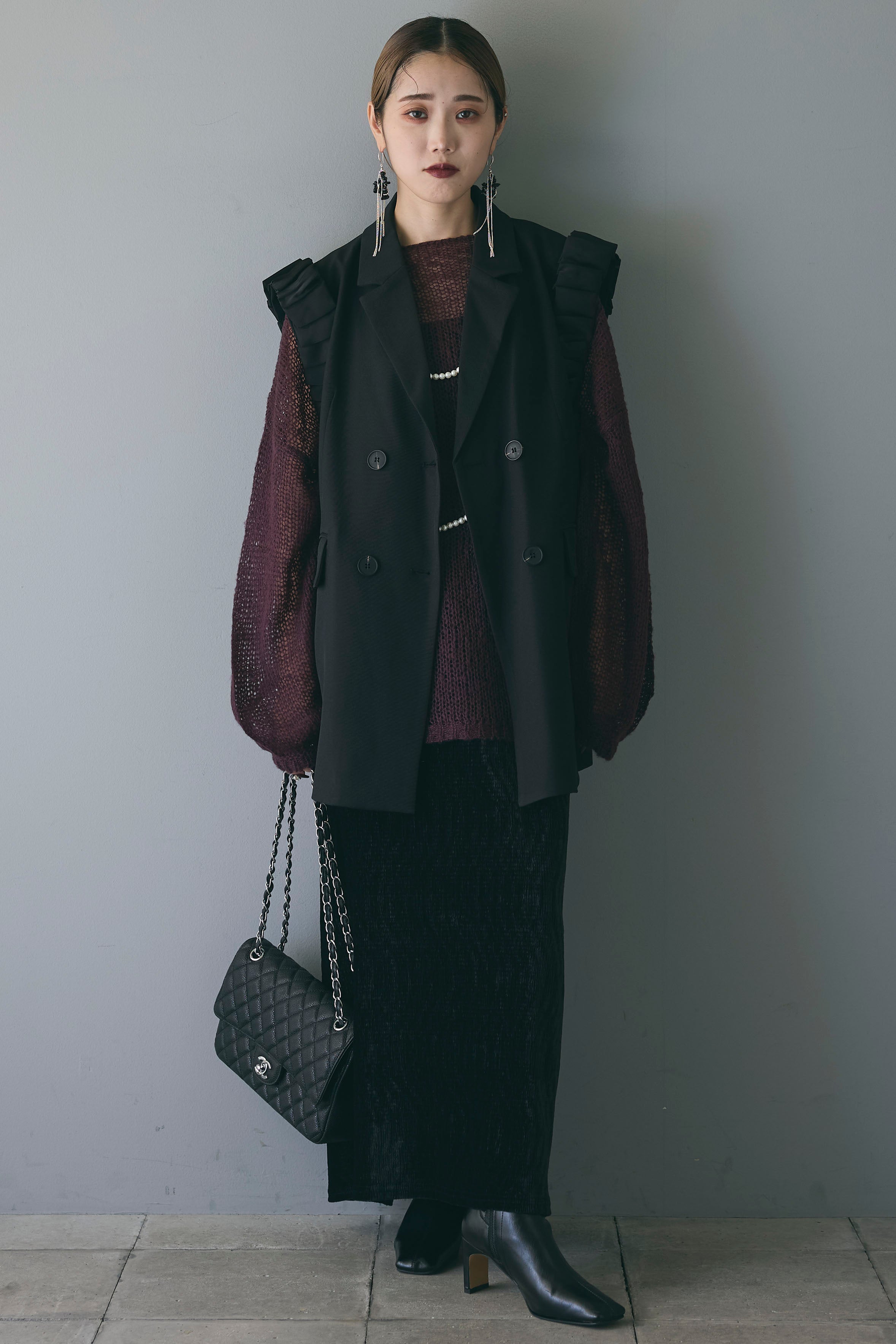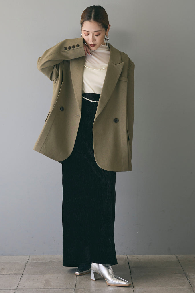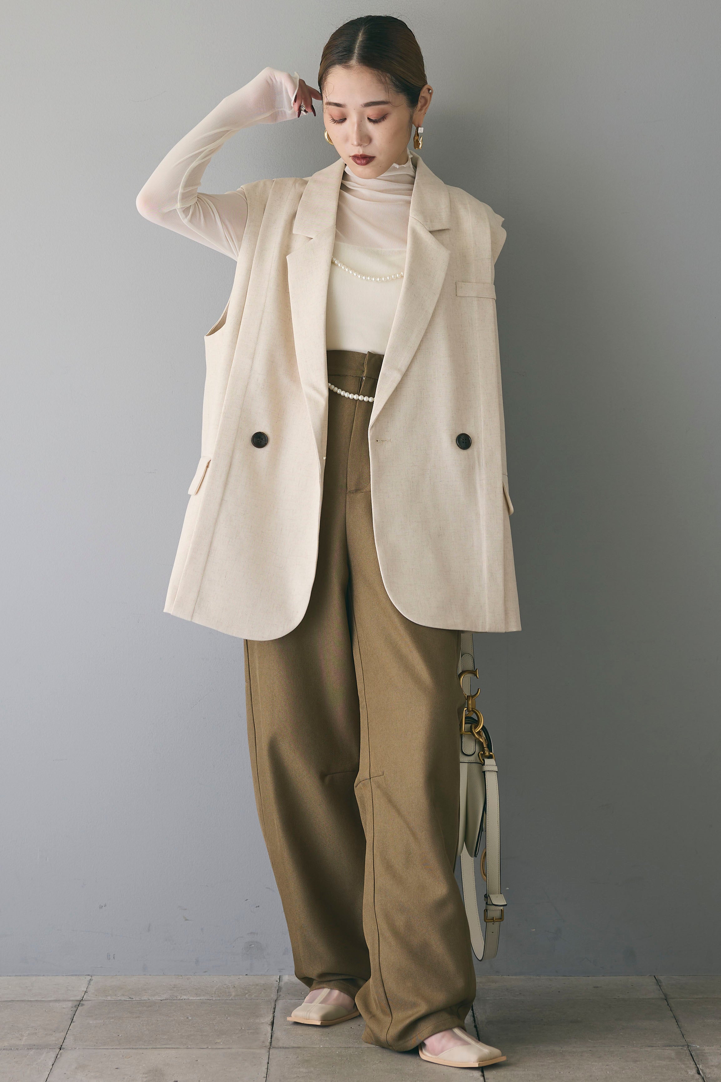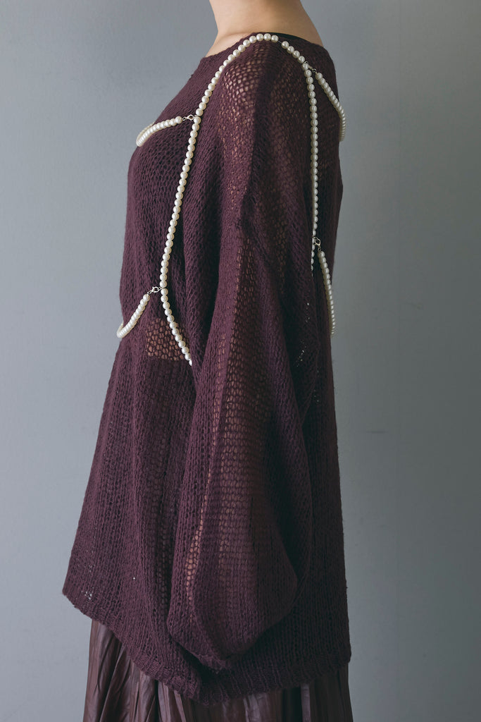 シンプルなコーディネートに上品さと華やかさをプラスするアクセサリーアイテムです。写真のように、トップスの上からレイヤードすることで、洗練された印象を演出します。パールビーズが胸元から背中にかけて流れるデザインで、どの角度から見てもエレガントでクラシックな雰囲気が漂います。シンプルなニットやドレスに合わせて、コーディネートのアクセントとして活用でき、特別なシーンにも映える一品です。
