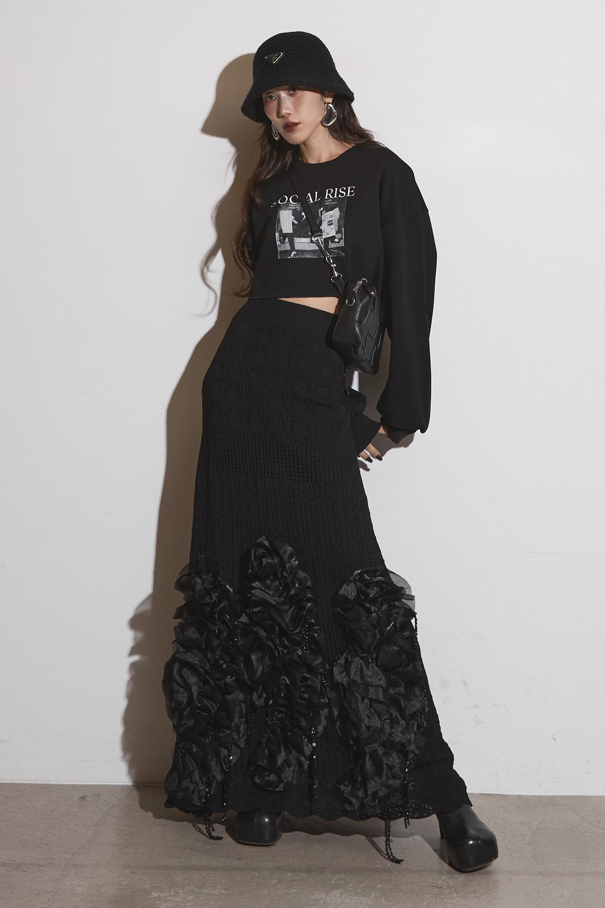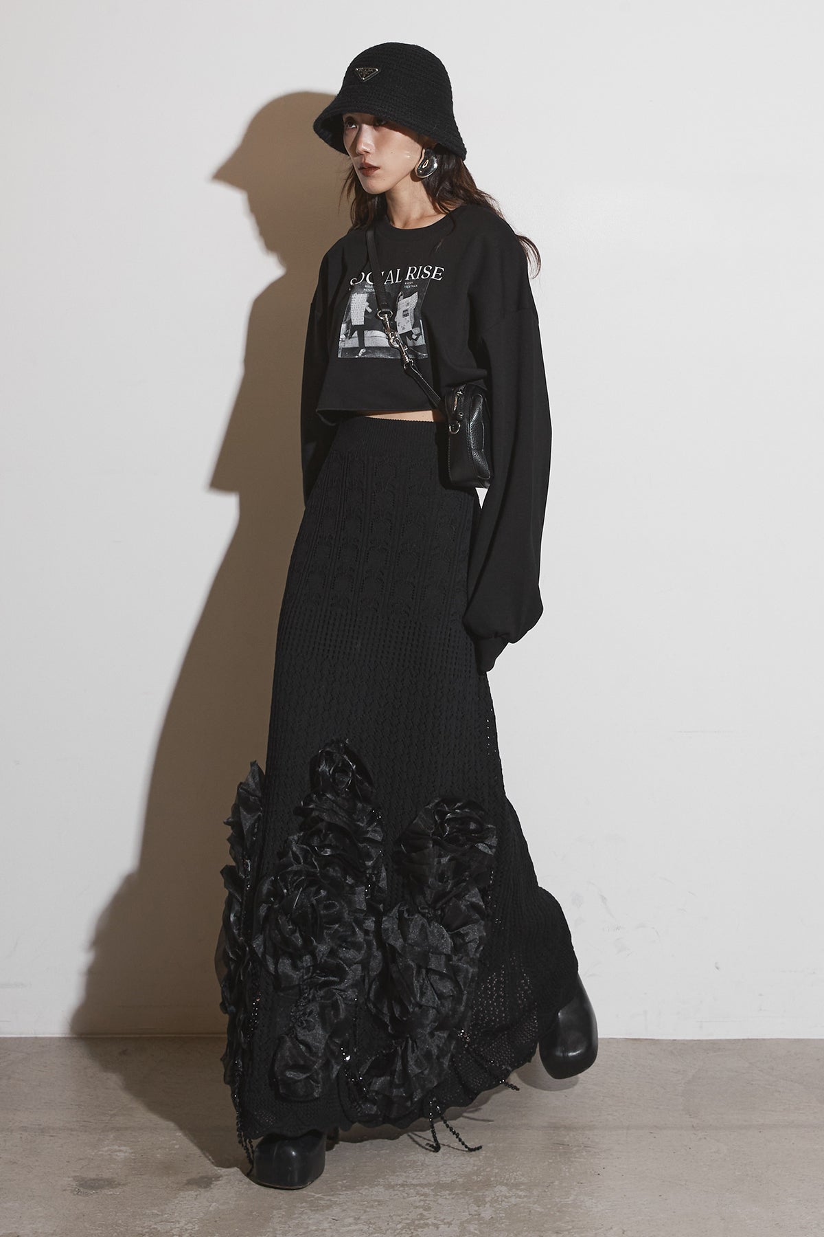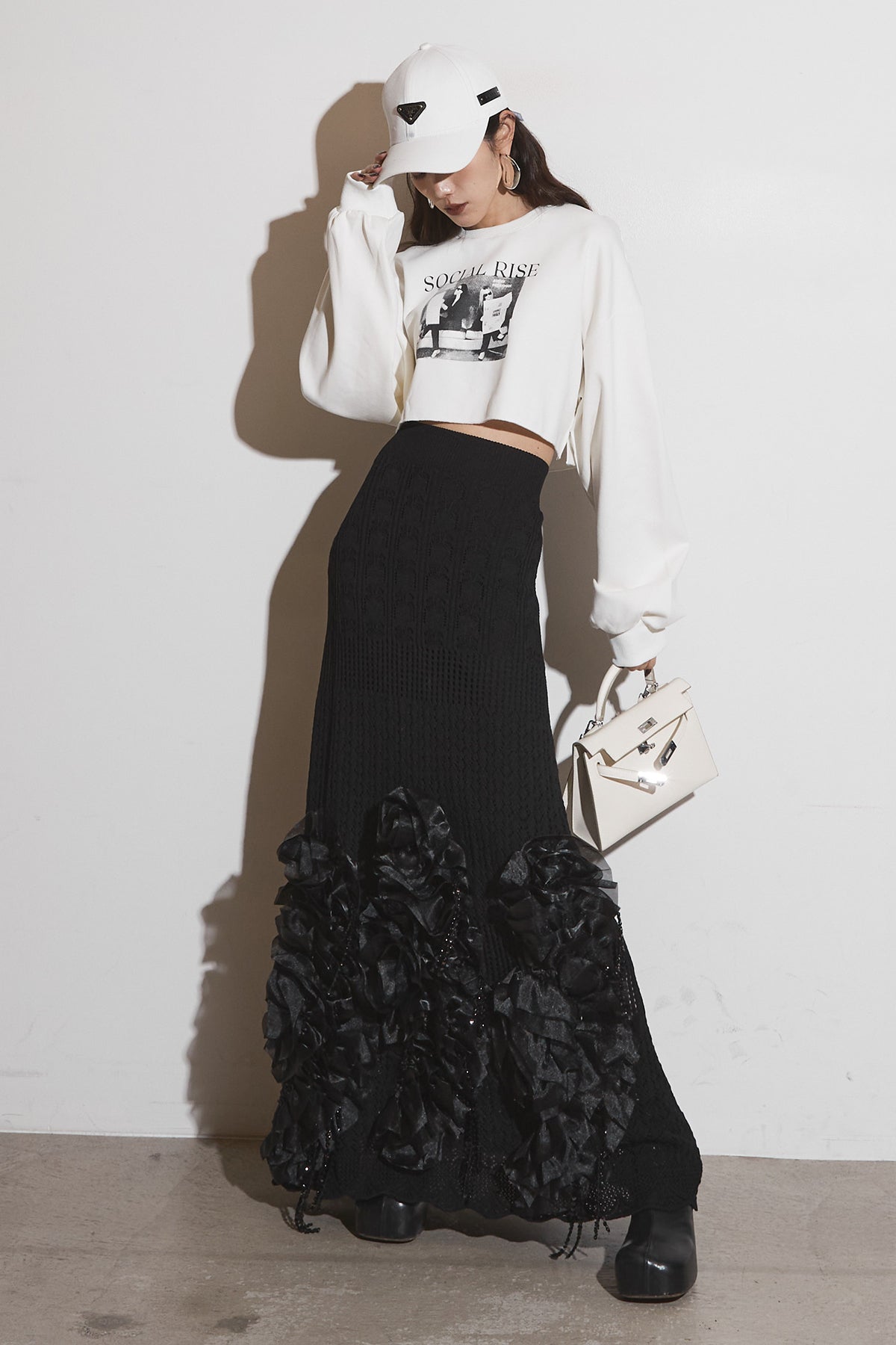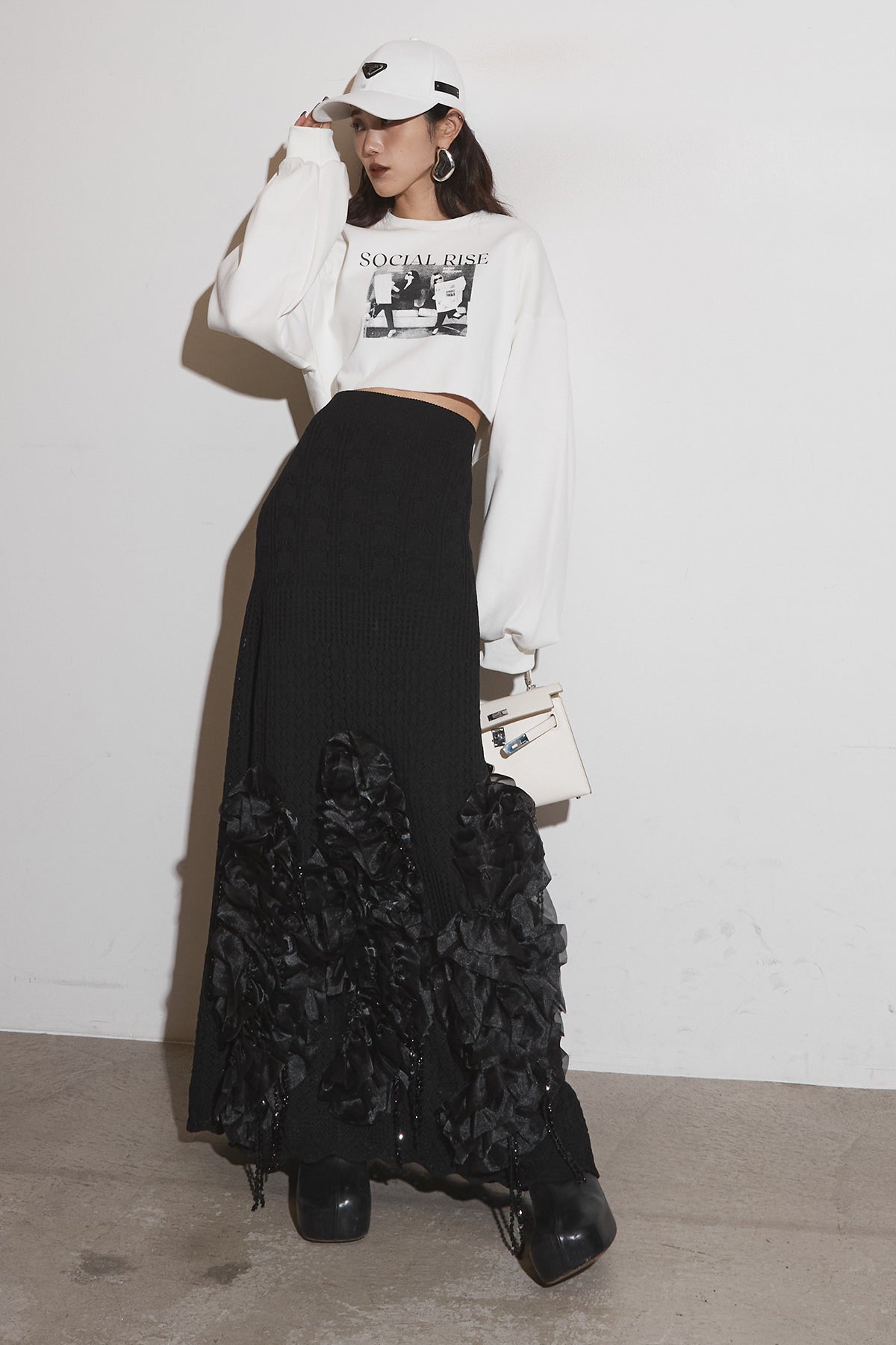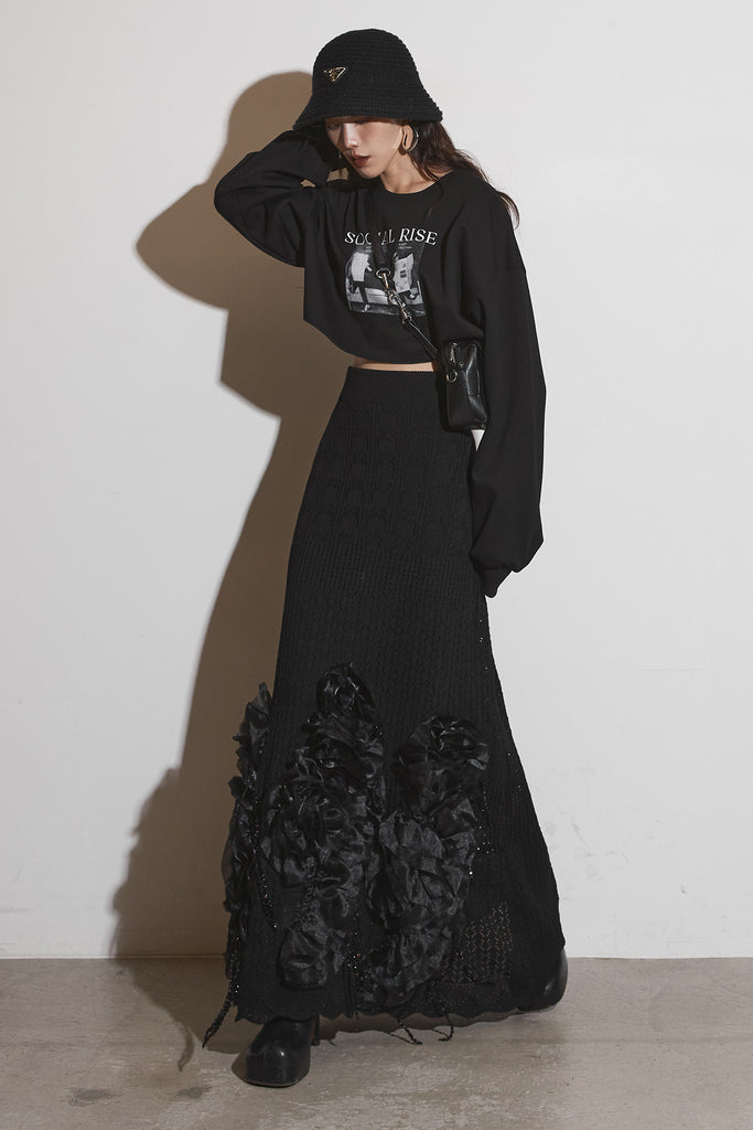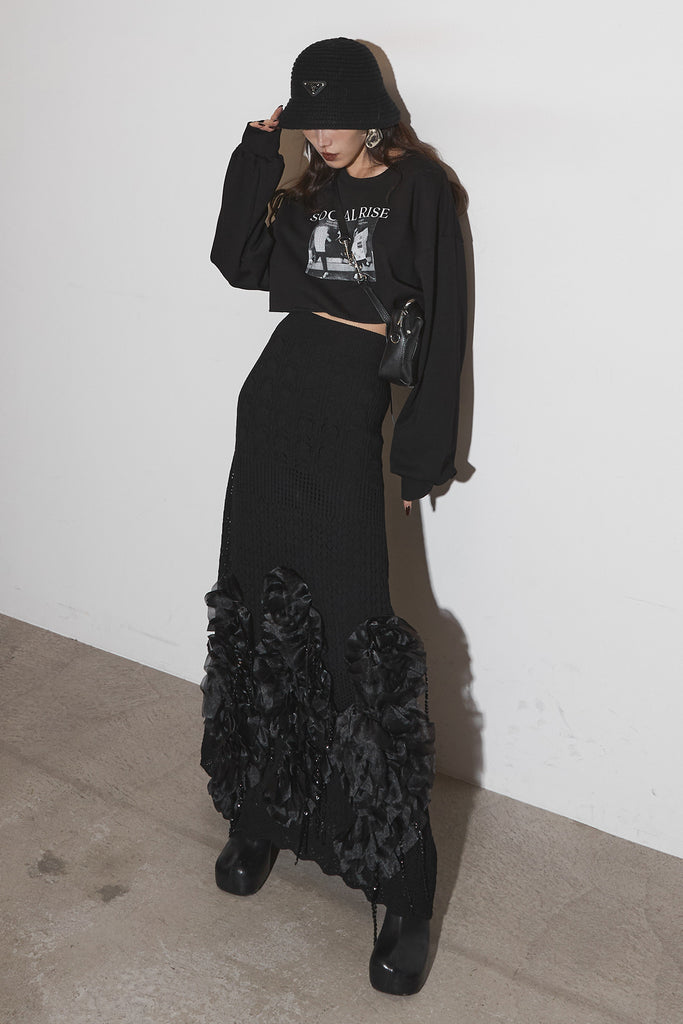 【SET】クロップドプリントプルオーバー+フラワービジューニットスカート