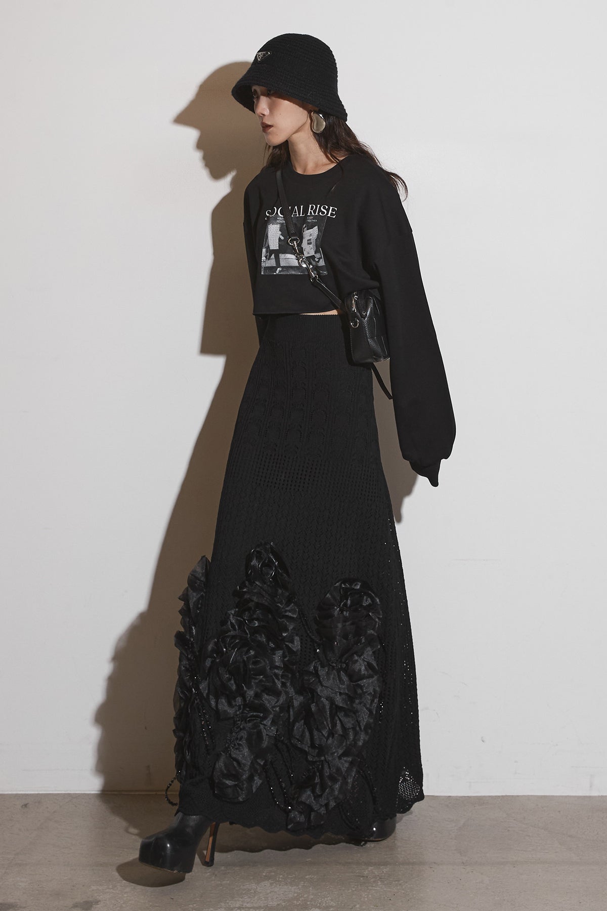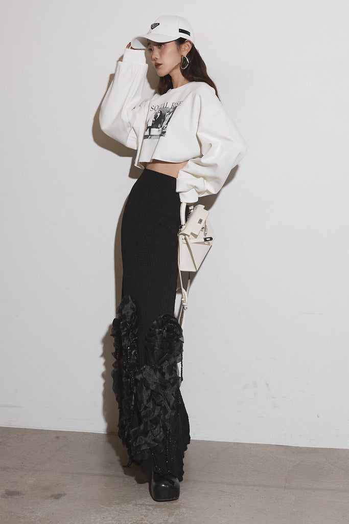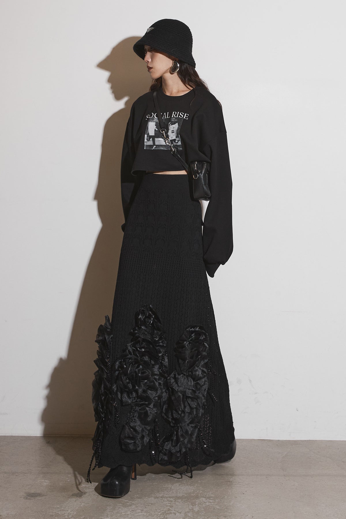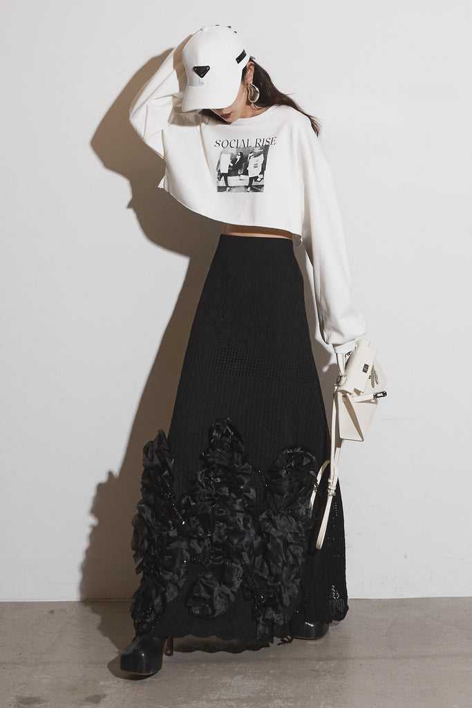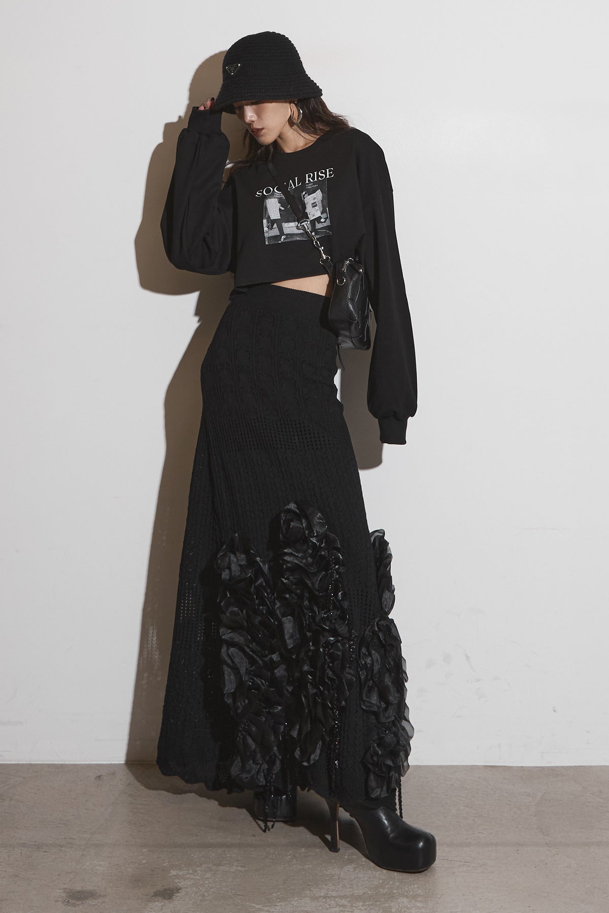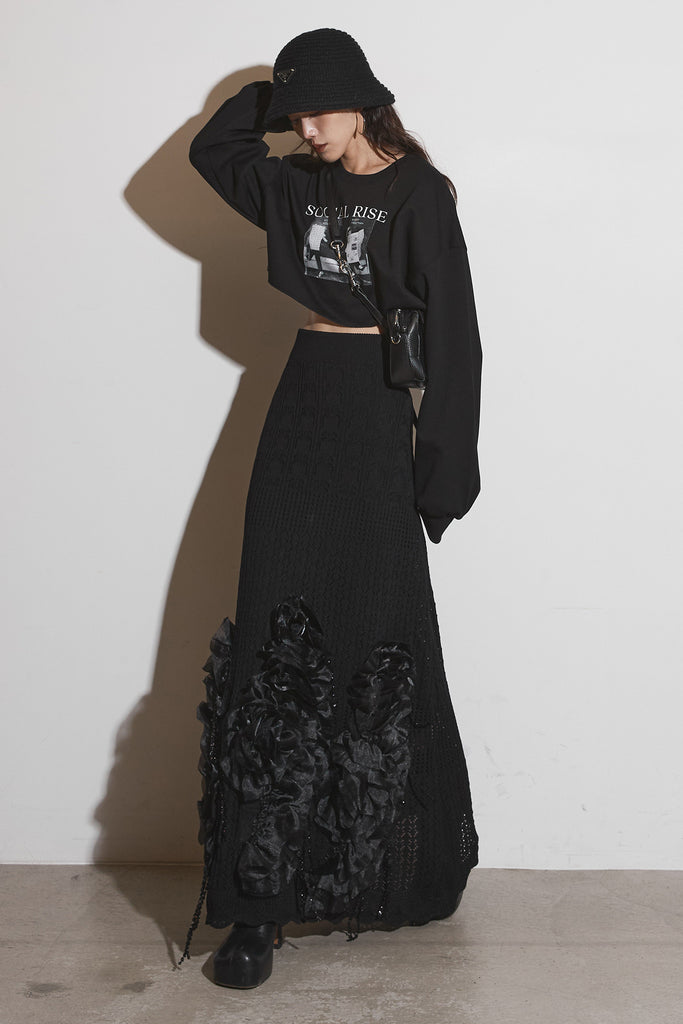 【SET】クロップドプリントプルオーバー+フラワービジューニットスカート