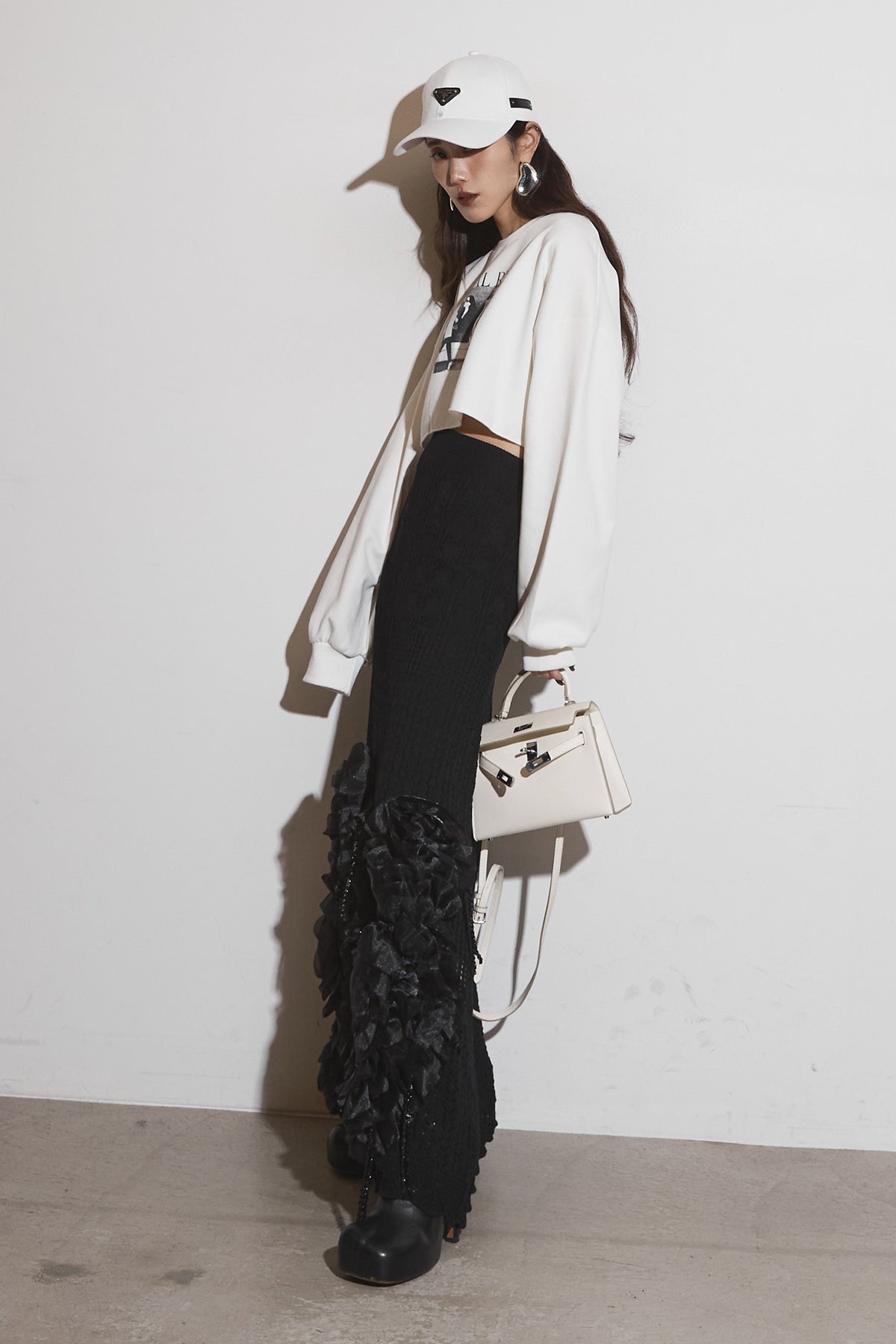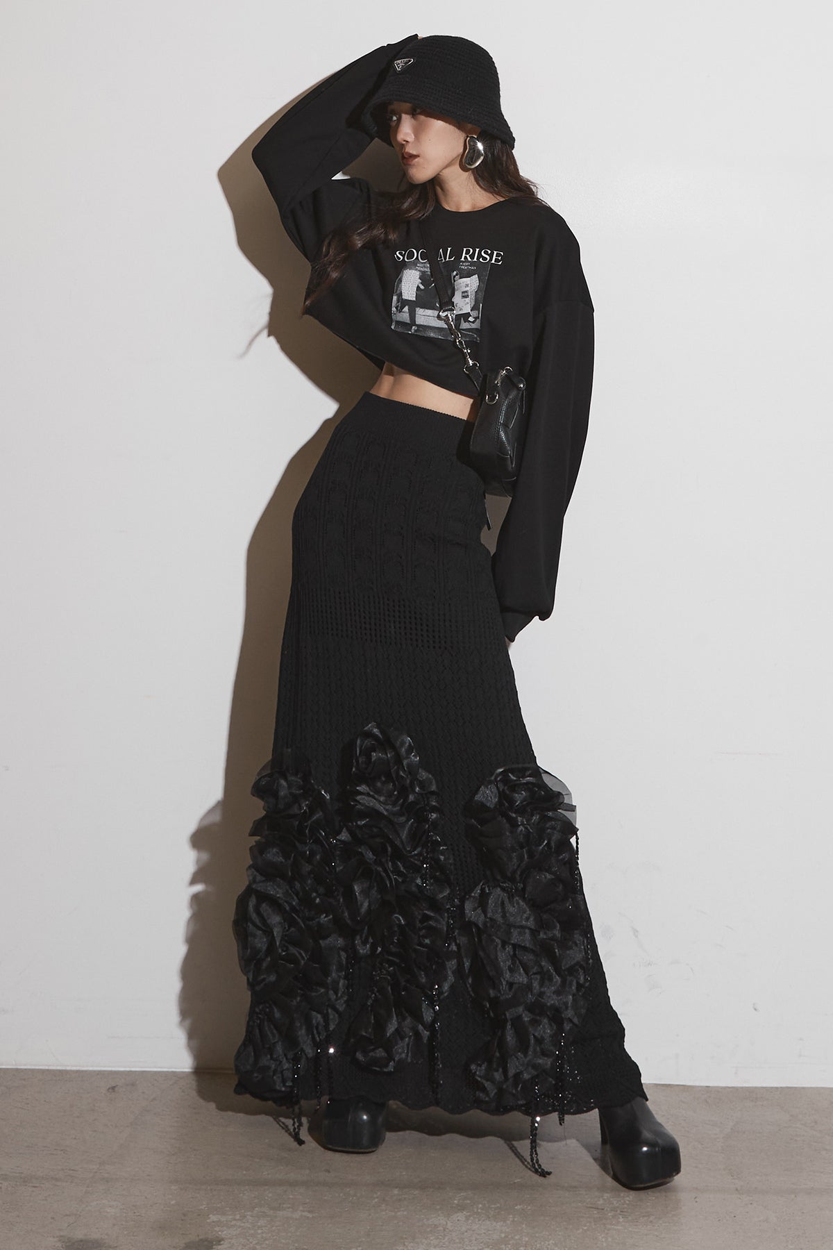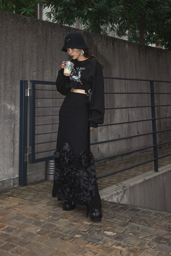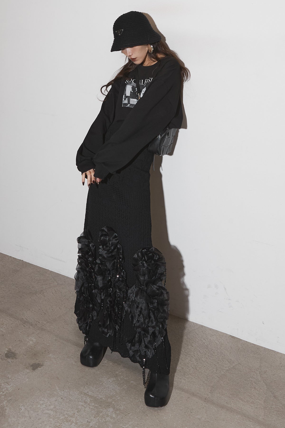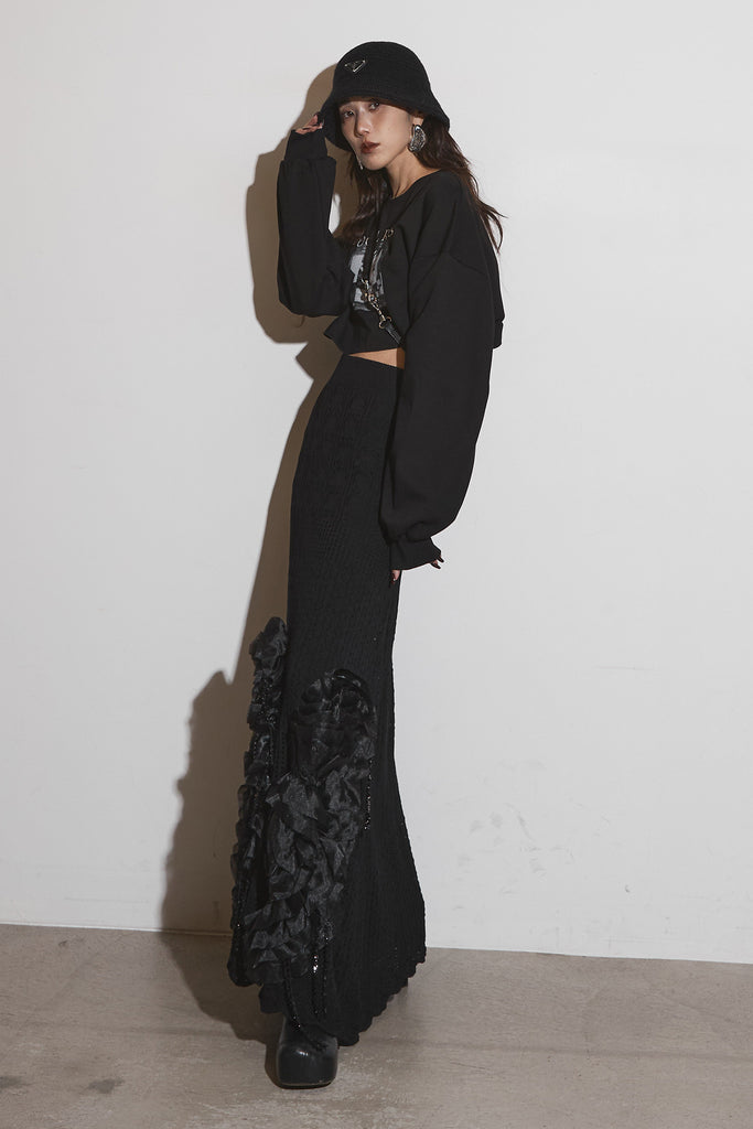 【SET】クロップドプリントプルオーバー+フラワービジューニットスカート