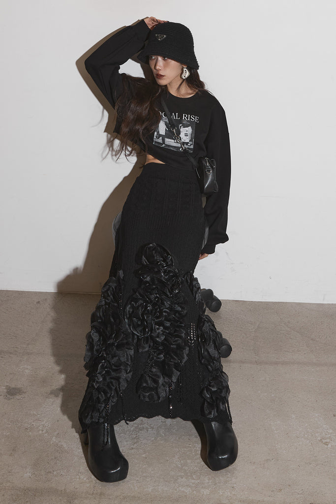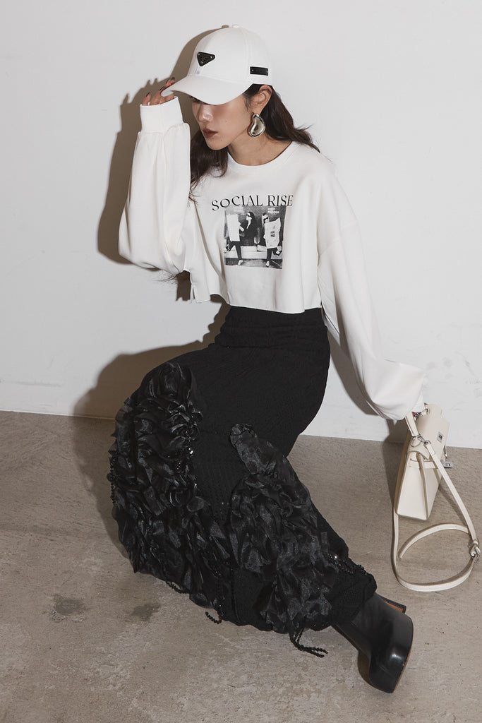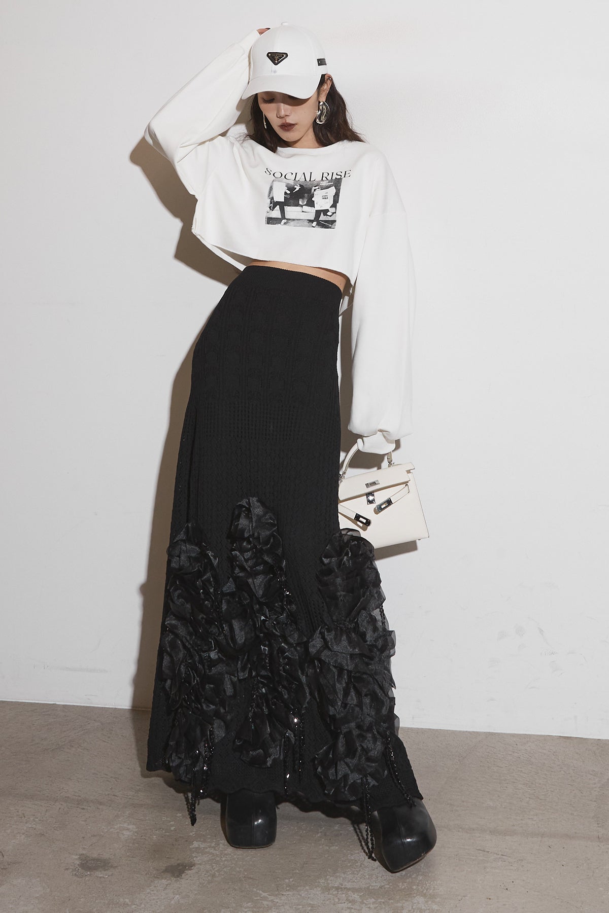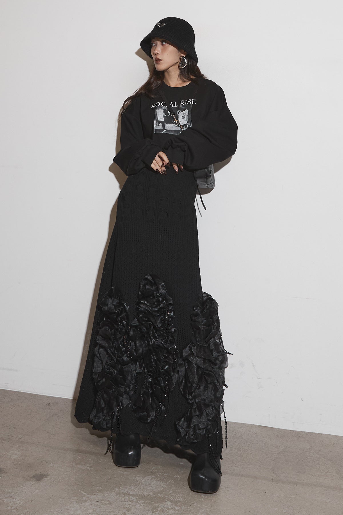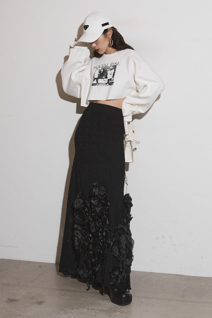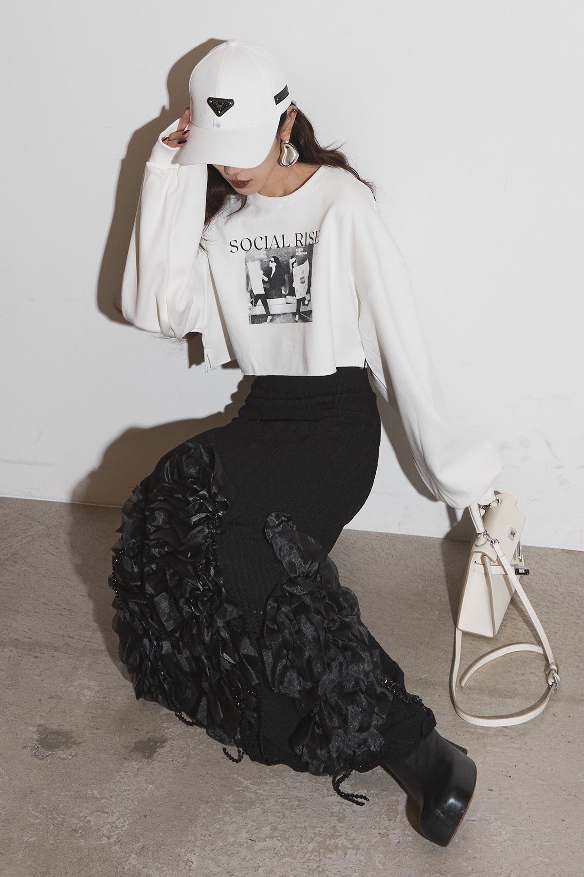 【SET】クロップドプリントプルオーバー+フラワービジューニットスカート