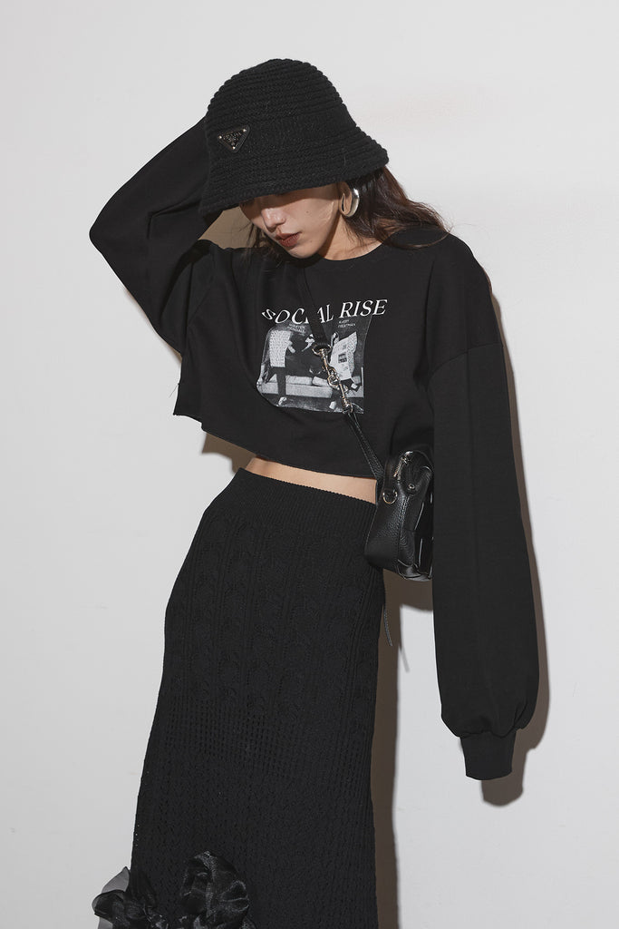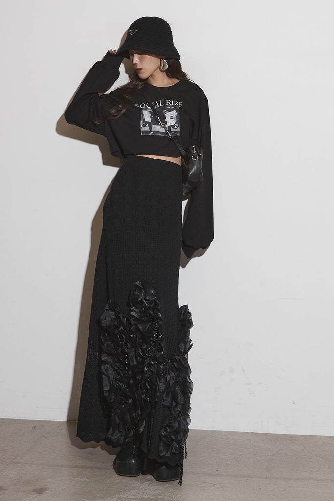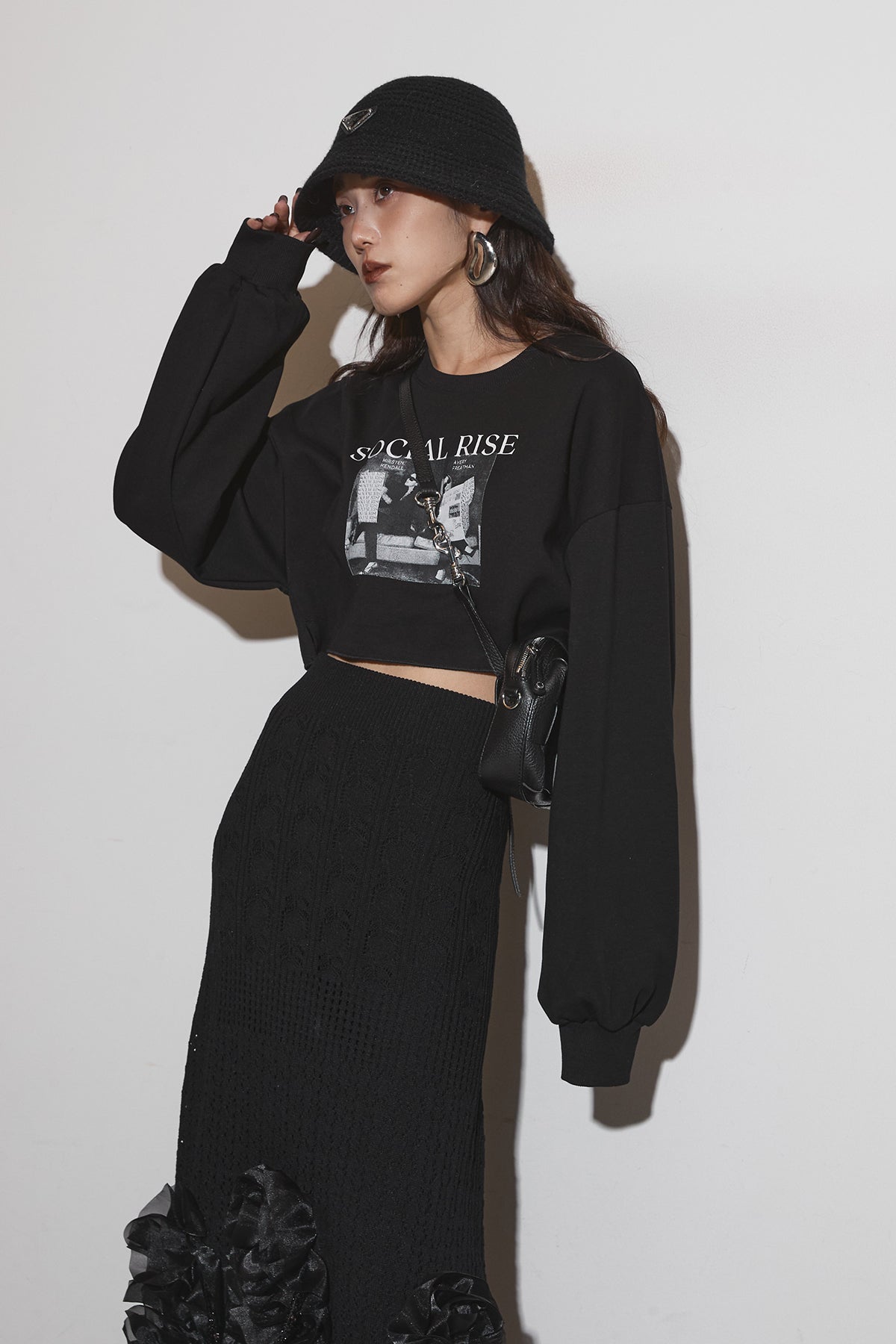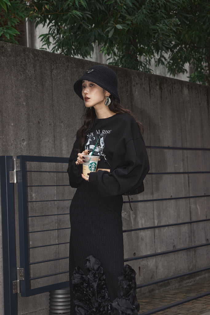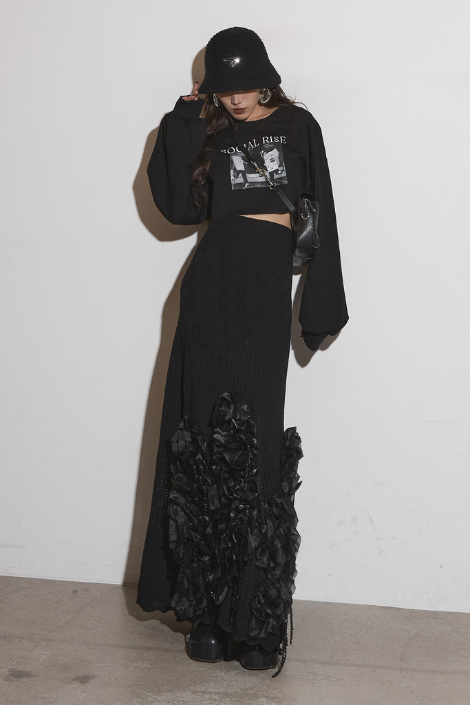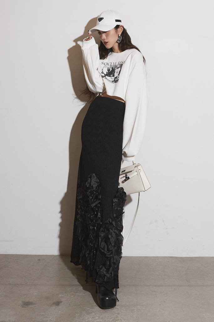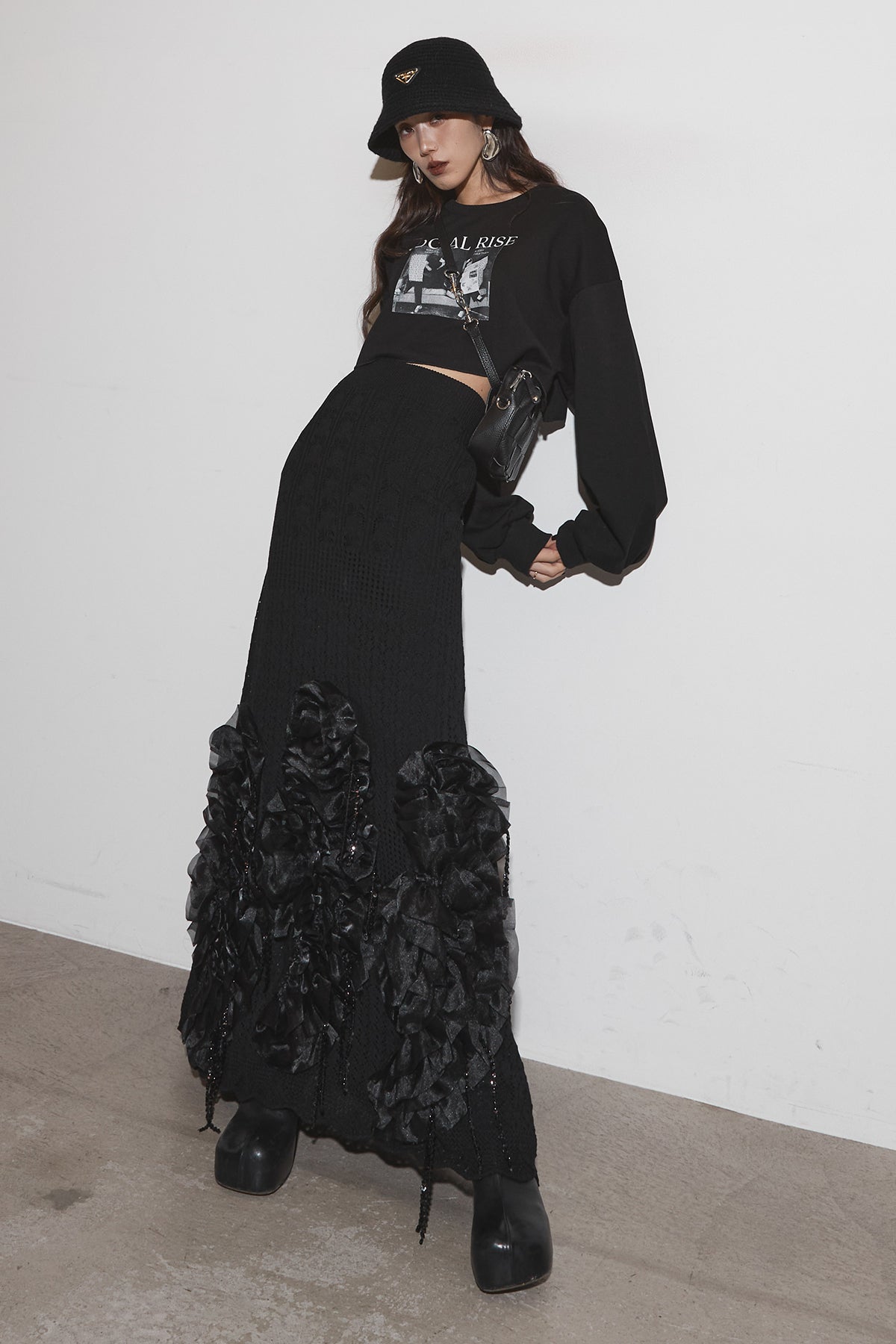 【SET】クロップドプリントプルオーバー+フラワービジューニットスカート