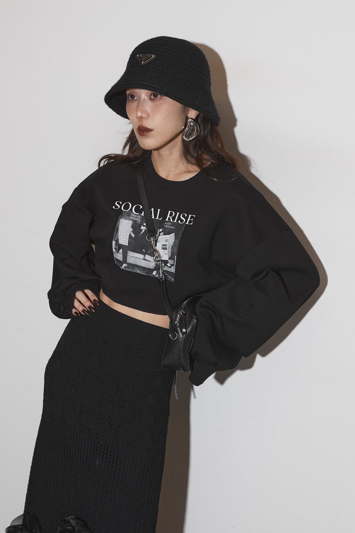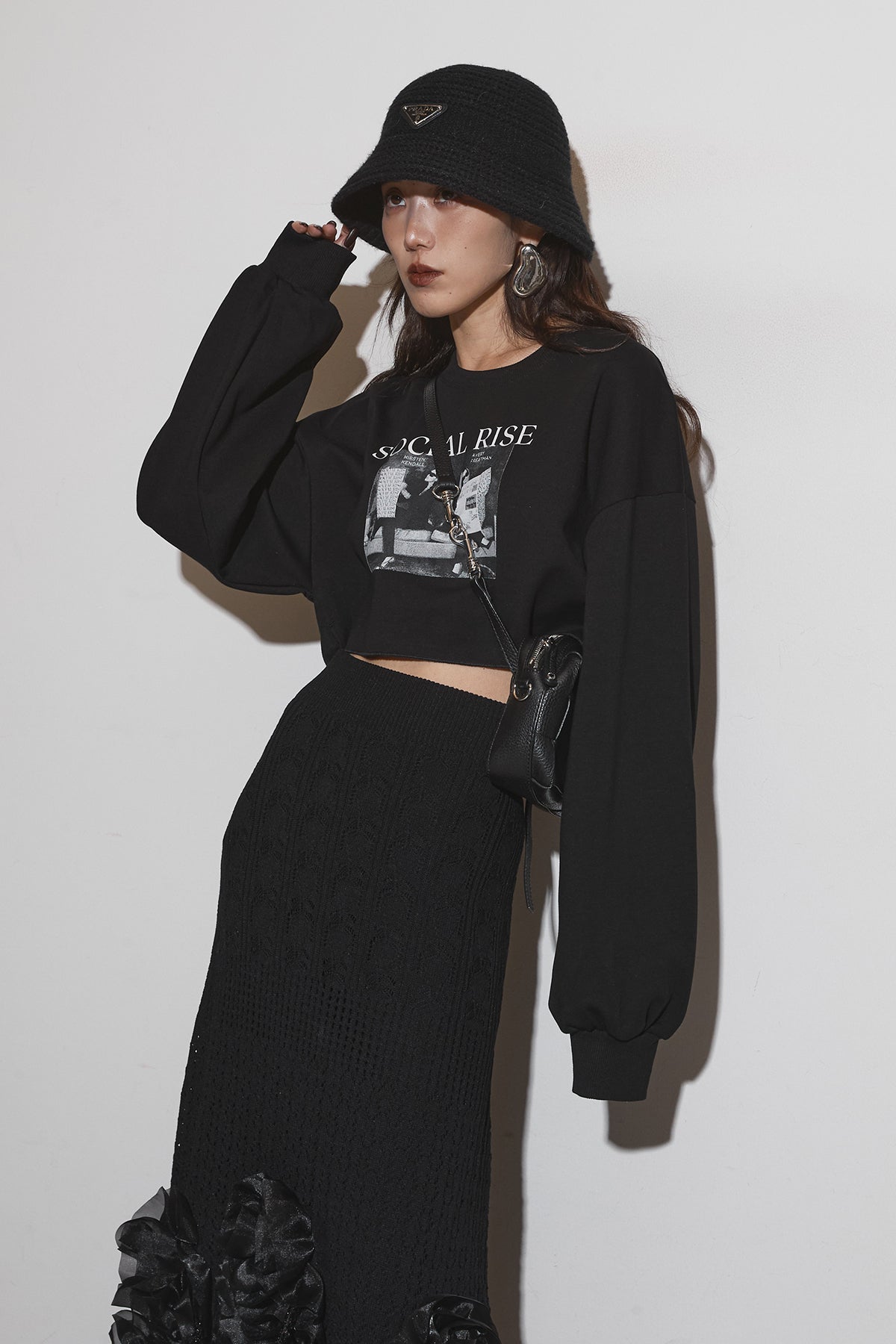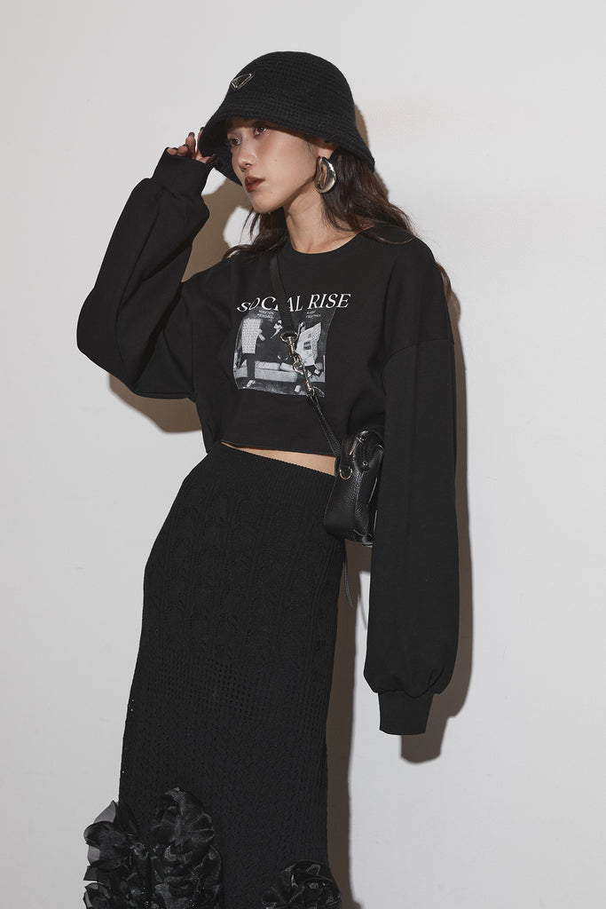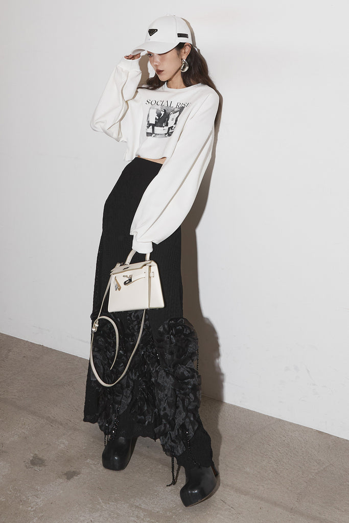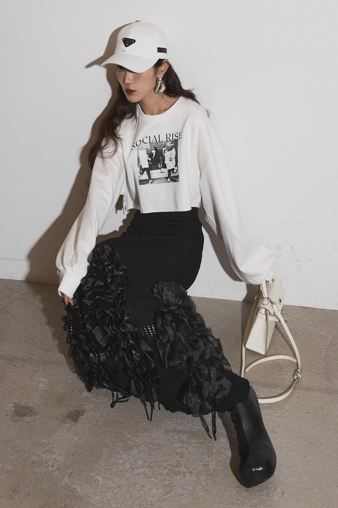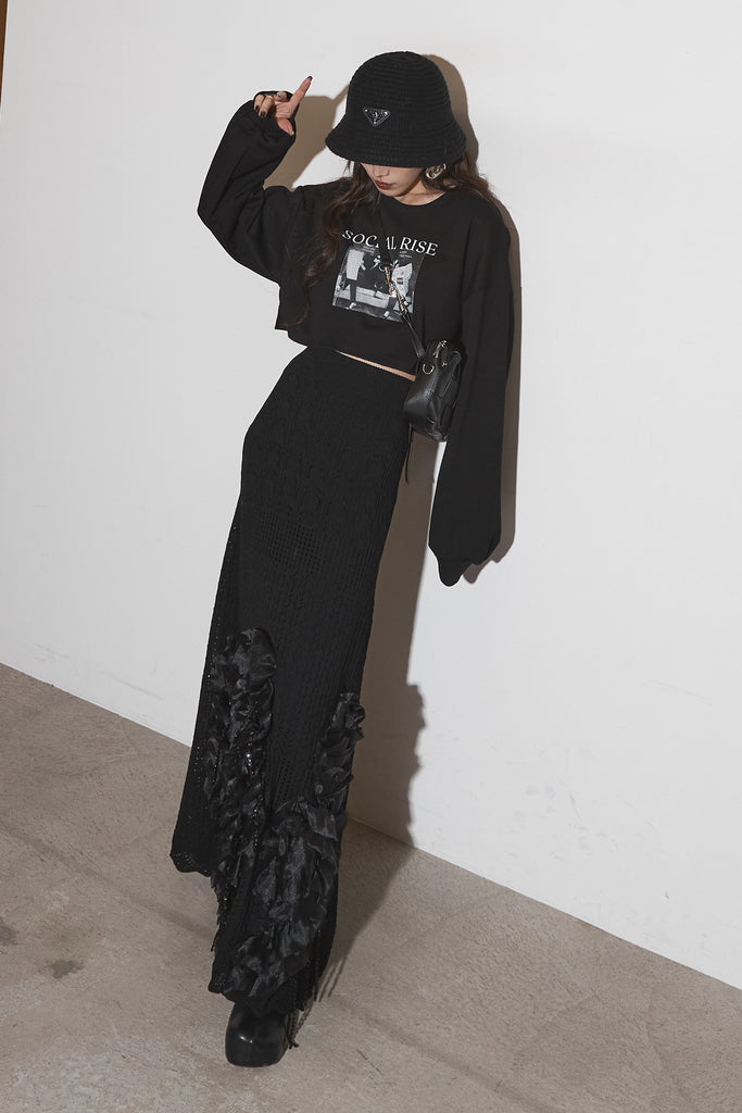 【SET】クロップドプリントプルオーバー+フラワービジューニットスカート