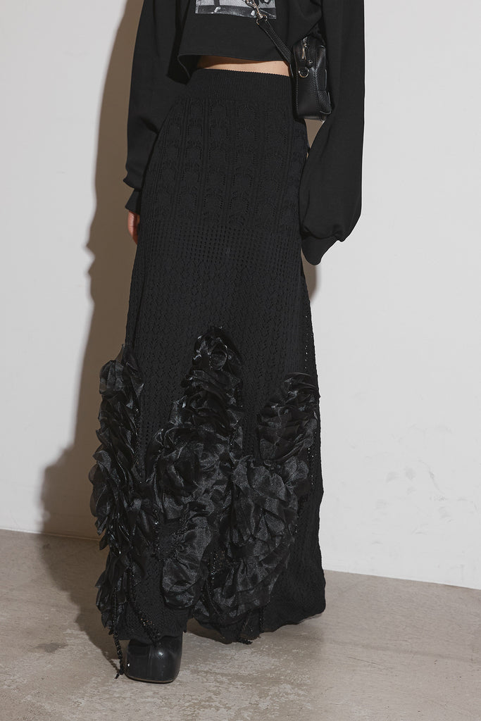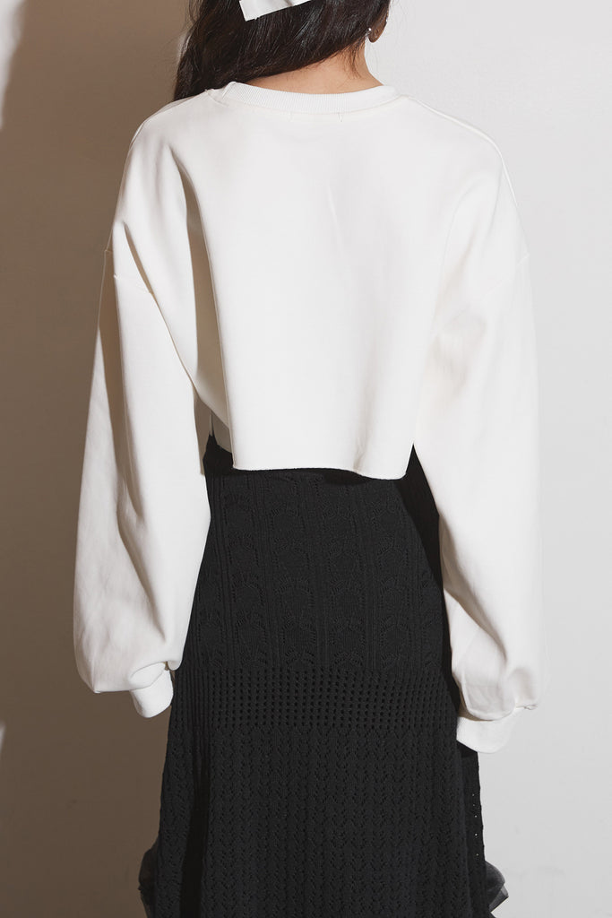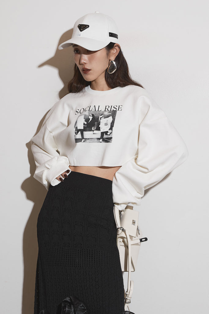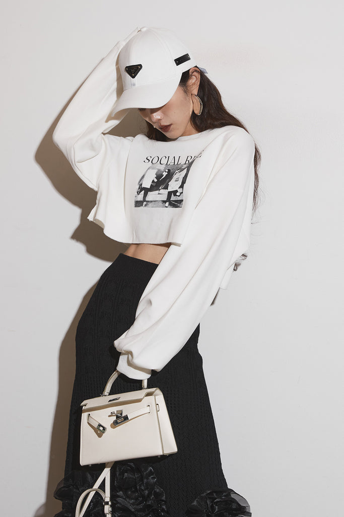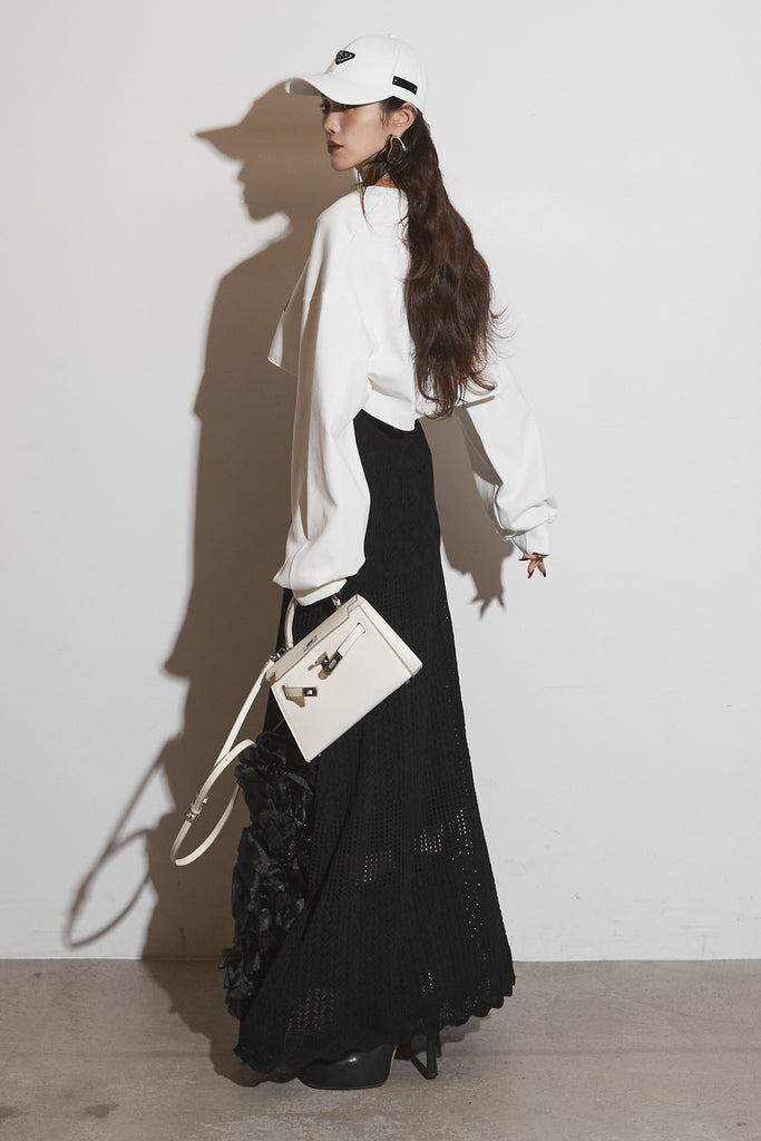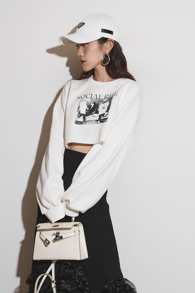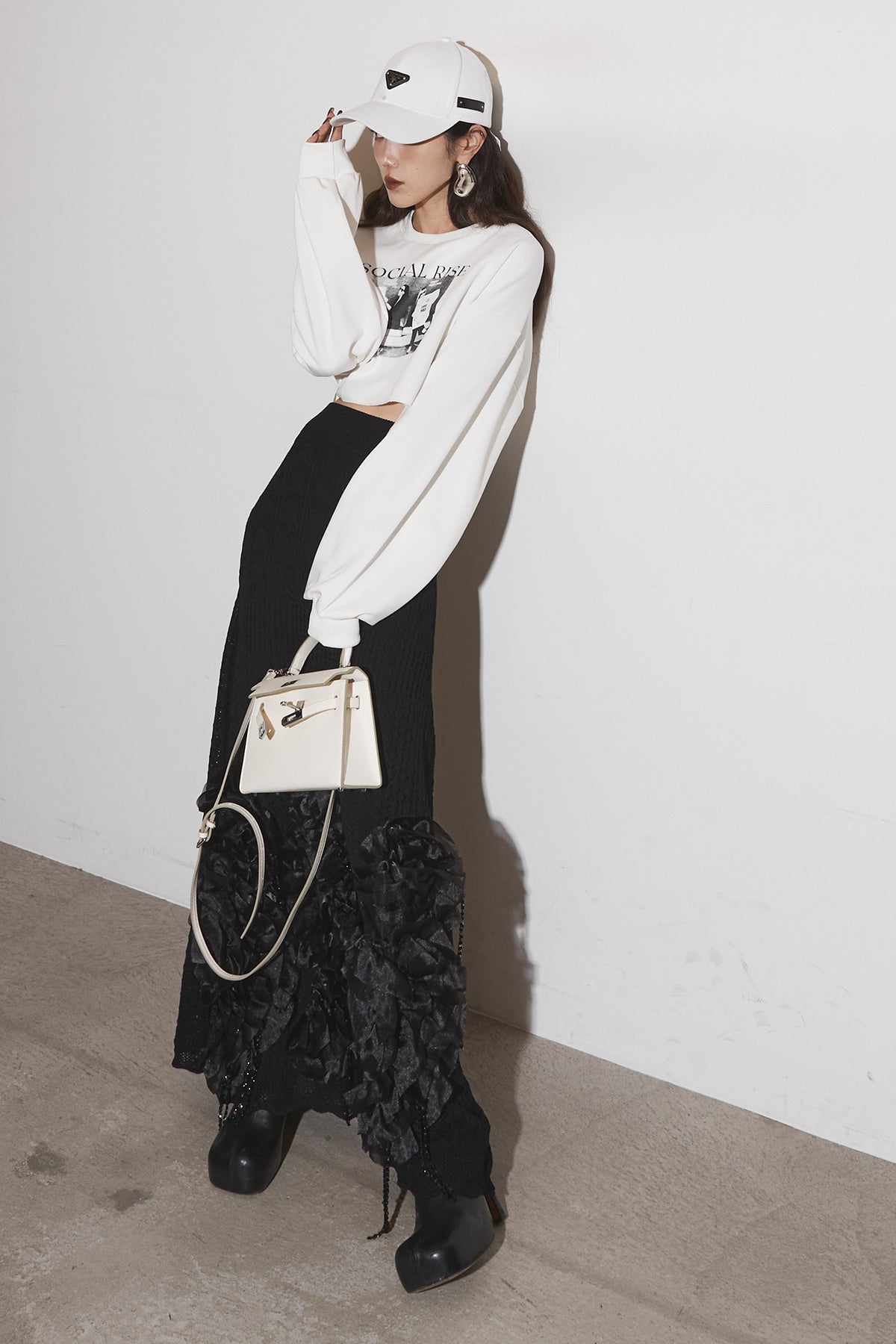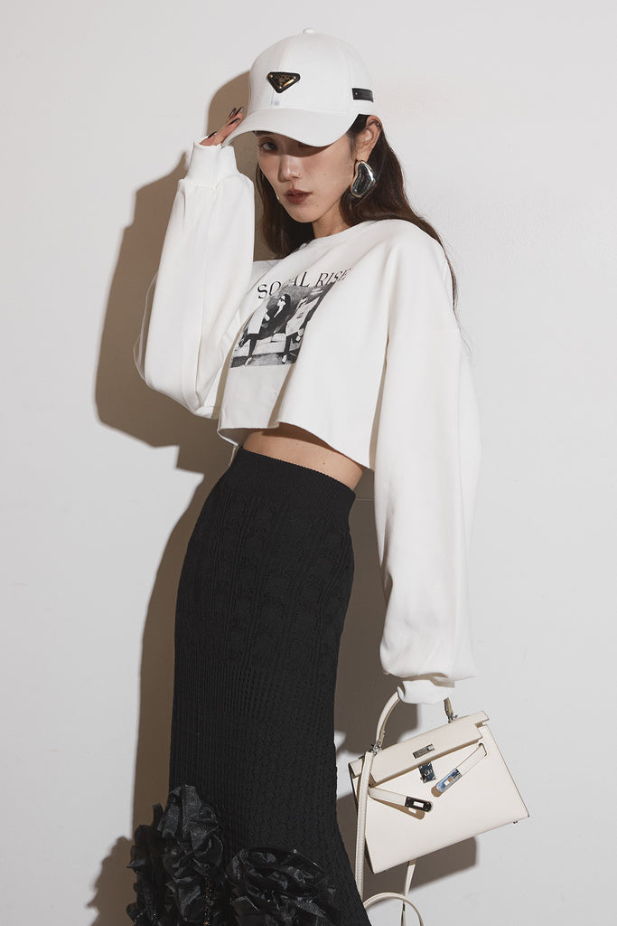 【SET】クロップドプリントプルオーバー+フラワービジューニットスカート