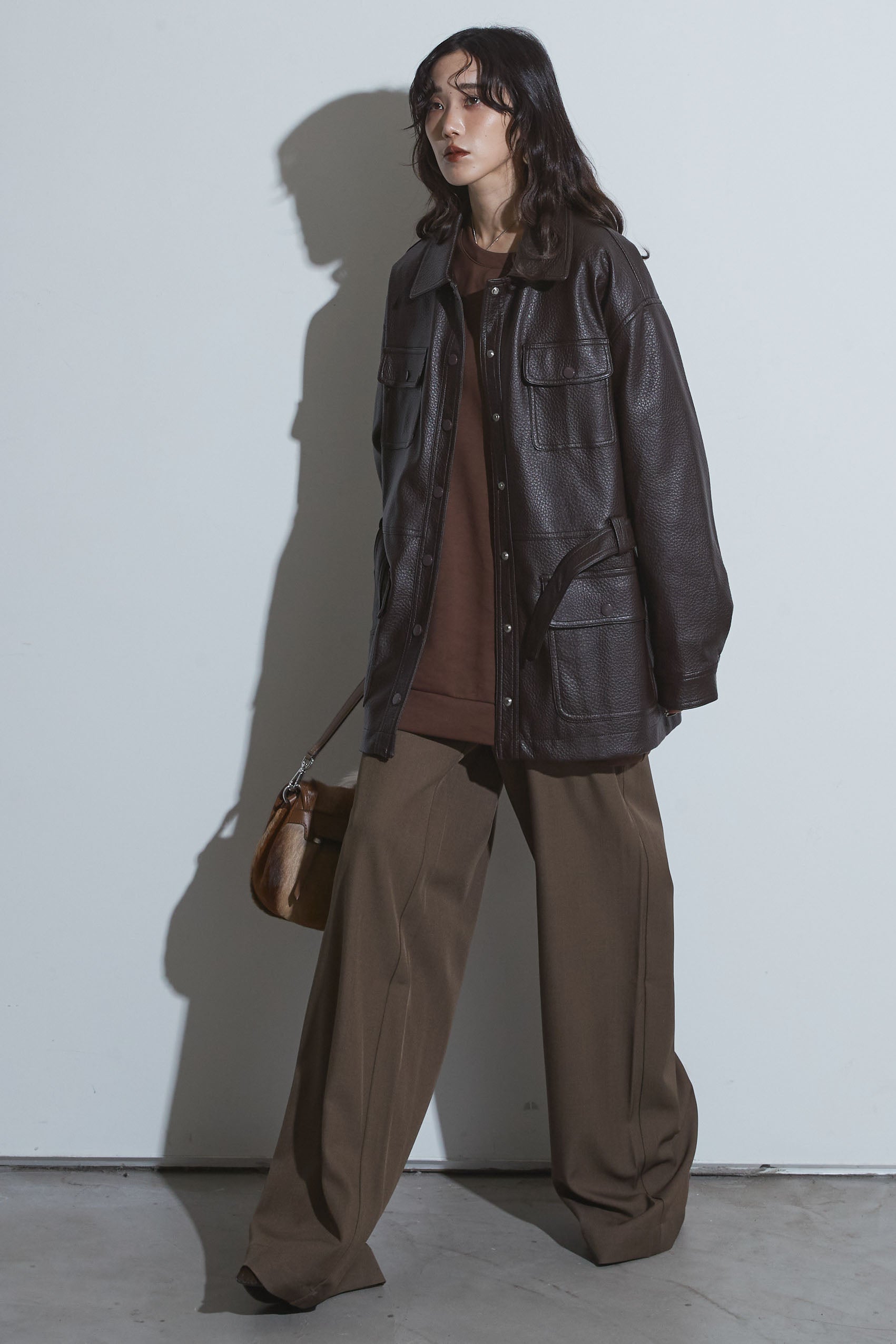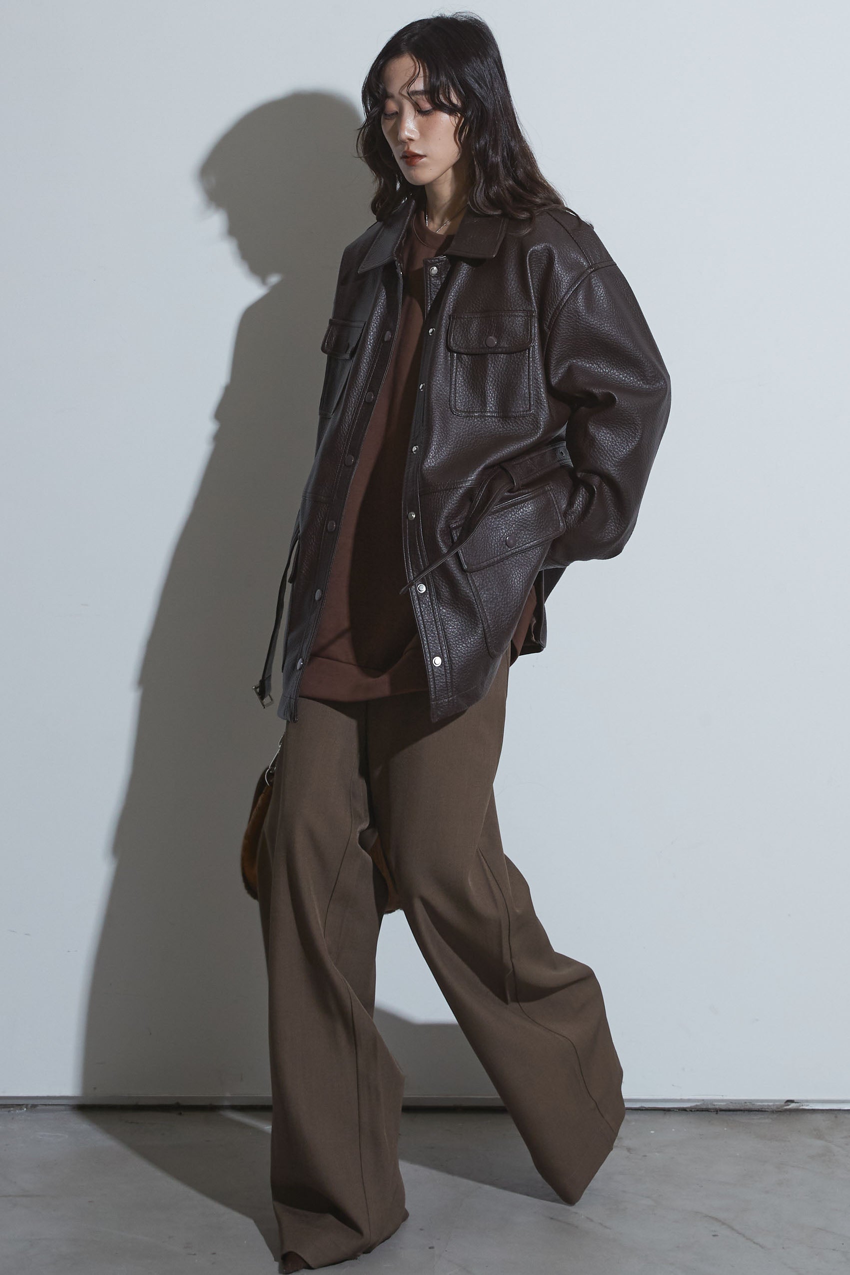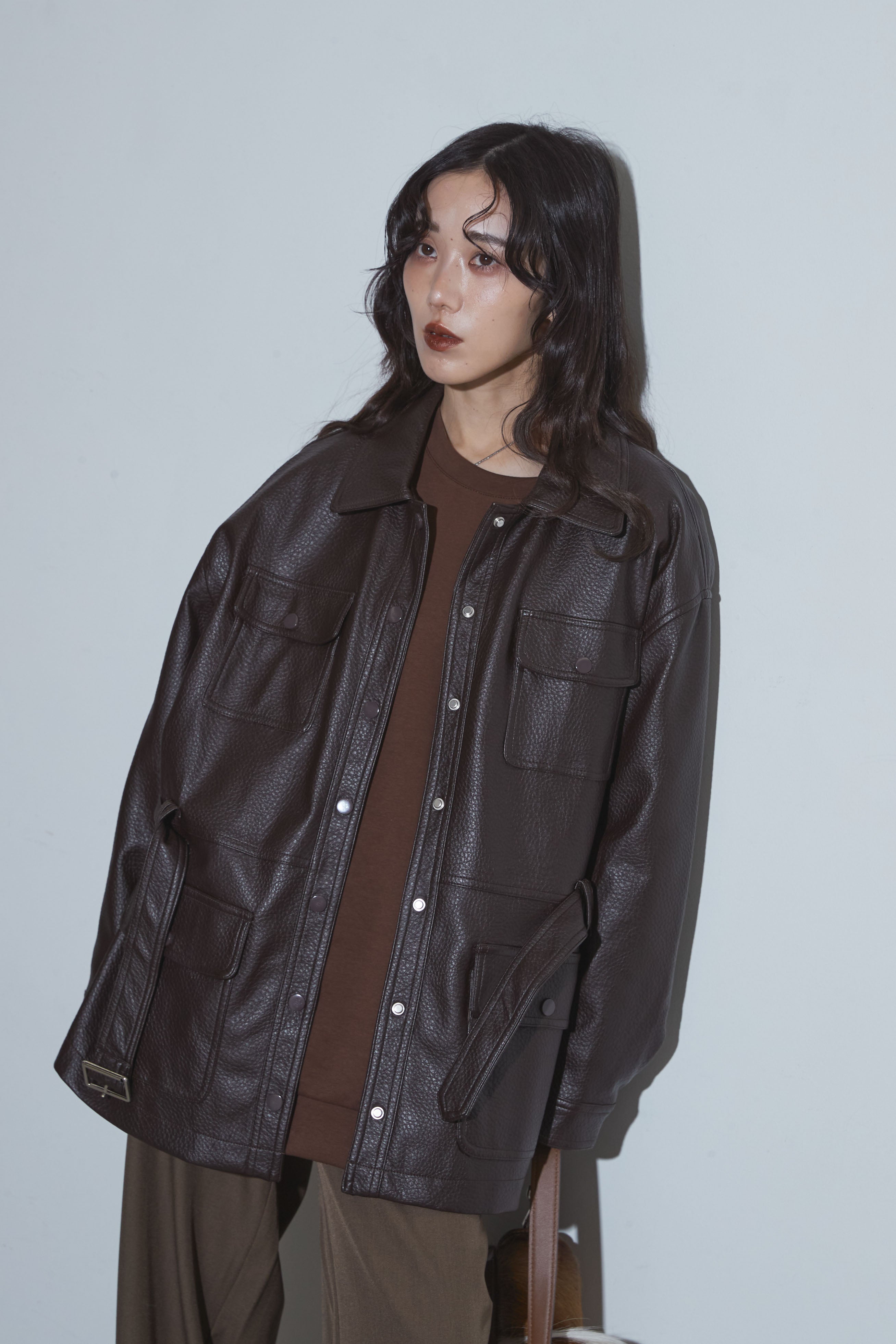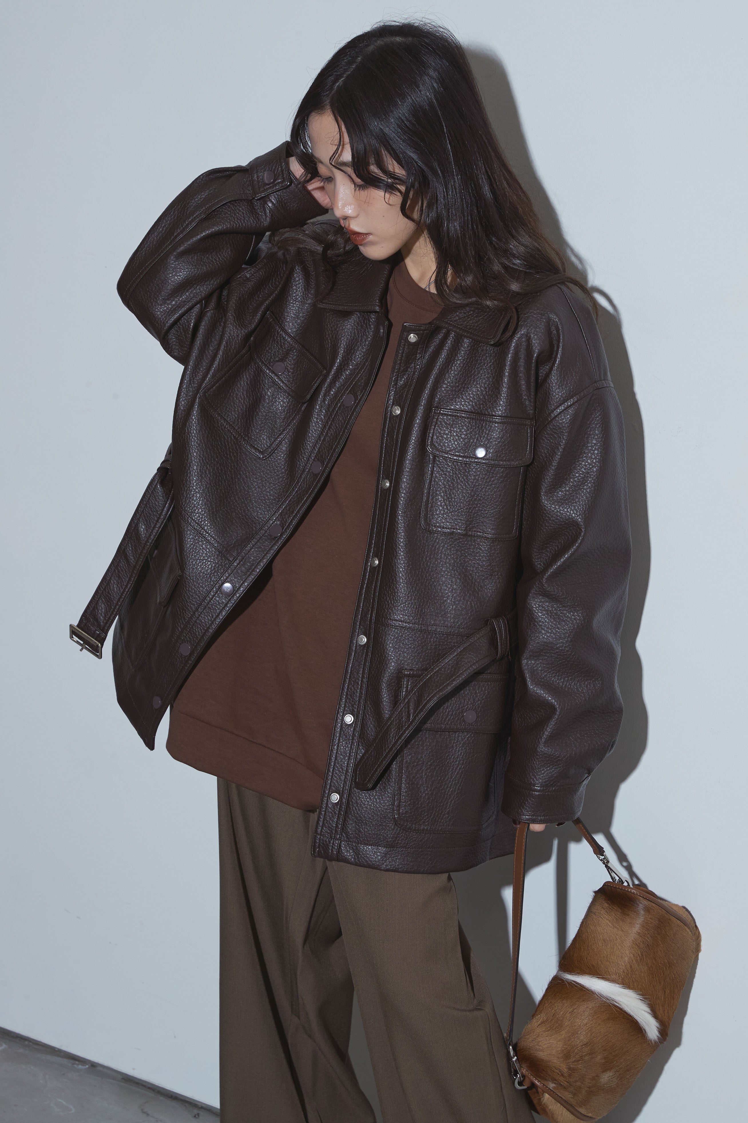 【SET】ベルテッドレザージャケット+ビジュープルオーバー+スラックス