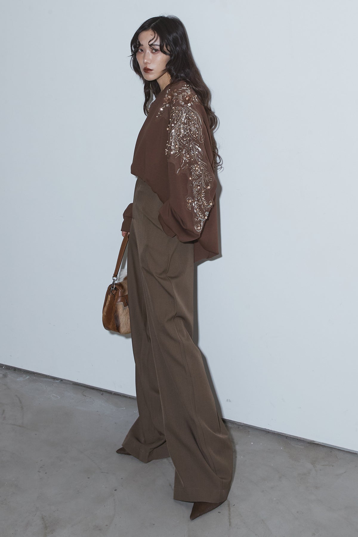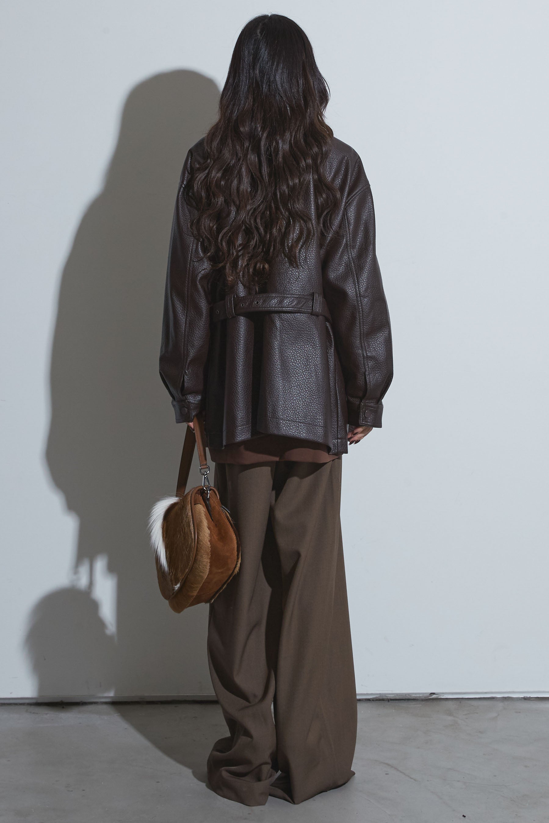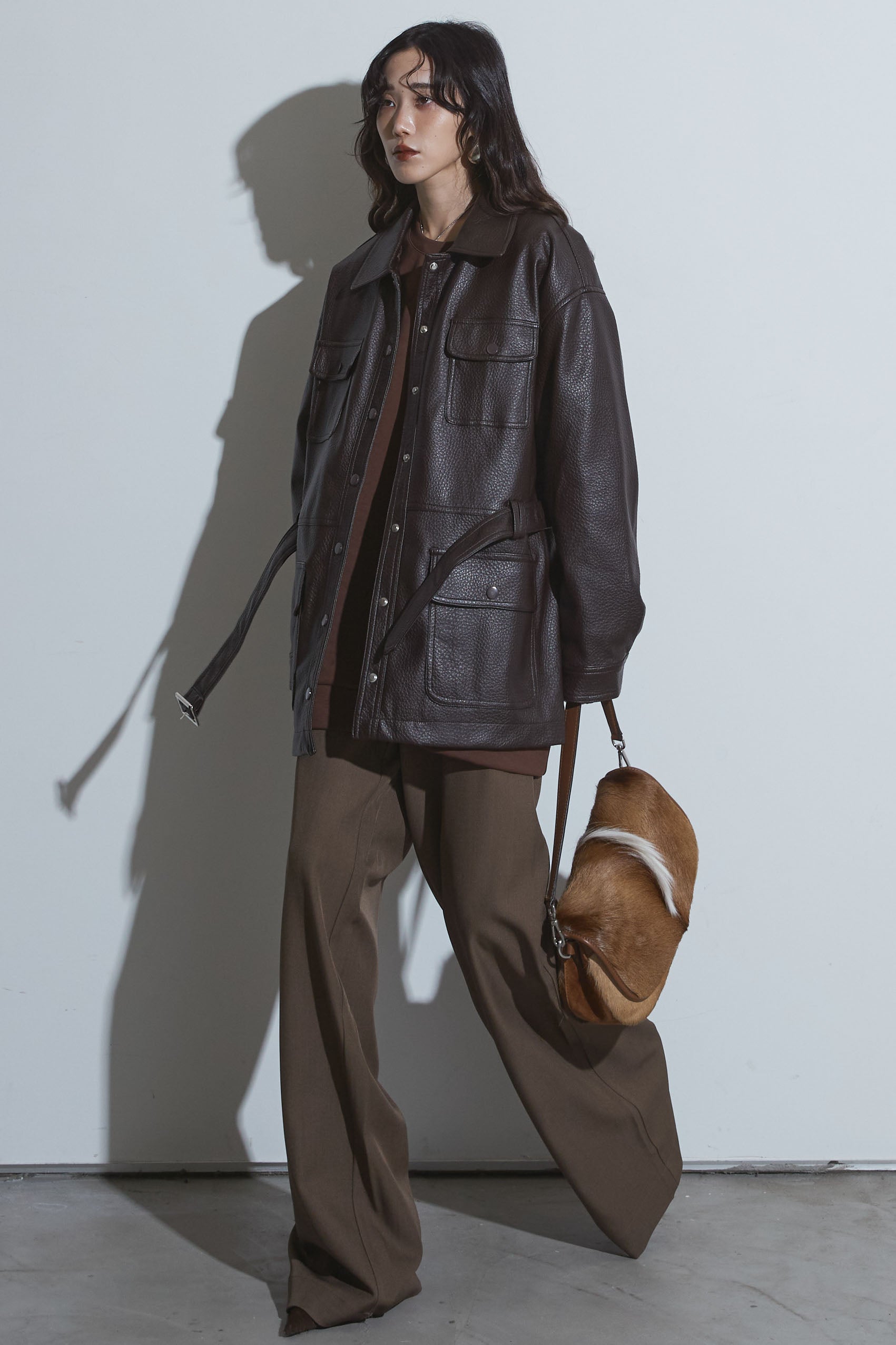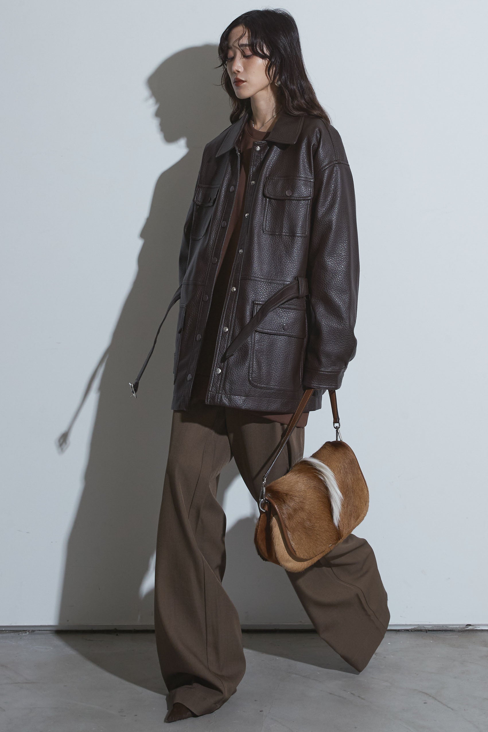 【SET】ベルテッドレザージャケット+ビジュープルオーバー+スラックス