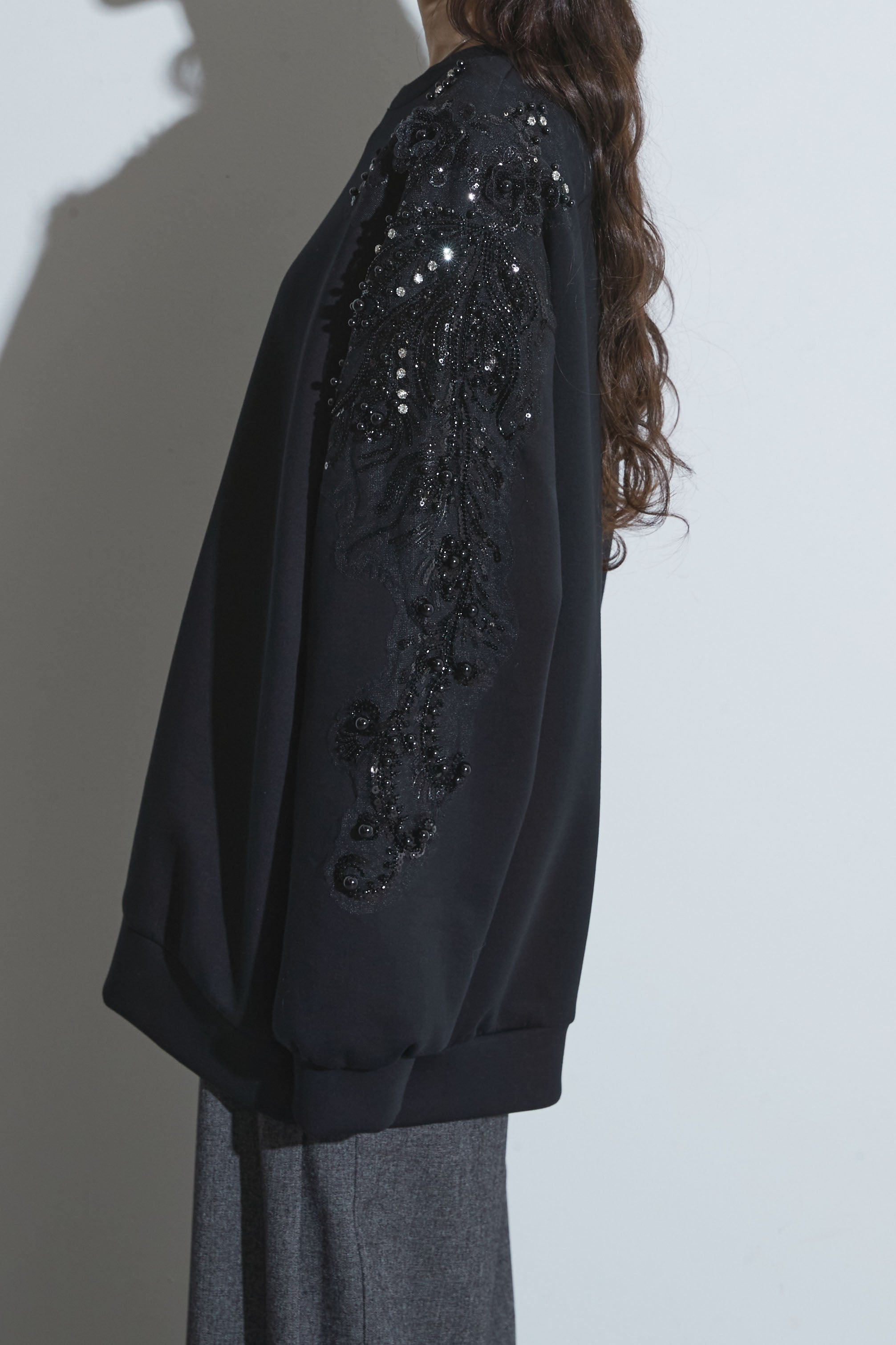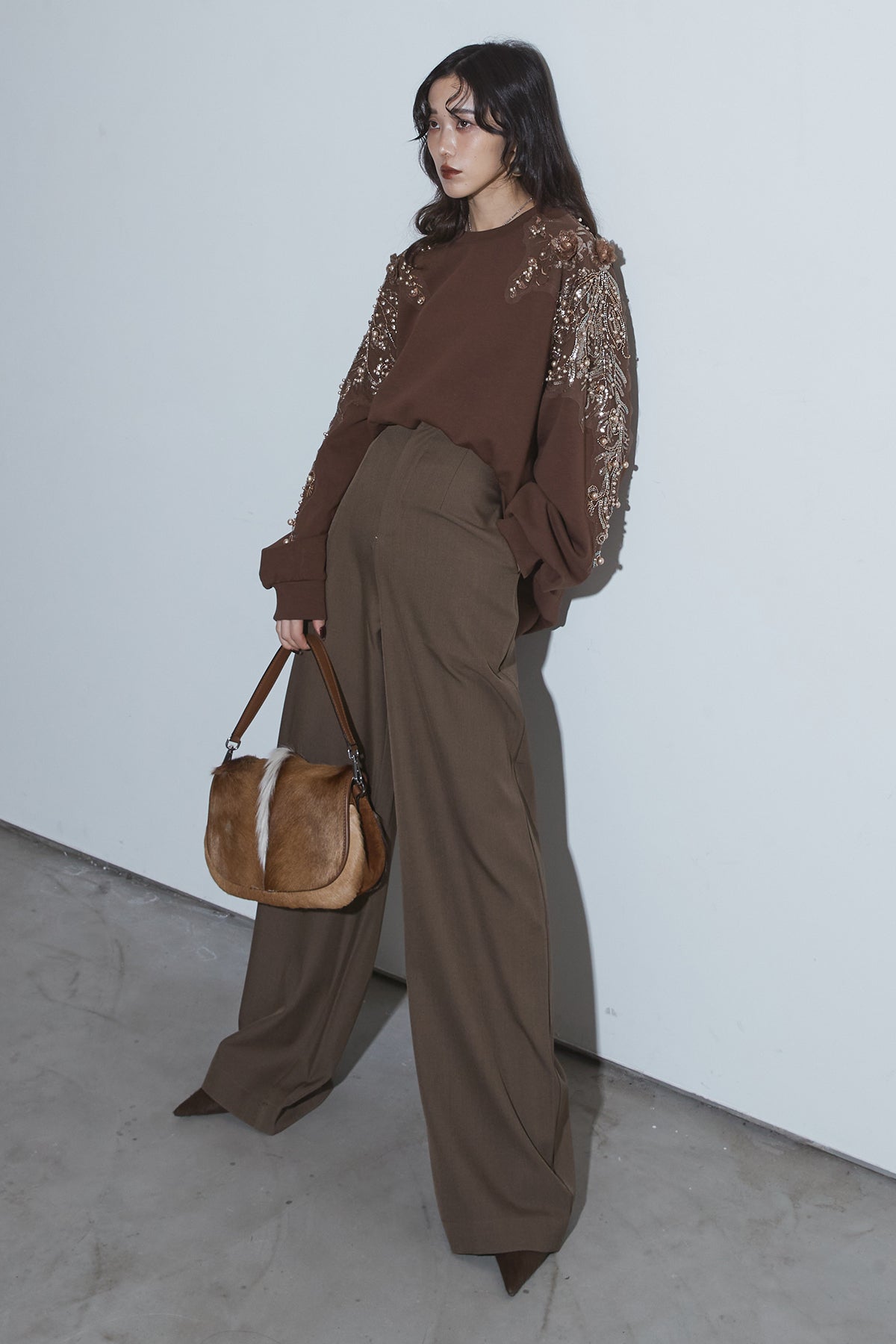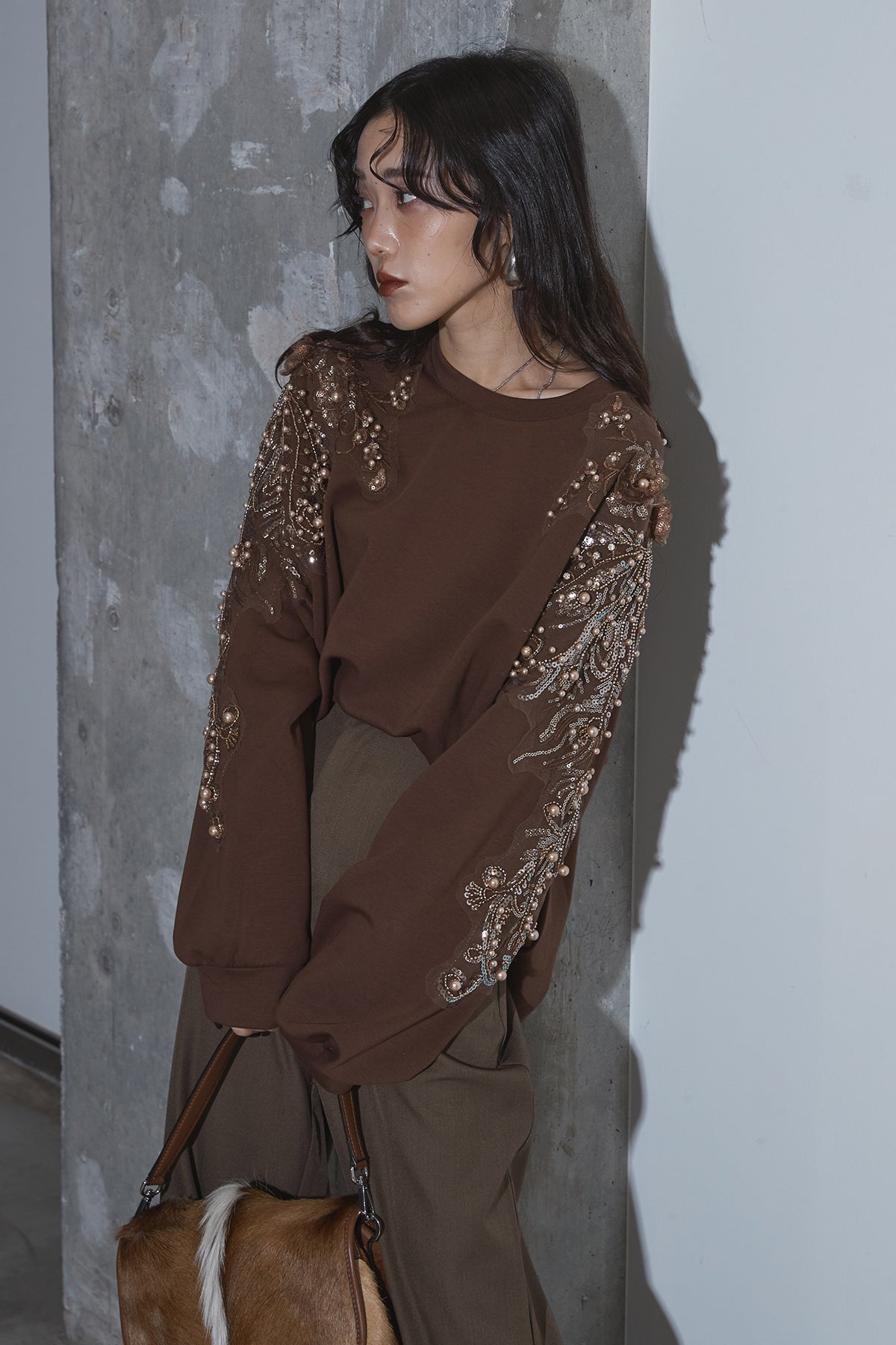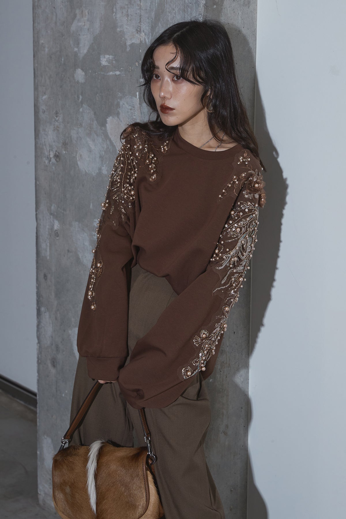 【SET】ベルテッドレザージャケット+ビジュープルオーバー+スラックス