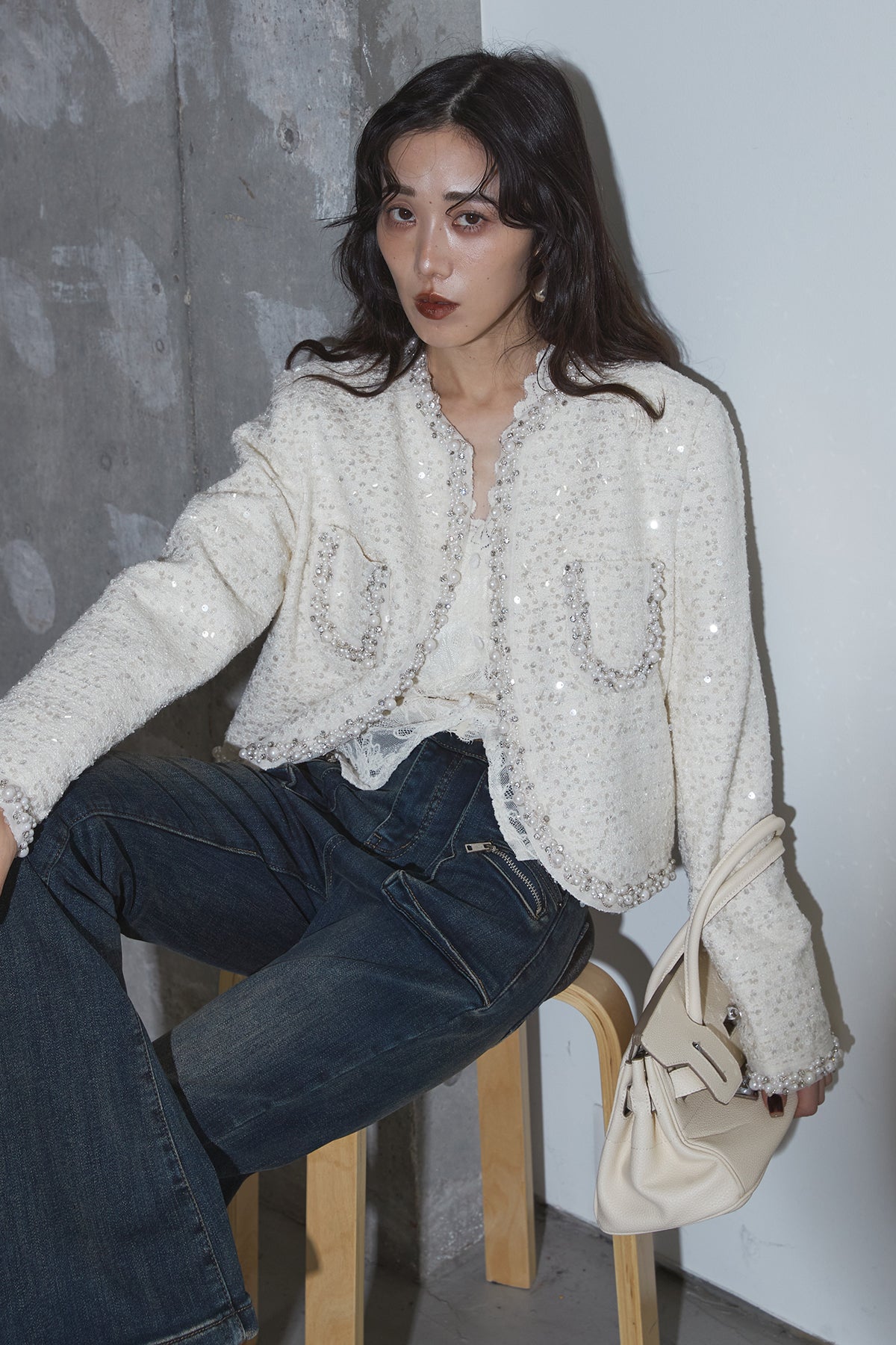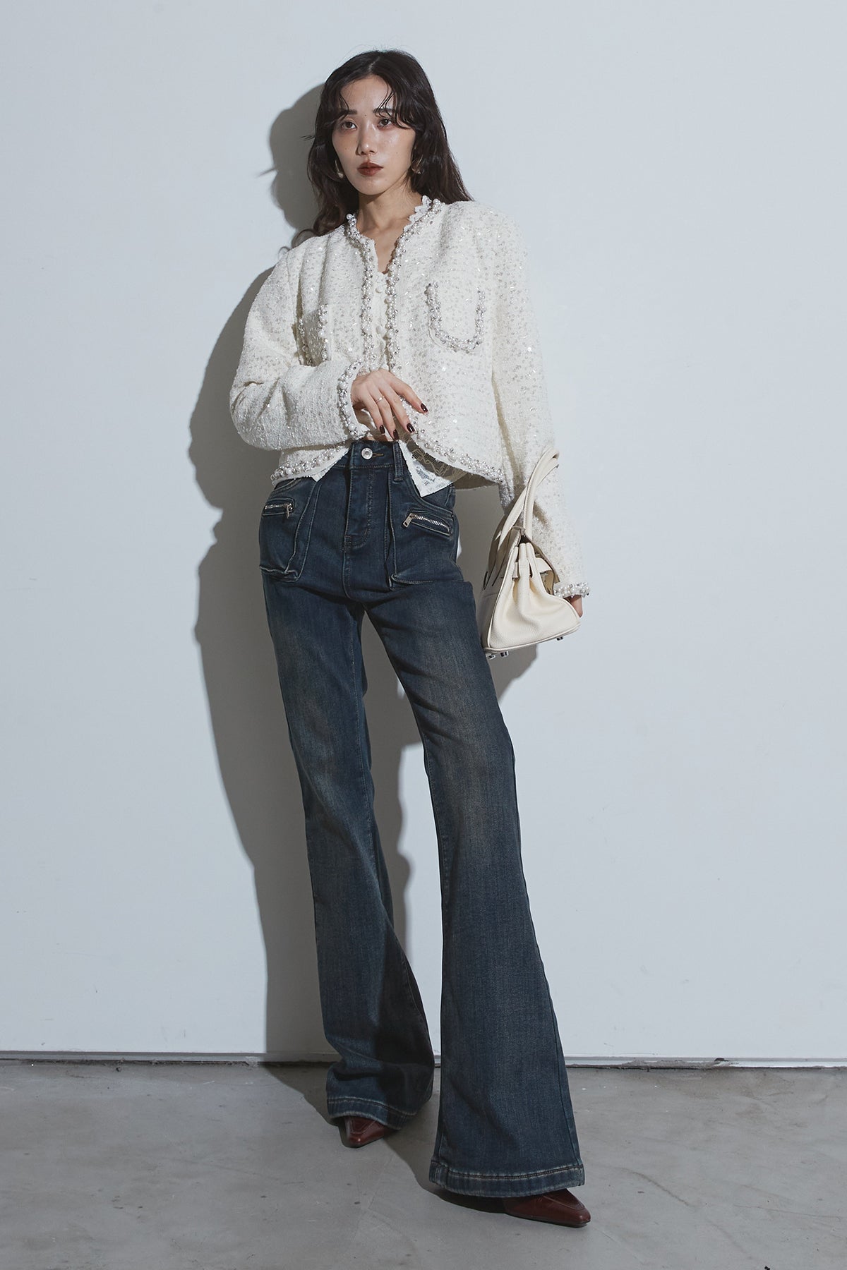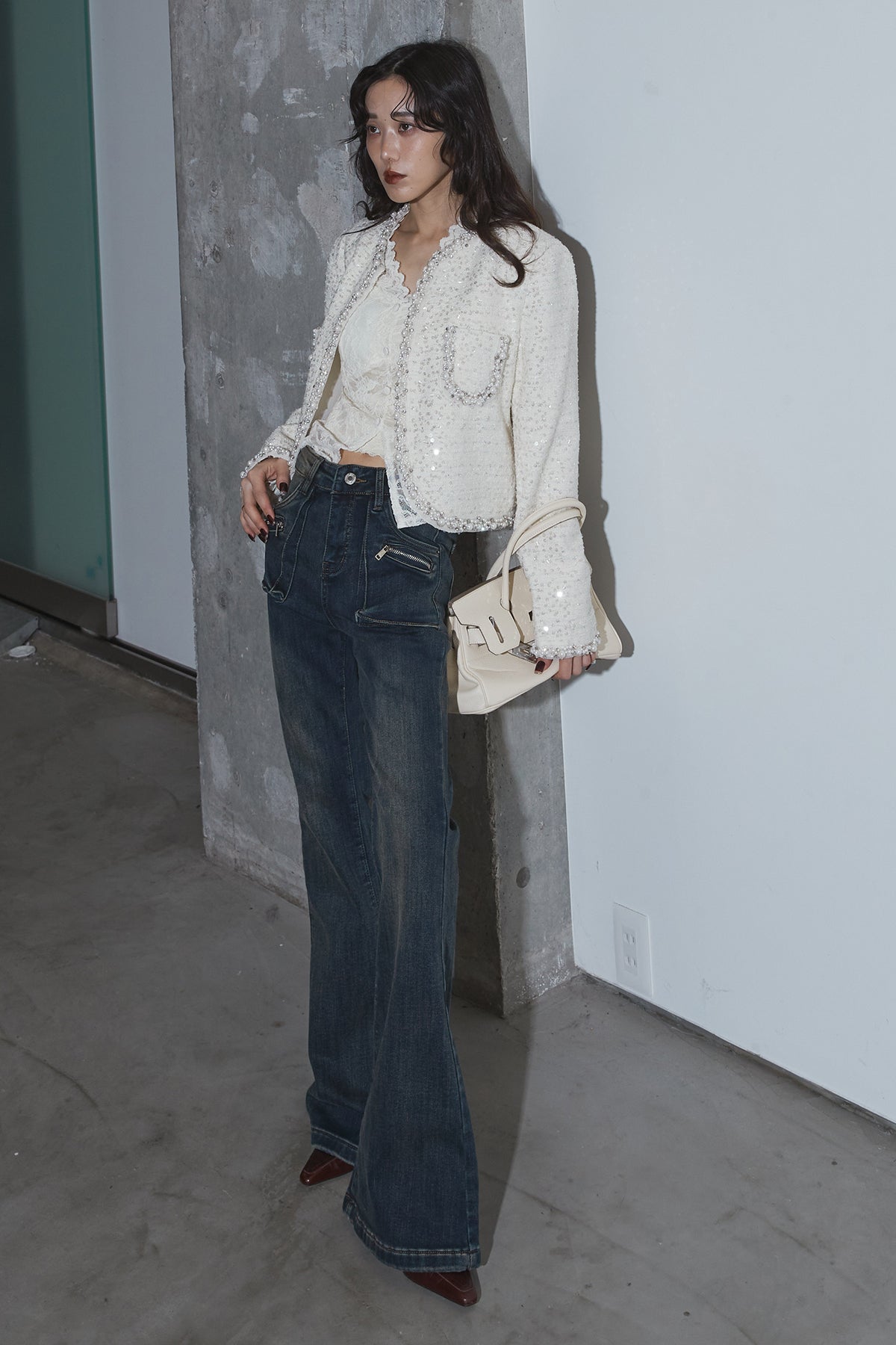 【SET】パールツイードジャケット+ZIPポケットフレアデニム