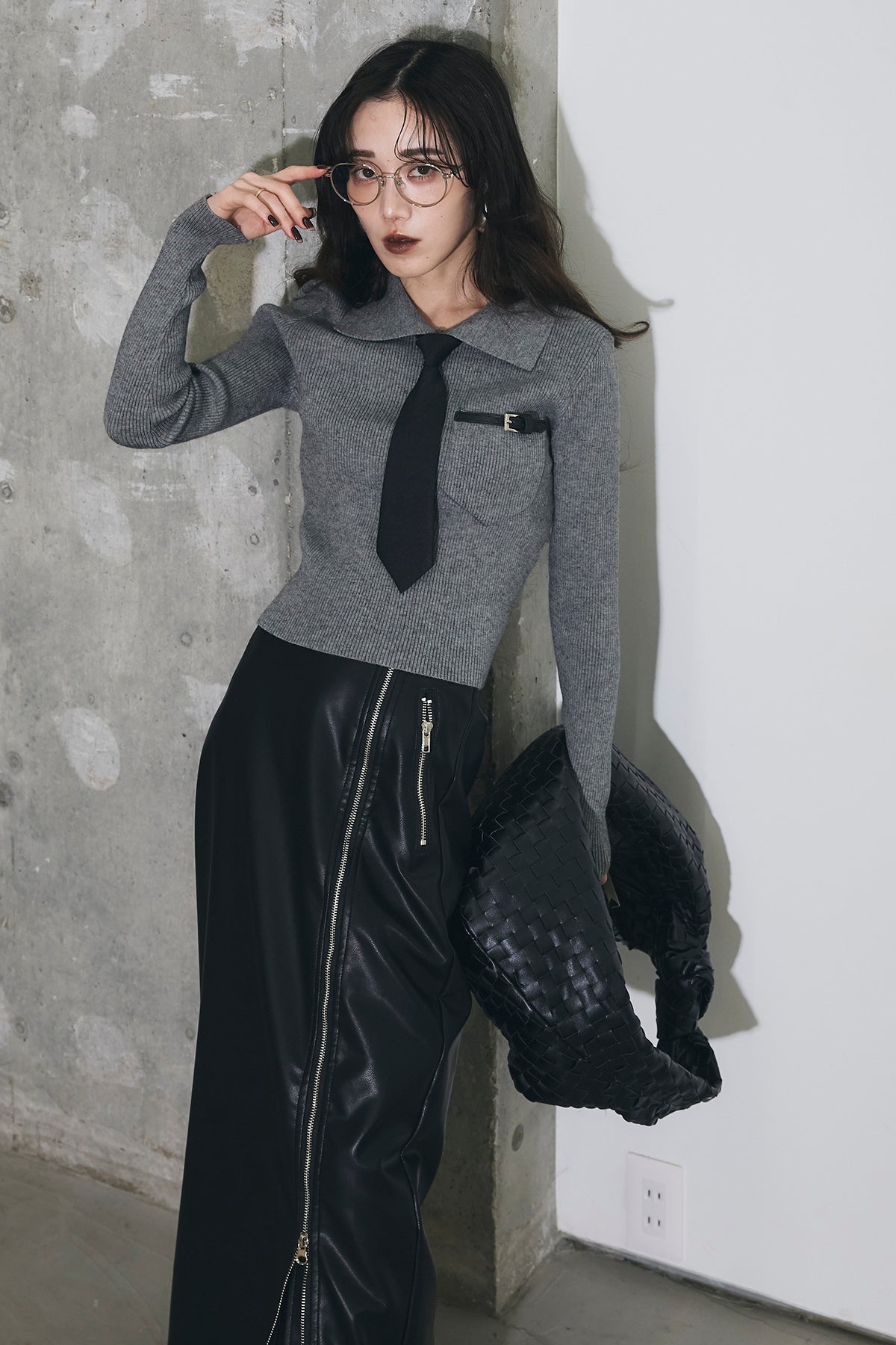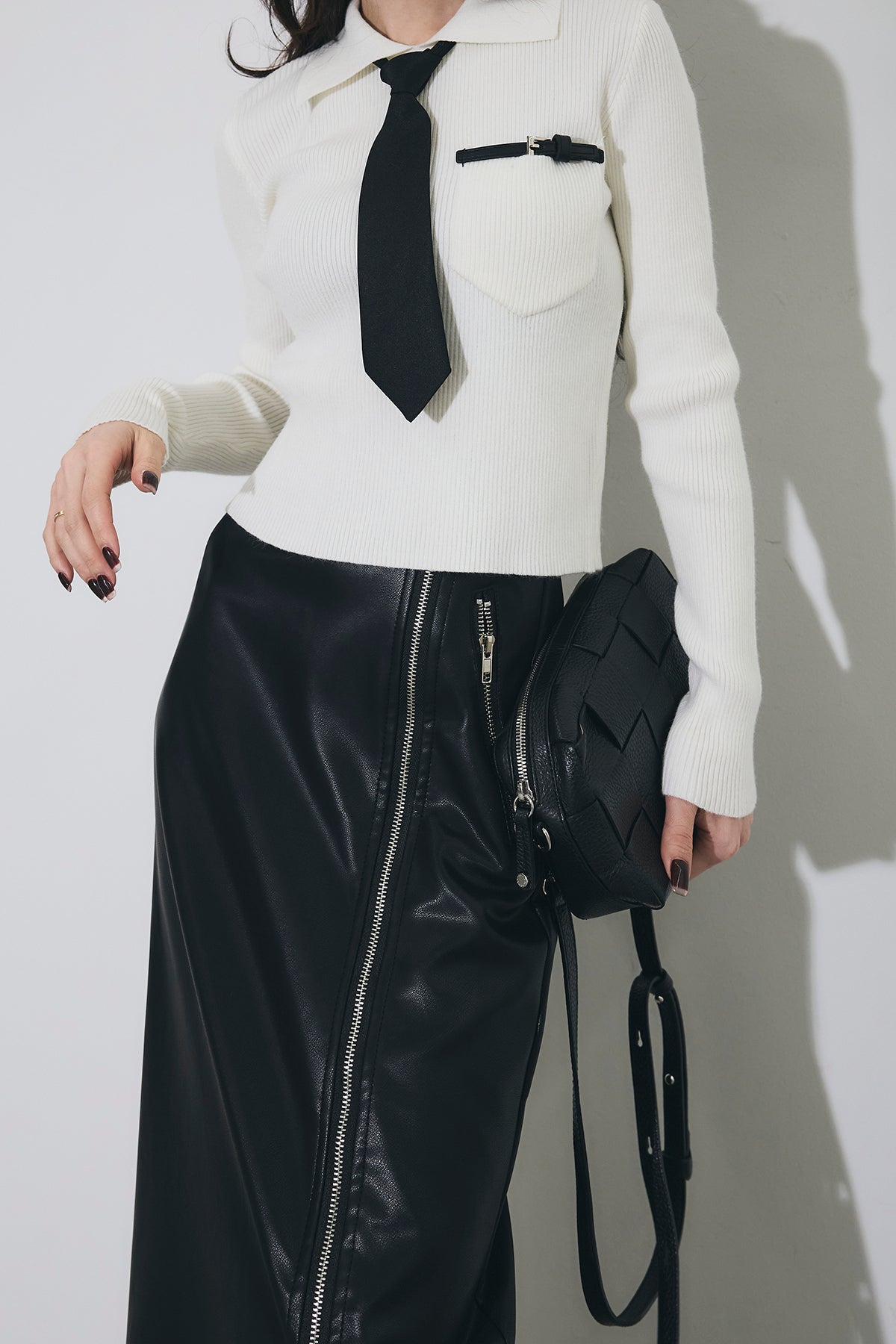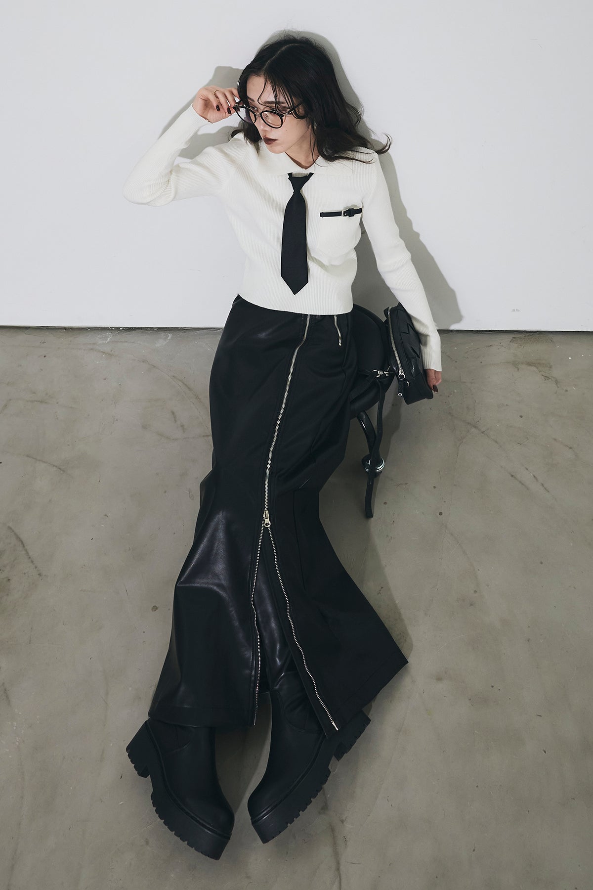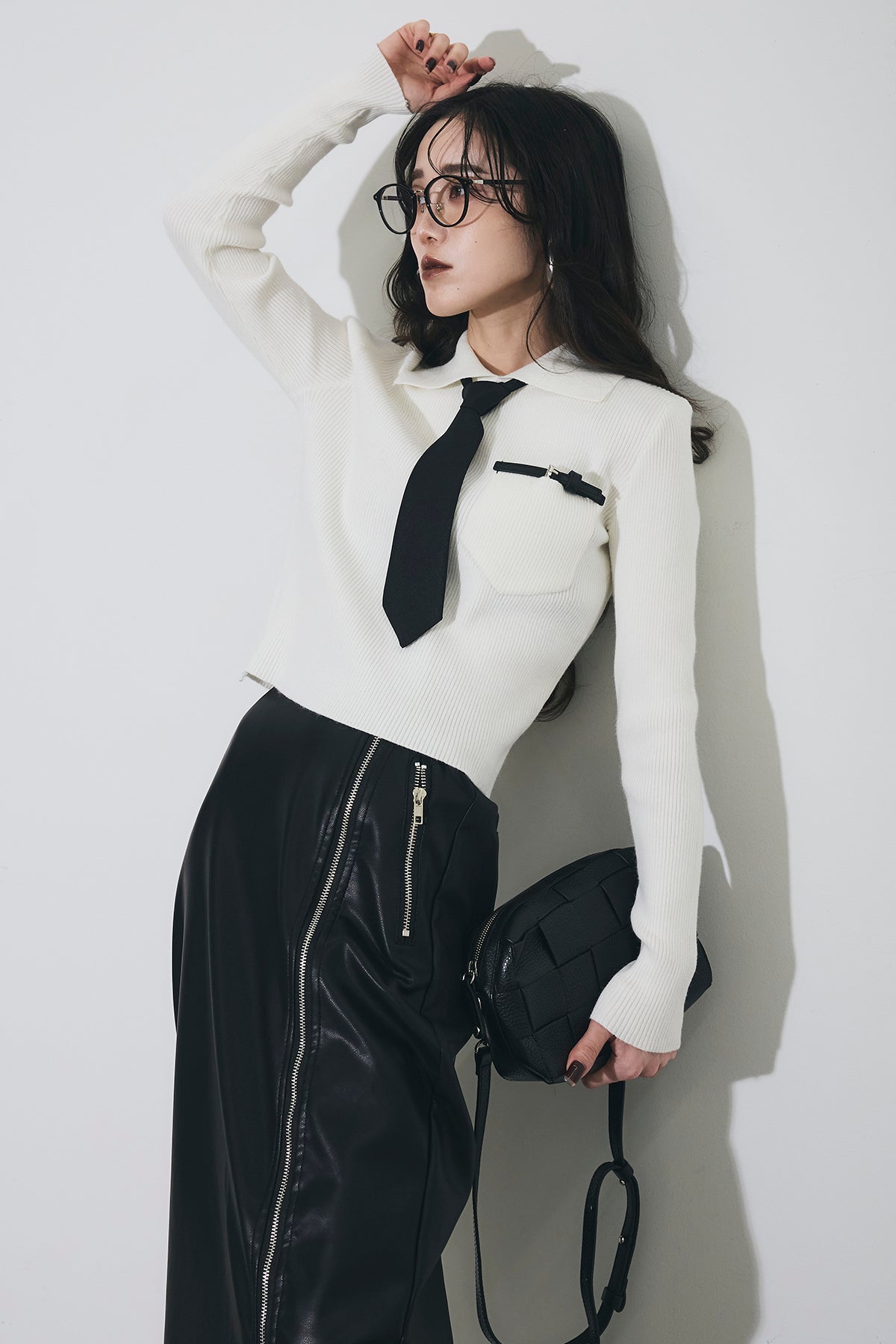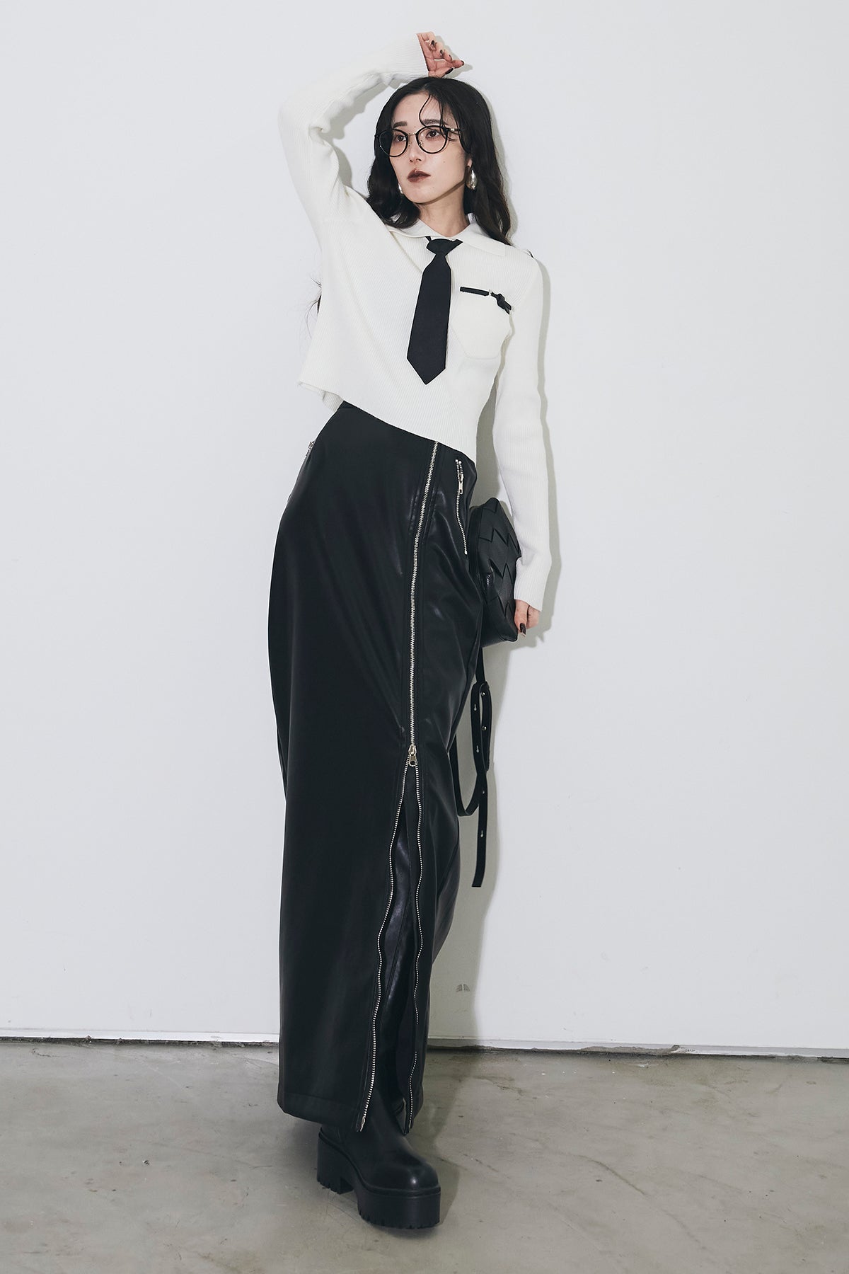 【SET】ネクタイ付きニット+ZIPレザースカート