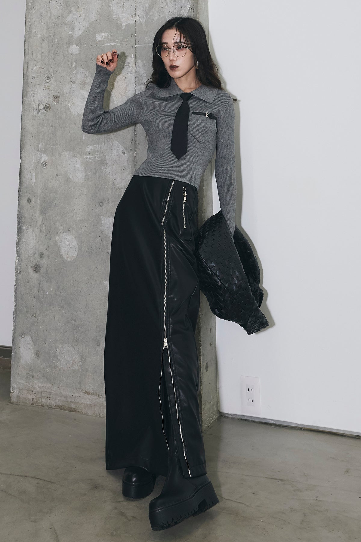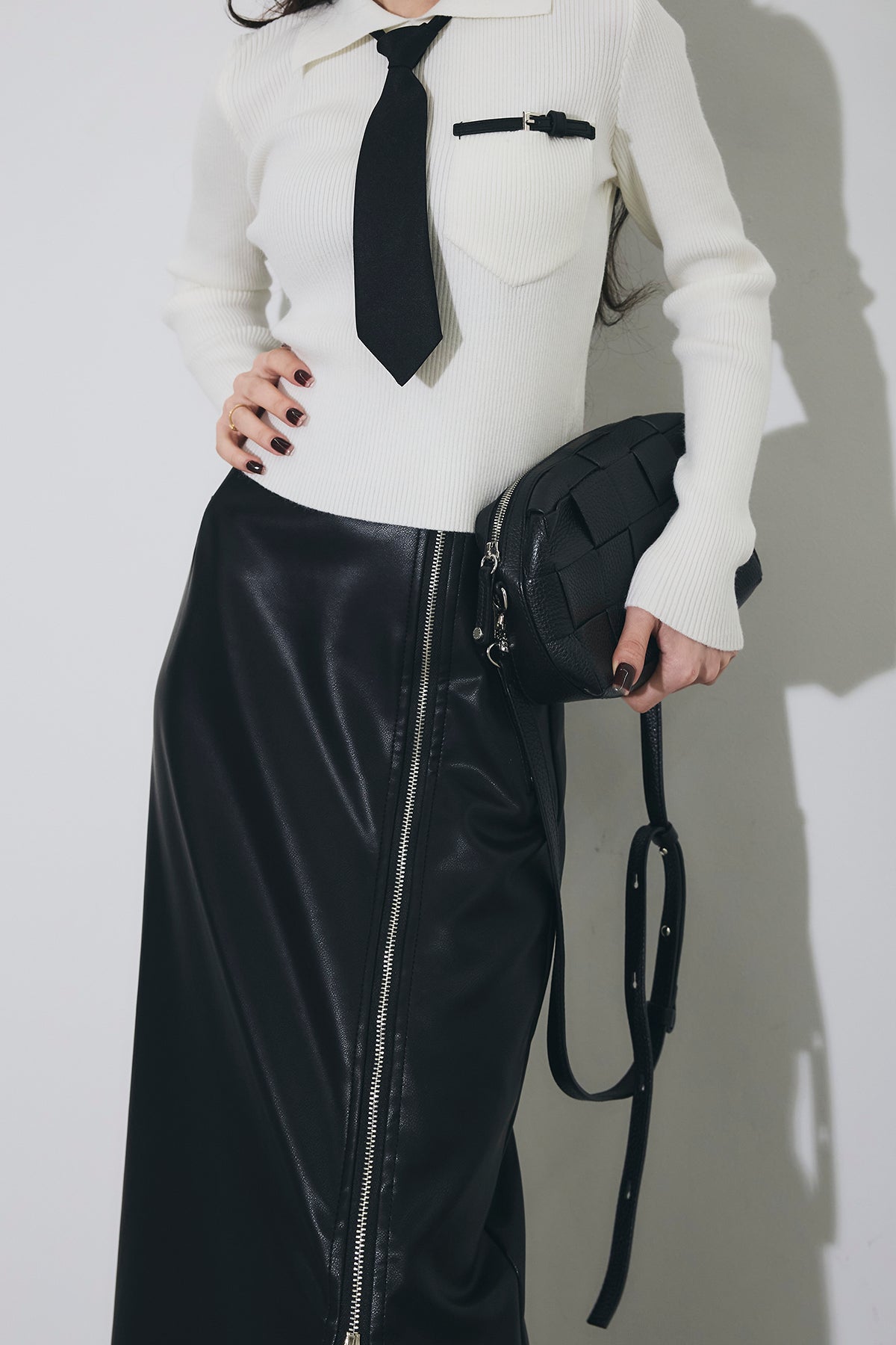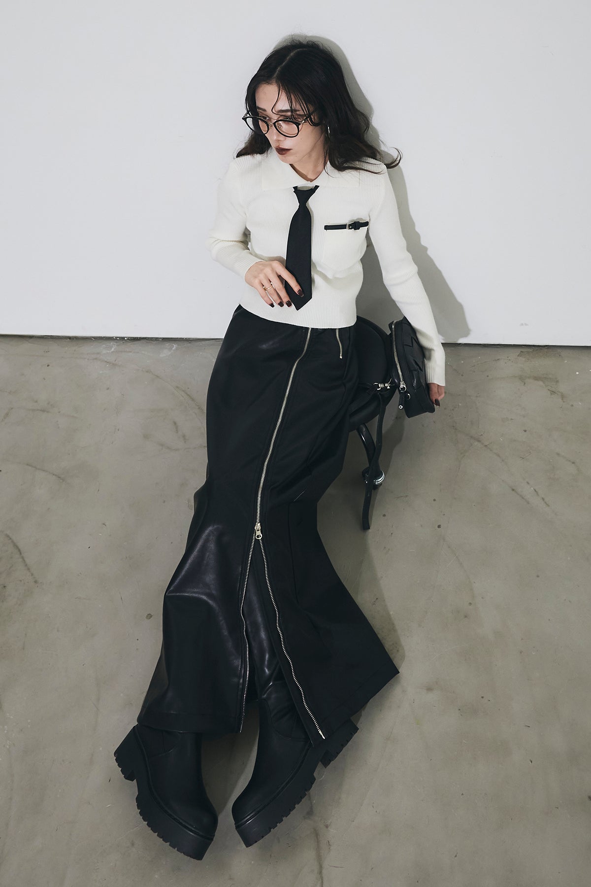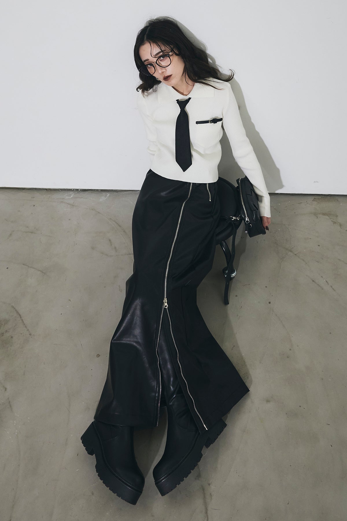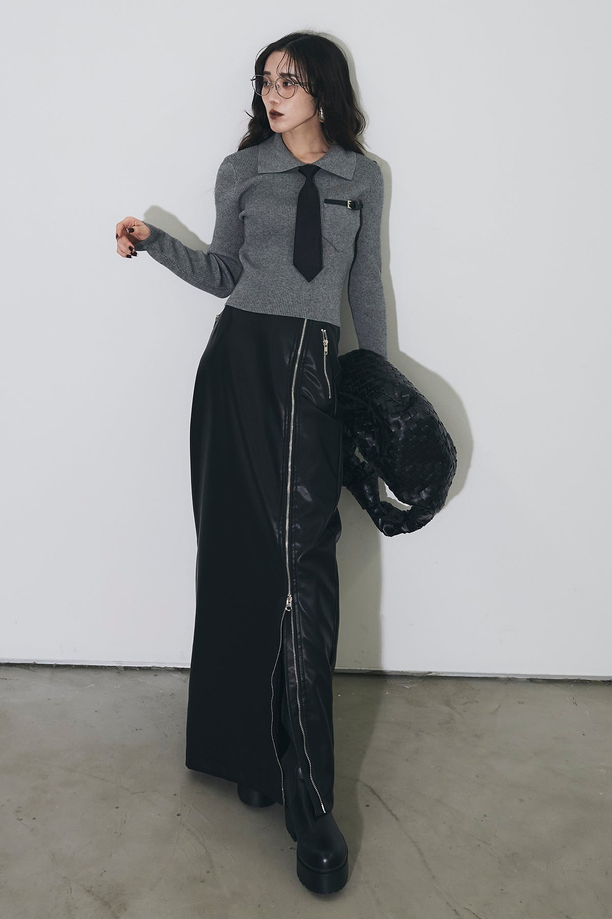 【SET】ネクタイ付きニット+ZIPレザースカート
