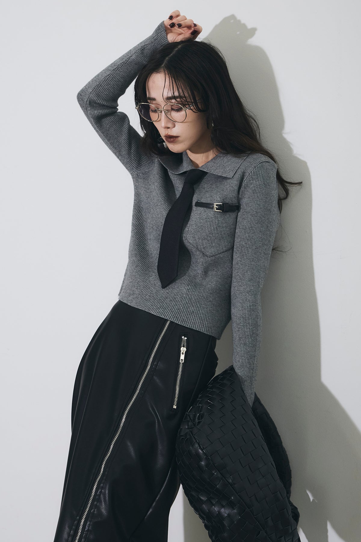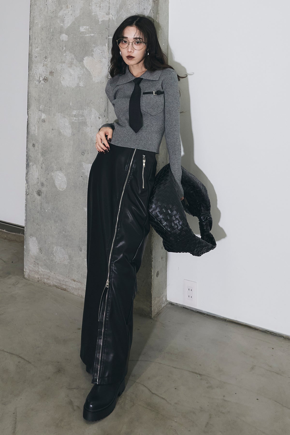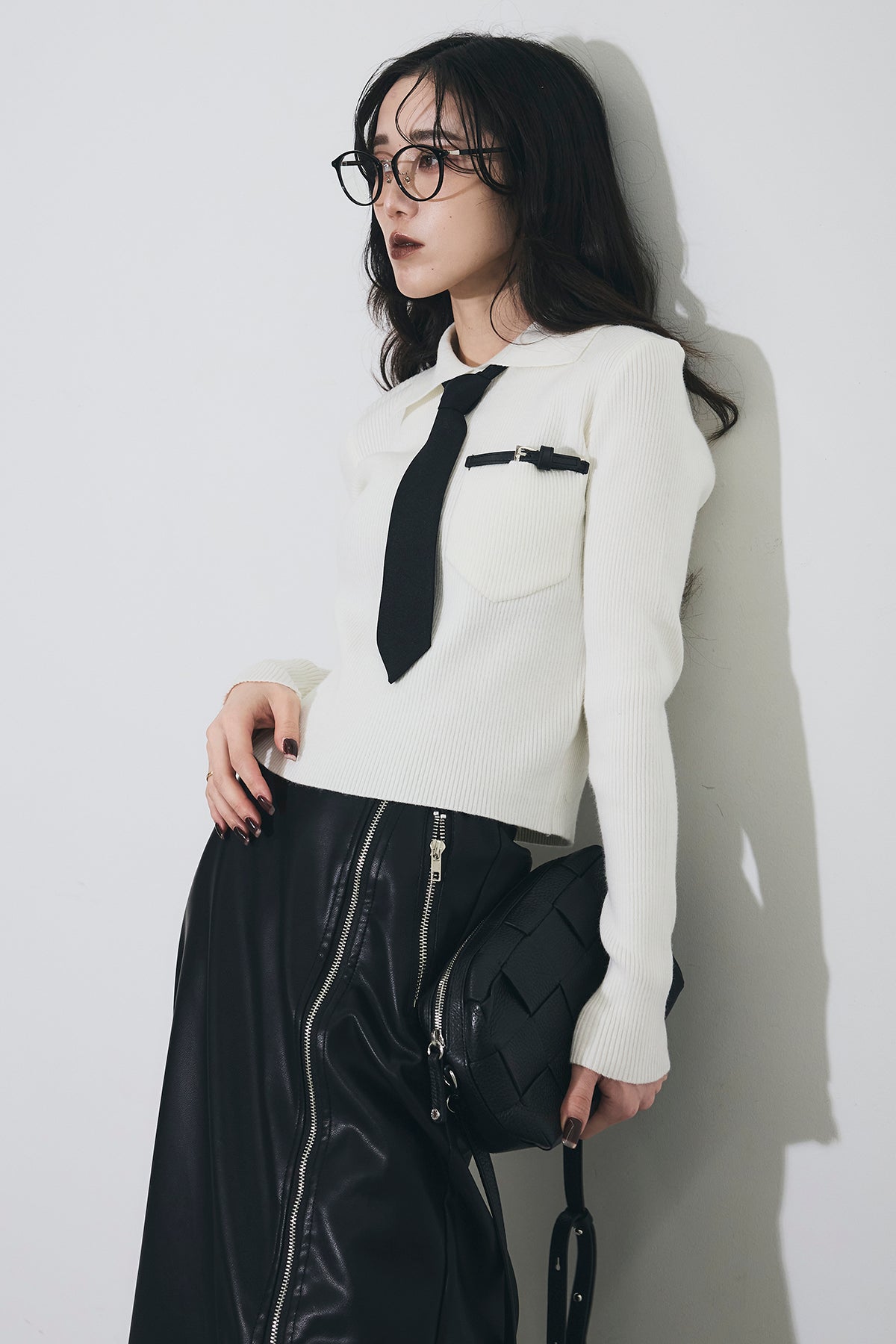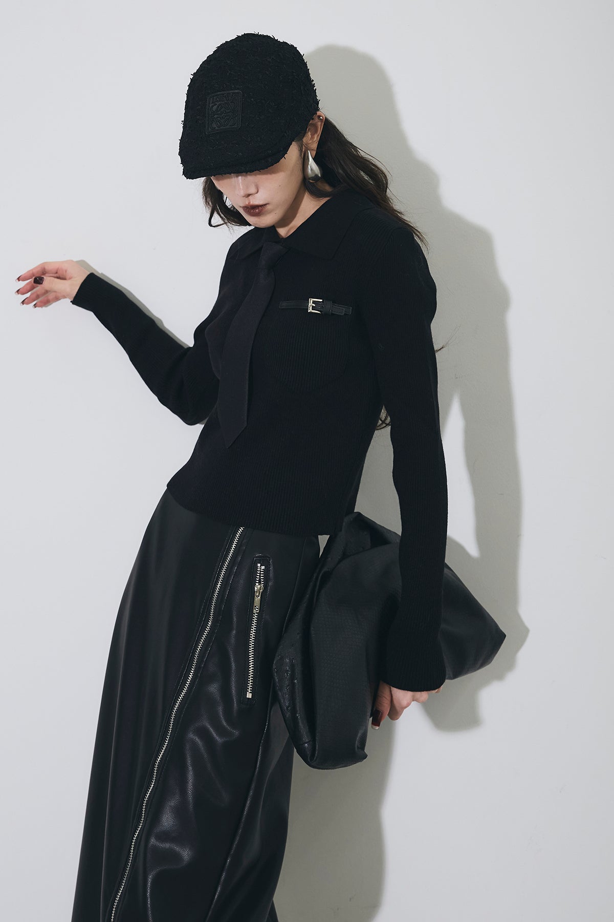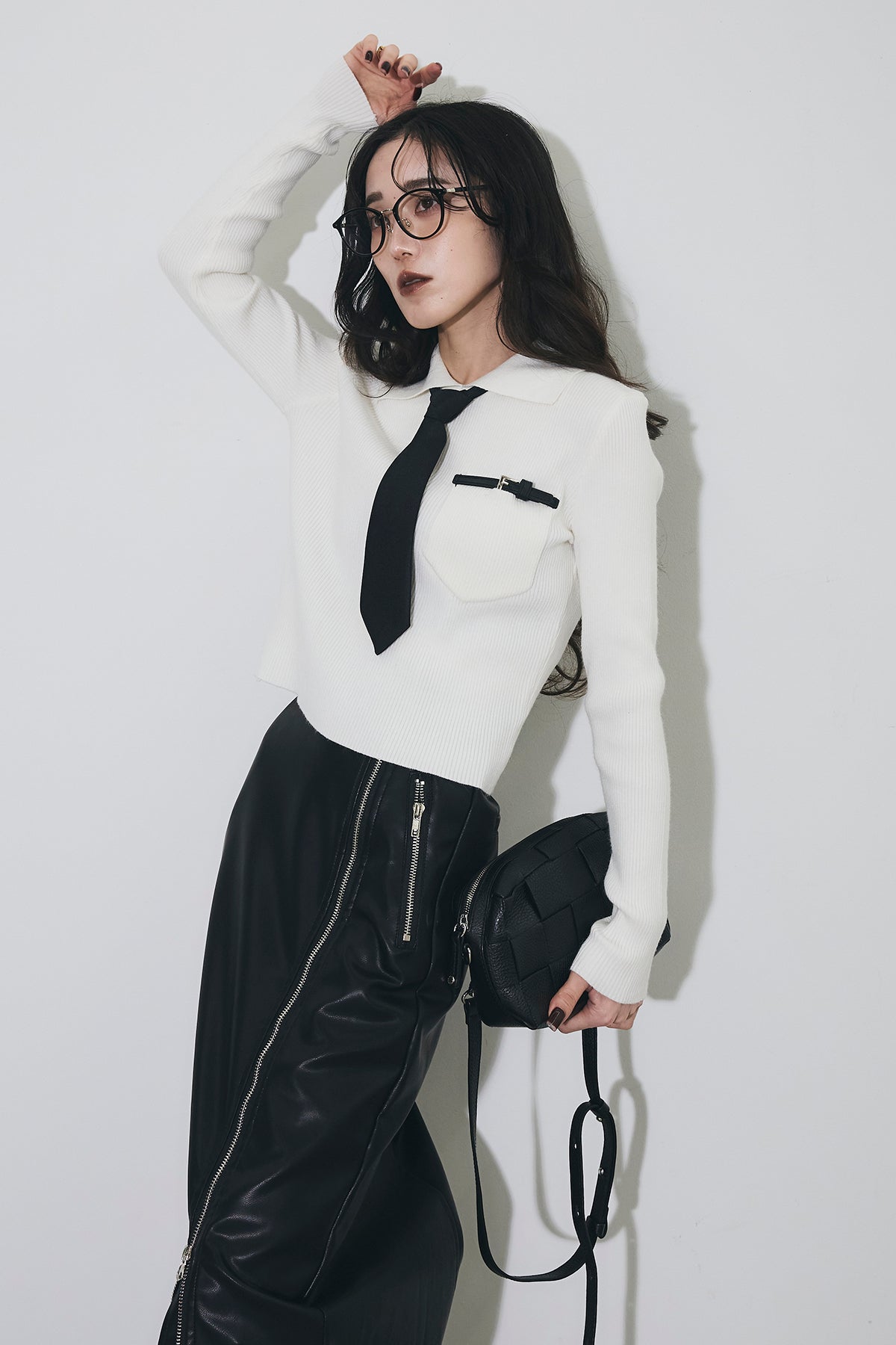 【SET】ネクタイ付きニット+ZIPレザースカート