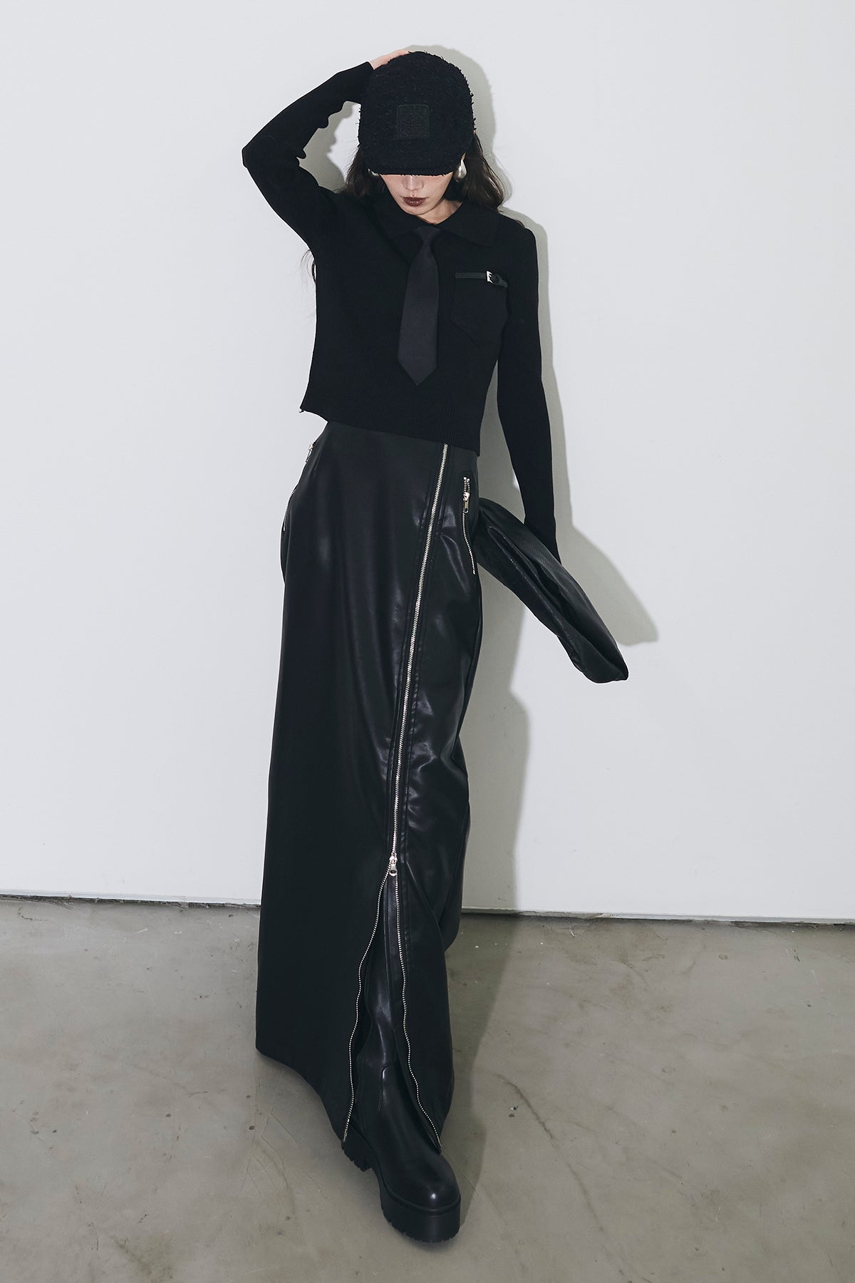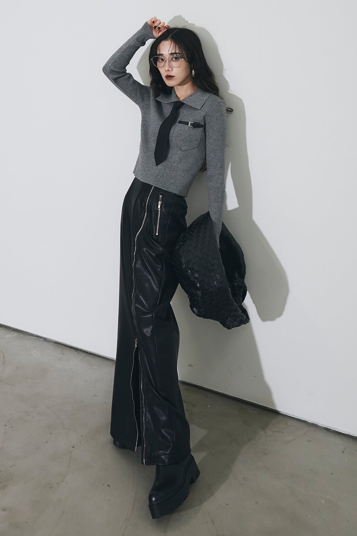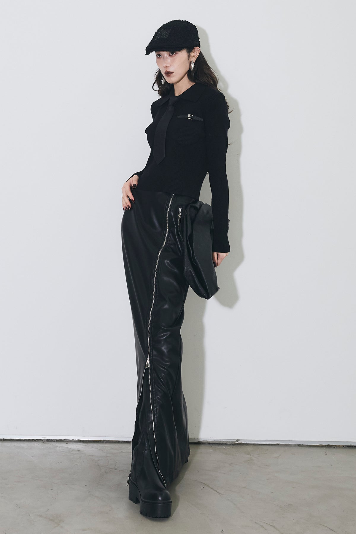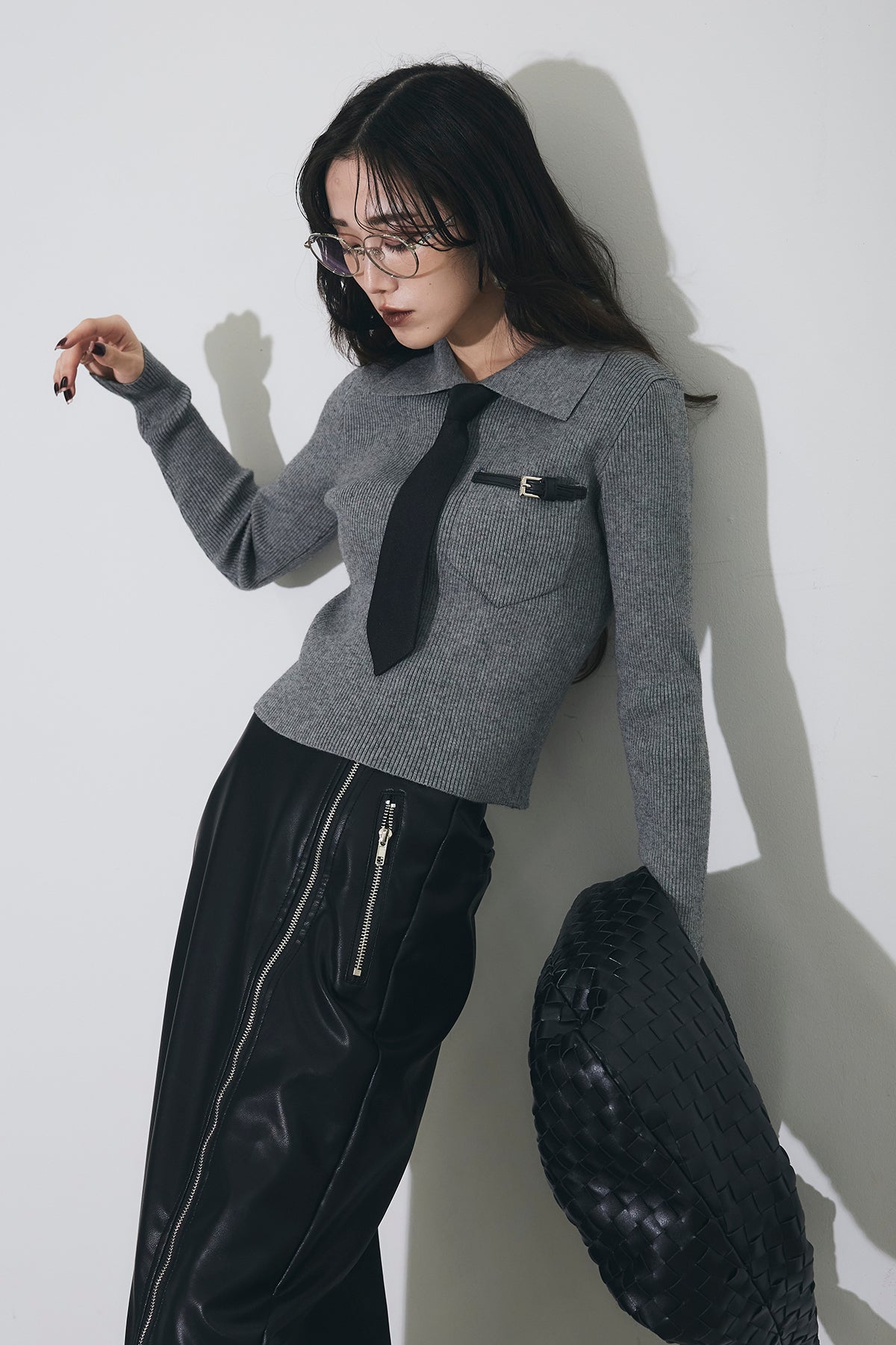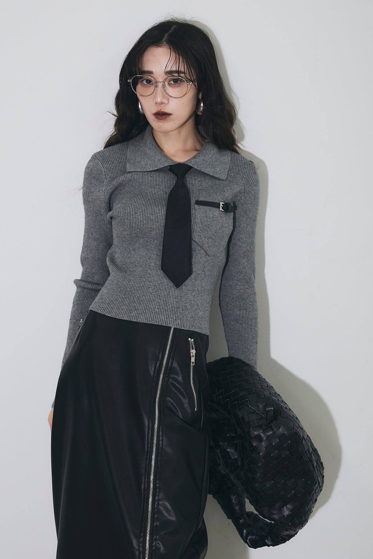 【SET】ネクタイ付きニット+ZIPレザースカート