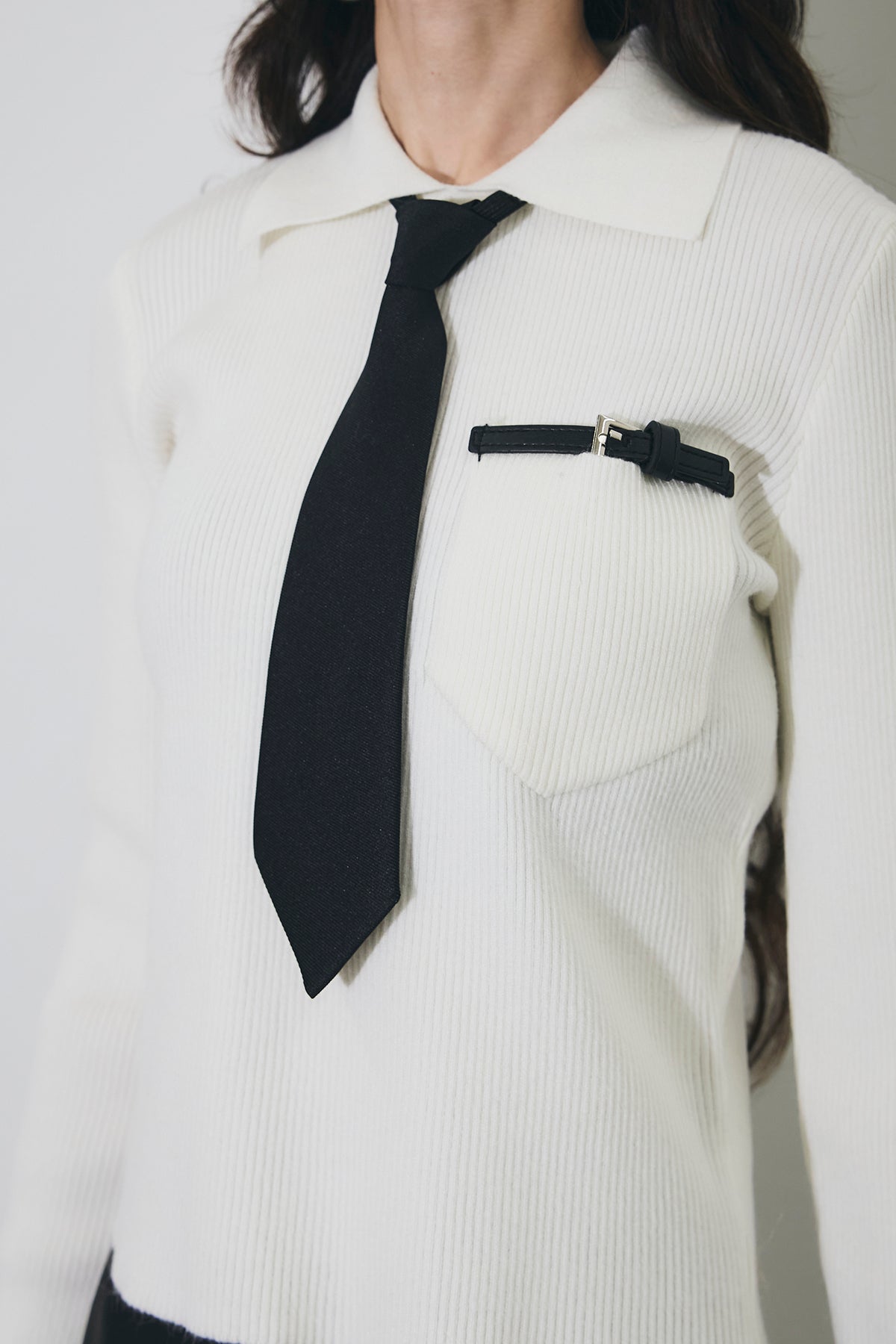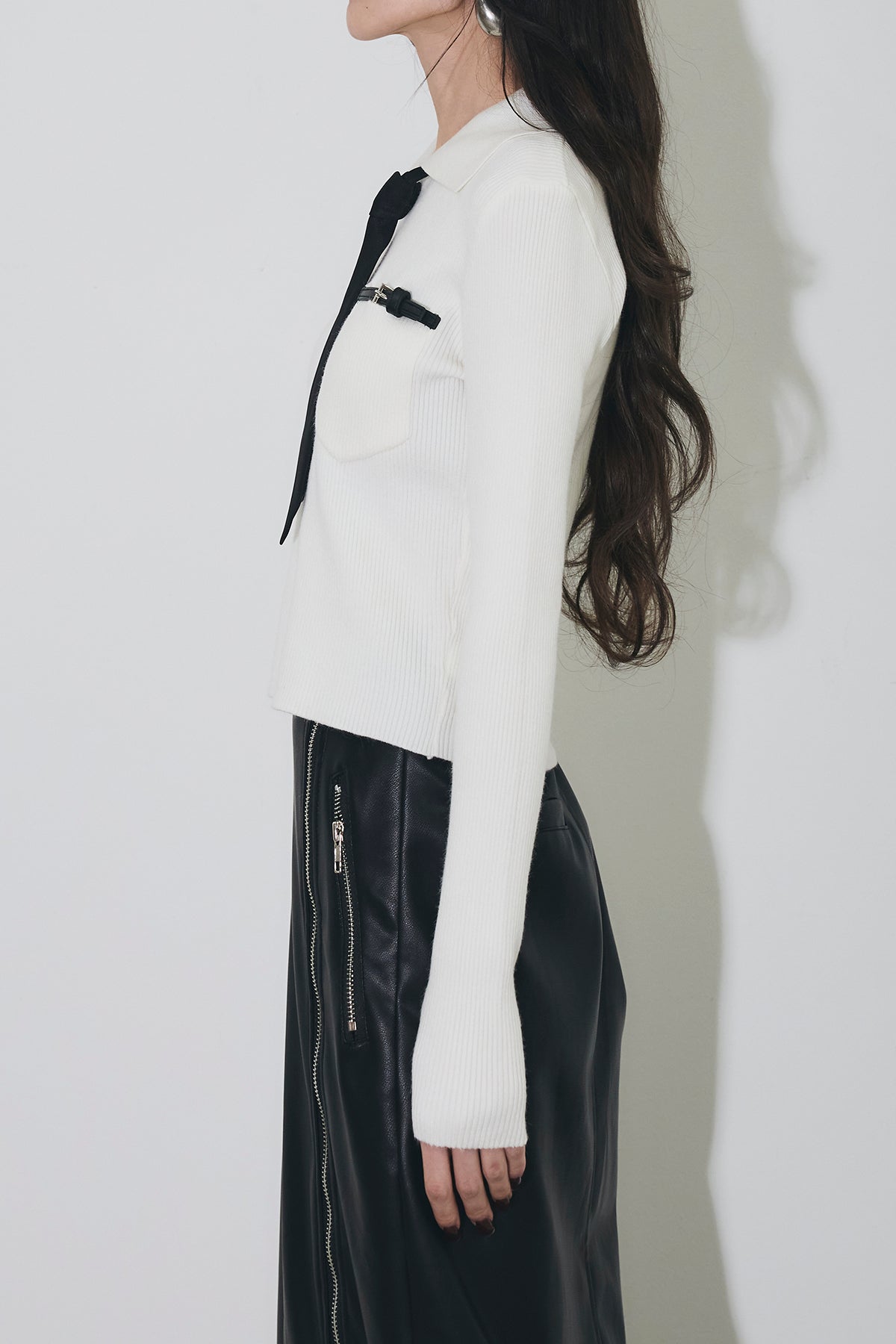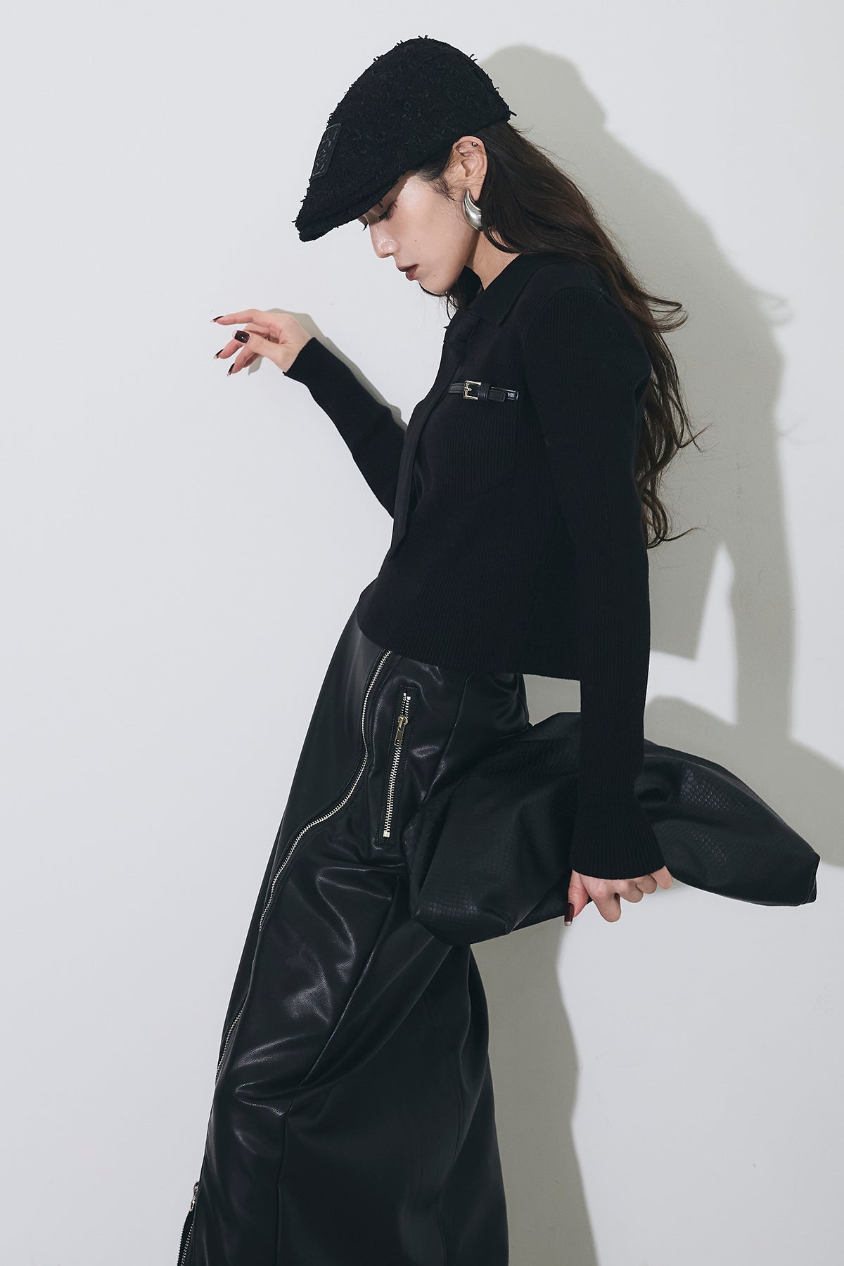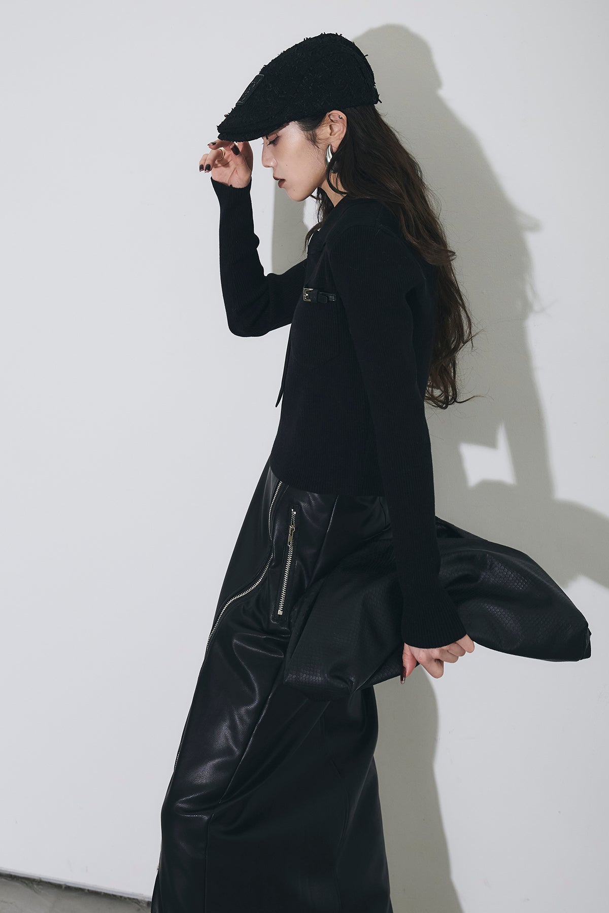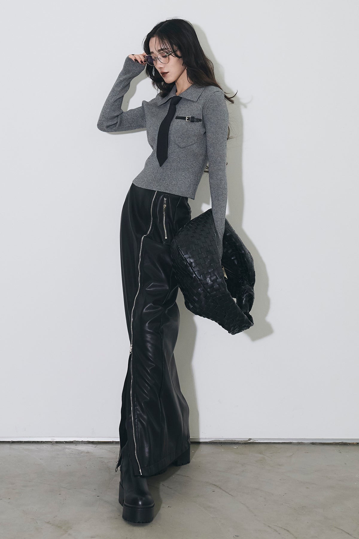 【SET】ネクタイ付きニット+ZIPレザースカート